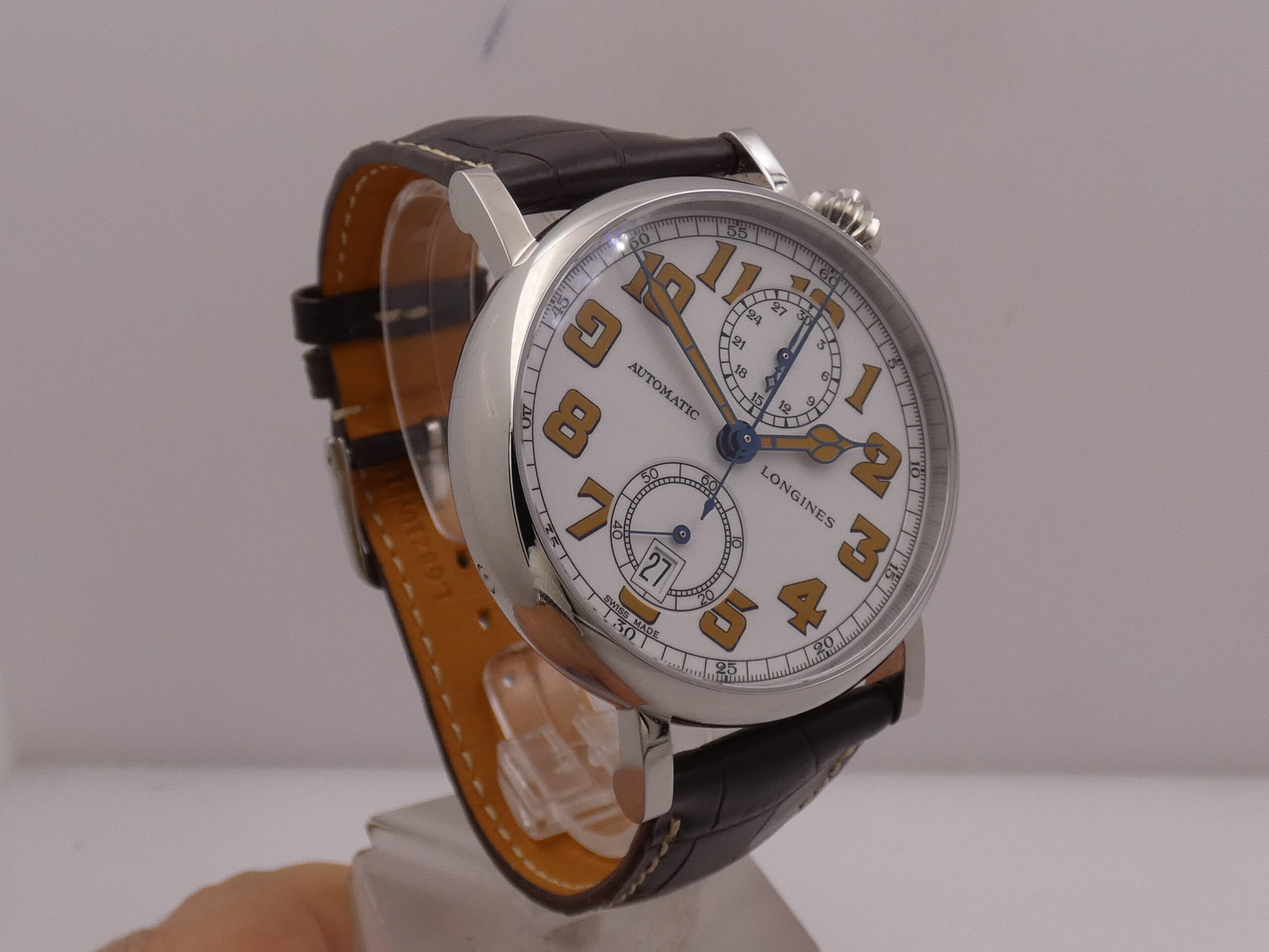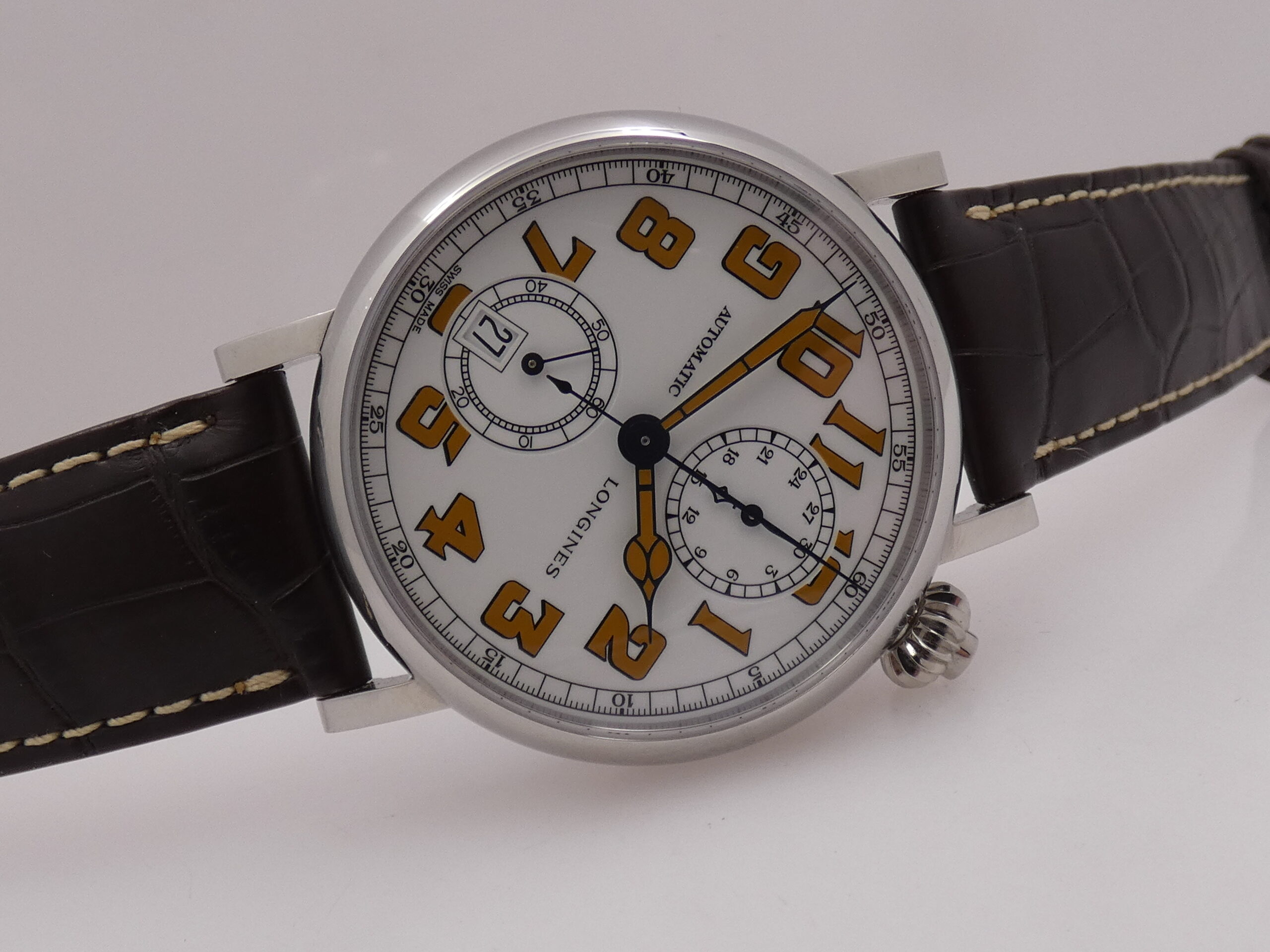 Quadrante: bianco, ruotato di 40 gradi che permetteva ai piloti di leggere l’ora con la massima facilità senza staccare le mani dai comandi, indici arabi, lancette a cattedrale in acciaio azzurrato, secondi continui al 6, minuti del crono al 12, secondi cronografici al centro, datario al 6 con rimessa rapida tramite pulsantino al 7, scala sessantesimale con suddivisione ad 1/5 di secondo, logo Longines al 3