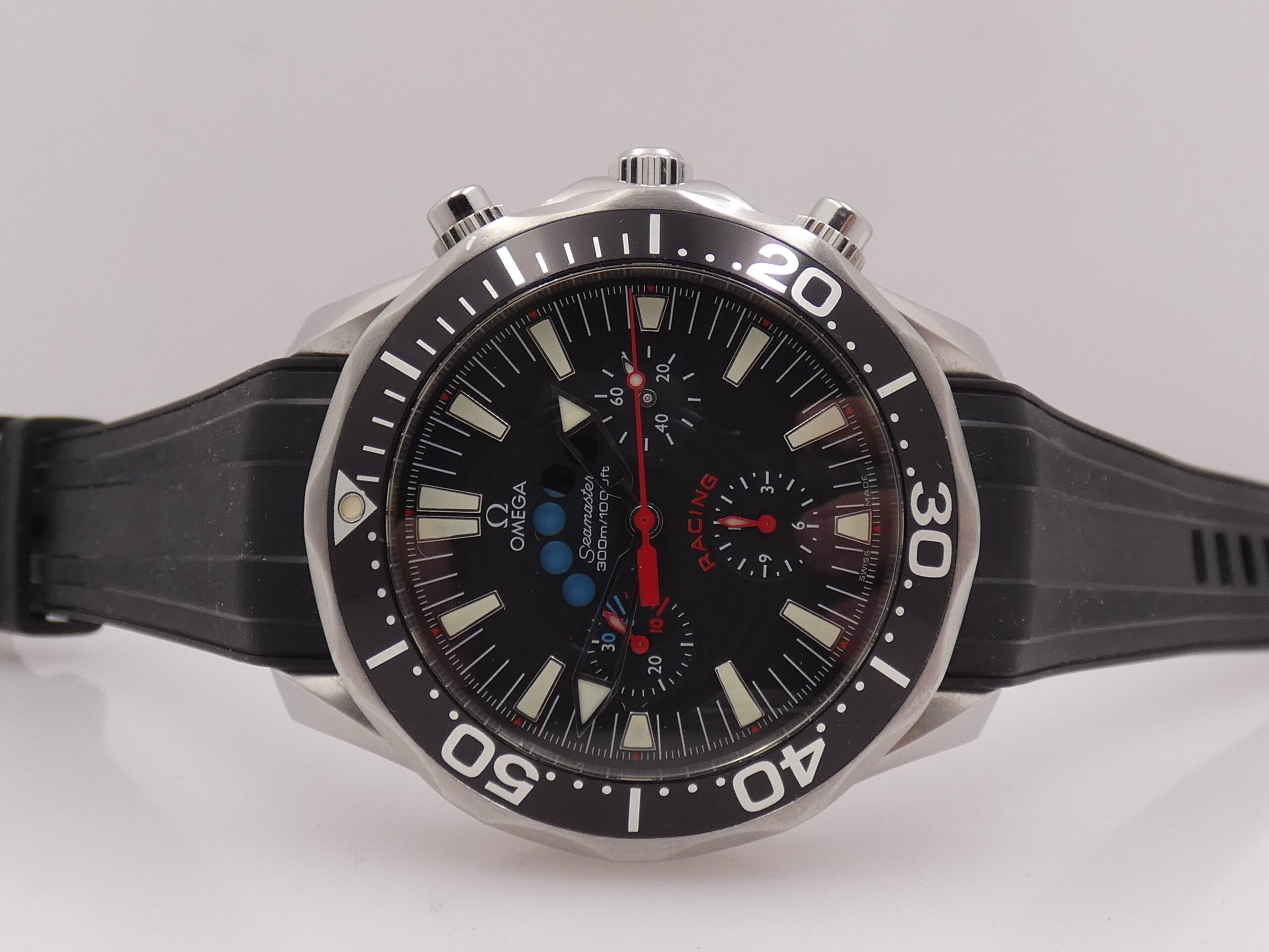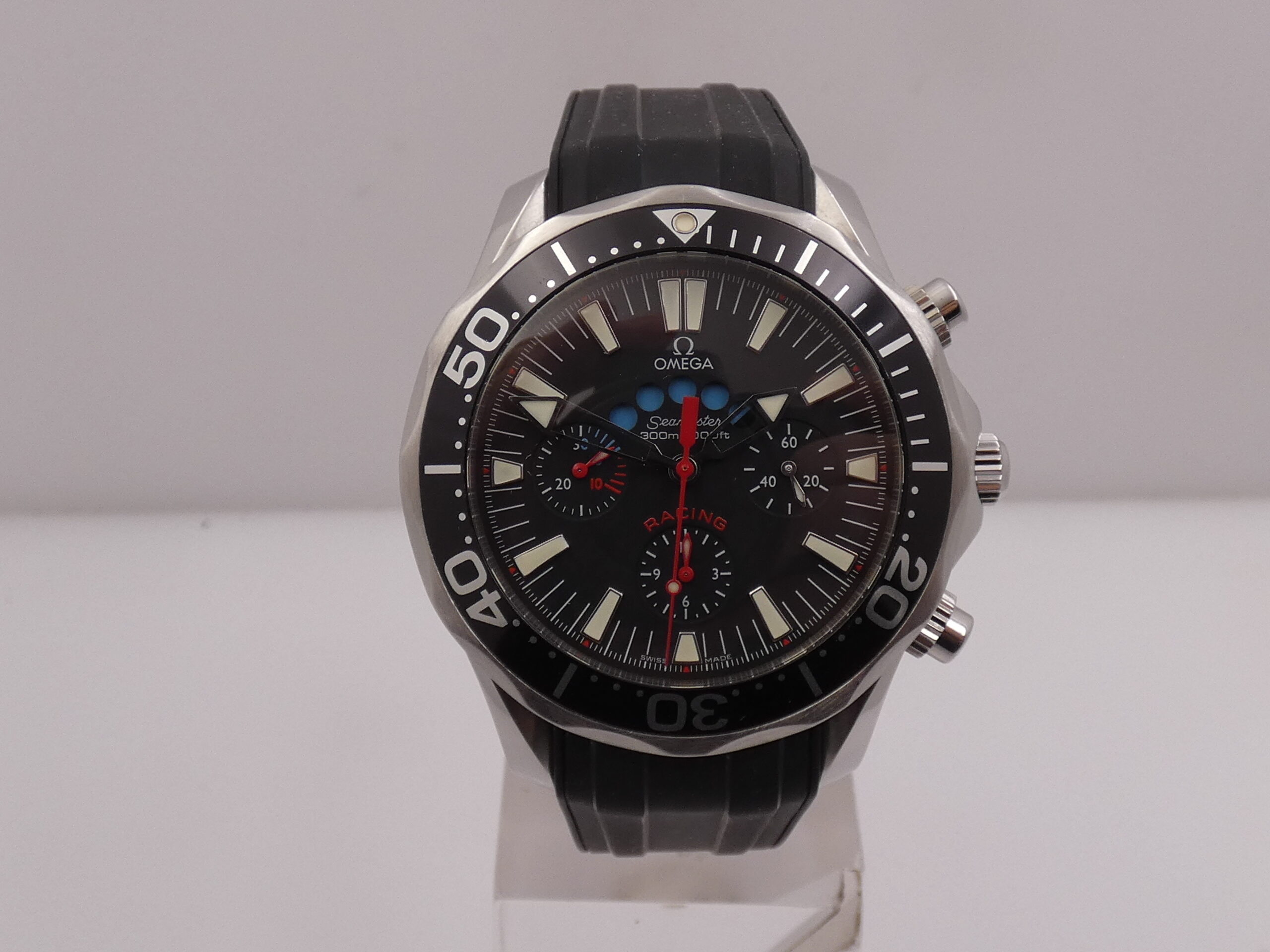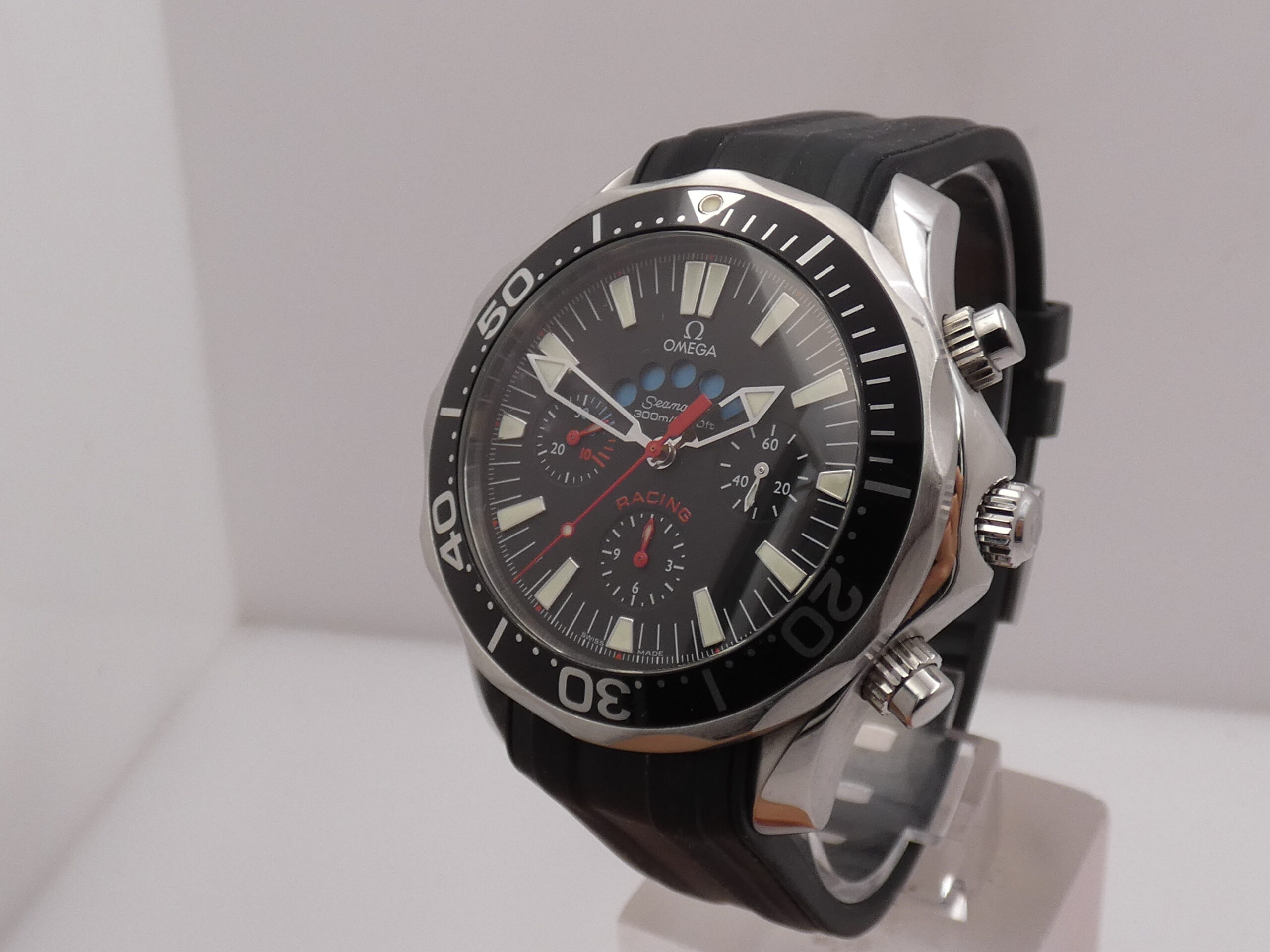 Quadrante: nero, con indicia barretta in acciaio, in rilievo, trattati con materiale luminescente e punti luminescenti in corrispondenza, lancette a freccia semi scheletrate, anch’esse in acciaio con punta luminescente, secondi continui al 3, minuti del crono al 9, ore del crono al 6, secondi cronografici al centro, cerchi forati sul quadrante che consentono una lettura facile e in un solo colpo d’occhio degli intervalli di tempo durante le gare di regata, scala sessantesimale con suddivisione ad 1/5 di secondo, logo Omega al 12