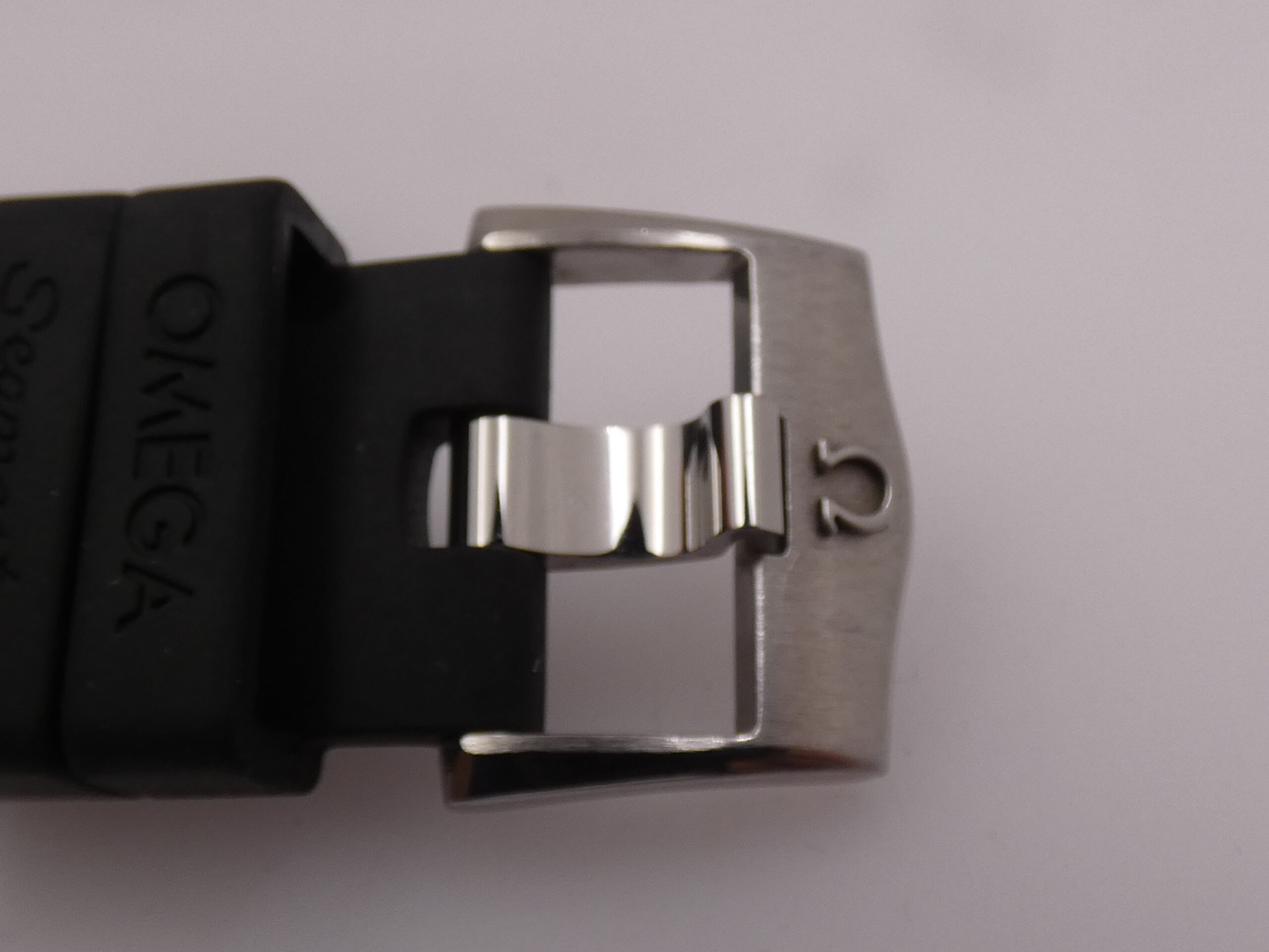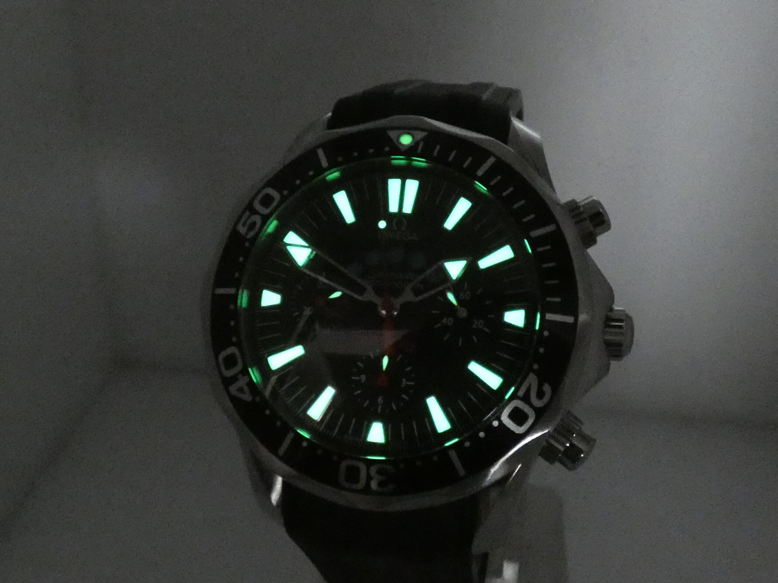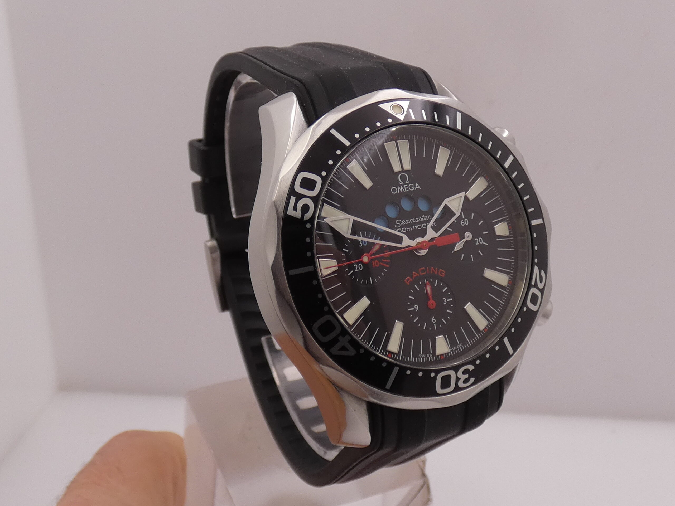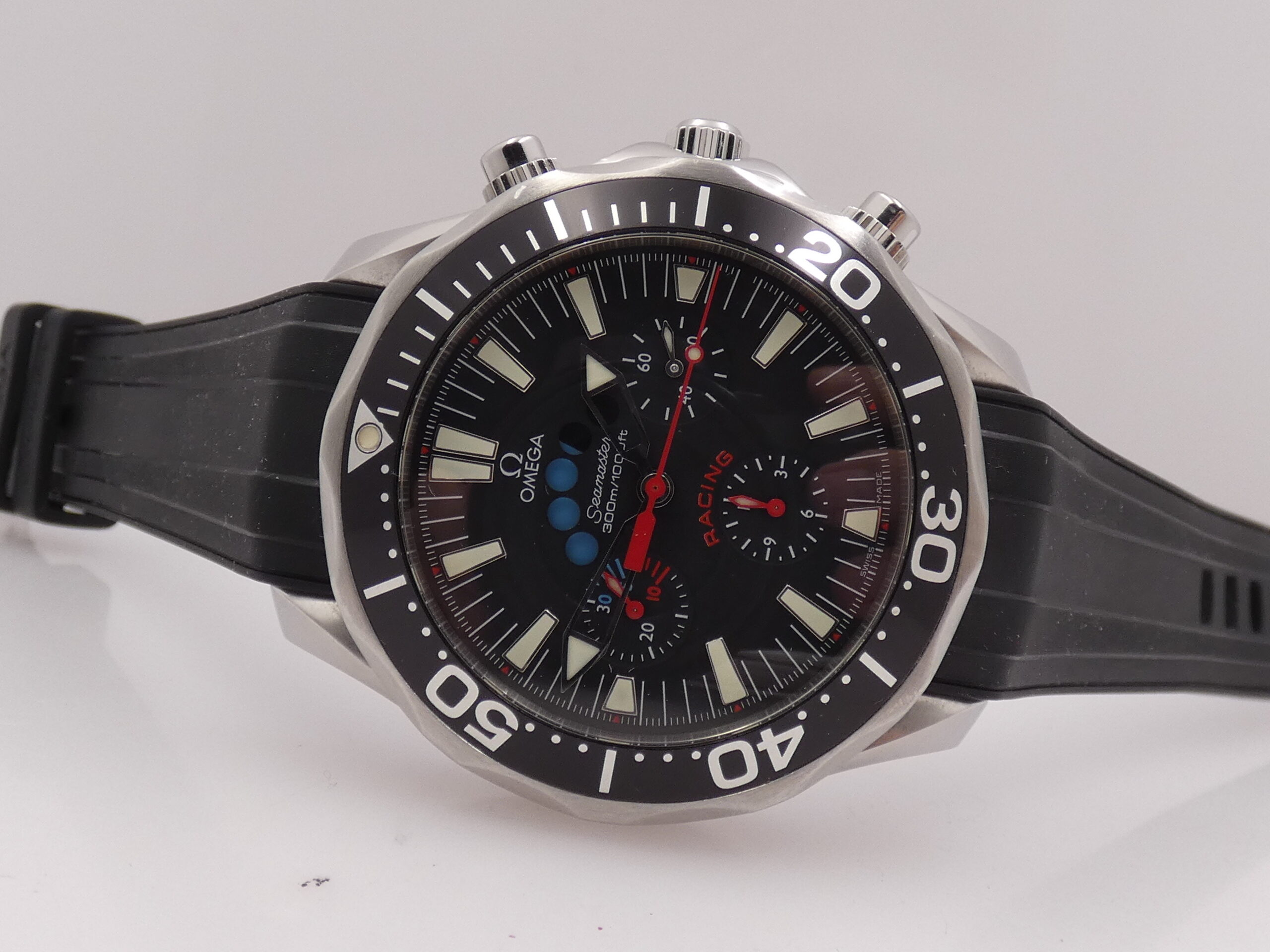 Quadrante: nero, con indicia barretta in acciaio, in rilievo, trattati con materiale luminescente e punti luminescenti in corrispondenza, lancette a freccia semi scheletrate, anch’esse in acciaio con punta luminescente, secondi continui al 3, minuti del crono al 9, ore del crono al 6, secondi cronografici al centro, cerchi forati sul quadrante che consentono una lettura facile e in un solo colpo d’occhio degli intervalli di tempo durante le gare di regata, scala sessantesimale con suddivisione ad 1/5 di secondo, logo Omega al 12