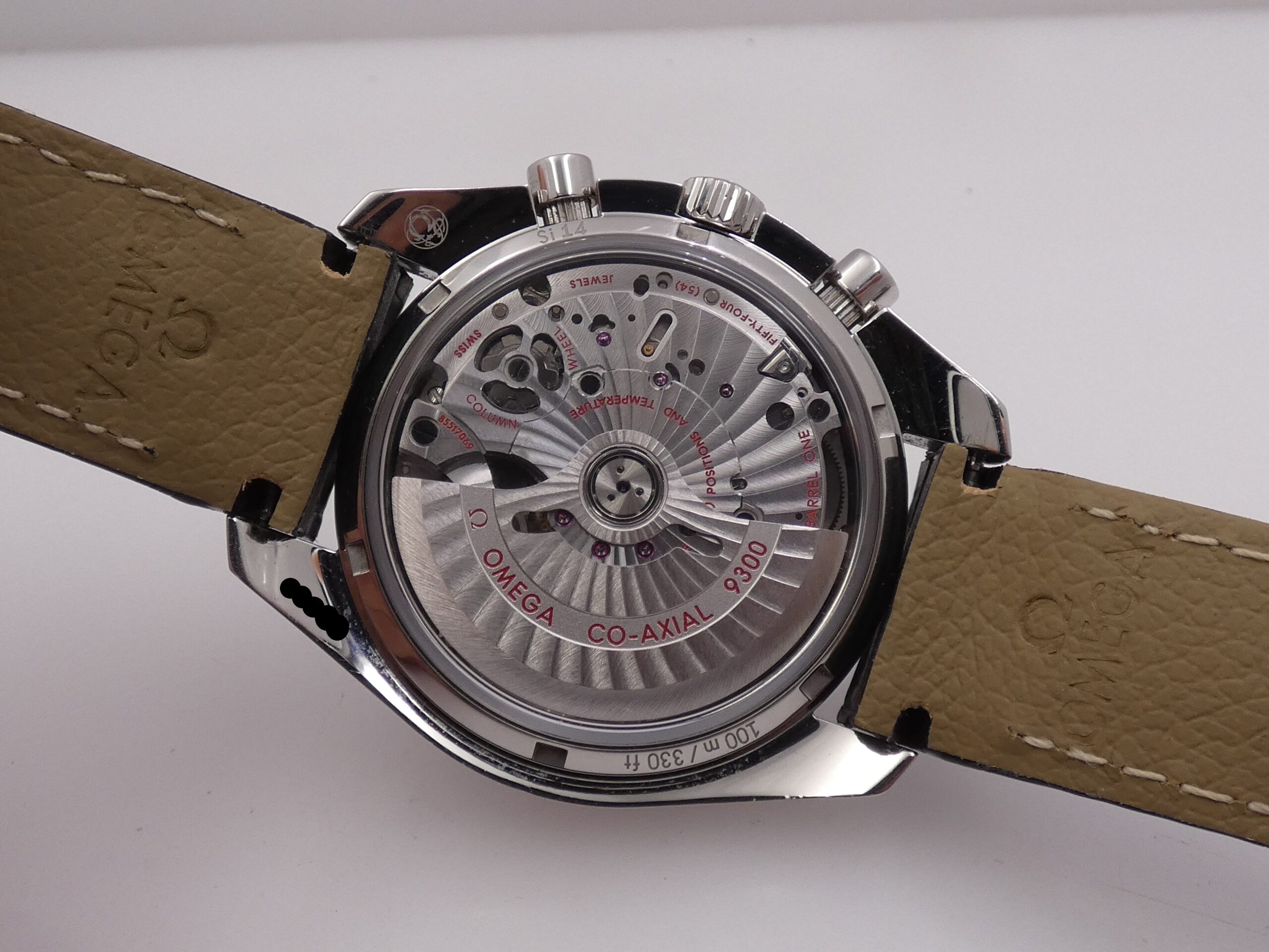 Movimento: Co-Axial, meccanico a carica automatica di manifattura Omega, calibro 9300, a 54 rubini, regolato in cinque posizioni di isocronismo e a diverse temperature con smistamento della cronografia tramite ruota a colonne