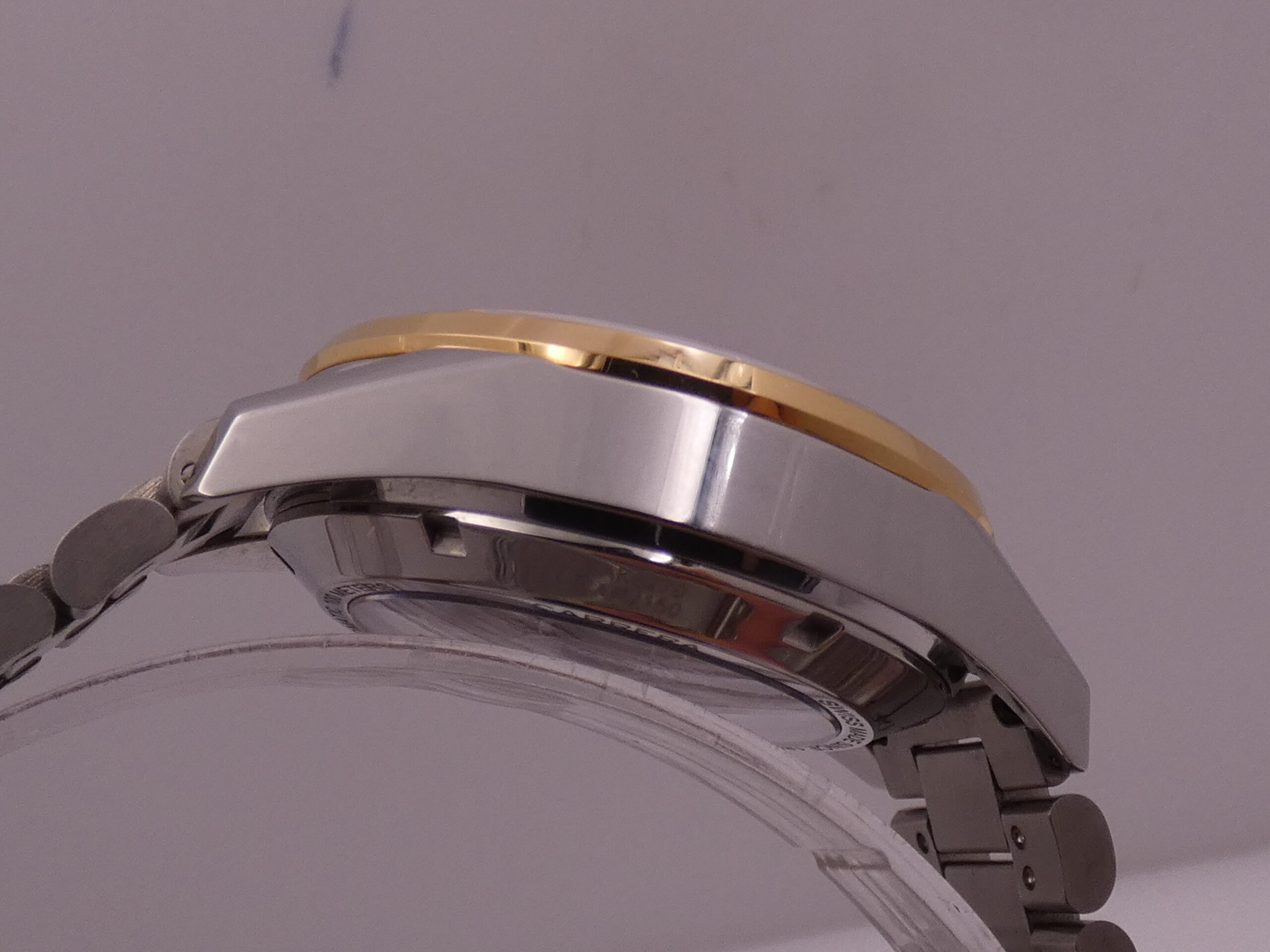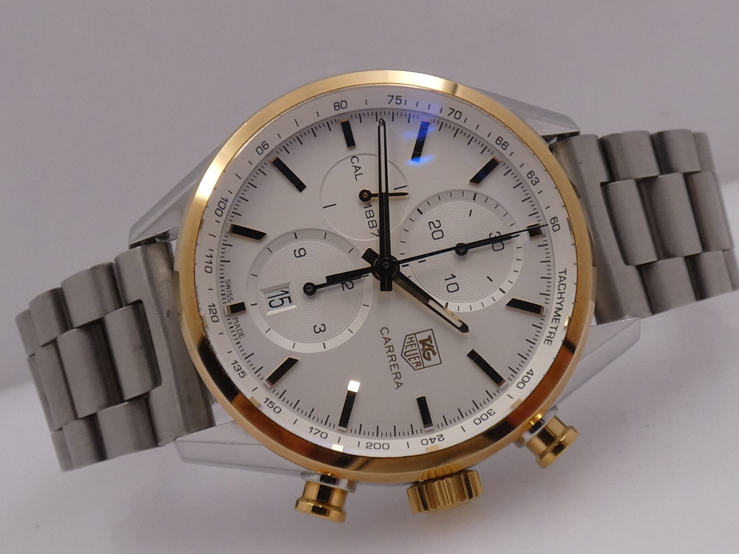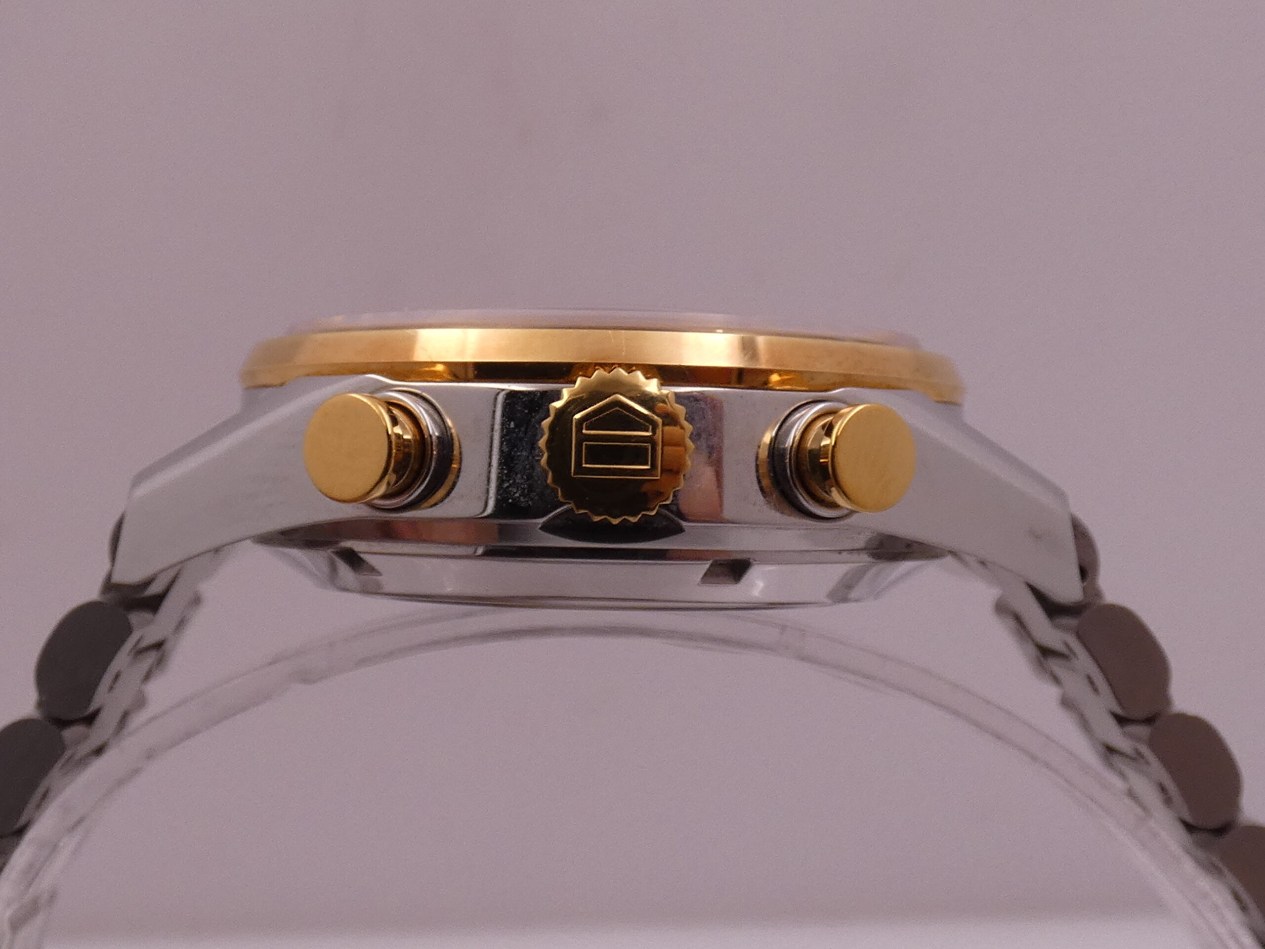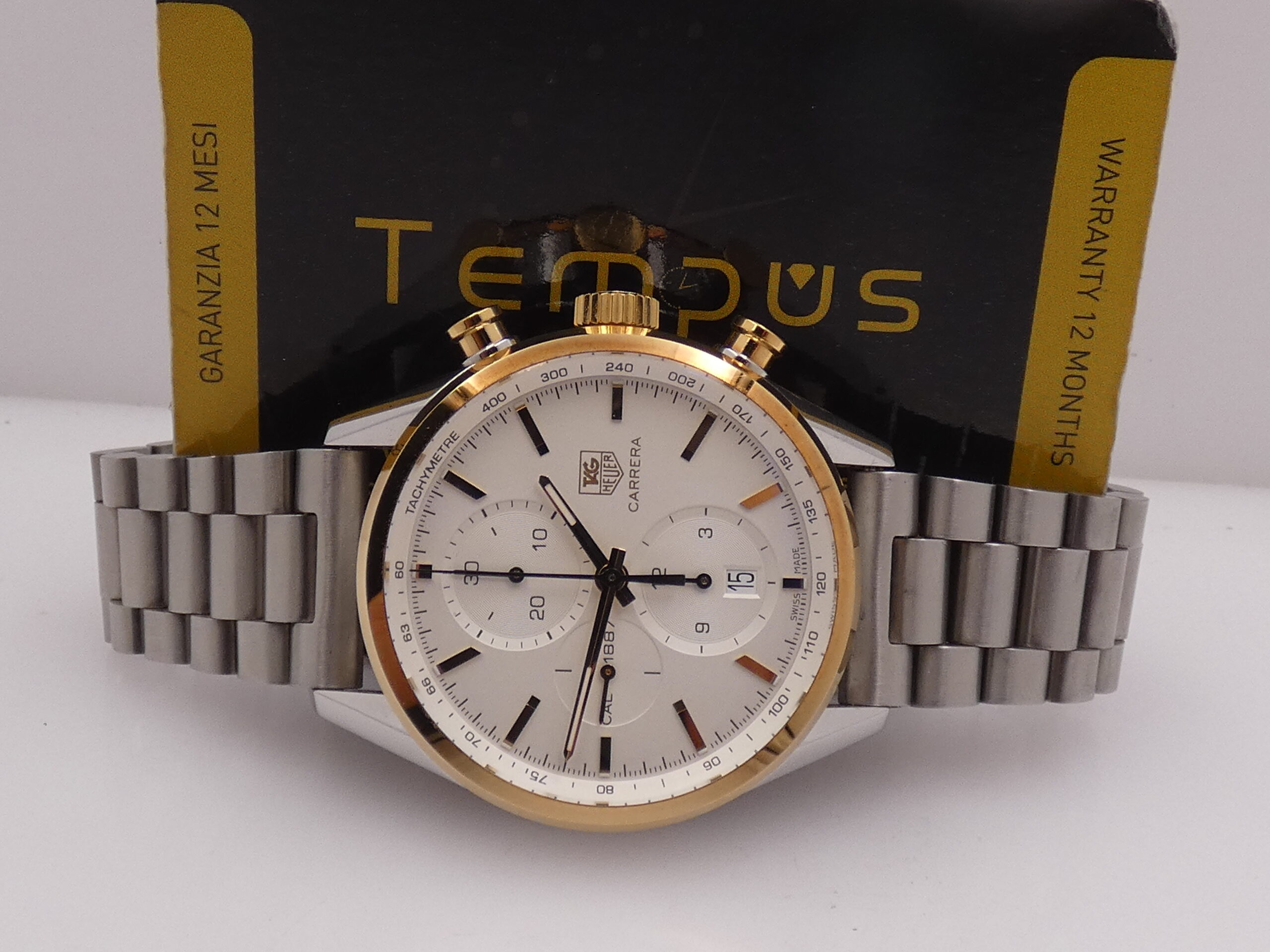 Quadrante: argentè, con indici a barretta in oro, in rilievo e con punti luminescenti in corrispondenza, lancette a stilo anch’esse in oro e luminescenti, secondi continui al 9, minuti del crono al 12, ore del crono al 6, datario al 6 con rimessa rapida in corona, scala sessantesimale con suddivisione ad 1/5 di secondo, scala tachimetrica sul rehaut, logo Tag Heuer al 3