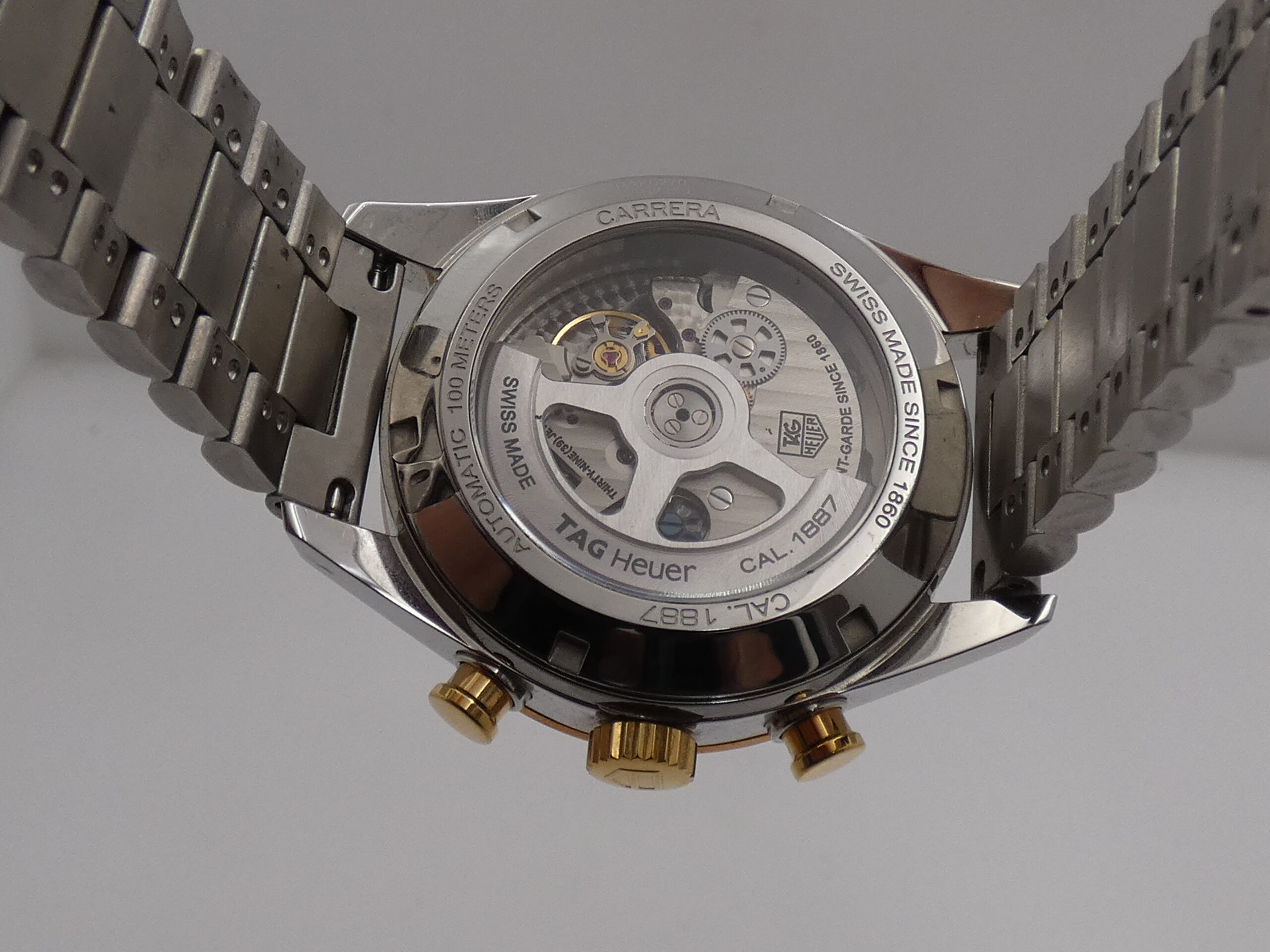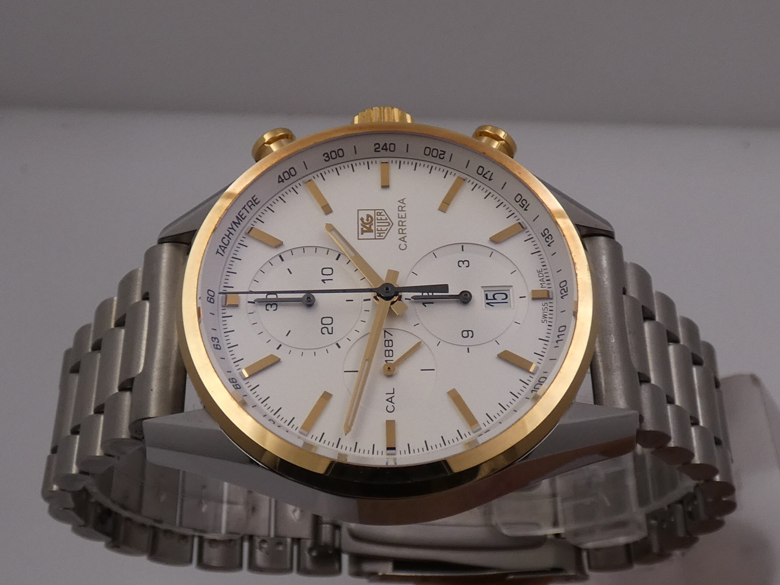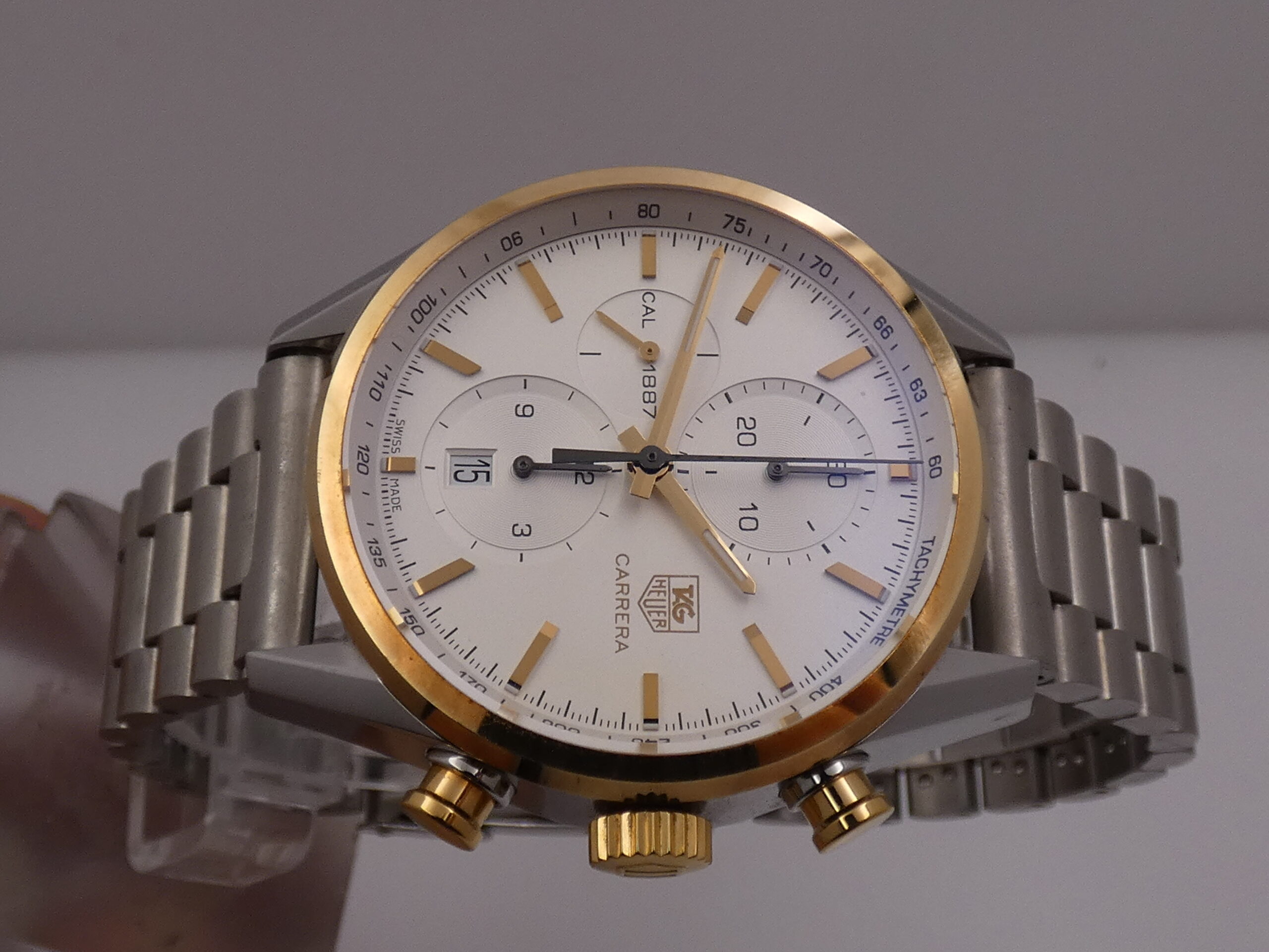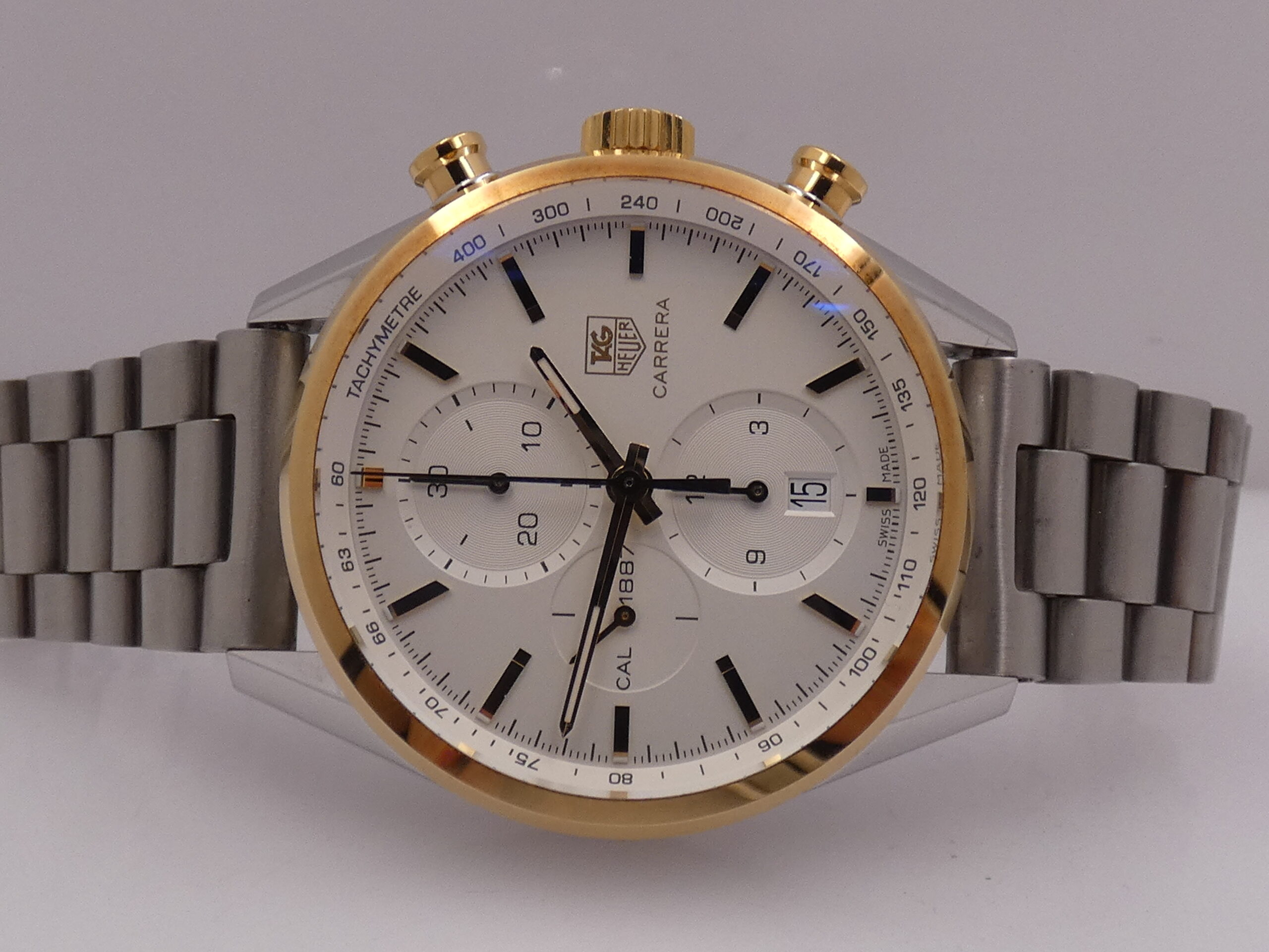 Model: Carrera 1887 Reference: CAR 2150 FC Year: 2012 Movement: Self-winding mechanical, TAG Heuer 1887 caliber, 39 jewels Functions: Hours, minutes, seconds, date, chronograph Case: All-steel Bezel: Smooth, 18kt gold Crown: Original, knurled, 18kt gold Push-buttons: Pump, 18kt gold Lugs: Curved; 20mm lug width Dimensions: 40 mm excluding crown, 49 mm at the lugs Crystal: Sapphire, with anti-reflective coating Case back: Screw-down, featuring the brand logo and visible movement Dial: Silvered, with raised gold bar indexes and corresponding luminescent dots, gold stylus hands with luminescent dots, running seconds at 9 o’clock, chronograph minutes at 12 o’clock, chronograph hours at 6 o’clock, date display at 6 o’clock with quick-set crown, 60-second scale with 1/5th of a second subdivisions, tachometric scale on the flange, Tag Heuer logo at 3 o’clock Bracelet: Steel, original Tag Heuer Clasp: Steel folding clasp with safety flip lock, original Tag Heuer The watch you see for sale is in TOP condition, in perfect working order, accurate and reliable, and waterproof: water resistance has been tested. It’s completely original.It will be delivered with its slightly damaged box, its outer box, its warranty, its instruction manual, and the original TAG Heuer leather strap with folding clasp, plus our 12-month warranty on proper functioning!!