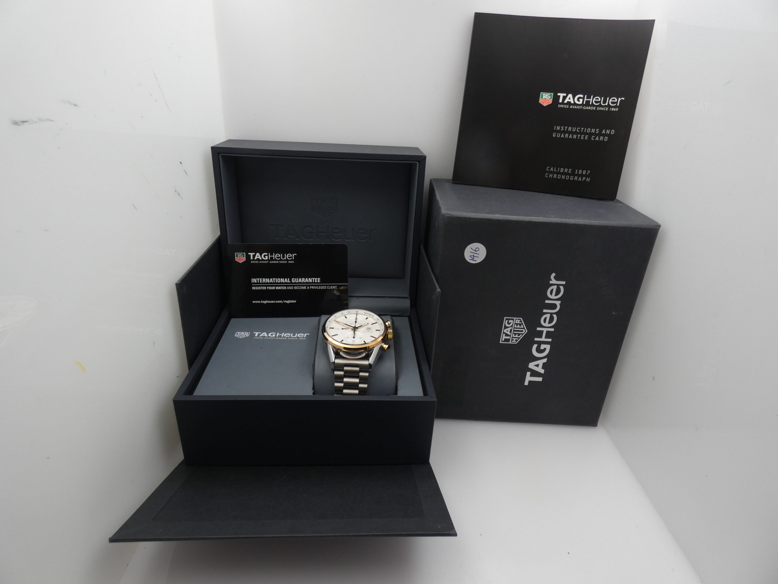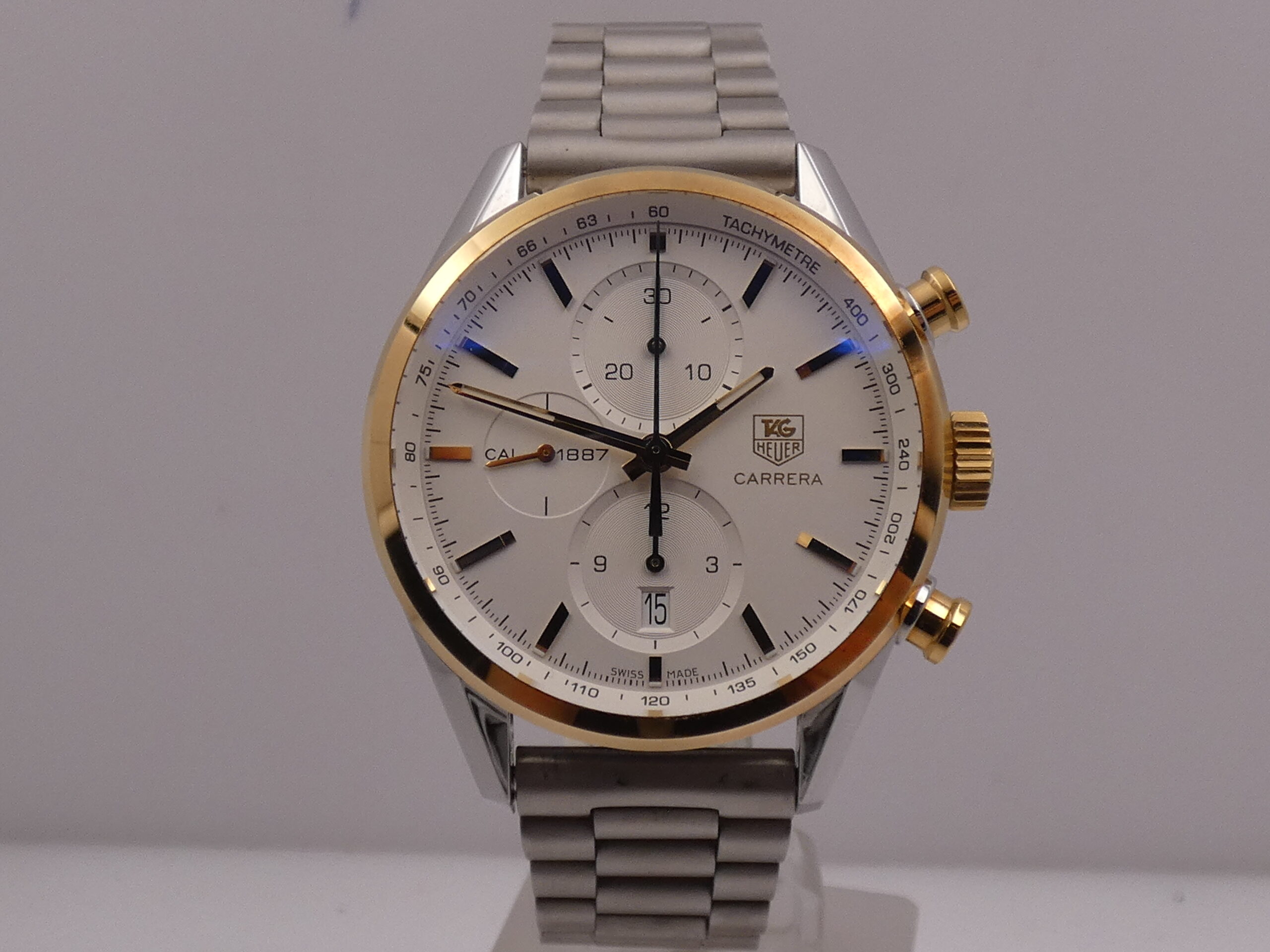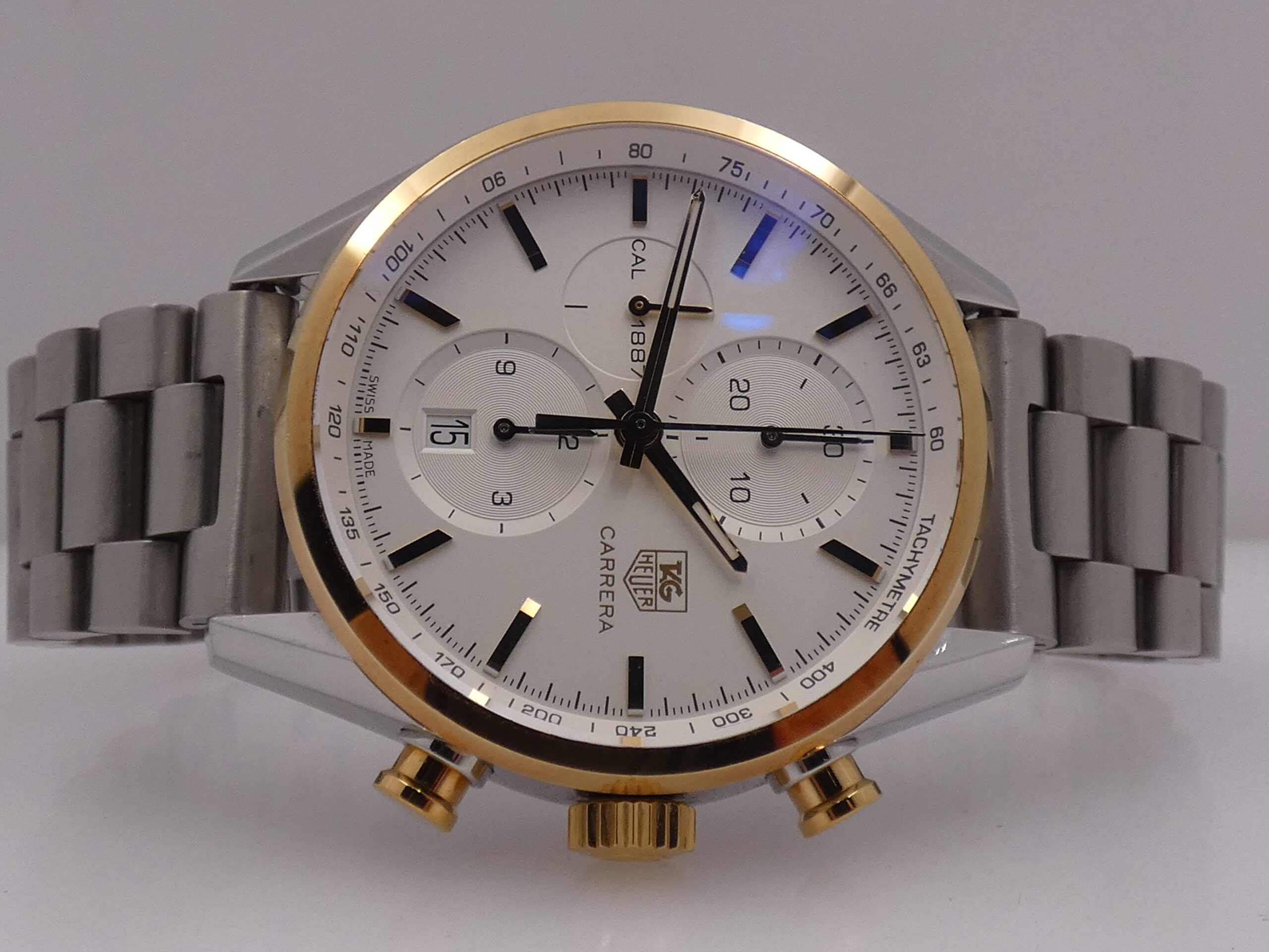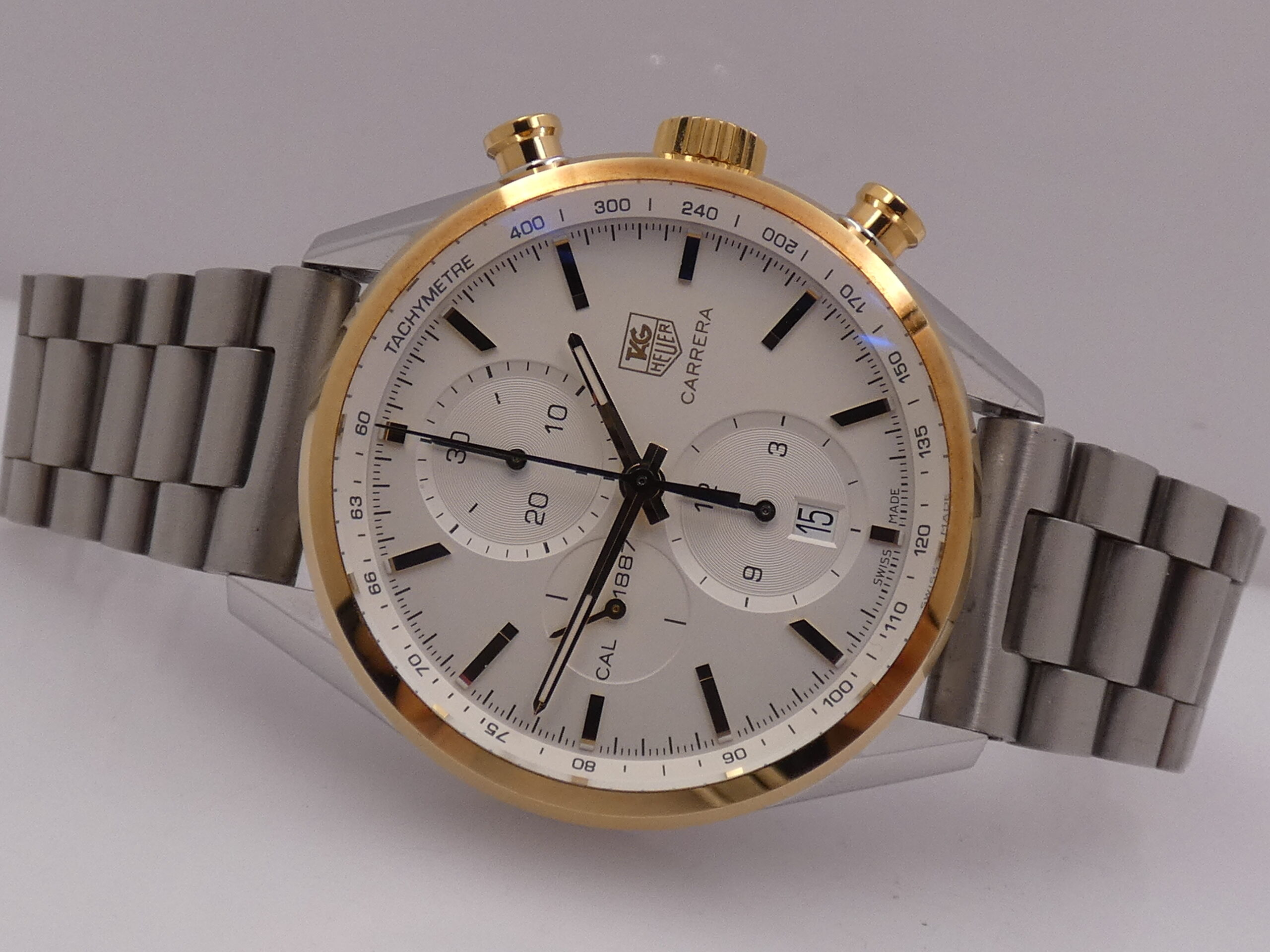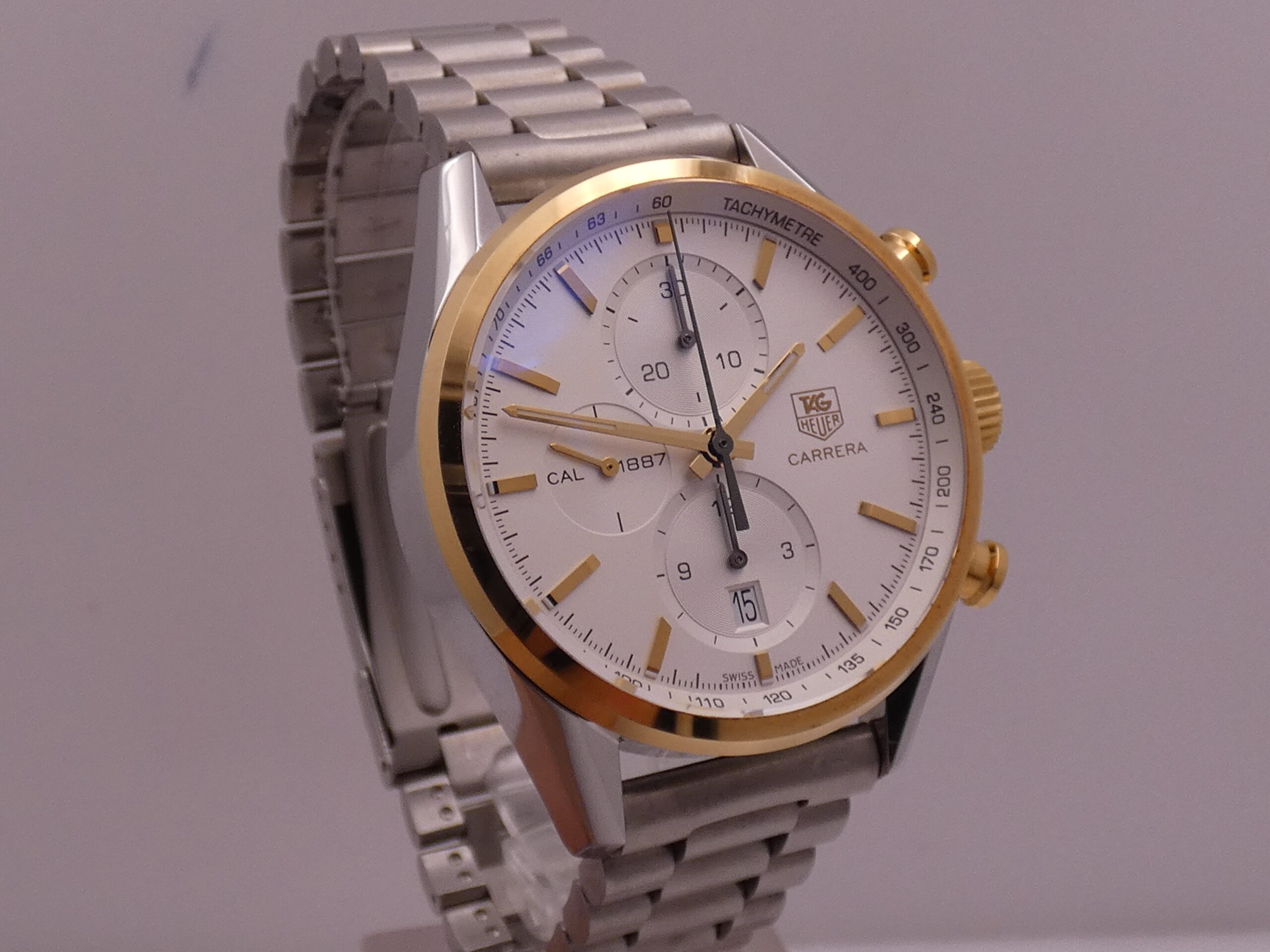 Model: Carrera 1887 Reference: CAR 2150 FC Year: 2012 Movement: Self-winding mechanical, TAG Heuer 1887 caliber, 39 jewels Functions: Hours, minutes, seconds, date, chronograph Case: All-steel Bezel: Smooth, 18kt gold Crown: Original, knurled, 18kt gold Push-buttons: Pump, 18kt gold Lugs: Curved; 20mm lug width Dimensions: 40 mm excluding crown, 49 mm at the lugs Crystal: Sapphire, with anti-reflective coating Case back: Screw-down, featuring the brand logo and visible movement Dial: Silvered, with raised gold bar indexes and corresponding luminescent dots, gold stylus hands with luminescent dots, running seconds at 9 o’clock, chronograph minutes at 12 o’clock, chronograph hours at 6 o’clock, date display at 6 o’clock with quick-set crown, 60-second scale with 1/5th of a second subdivisions, tachometric scale on the flange, Tag Heuer logo at 3 o’clock Bracelet: Steel, original Tag Heuer Clasp: Steel folding clasp with safety flip lock, original Tag Heuer The watch you see for sale is in TOP condition, in perfect working order, accurate and reliable, and waterproof: water resistance has been tested. It’s completely original.It will be delivered with its slightly damaged box, its outer box, its warranty, its instruction manual, and the original TAG Heuer leather strap with folding clasp, plus our 12-month warranty on proper functioning!!