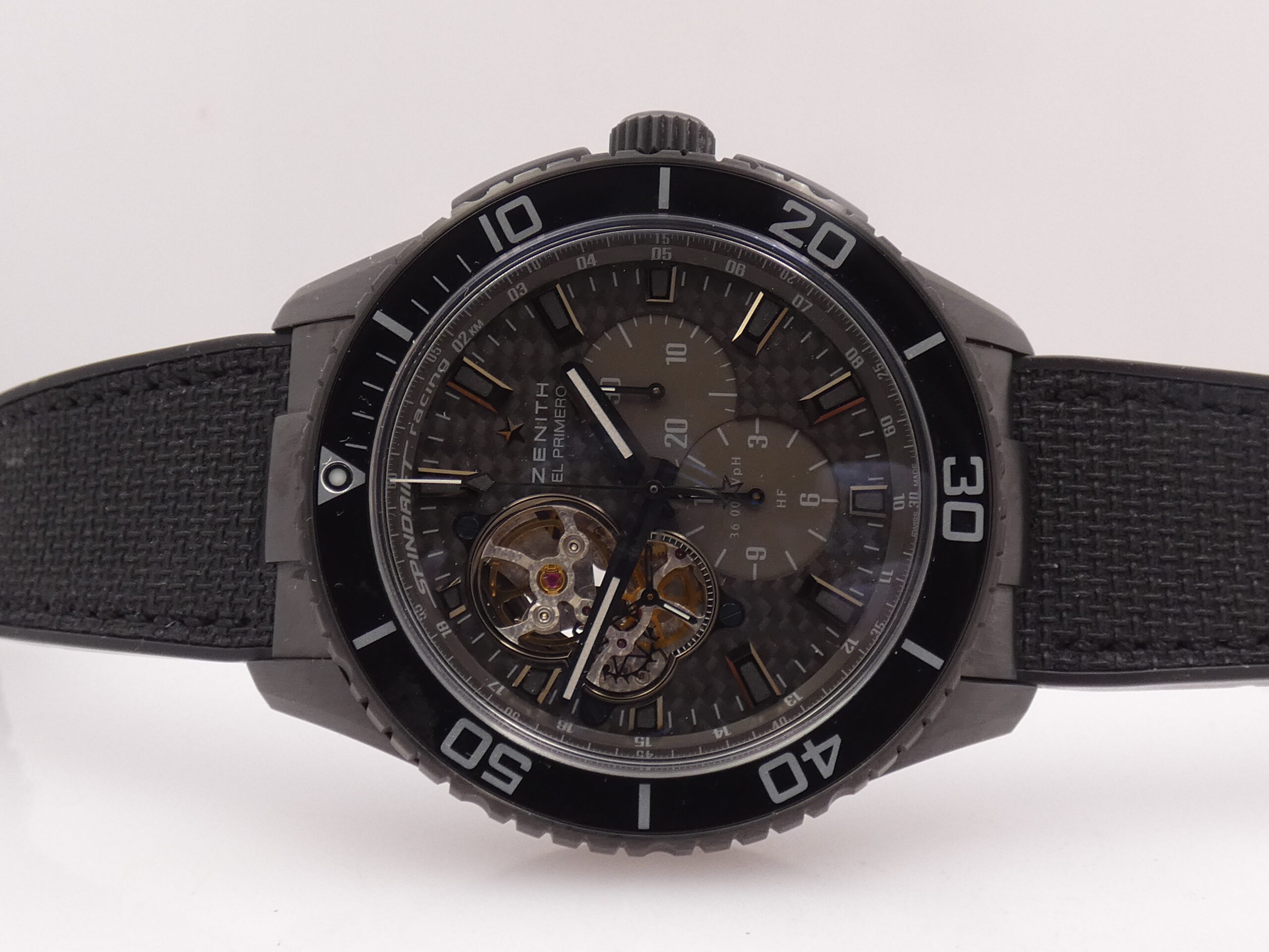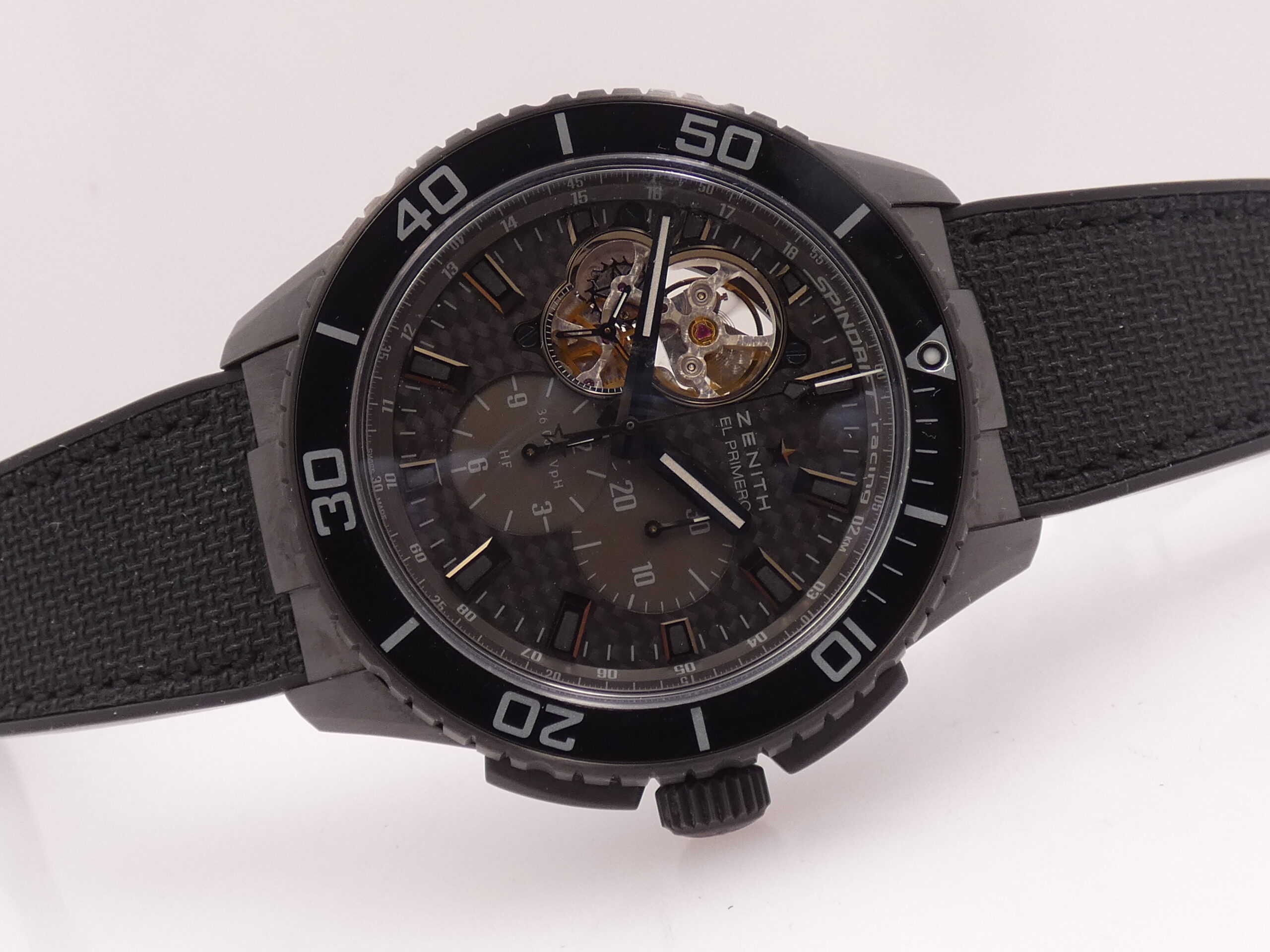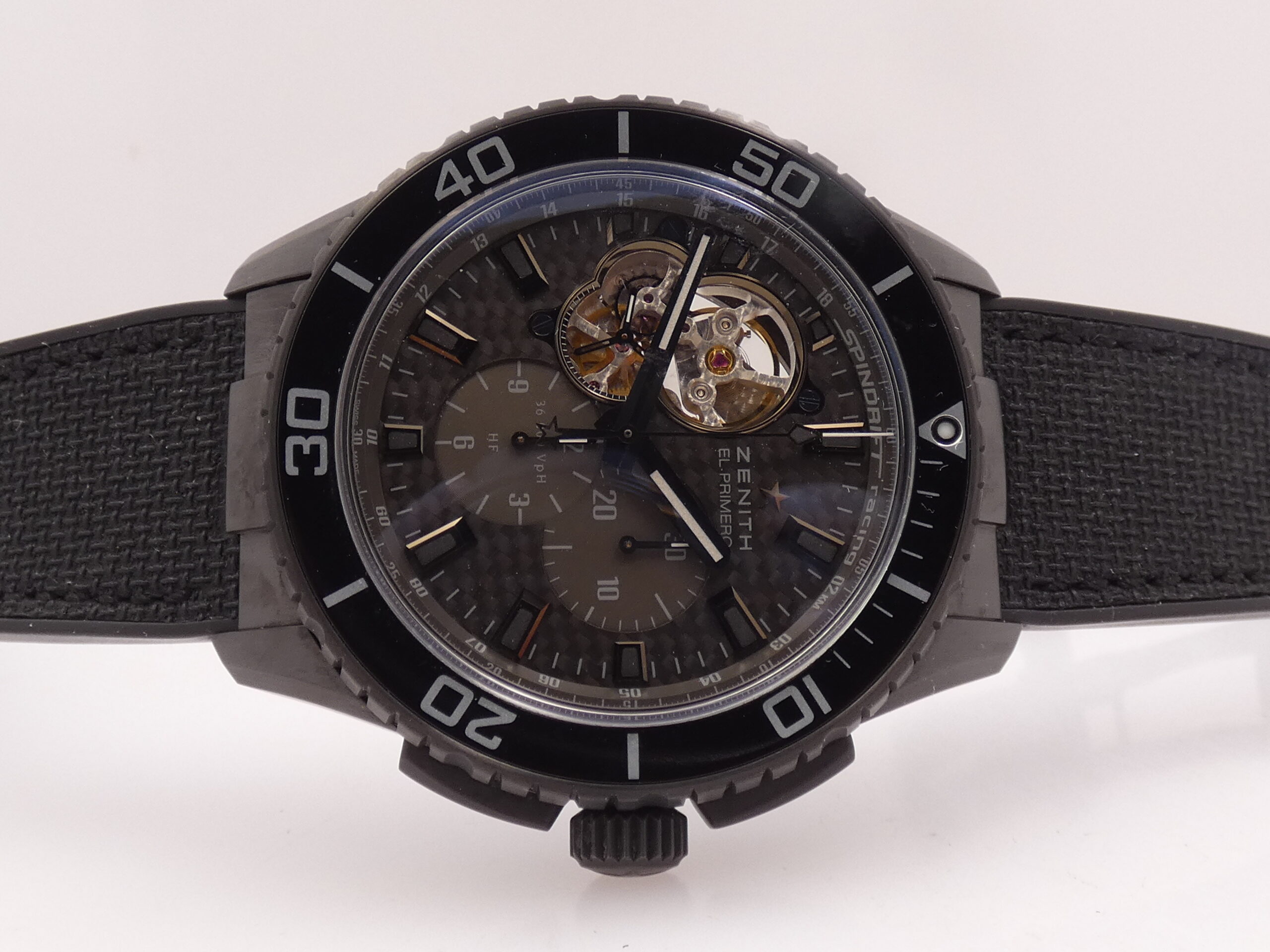 Quadrante: Open Heart, in fibra di carbonio, indici a barretta in acciaio ed in rilievo, lancette a bastone, anch’esse in acciaio brunito e luminescenti, secondi continui al 9, minuti del crono al 3, ore del crono al 6, secondi cronografici al centro, scala sessantesimale con suddivisione ad 1/5 di secondo e scala tachimetrica sul rehaut, logo Zenith all’1