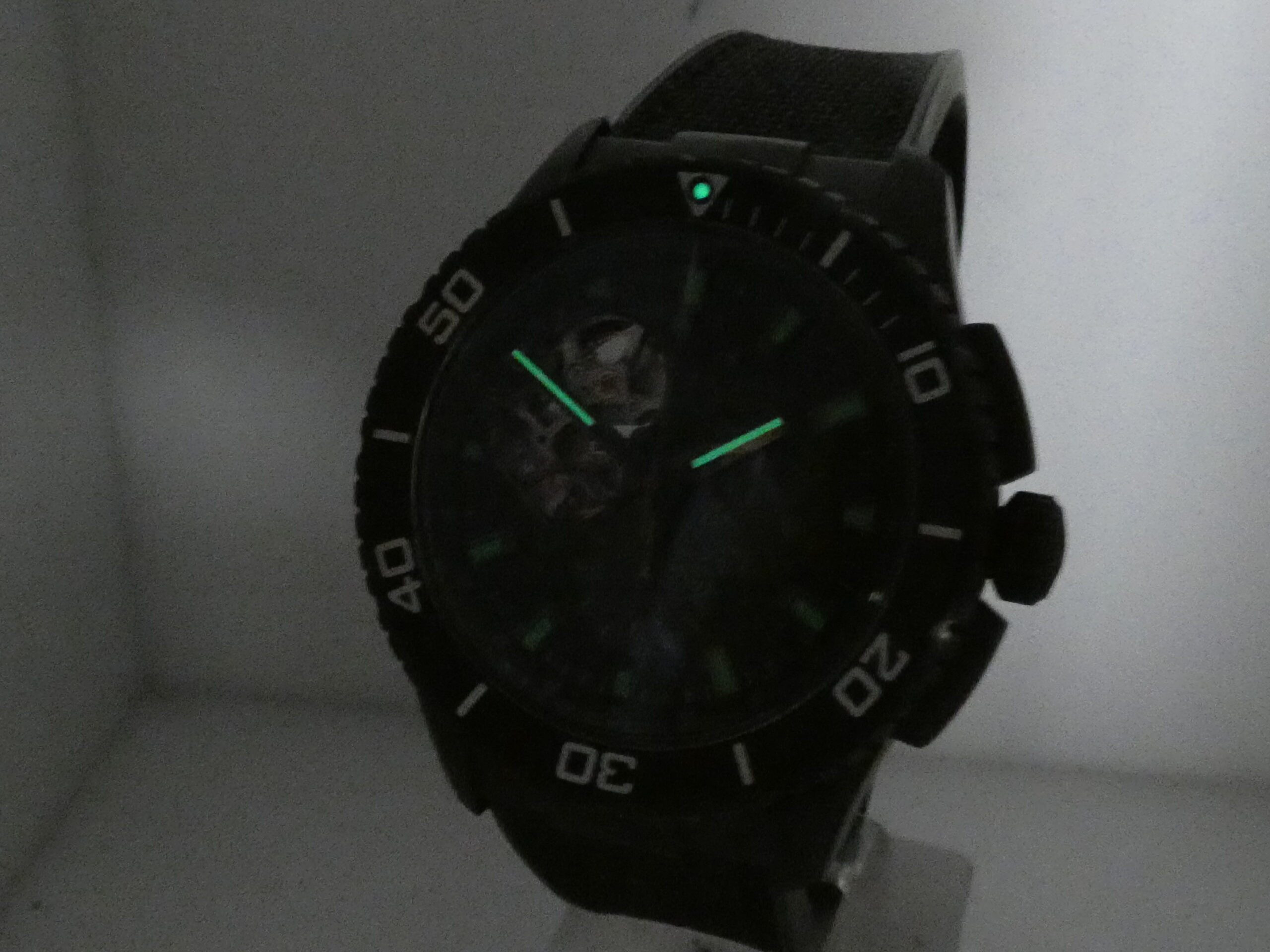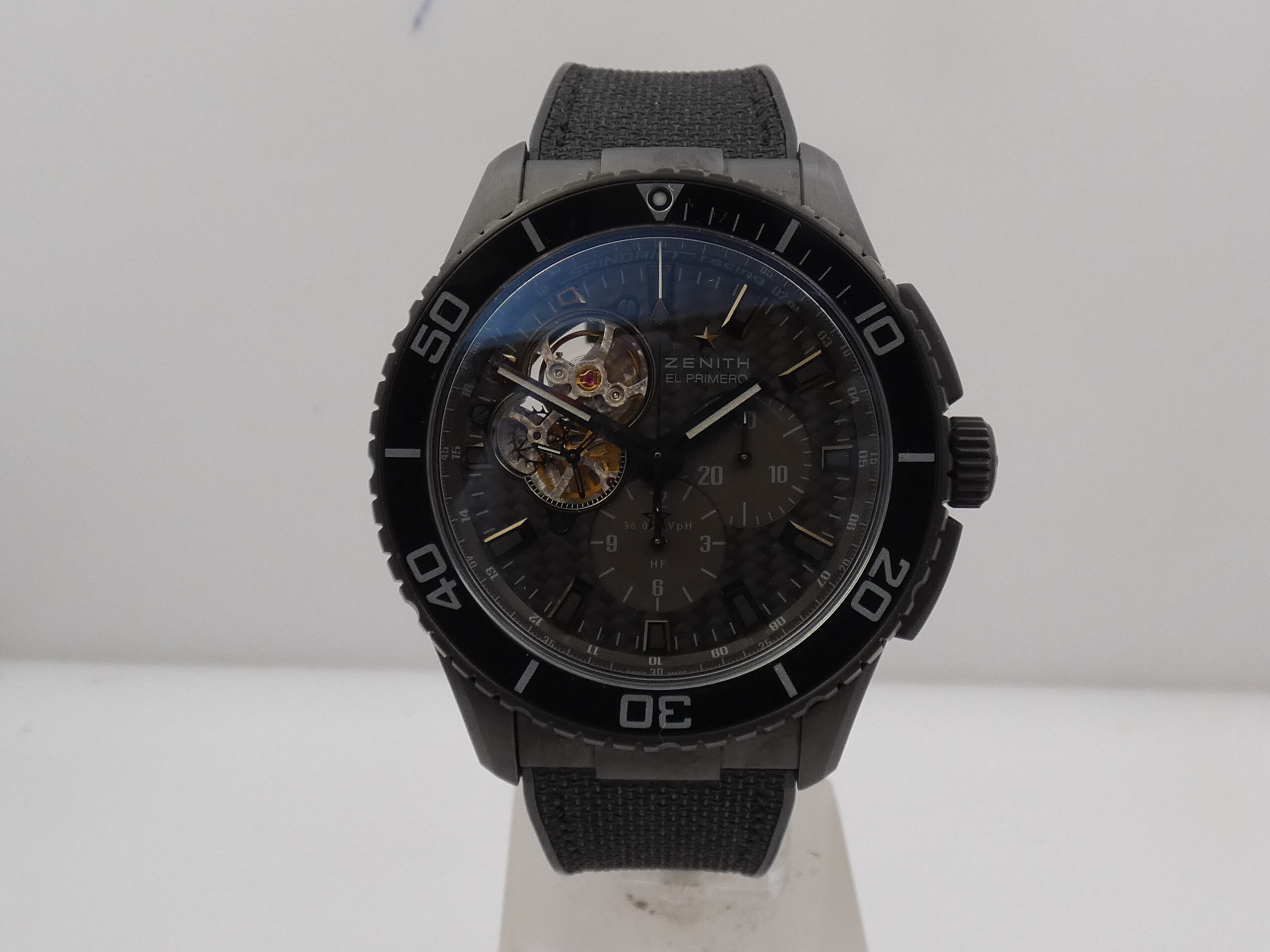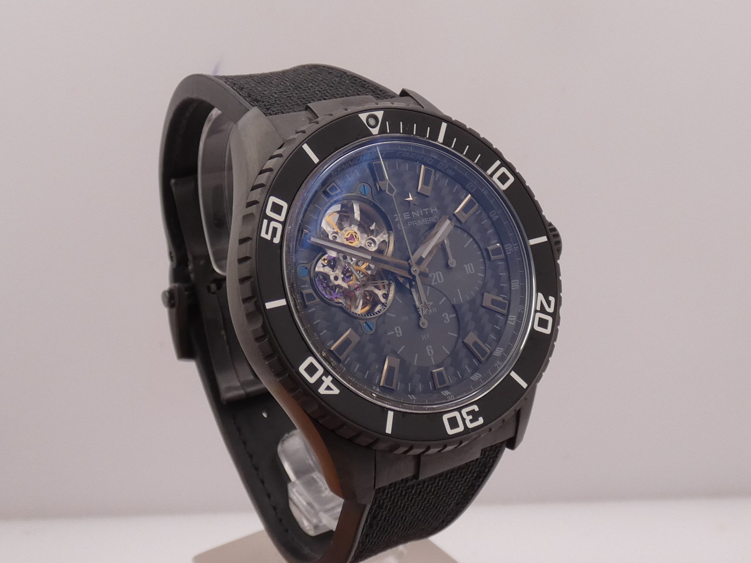 Quadrante: Open Heart, in fibra di carbonio, indici a barretta in acciaio ed in rilievo, lancette a bastone, anch’esse in acciaio brunito e luminescenti, secondi continui al 9, minuti del crono al 3, ore del crono al 6, secondi cronografici al centro, scala sessantesimale con suddivisione ad 1/5 di secondo e scala tachimetrica sul rehaut, logo Zenith all’1
