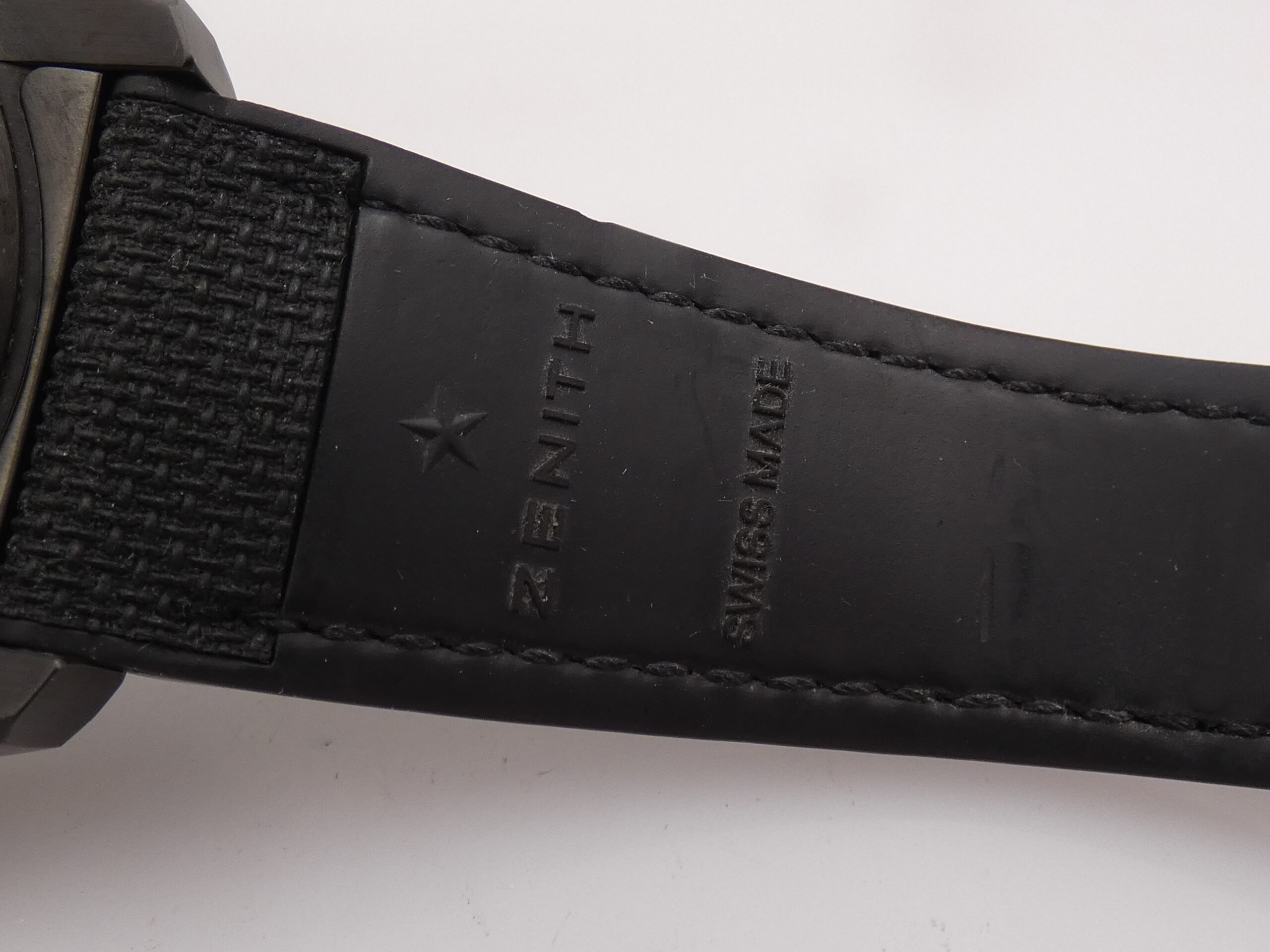 Dial: Open Heart, carbon fiber, raised steel bar indexes, baton hands, also in burnished steel and luminescent, running seconds at 9 o’clock, chronograph minutes at 3 o’clock, chronograph hours at 6 o’clock, center chronograph seconds, 60-second scale with 1/5th of a second subdivisions and tachometric scale on the flange, Zenith logo at 1 o’clock