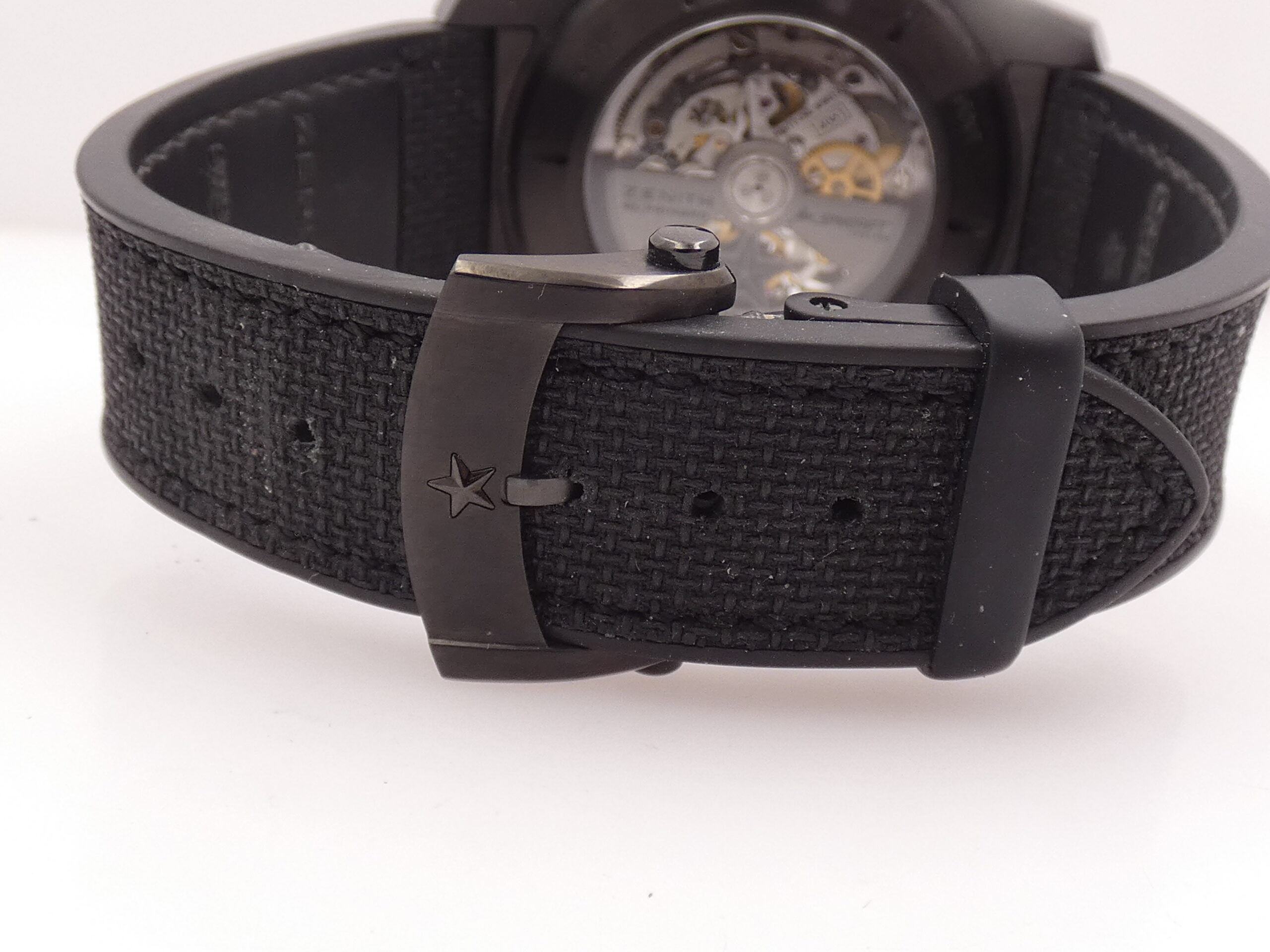 Chiusura: doppia deployante in acciaio, trattata con PVD nero, originale Zenith