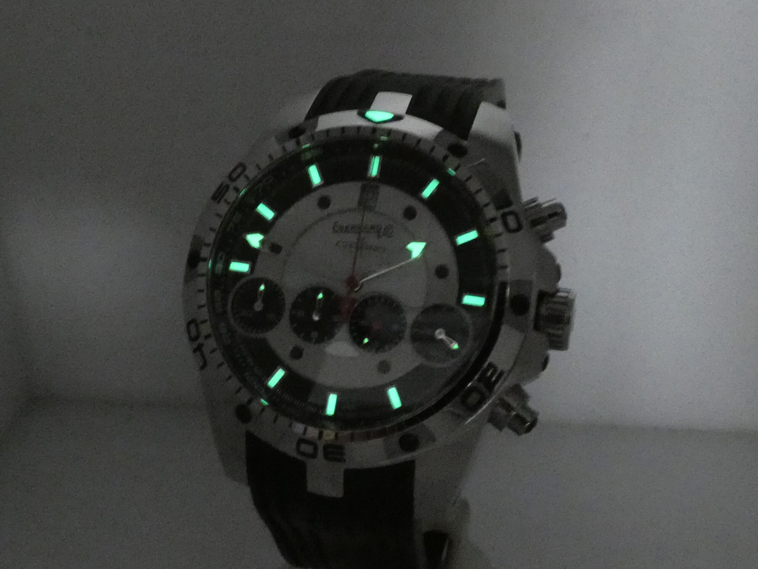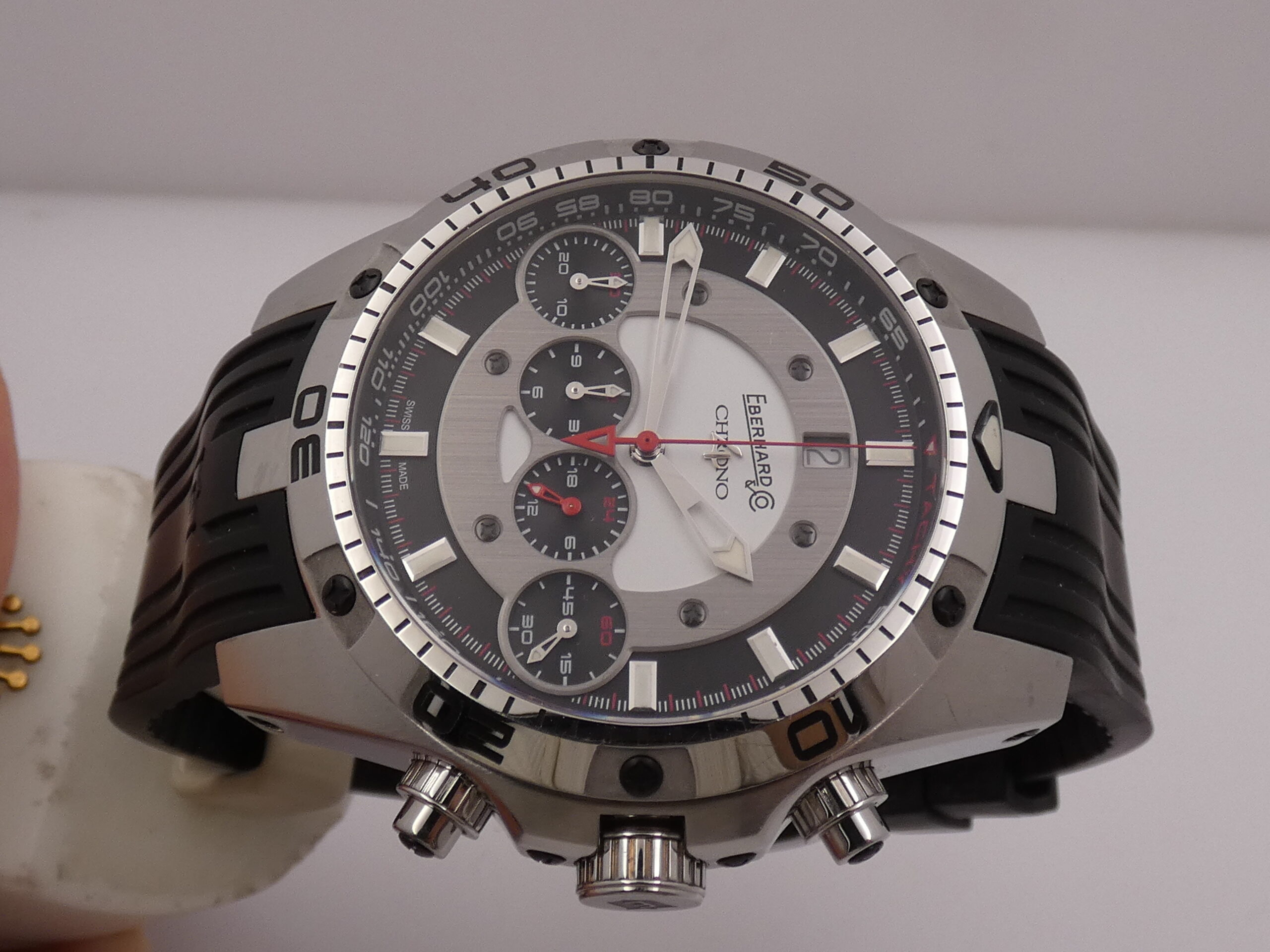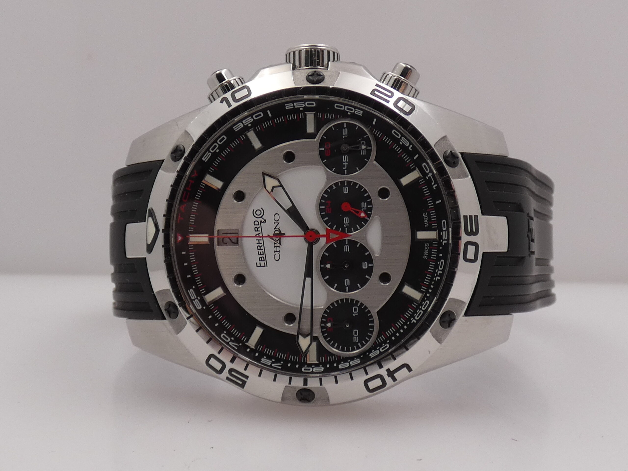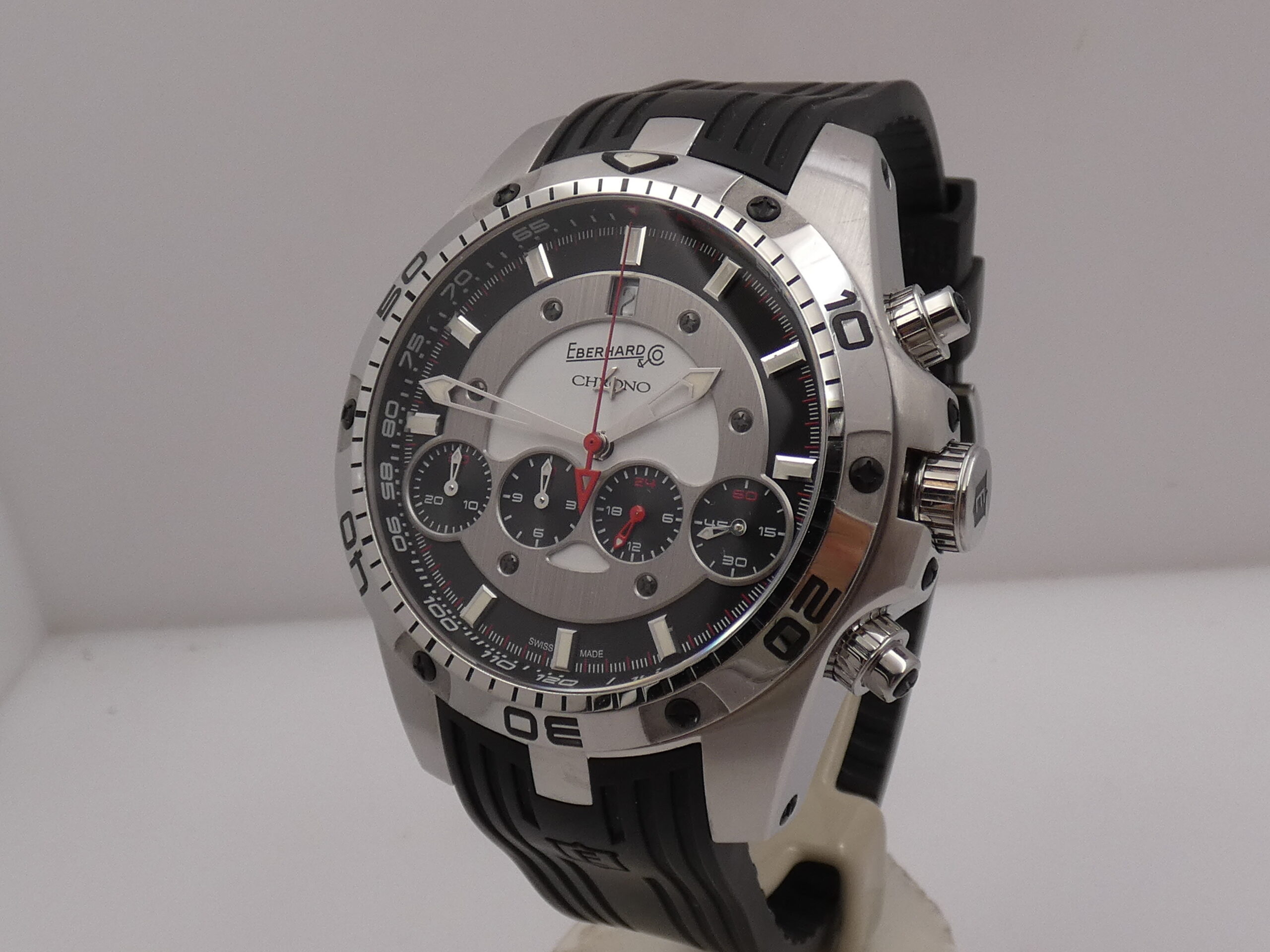 Quadrante: dual tone, con placca centrale in acciaio che racchiude i 4 contatori cronografici allineati (minuti, secondi, ore e 24 ore), indici a barretta acciaio, in rilievo e con punti luminescenti in corrispondenza, lancette skeleton, anch’esse con punti luminescenti, secondi cronografici al centro, datario al 12 con rimessa rapida in corona, logo Eberhard al 12