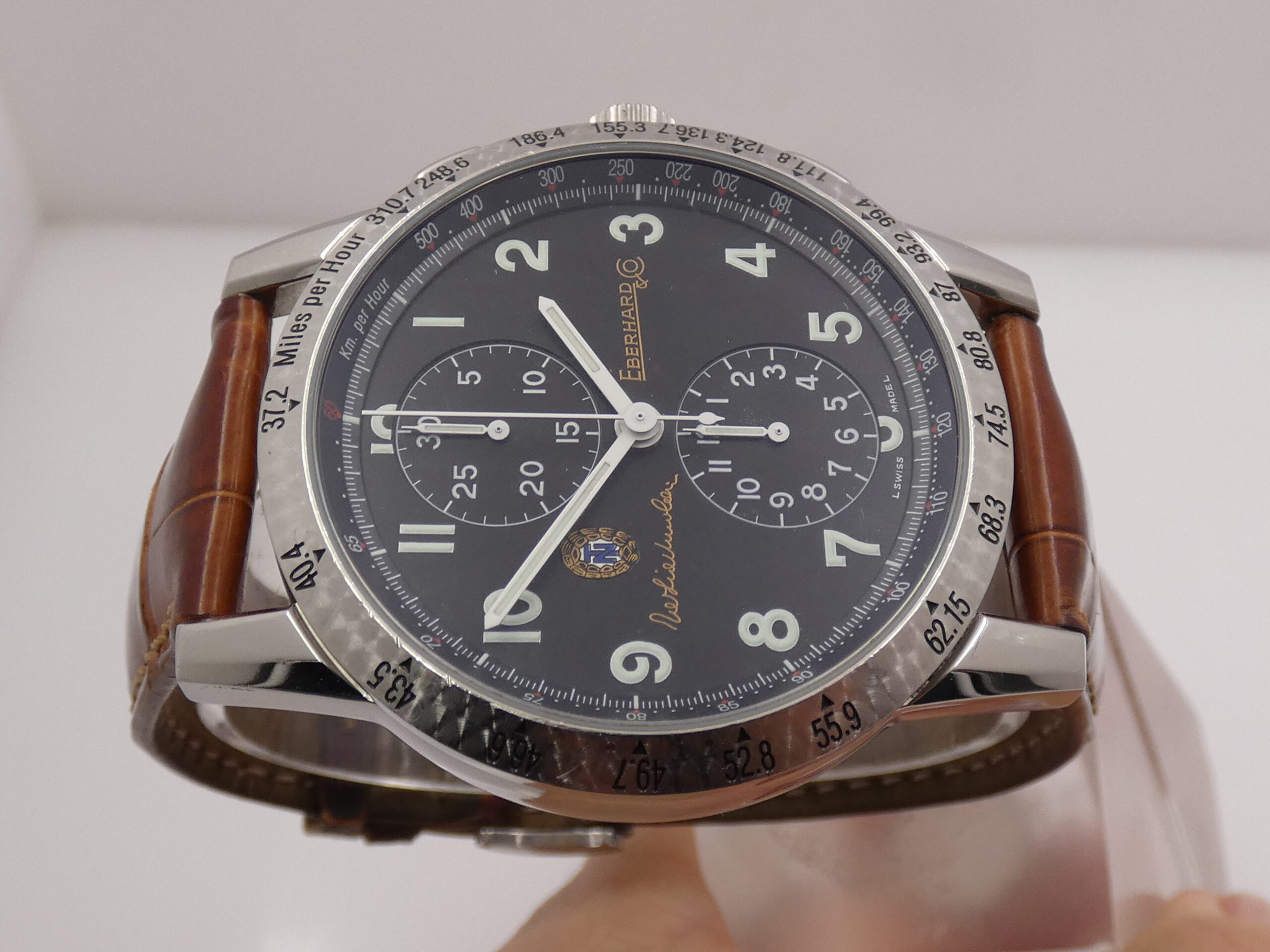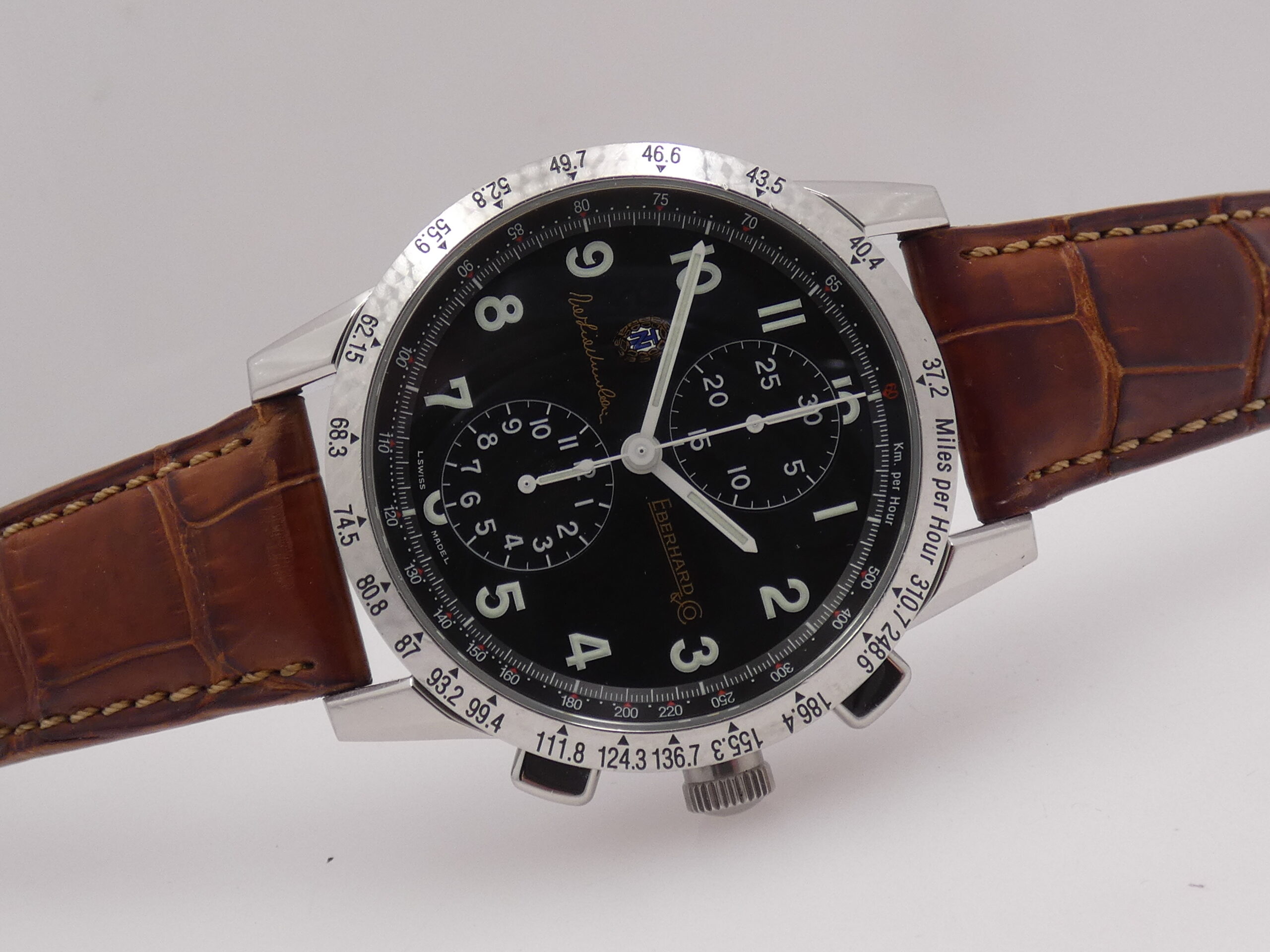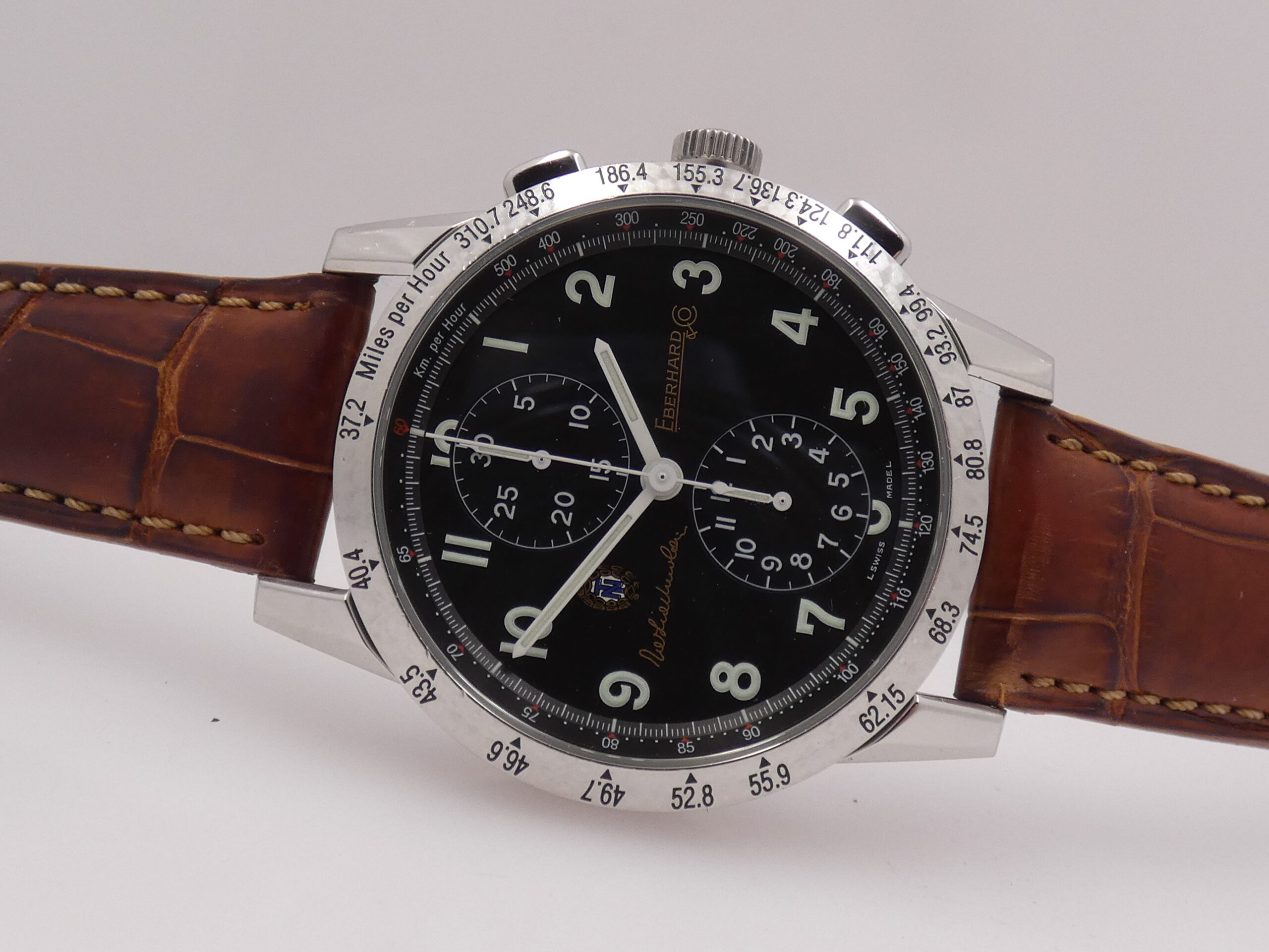 Quadrante: nero, con indici arabi trattati con materiale luminescente, lancette a stilo anch’esse luminescenti, minuti del crono al 12, ore del crono al 6, secondi cronografici al centro, scala tachimetrica in chilometri orari sul rehout, scala sessantesimale con suddivisione ad 1/5 di secondo, tartaruga chiusa (indica la seconda serie) e firma del pilota al 9, logo Eberhard al 3