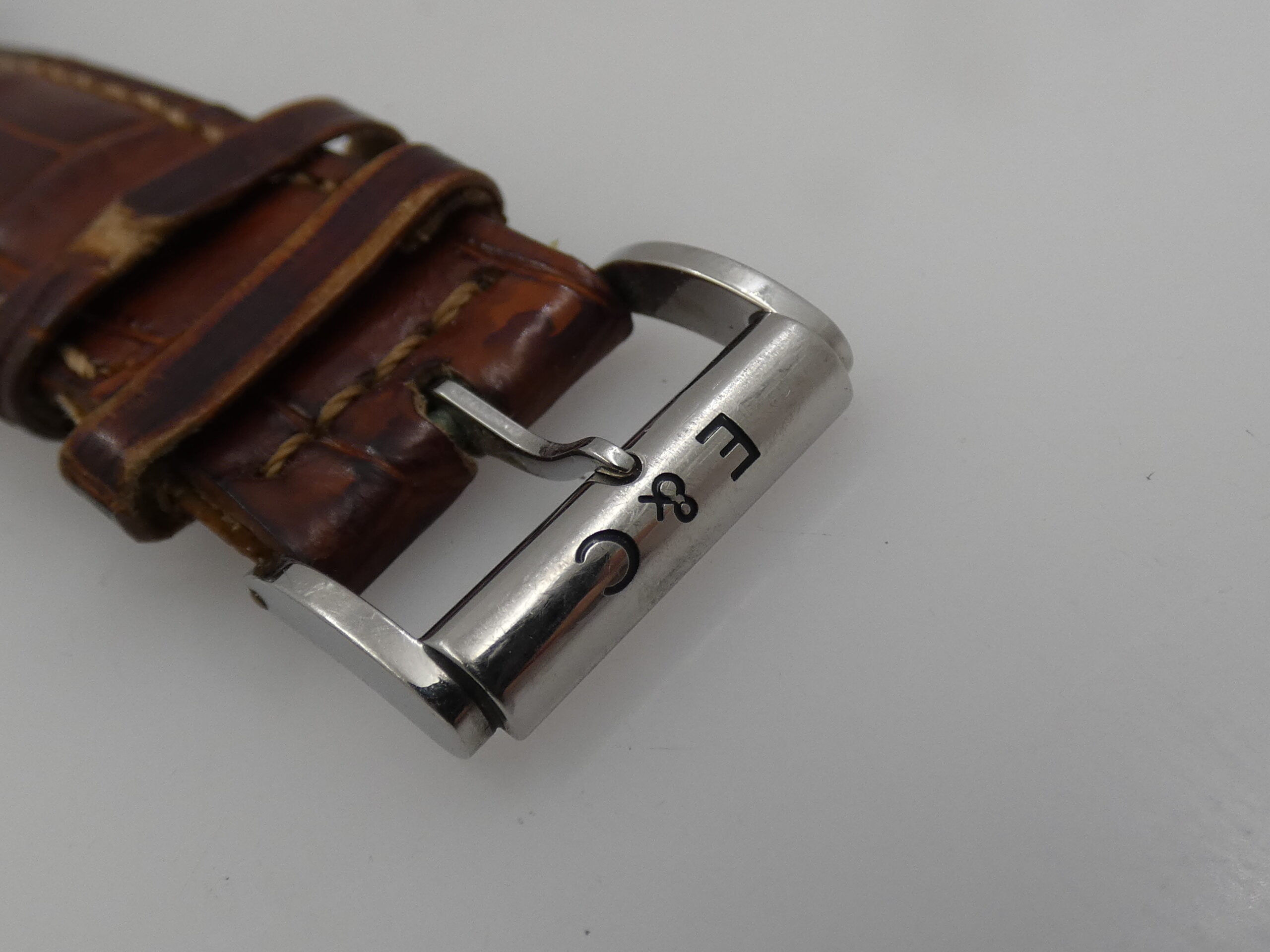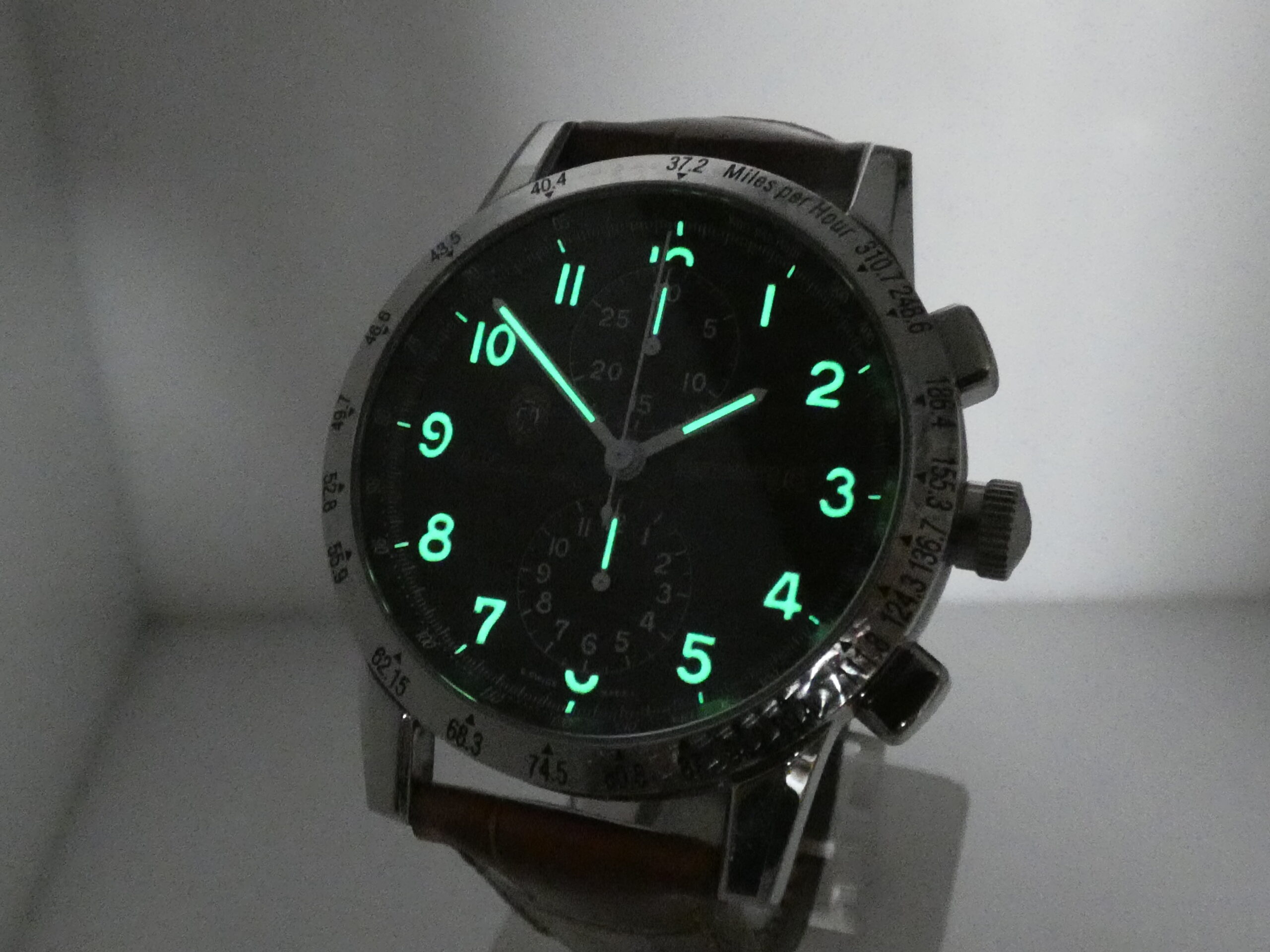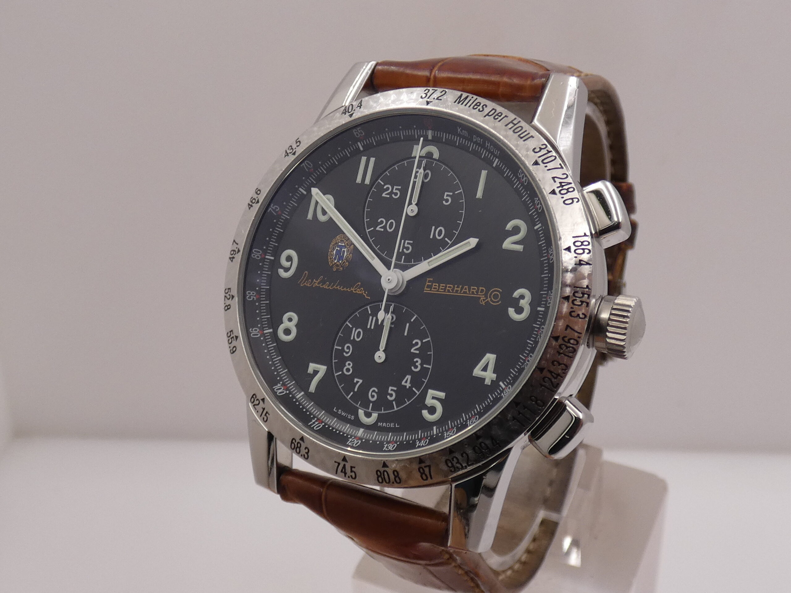 Quadrante: nero, con indici arabi trattati con materiale luminescente, lancette a stilo anch’esse luminescenti, minuti del crono al 12, ore del crono al 6, secondi cronografici al centro, scala tachimetrica in chilometri orari sul rehout, scala sessantesimale con suddivisione ad 1/5 di secondo, tartaruga chiusa (indica la seconda serie) e firma del pilota al 9, logo Eberhard al 3