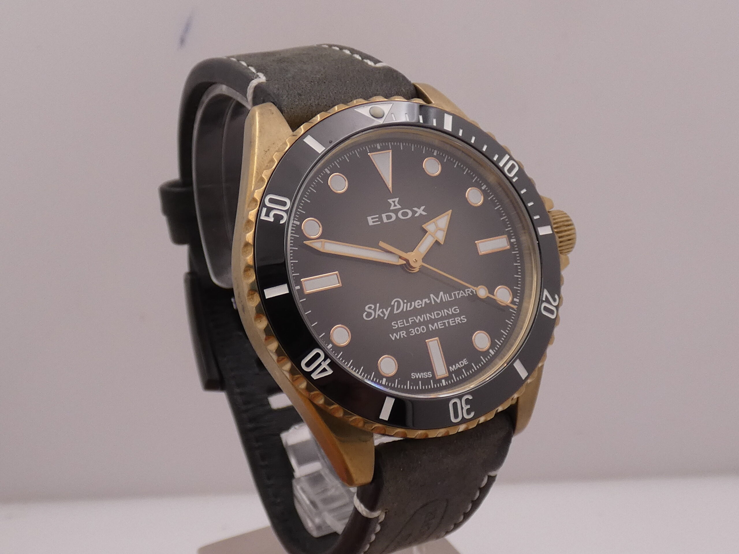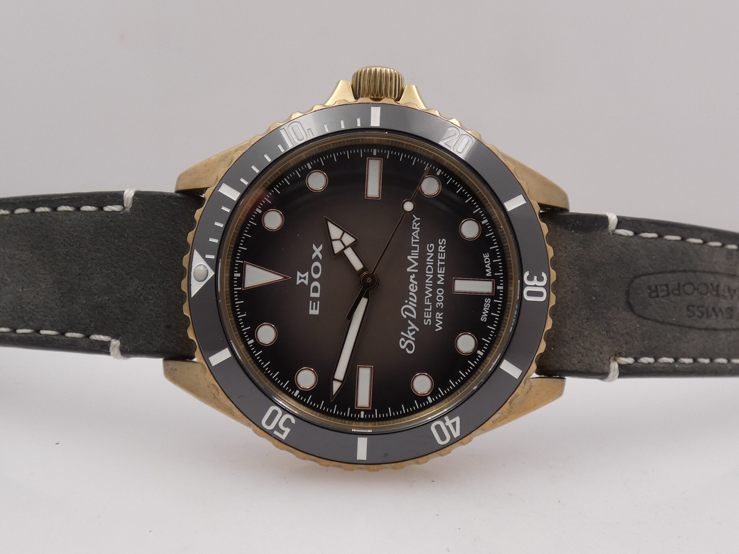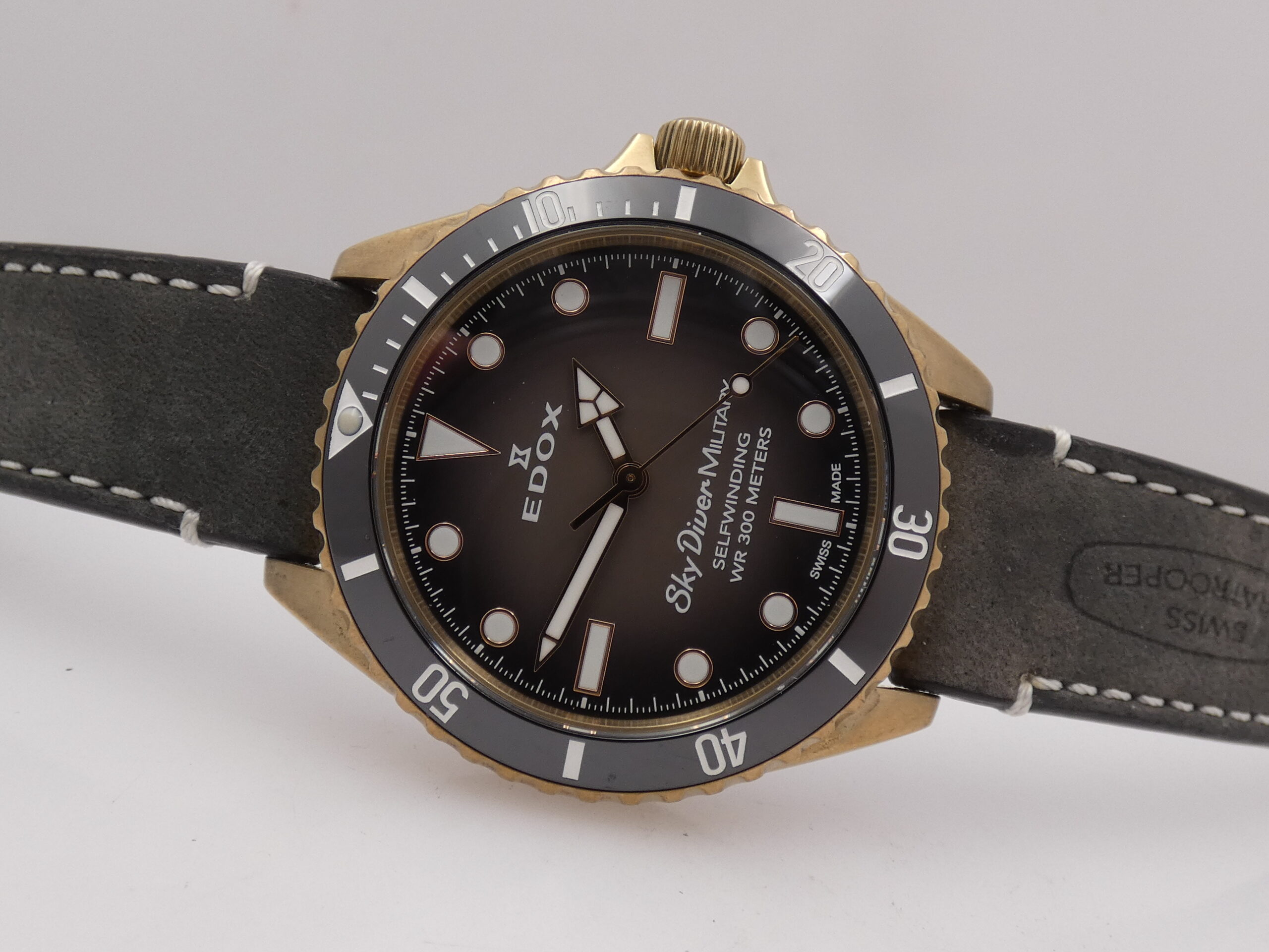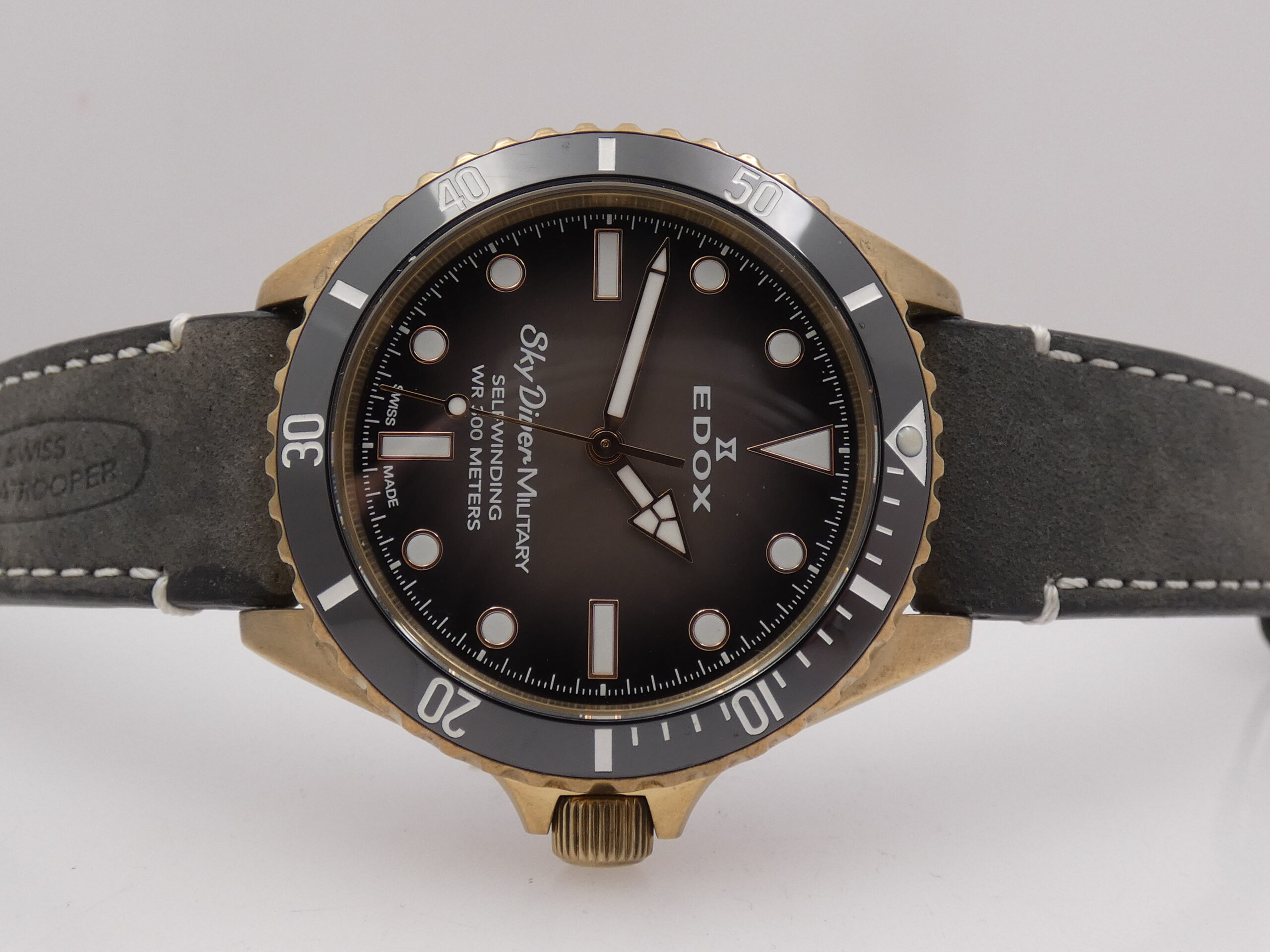 Quadrante: nero, con indici a bicchierini, barrette a quarti, in acciaio, in rilievo e trattati con materiale luminescente, lancette a matita anch’esse in acciaio e luminescenti, scala sessantesimale con suddivisione ad 1/5 di secondo, logo Edox al 12