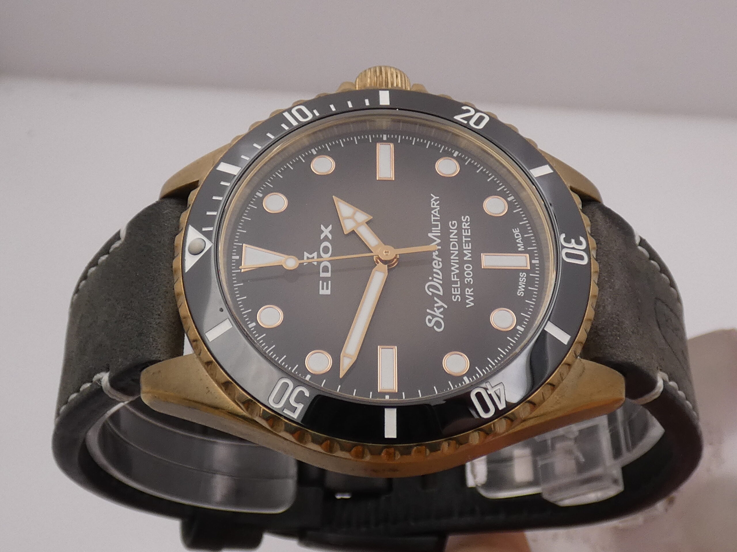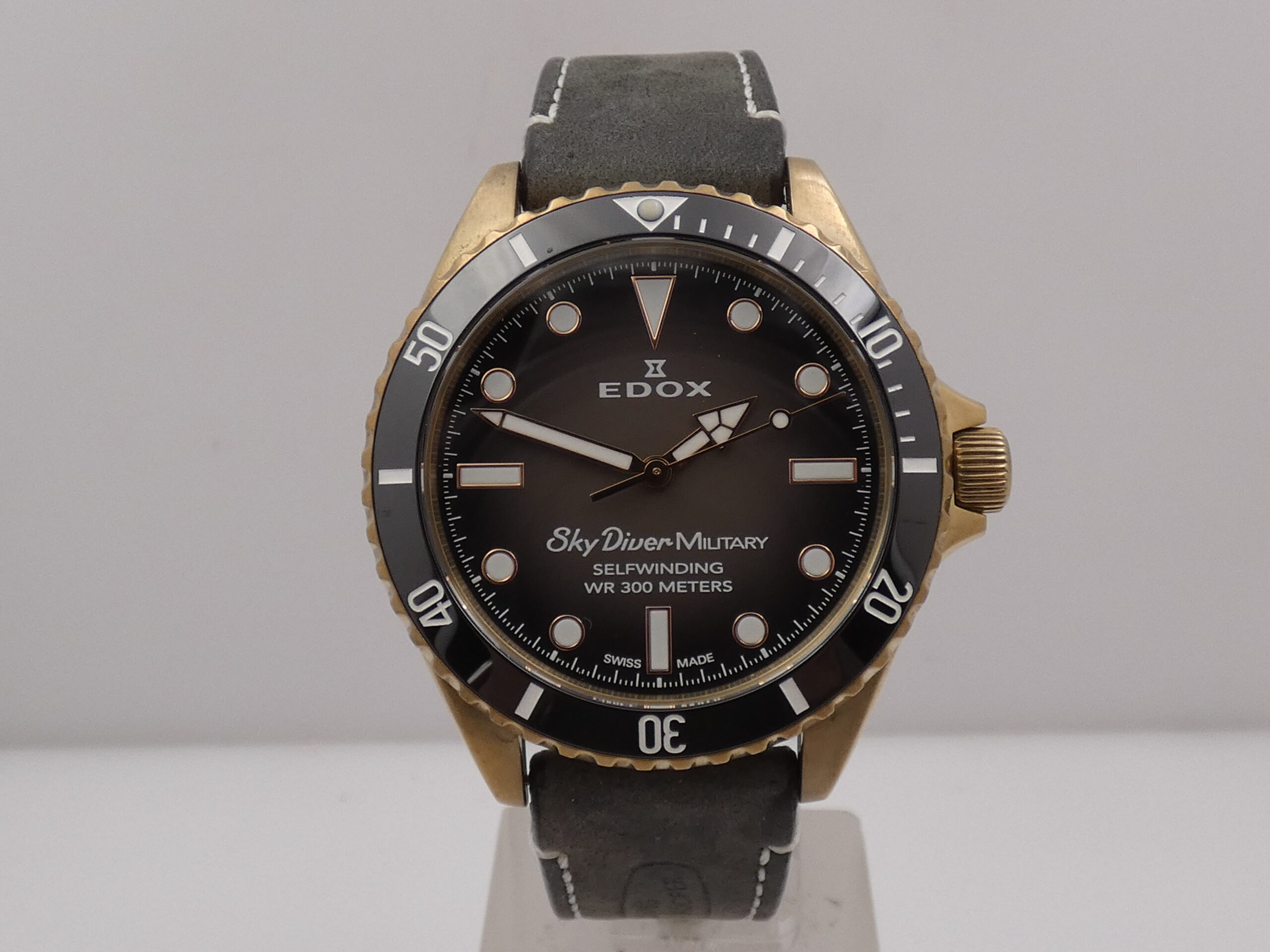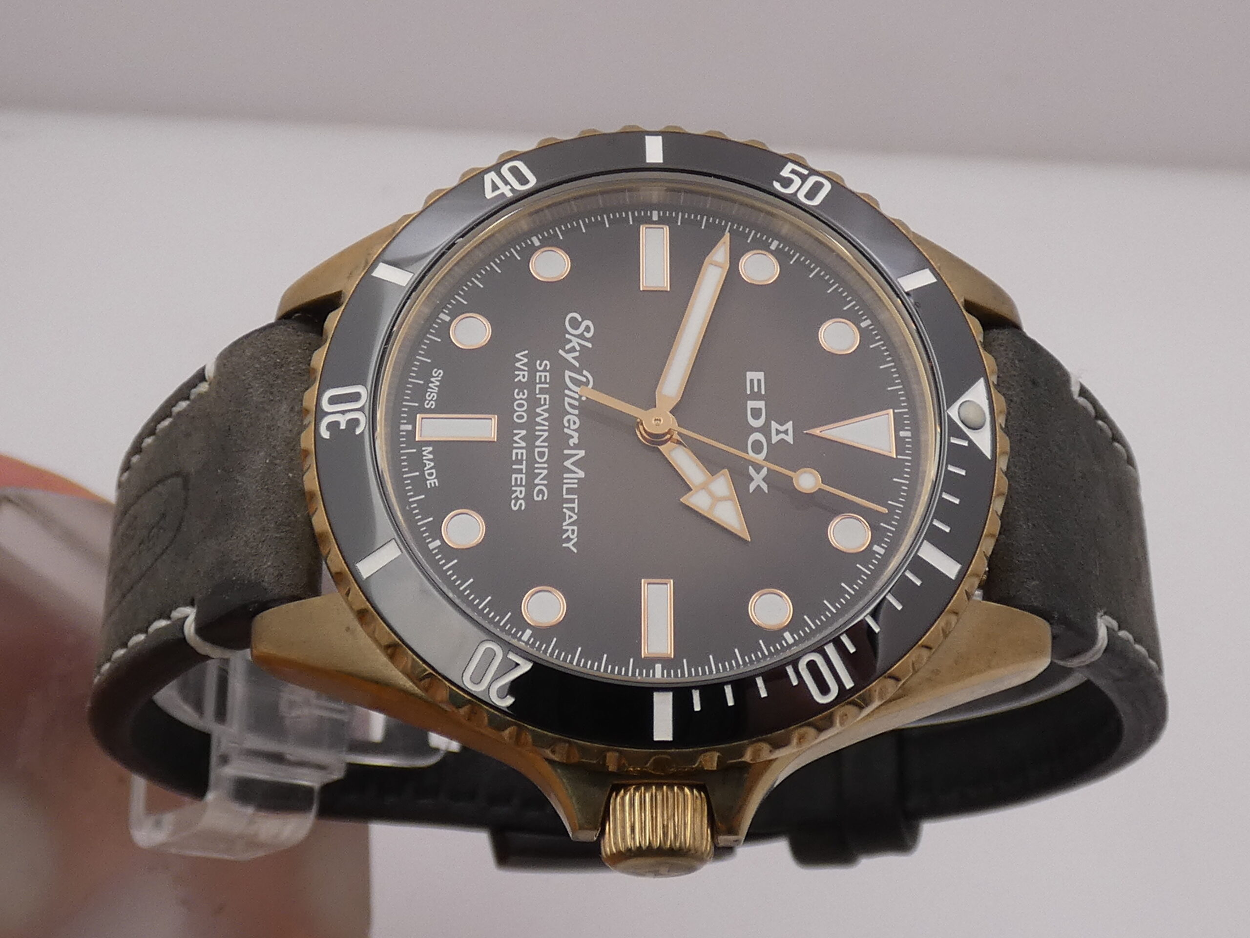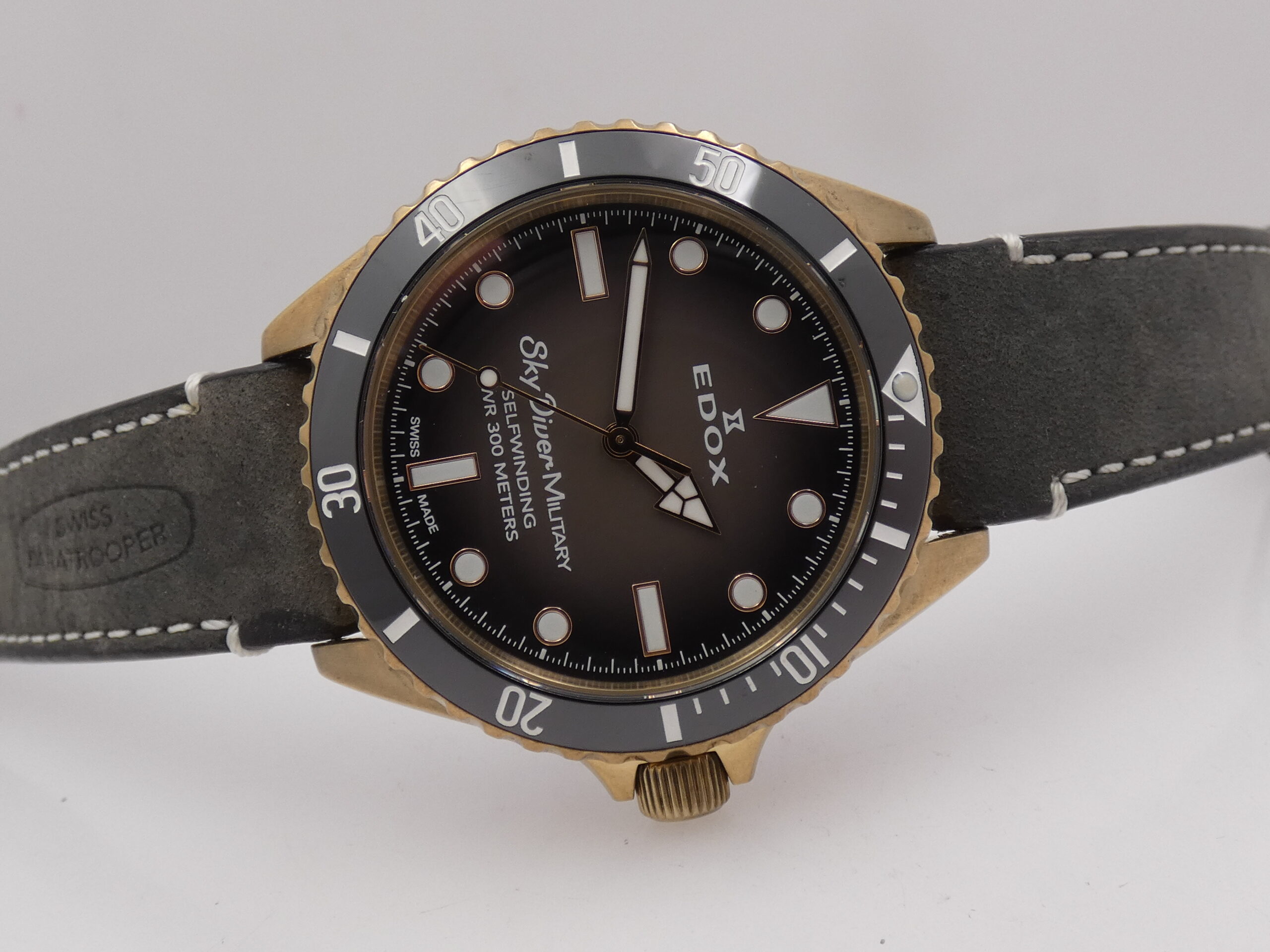 Quadrante: nero, con indici a bicchierini, barrette a quarti, in acciaio, in rilievo e trattati con materiale luminescente, lancette a matita anch’esse in acciaio e luminescenti, scala sessantesimale con suddivisione ad 1/5 di secondo, logo Edox al 12