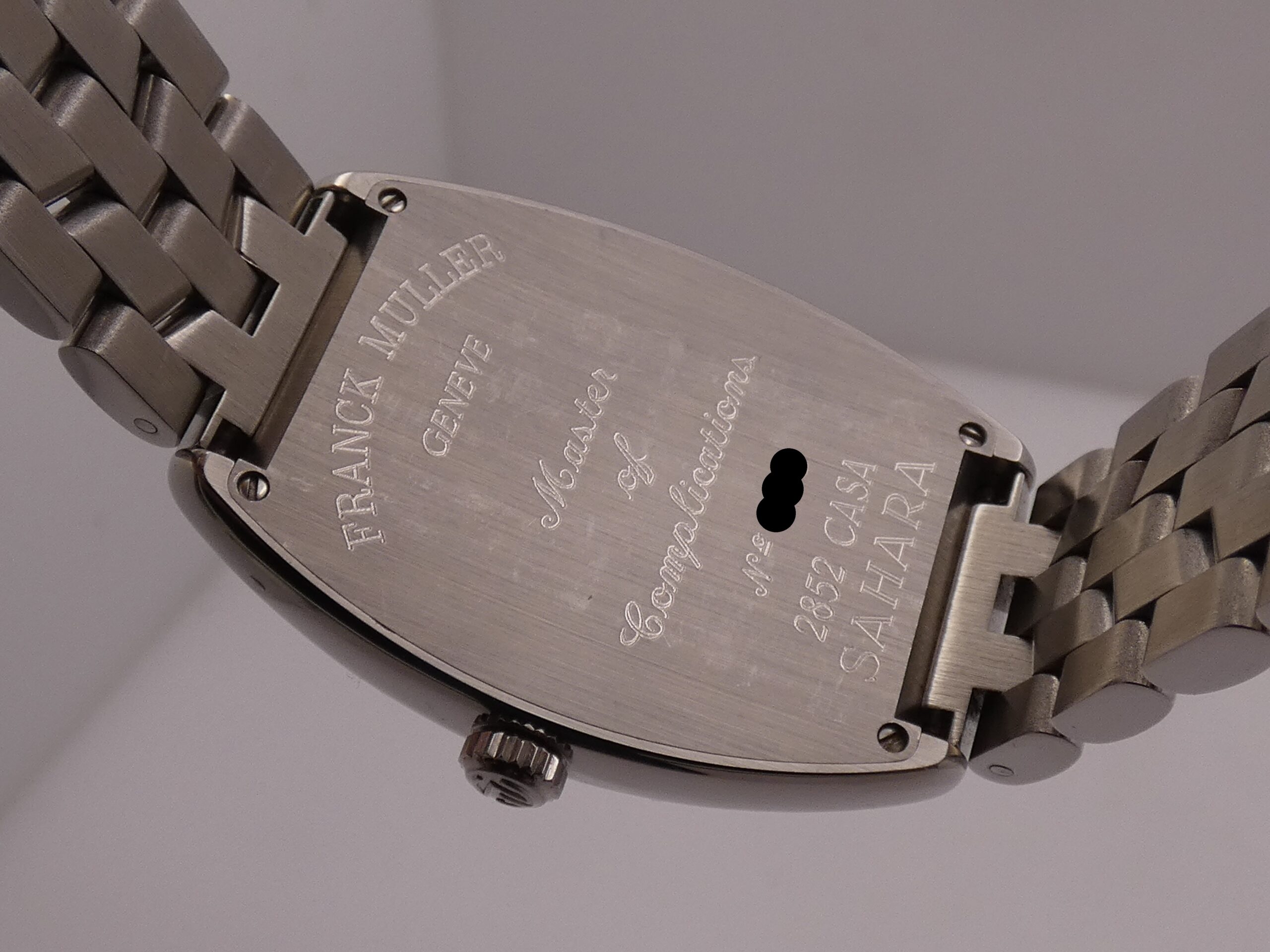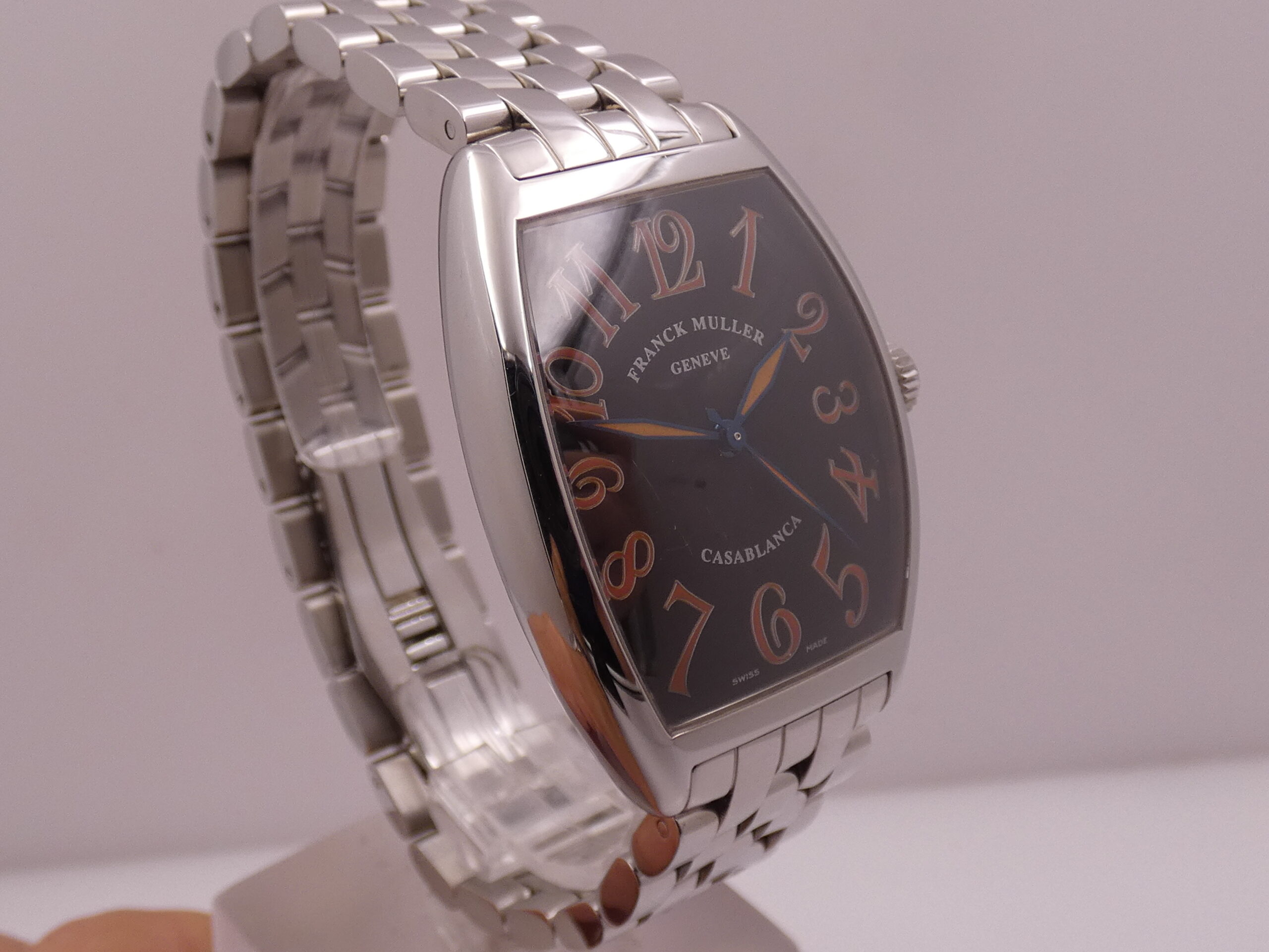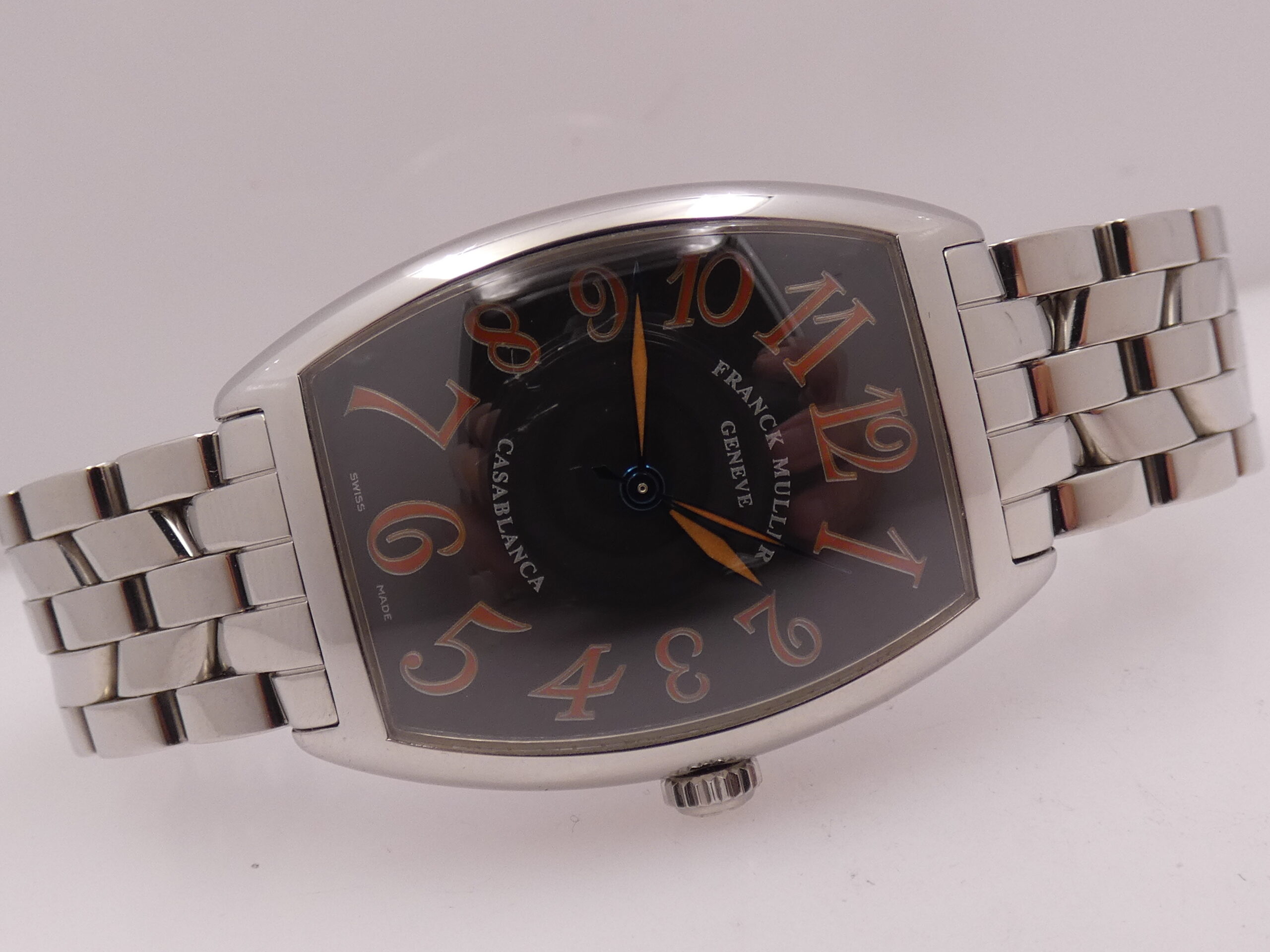 Dial: Black, with orange Arabic numerals, blued steel leaf-shaped hands treated with luminescent material, center seconds hand, Franck Muller logo at 12 o’clock