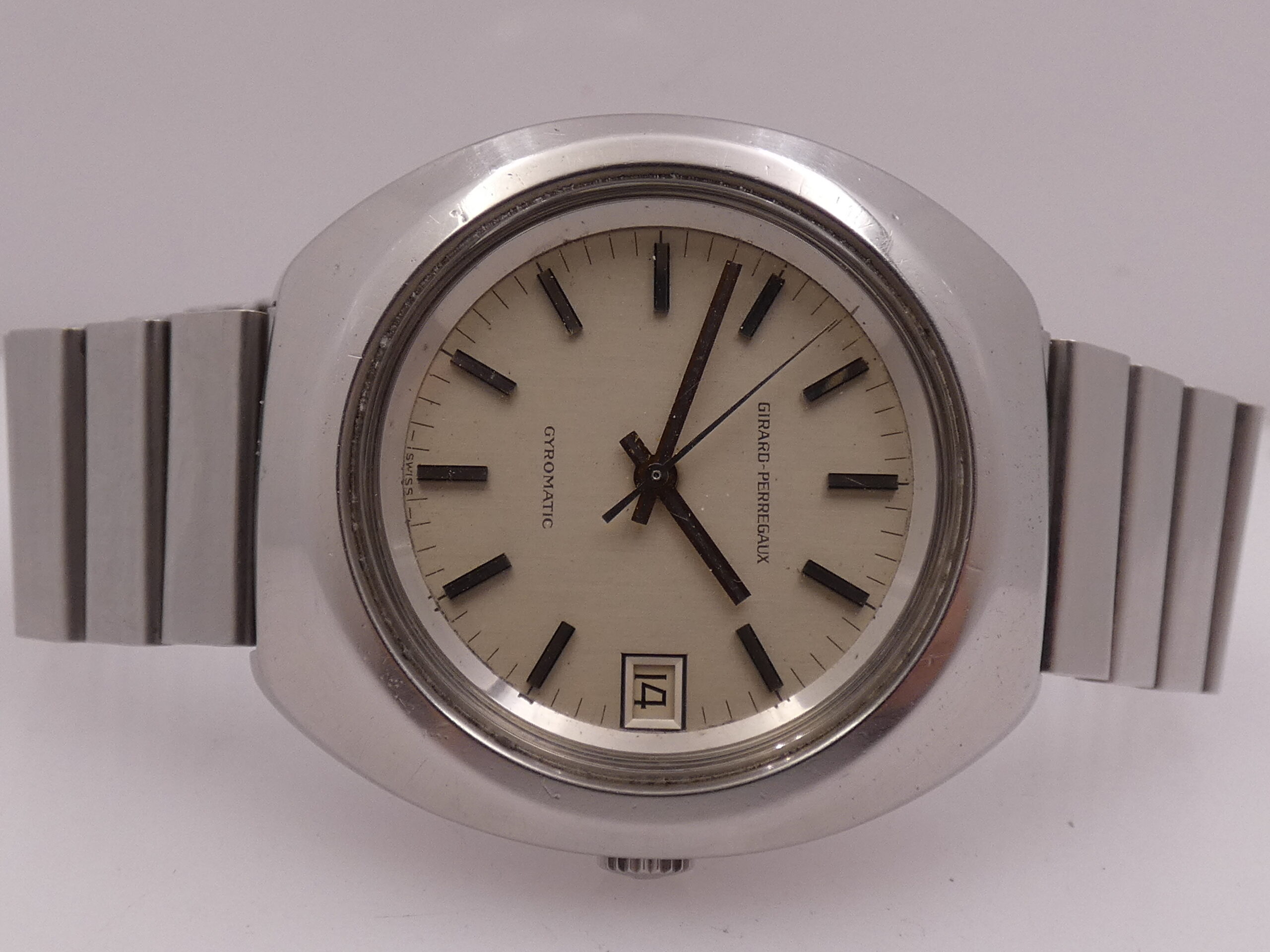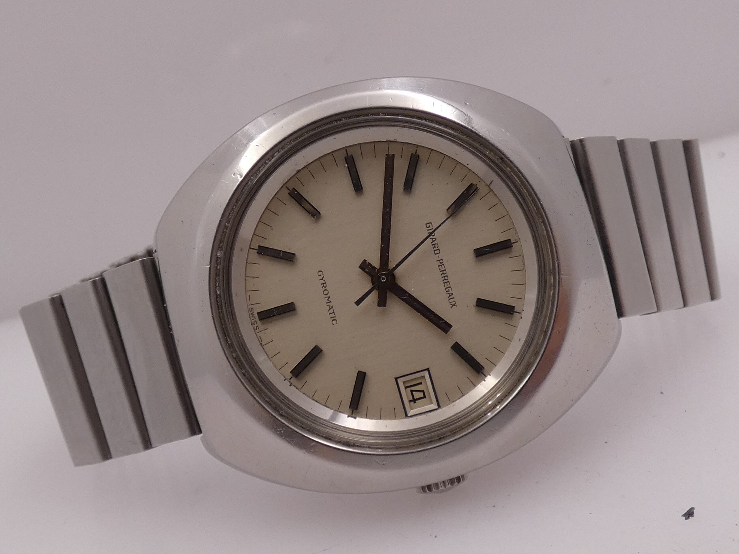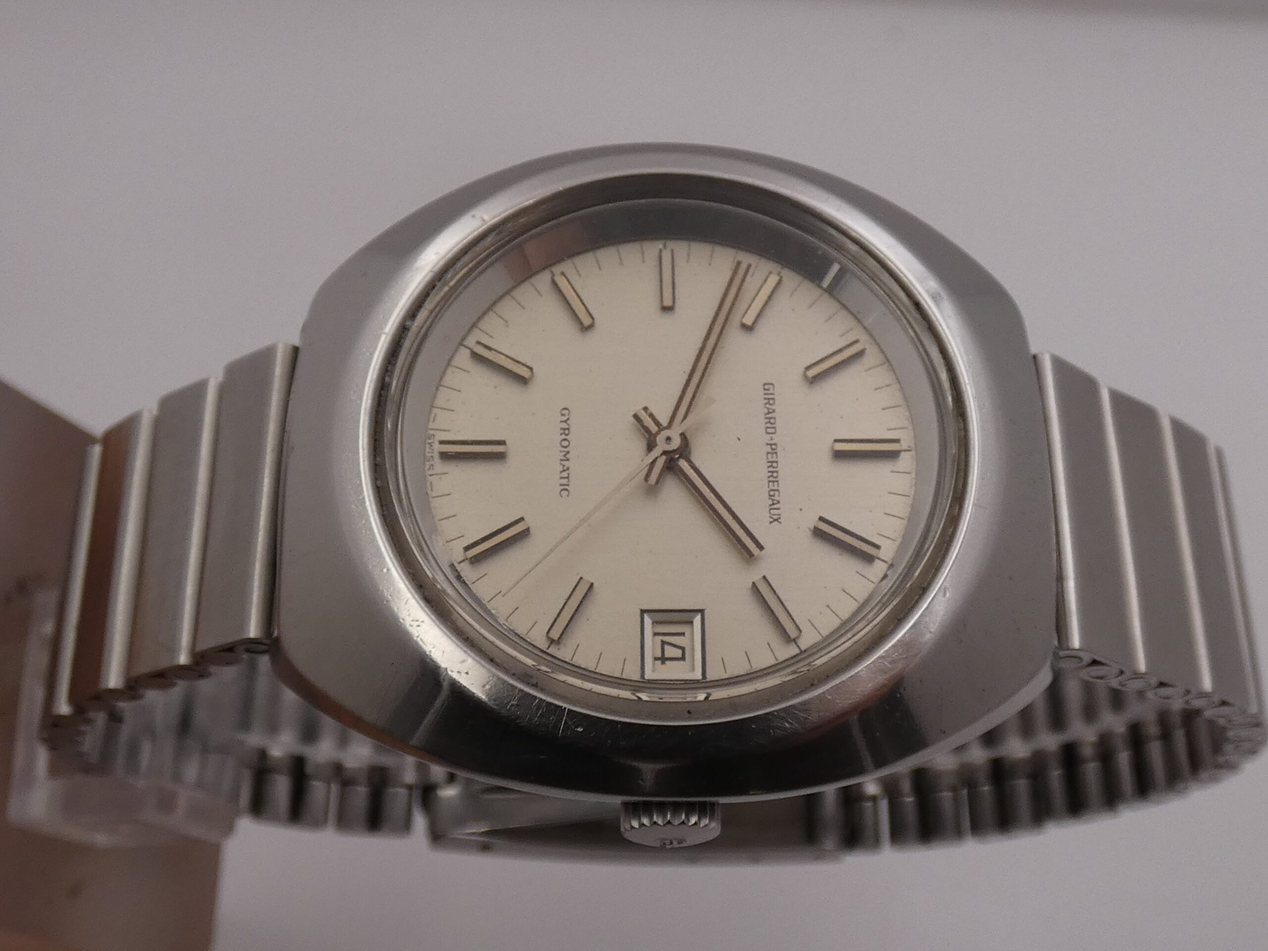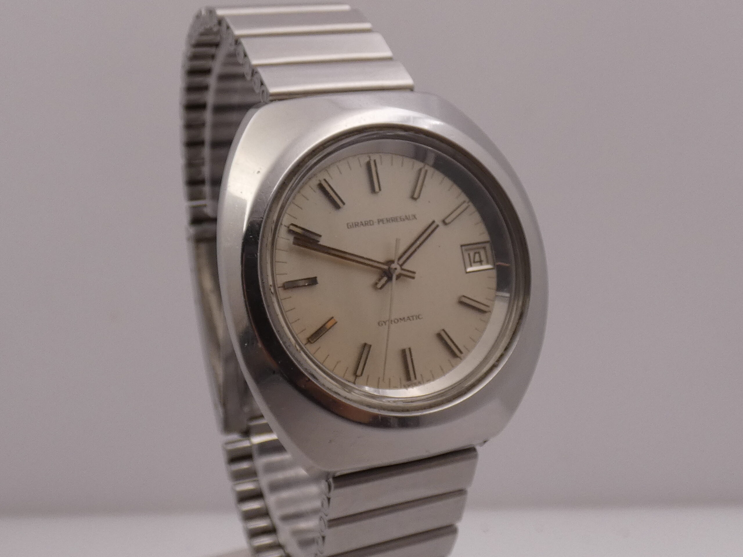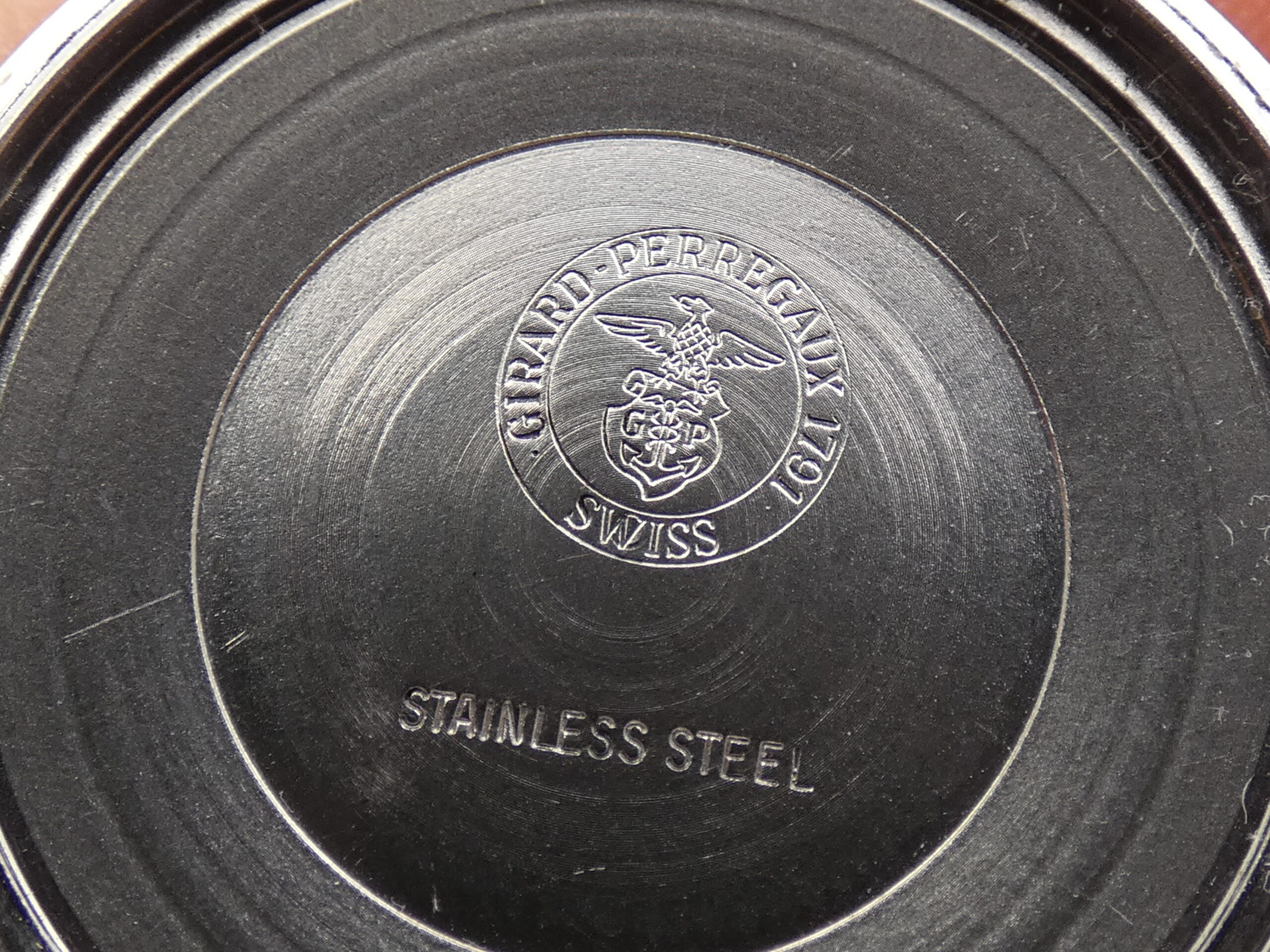 Dial: silver, with steel and embossed bar indexes, baton hands, also in steel, central seconds, date at 3 with quick set in the crown, sextimal scale, Girard Perregaux logo at 12