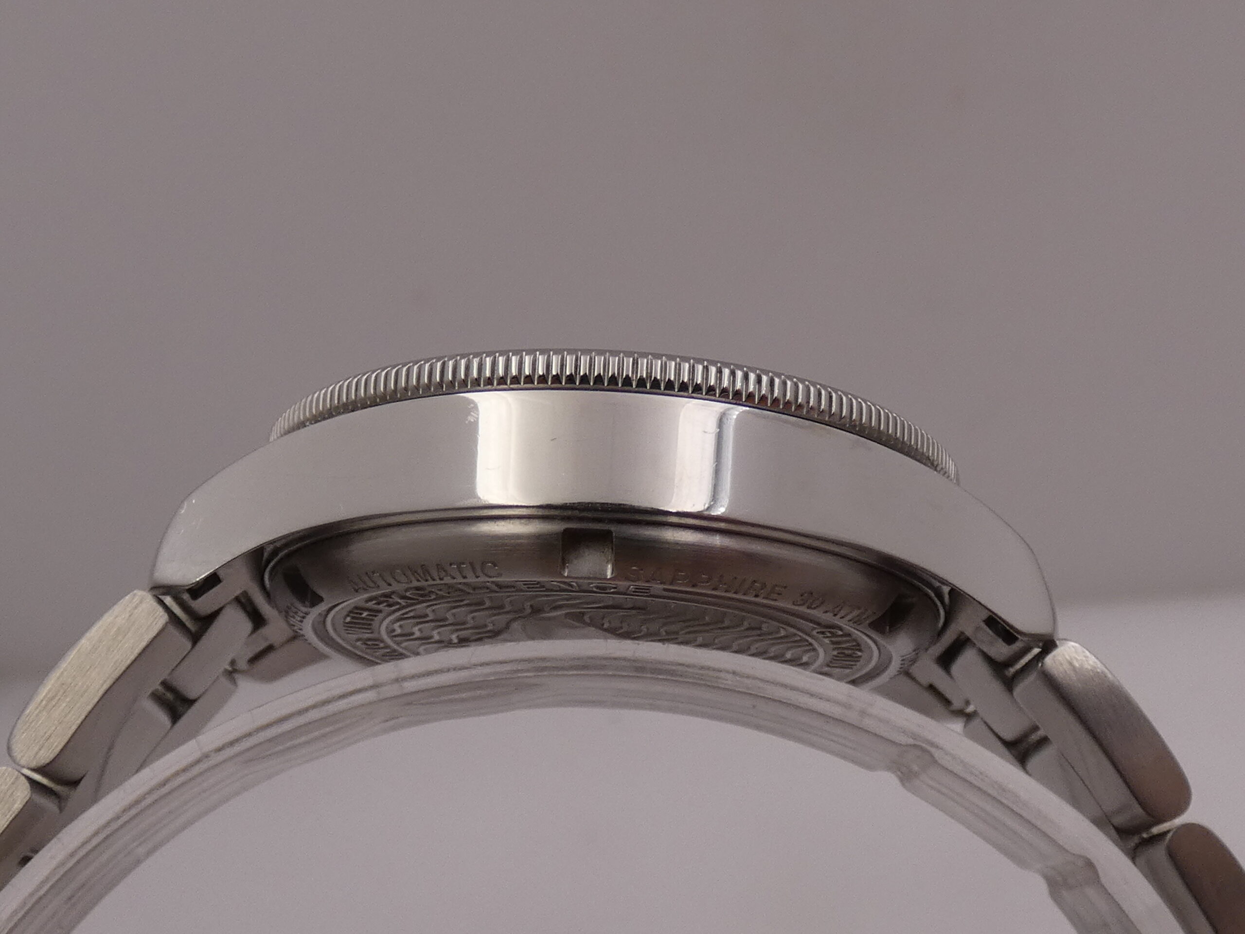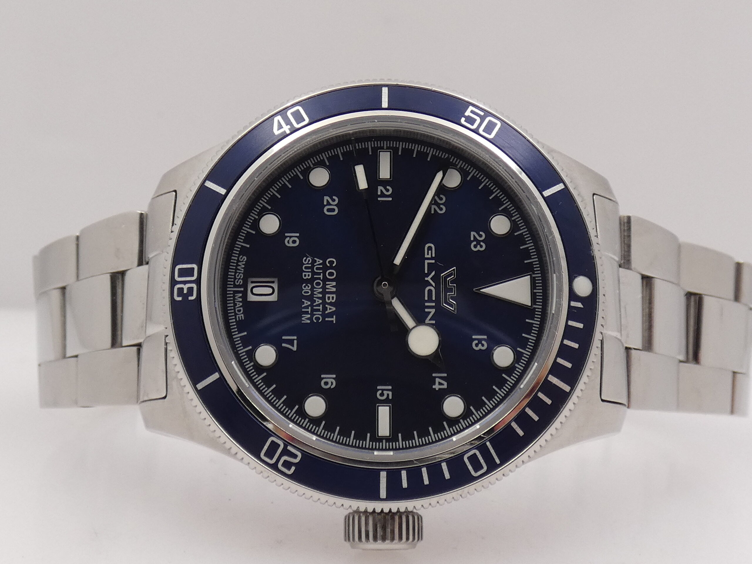 Dial: Blue sunburst, with raised steel indexes treated with luminescent material, luminescent steel cathedral hands, center seconds, date display at 6 o’clock with quick-set crown, central 24-hour scale, 60-minute scale with 1/5th of a second divisions, Glycine logo at 12 o’clock
