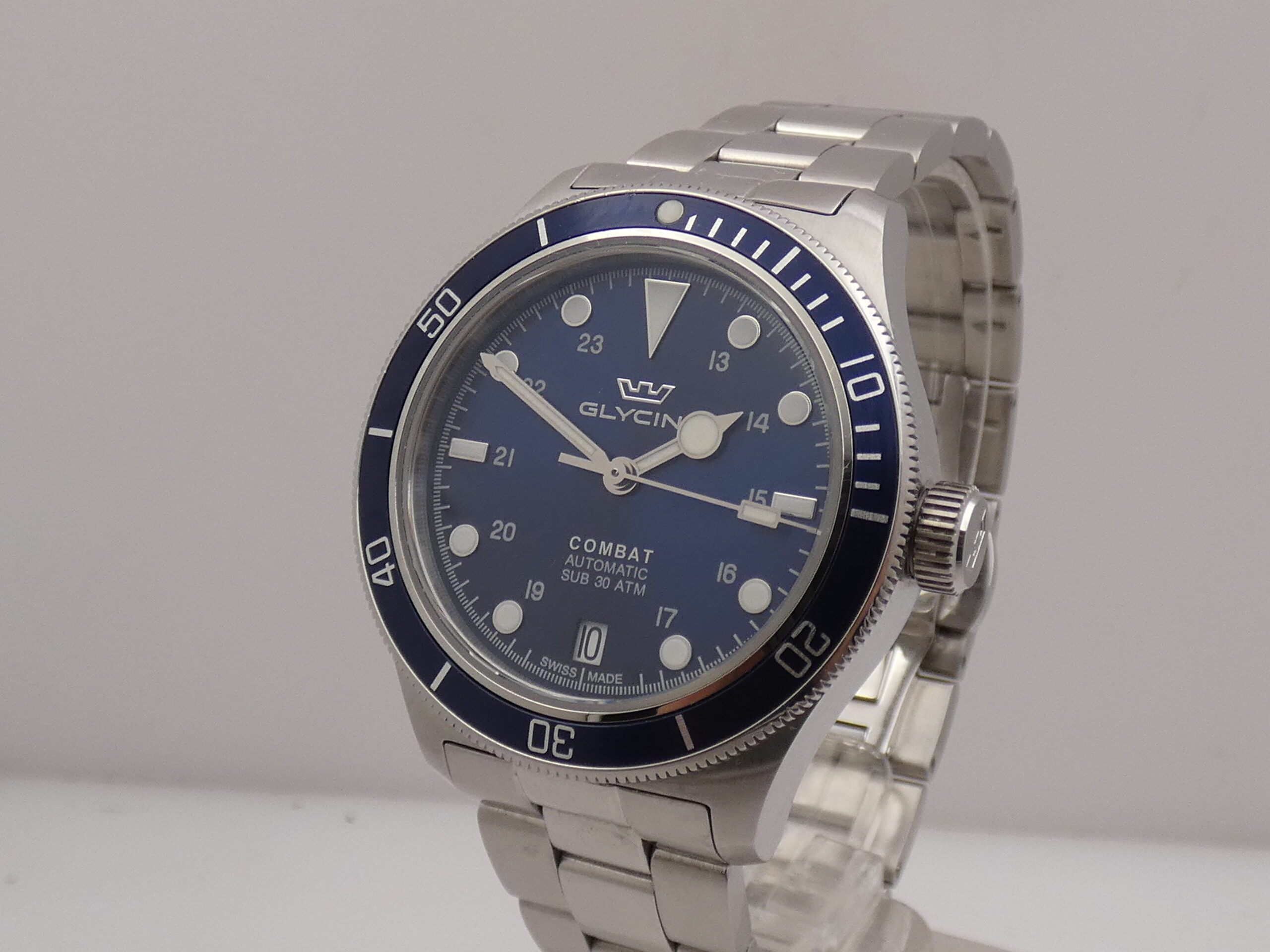 Quadrante: blu soleil, con indici a bicchierini, in acciaio, in rilievo e trattati con materiale luminescente, lancette cattedrale anch’esse in acciaio e luminescenti, secondi al centro, datario al 6 con rimessa rapida in corona, scala centrale delle 24 ore, scala sessantesimale con suddivisione ad 1/5 di secondo, logo Glycine al 12