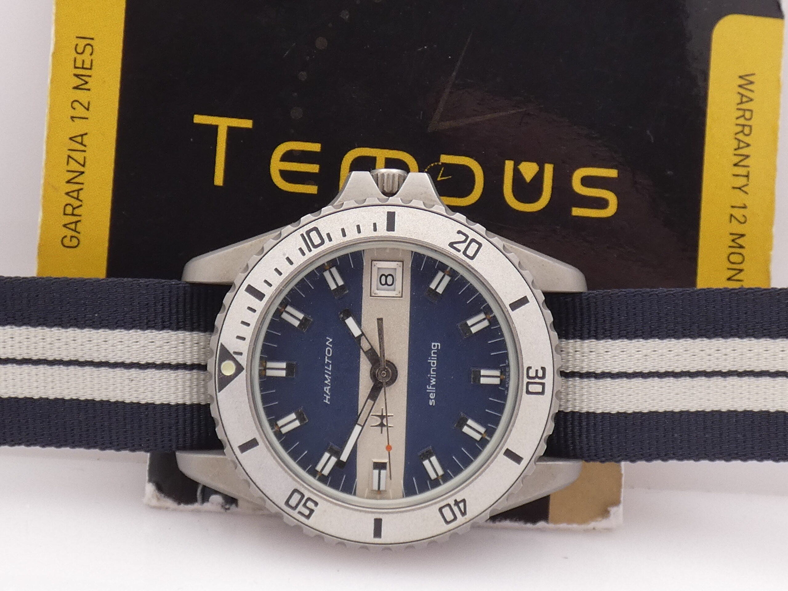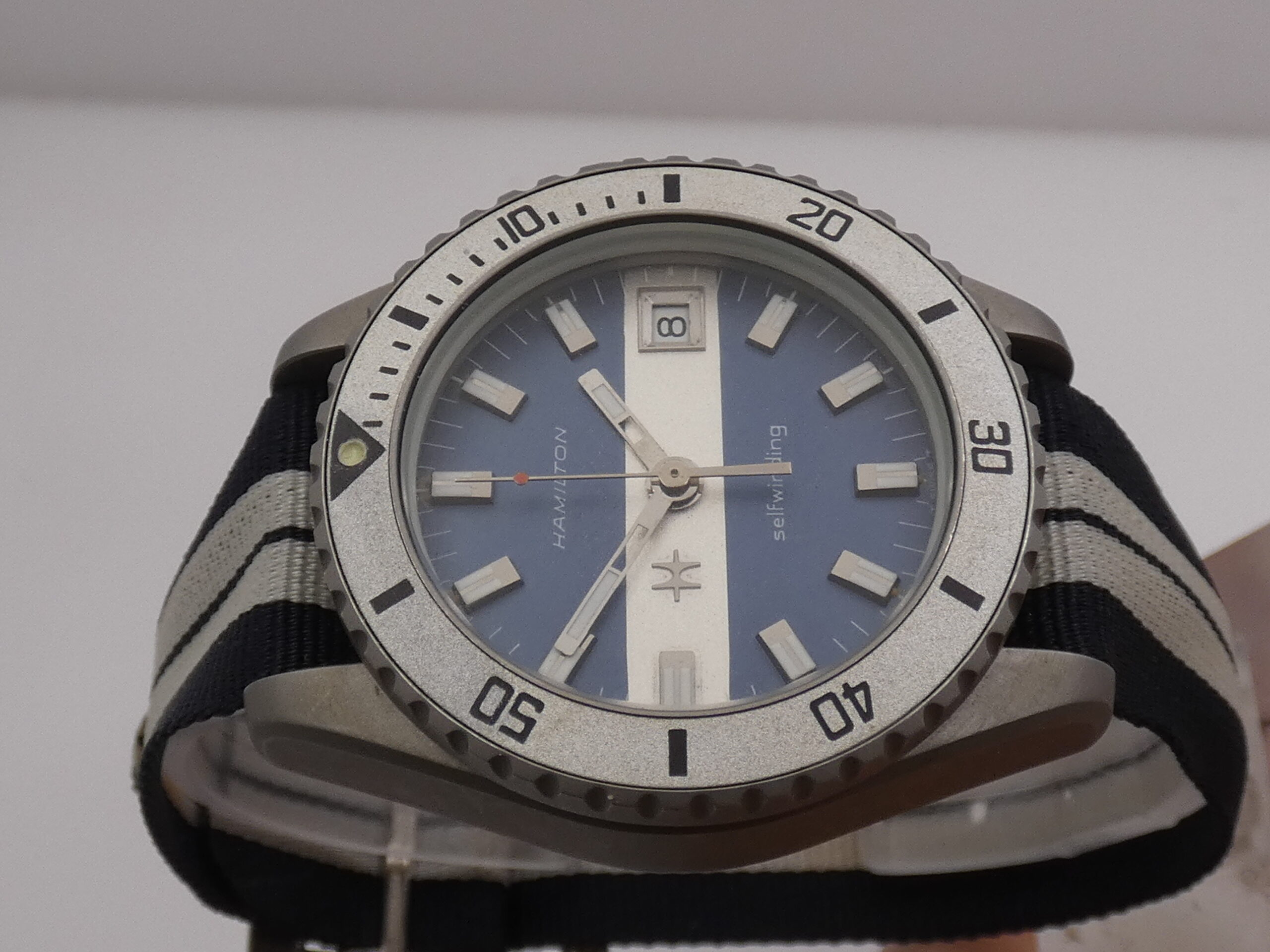 Quadrante: blue con fascia centrale argentata, effetto matte, indici a barretta, in acciaio ed in rilievo, lancette a bastone in acciaio e trattate al trizio, datario al 3, scala sessantesimale, logo Hamilton al 9 e al 12