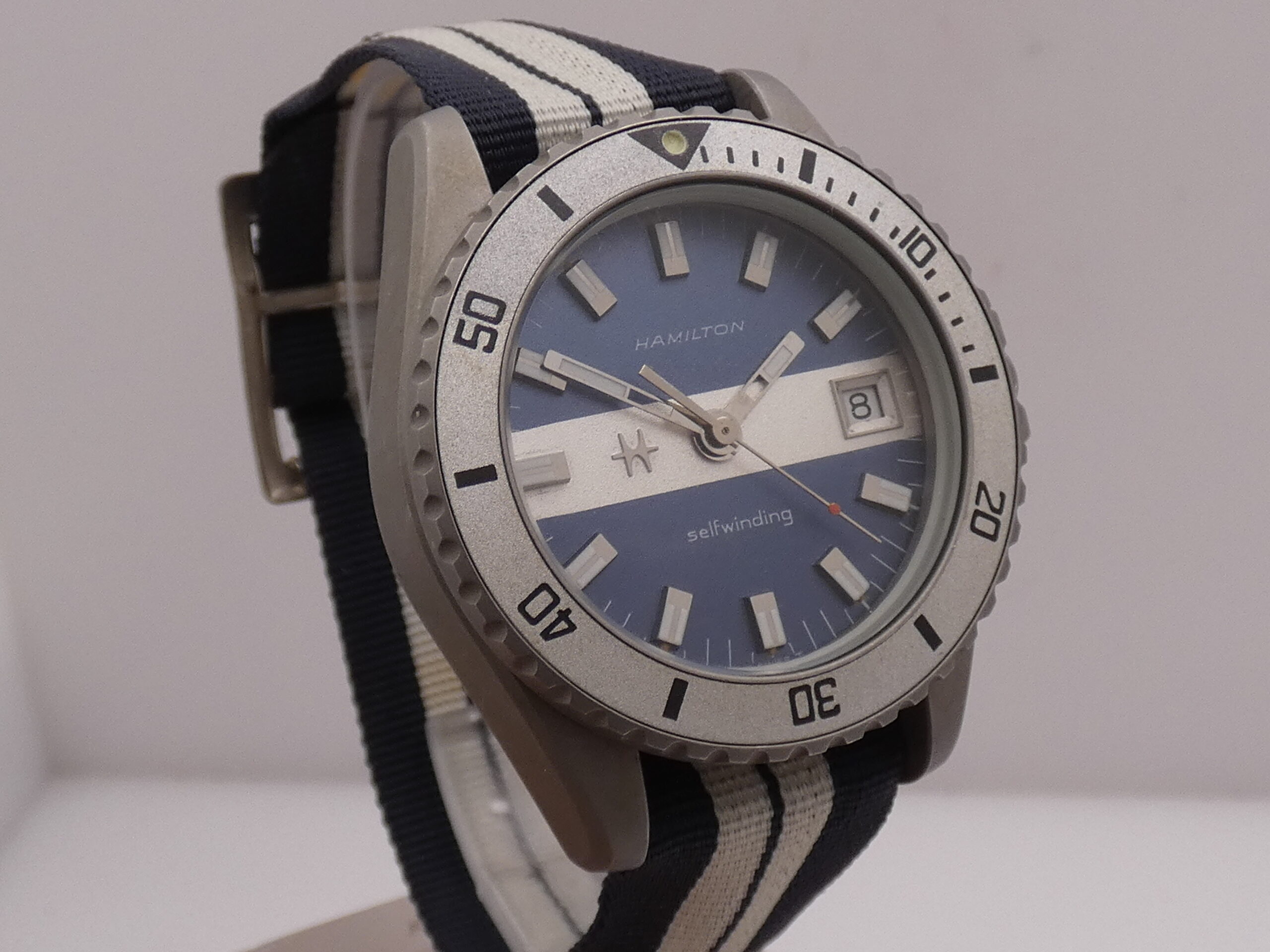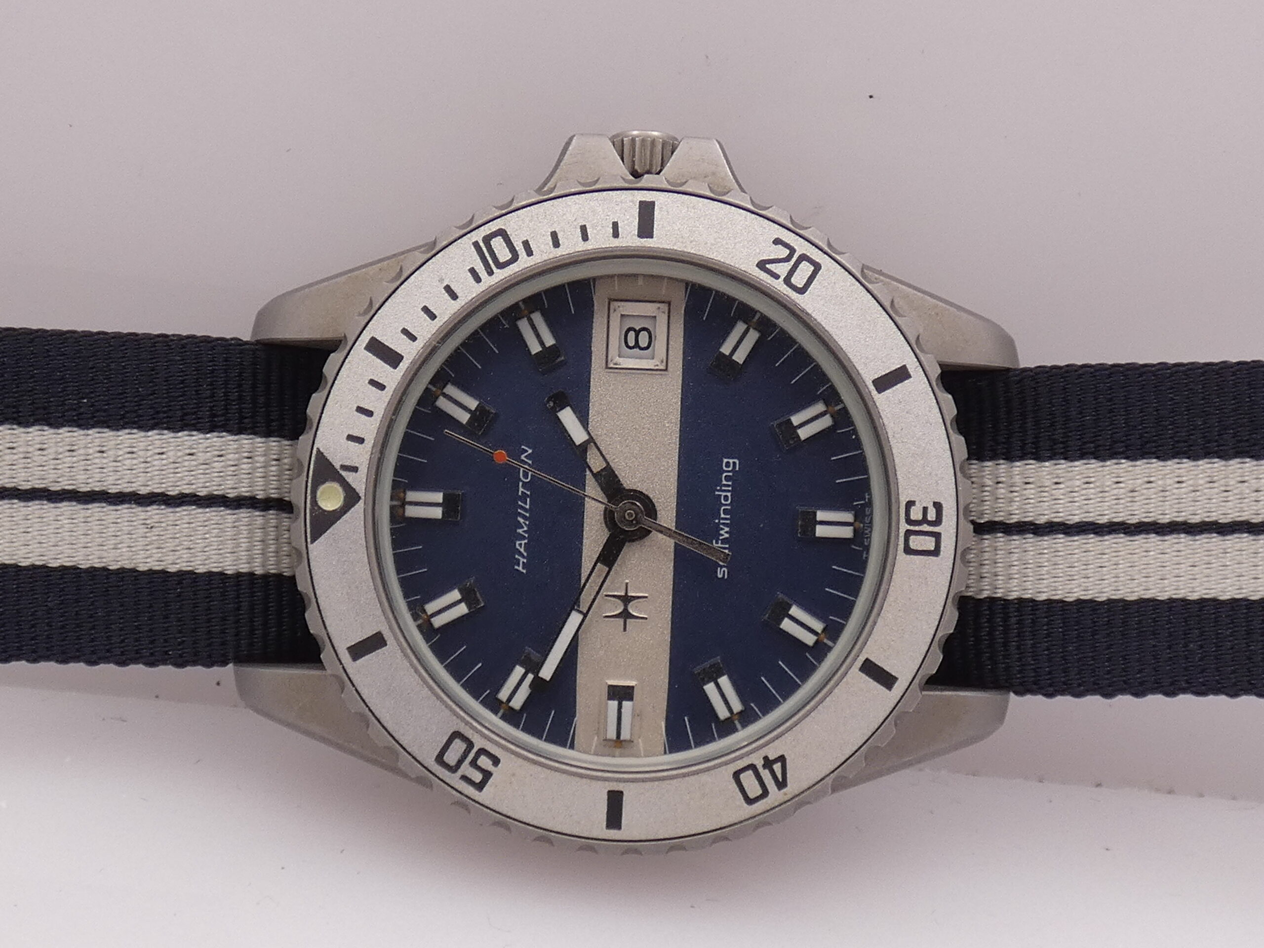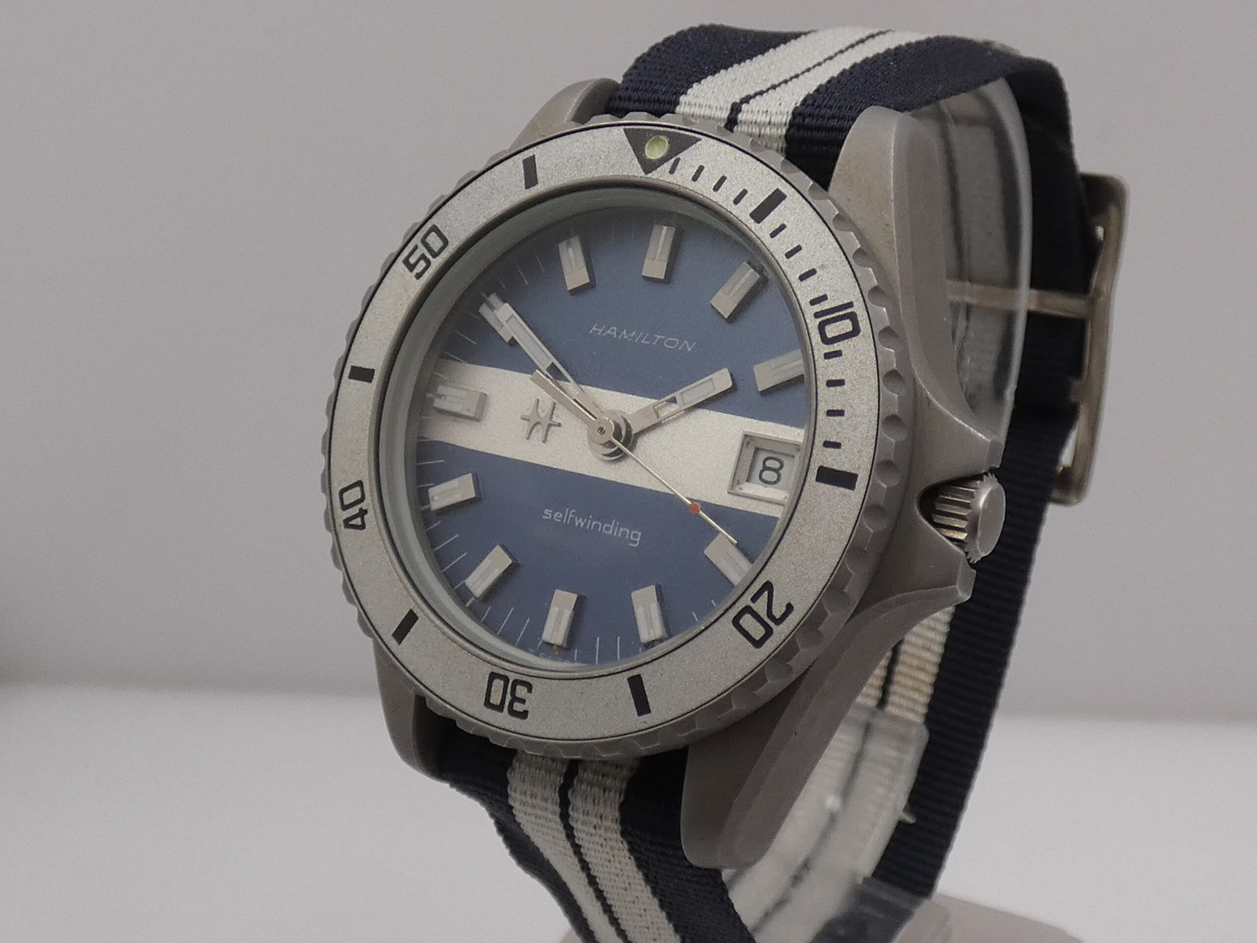 Dial: Blue with a silver-tone center band, matte finish, raised steel bar indexes, steel and tritium-treated baton hands, date display at 3 o’clock, 60-minute scale, Hamilton logo at 9 and 12 o’clock