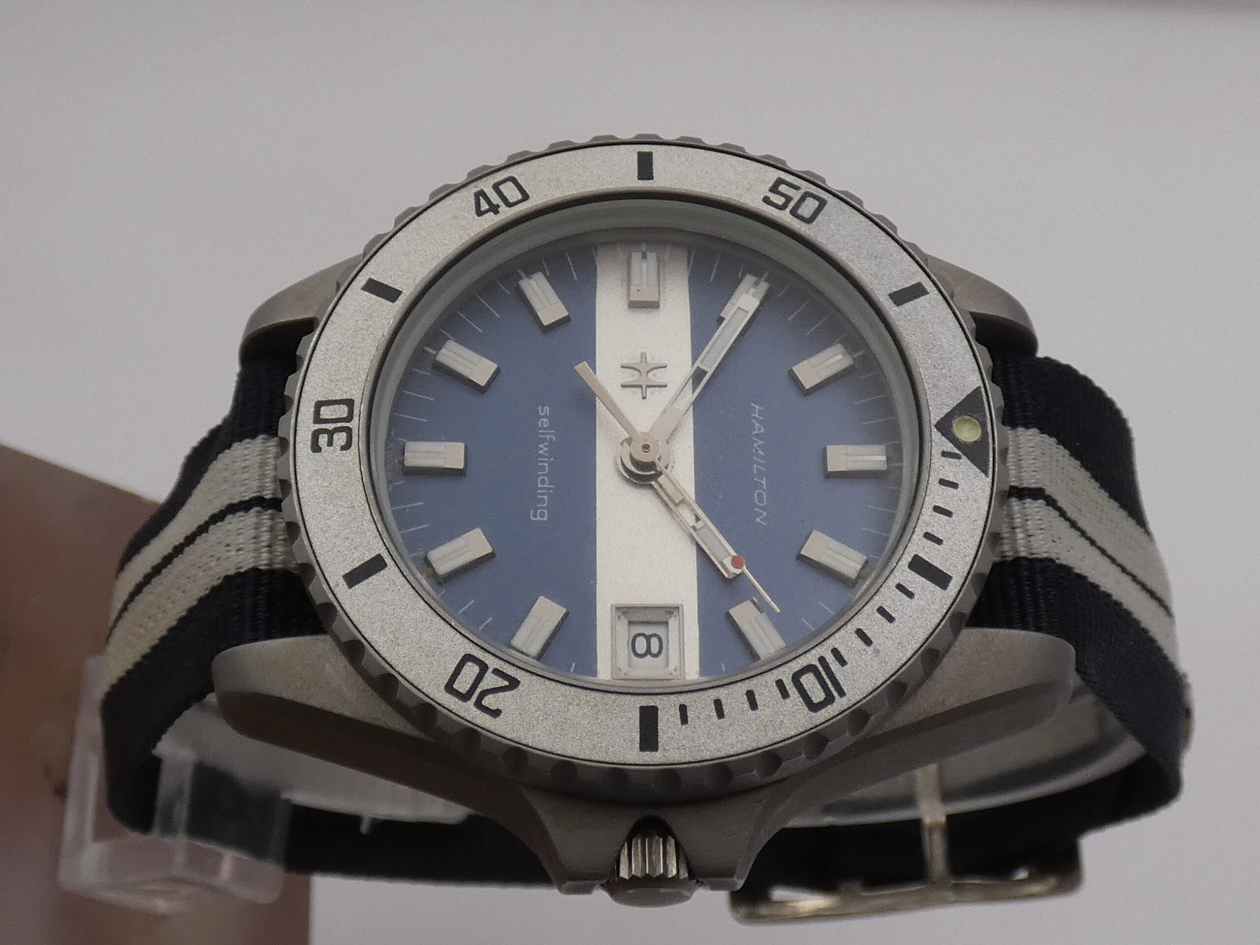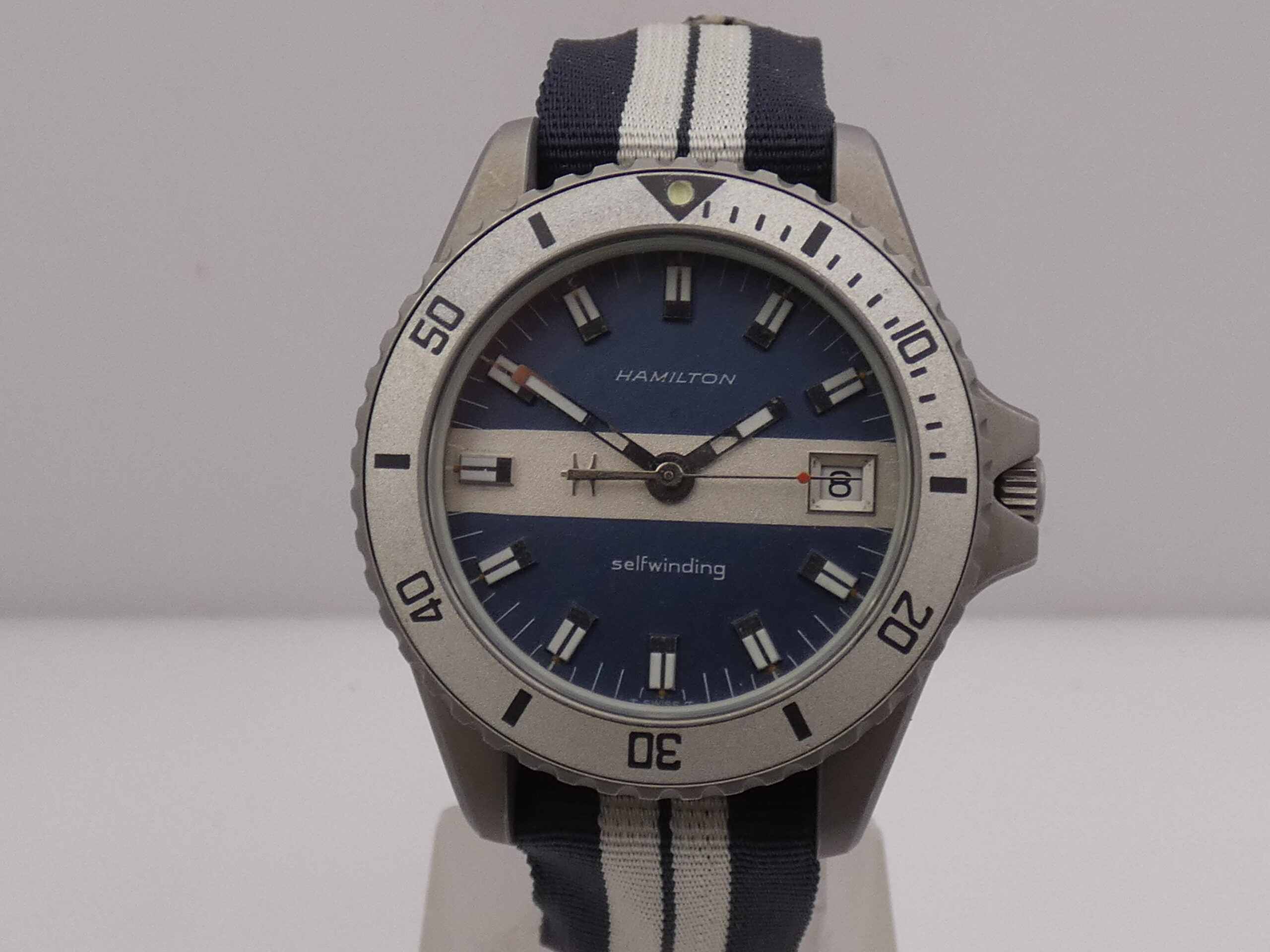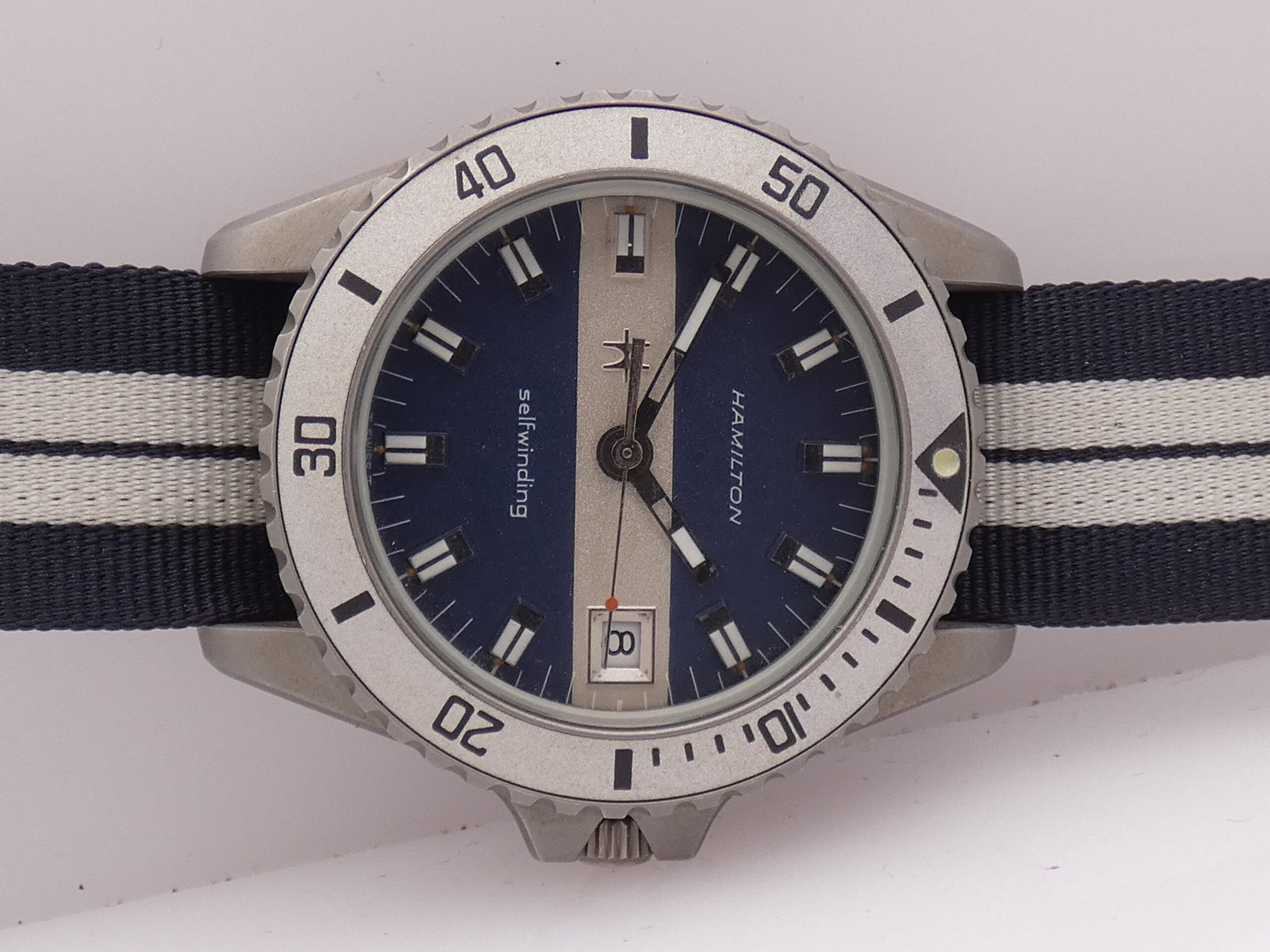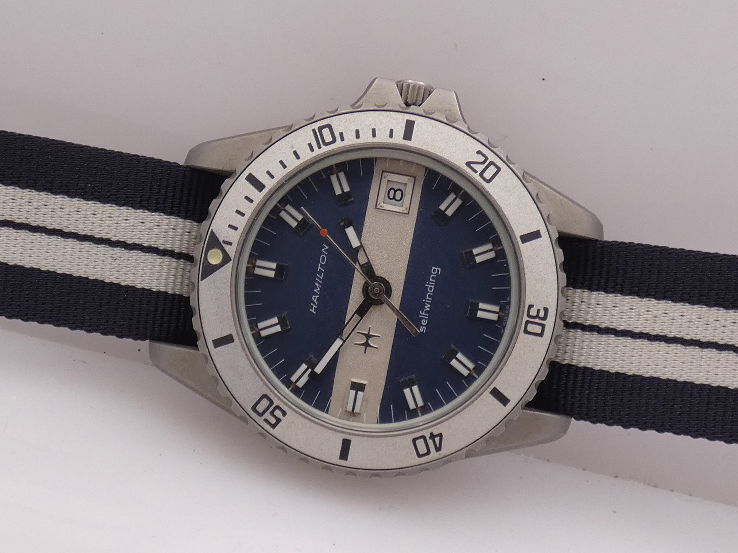 Dial: Blue with a silver-tone center band, matte finish, raised steel bar indexes, steel and tritium-treated baton hands, date display at 3 o’clock, 60-minute scale, Hamilton logo at 9 and 12 o’clock