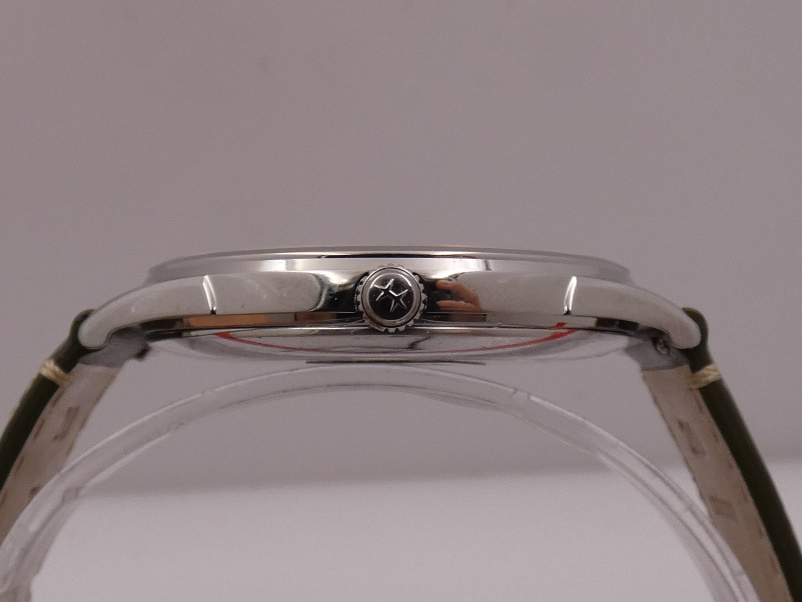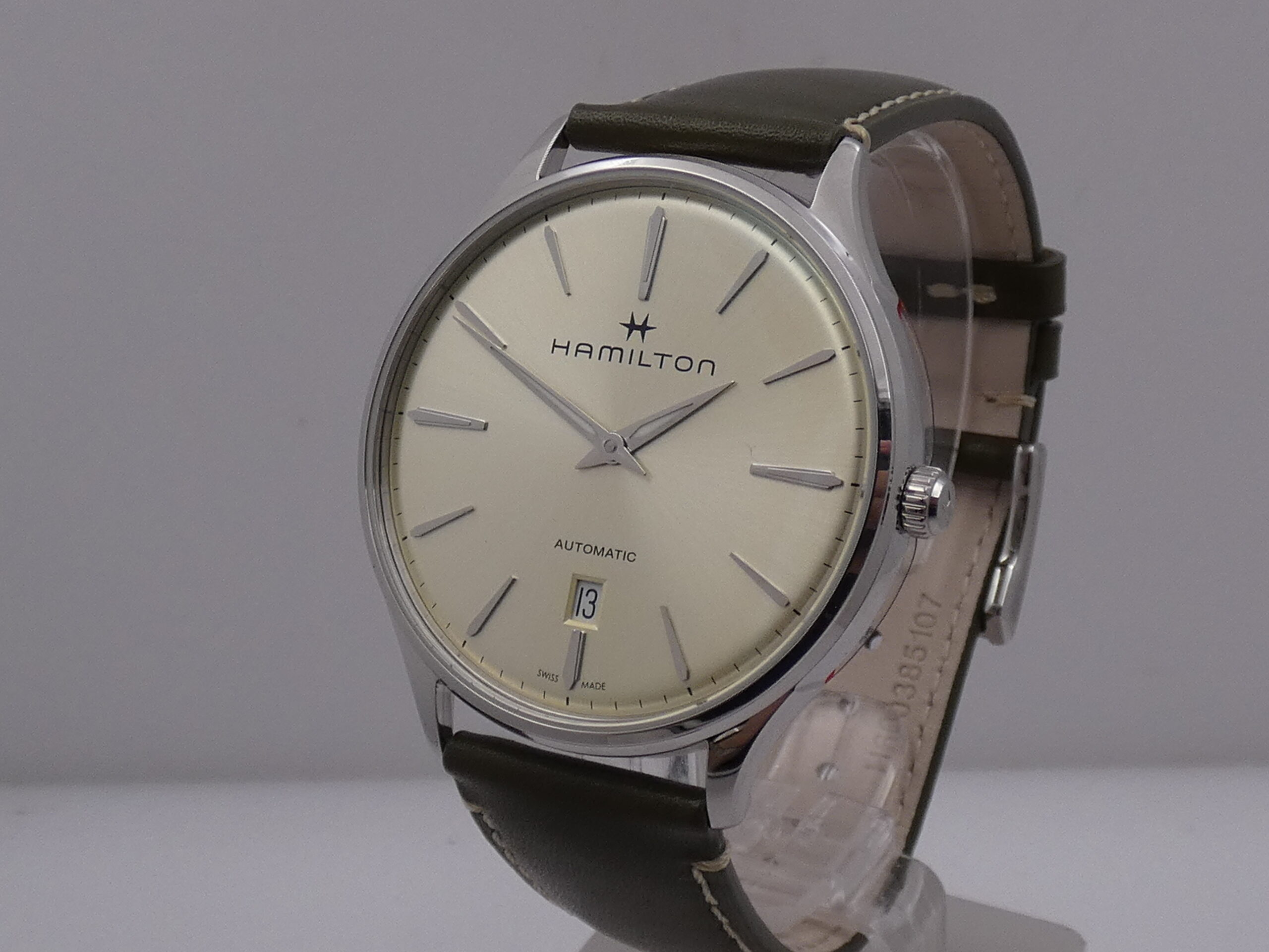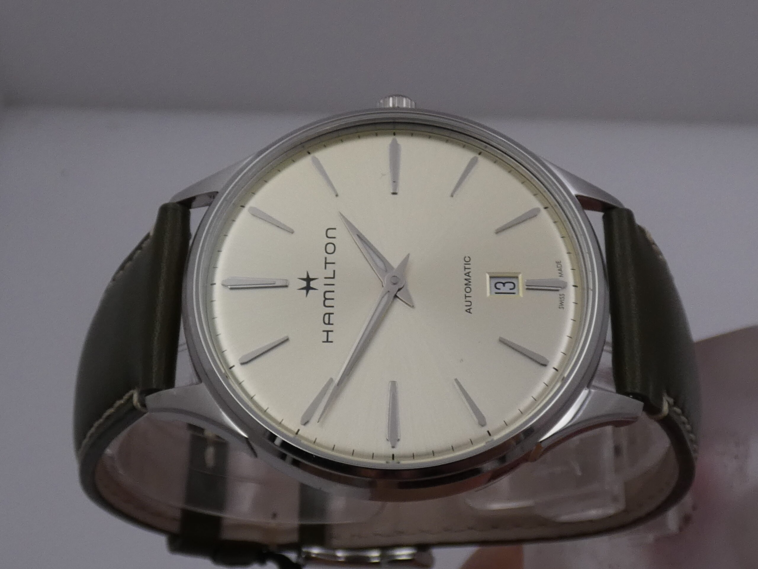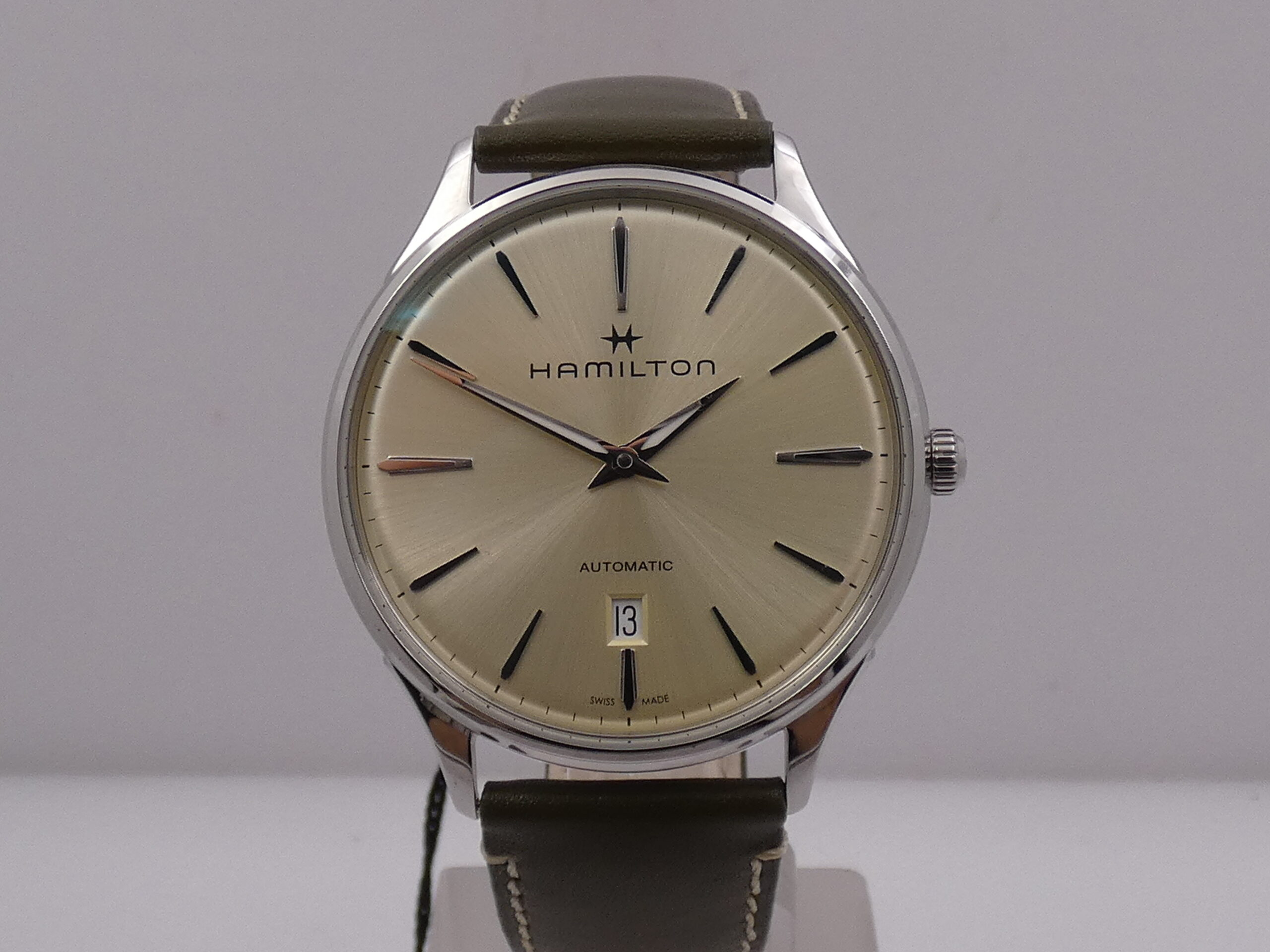 Quadrante: verde chiarissimo con effetto soleil, indici a barrette in acciaio ed in rilievo, lancette Dauphine anch’esse in acciaio e trattate con materiale luminescente, datario al 3 con rimessa rapida in corona, scala sessantesimale, logo Hamilton al 12