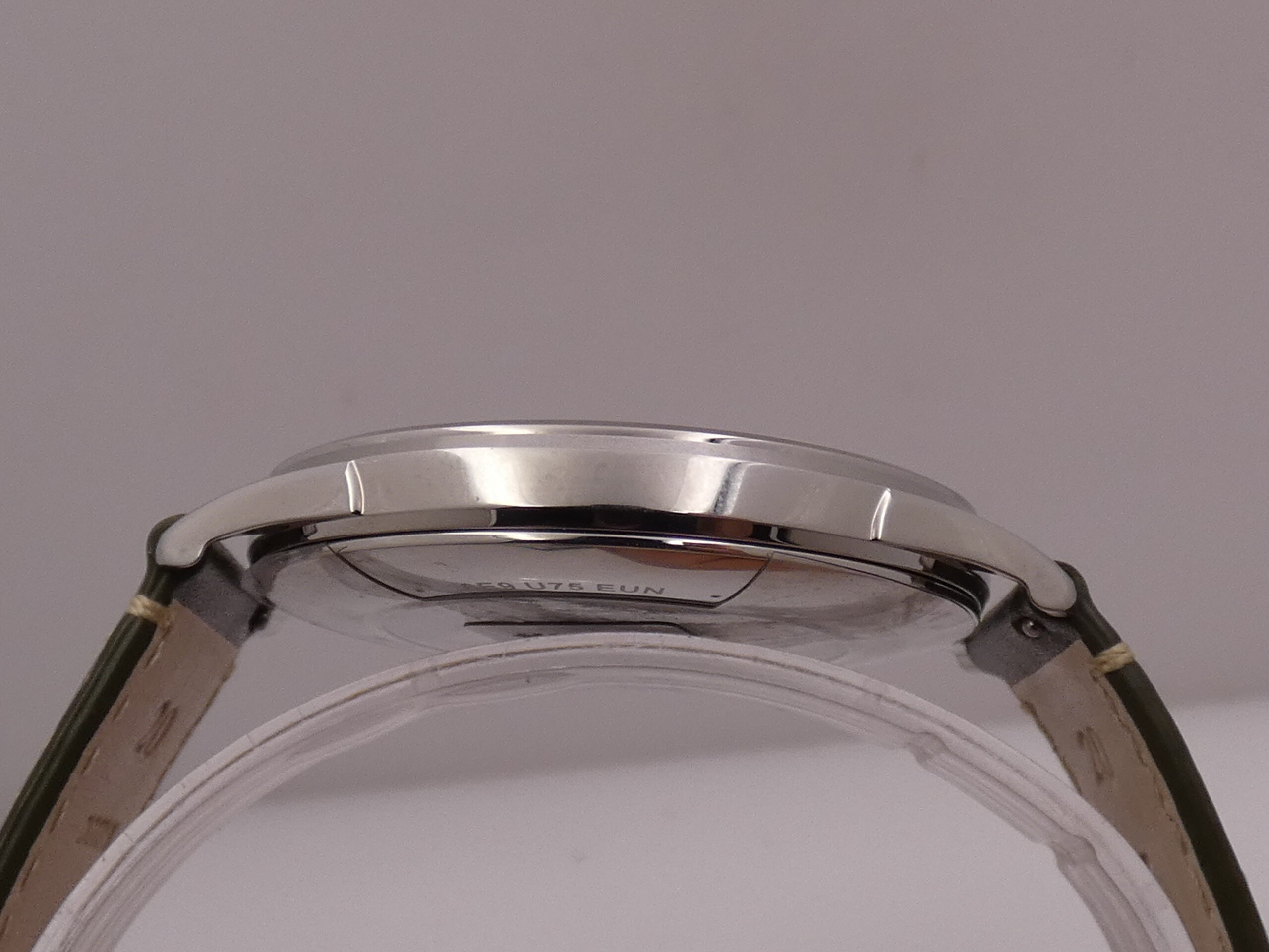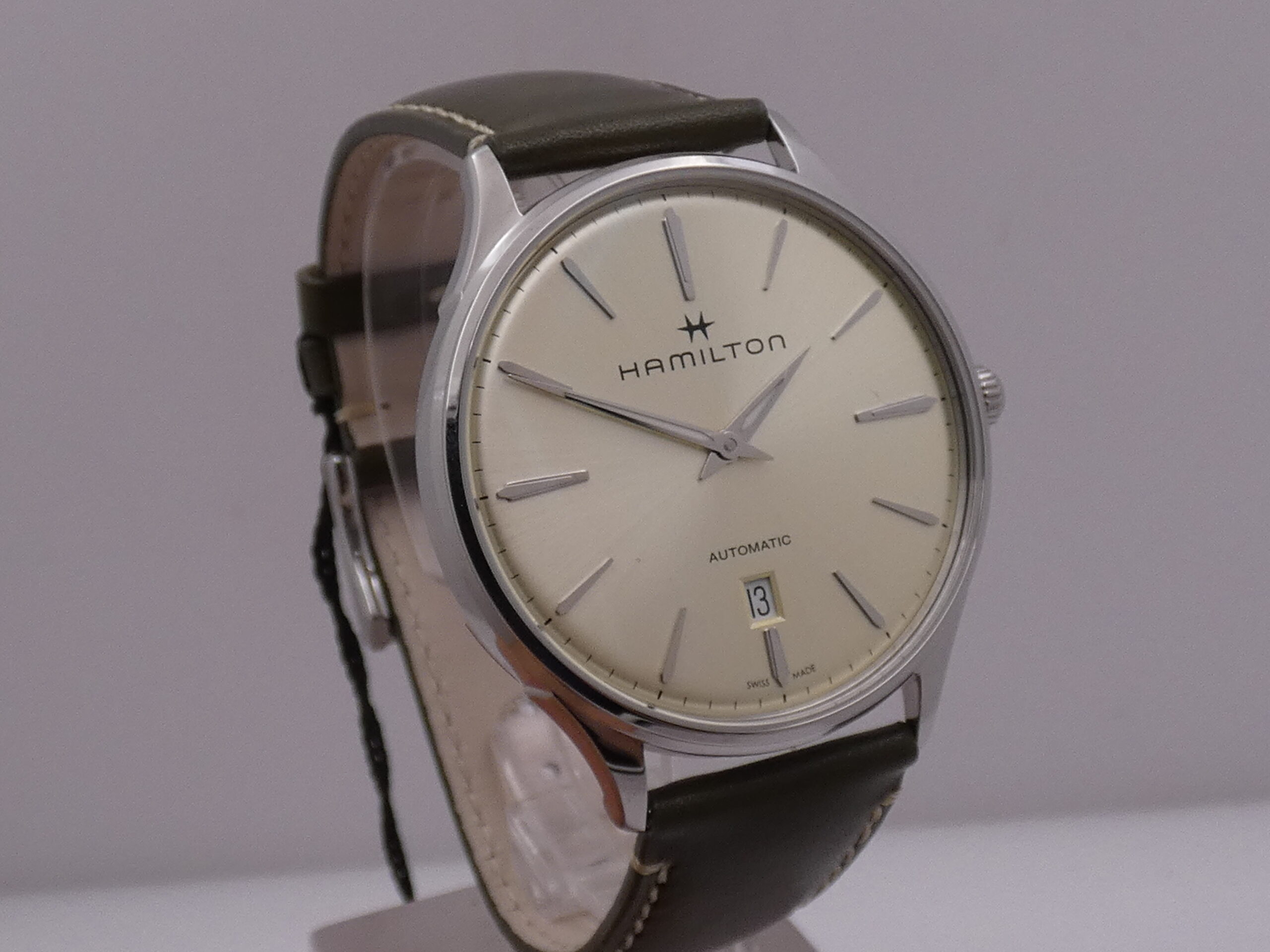 Brand: HAMILTON Model: Jazzmaster Thinline Auto Reference: H385250 – H38525811 Year: Contemporary watch Movement: Mechanical self-winding Functions: Hours, minutes, date Case: All-steel Bezel: Smooth Crown: Original knurled Lugs: Curved; 20mm lug width Dimensions: 40mm excluding crown, 45mm at the lugs Crystal: Sapphire, with anti-reflective coating Case back: Snap-on, with visible movement and original protective film Dial: light green with sunray effect, raised steel bar indexes, steel Dauphine hands with luminescent coating, date display at 3 o’clock with quick-set crown, 60-minute scale, Hamilton logo at 12 o’clock Strap: Green, with white stitching, original Hamilton leather Clasp: Steel, original HamiltonThe watch you see for sale is NEW, has never been worn, is in perfect working order, is accurate, and reliable. It is completely original. It will be delivered with its box, unfortunately slightly damaged, its guarantee, and its original Hamilton price tag!!! Its guarantee will be dated at the time of sale. It is pictured. Very special!!! WE EXAMINE YOUR USED EQUIPMENT. WE SHIPPED FREE WORLDWIDE. INTERNAL CODE: SZZ |
