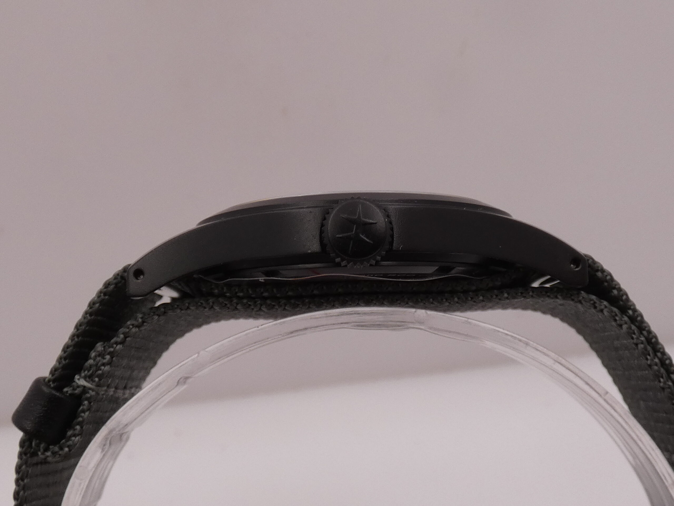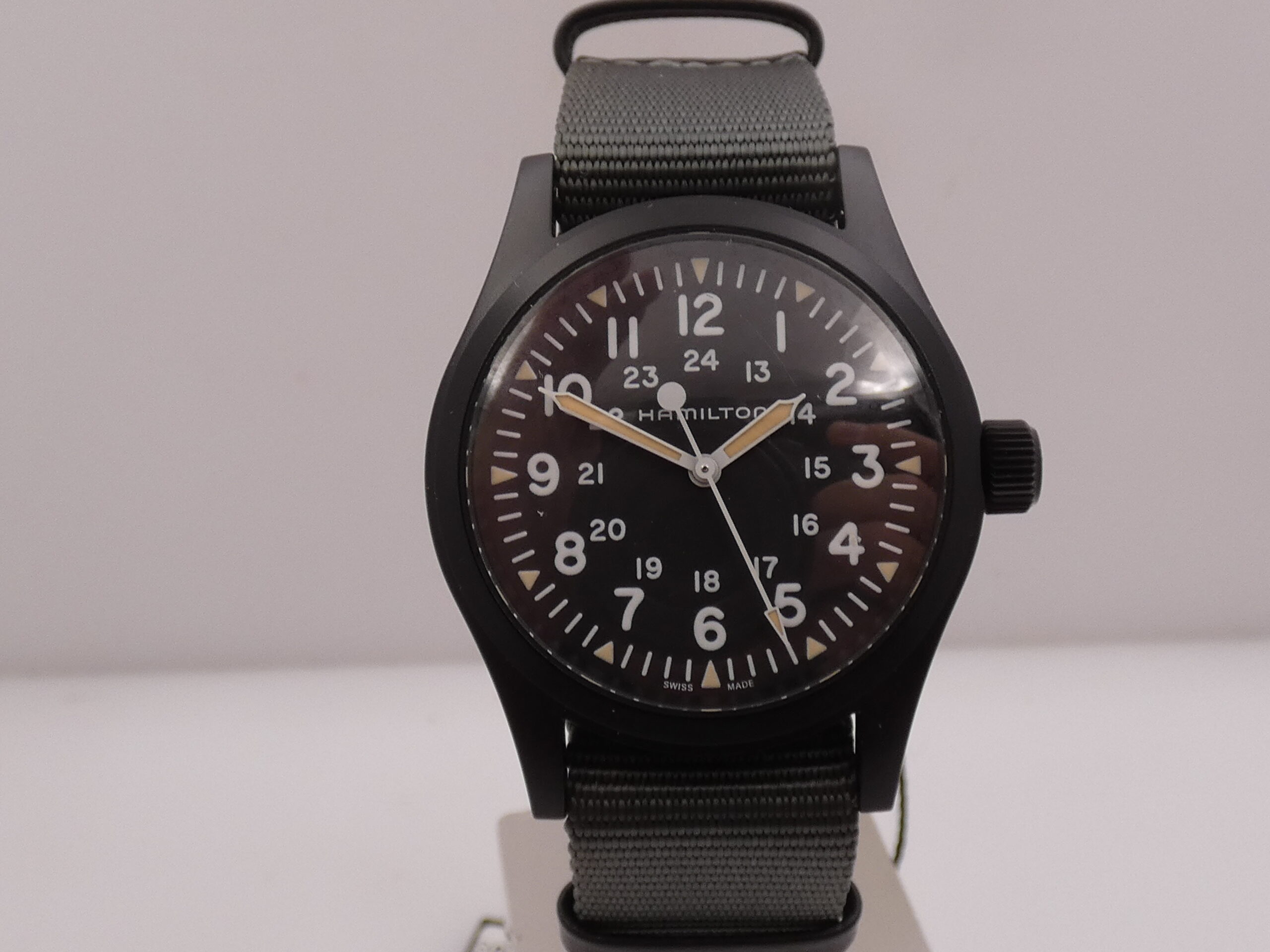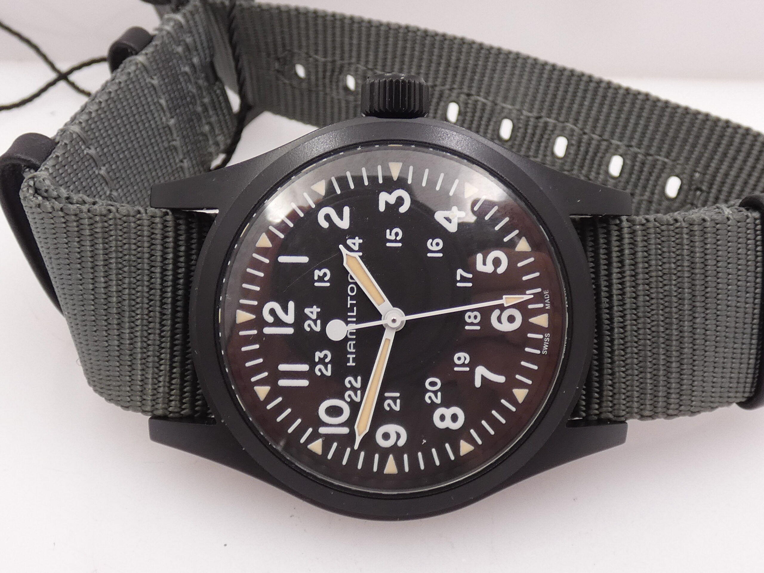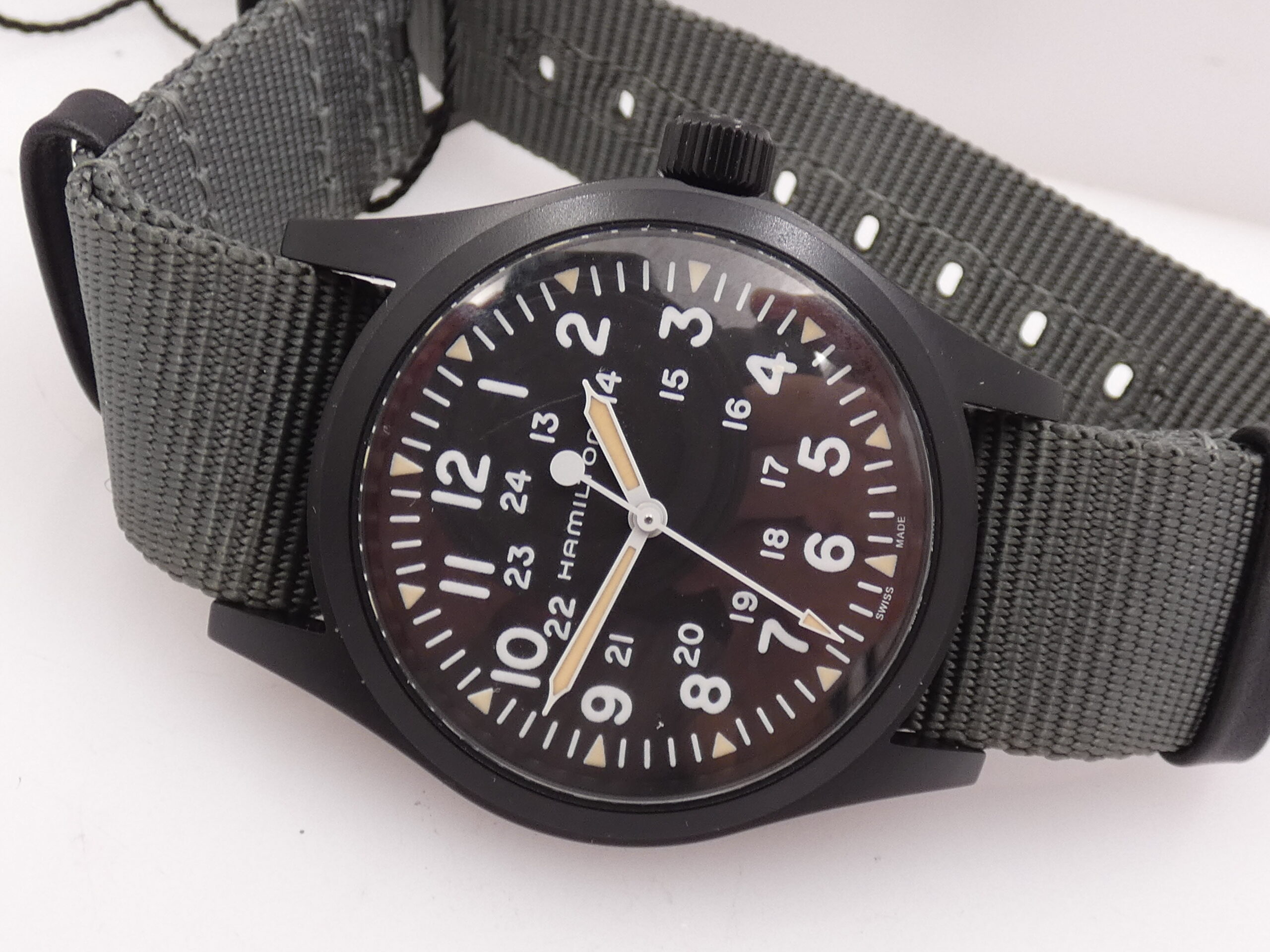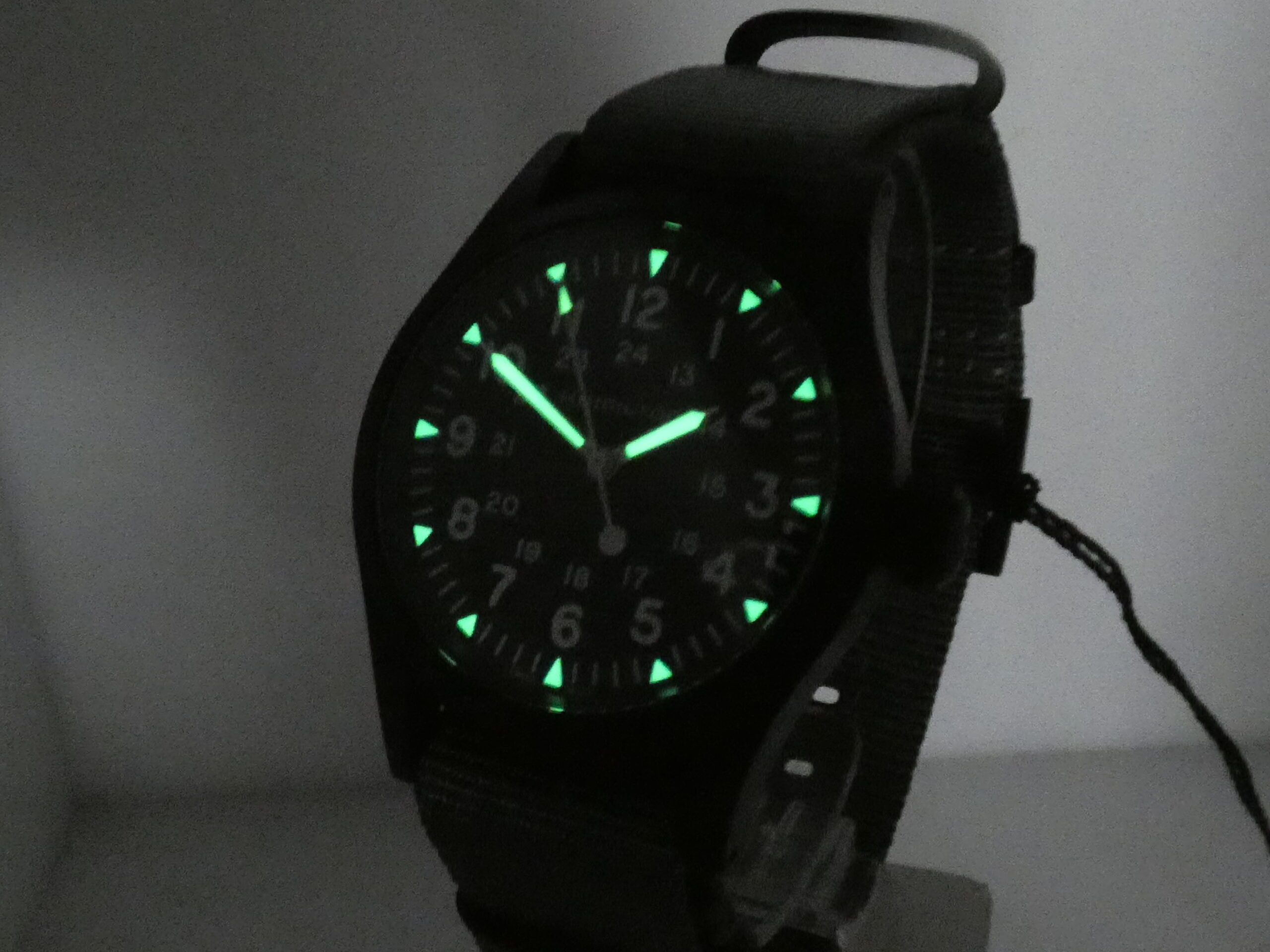 Quadrante: nero, con indici arabi trattati con materiale luminescente, lancette a siringa anch’esse luminescenti, secondi al centro, scala centrale per l’indicazione delle 24 ore, scala sessantesimale, logo Hamilton al 12