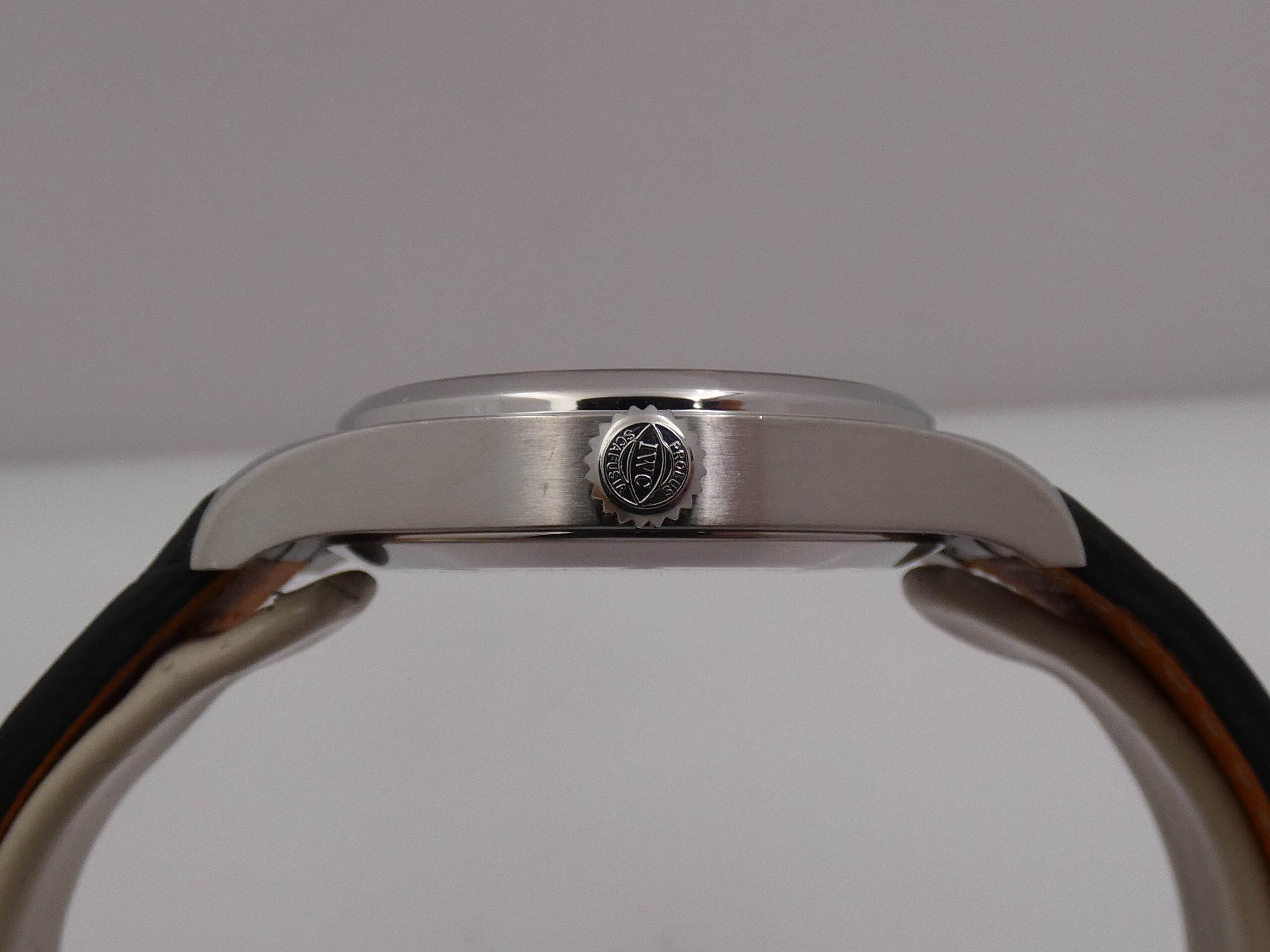 Quadrante: argentè soleil, con indici arabi in rilievo, lancette a foglia anch’esse in acciaio brunito trattate con materiale luminescente, secondi al centro, datario al 3 con rimessa rapida in corona, scala sessantesimale, logo IWC al 12