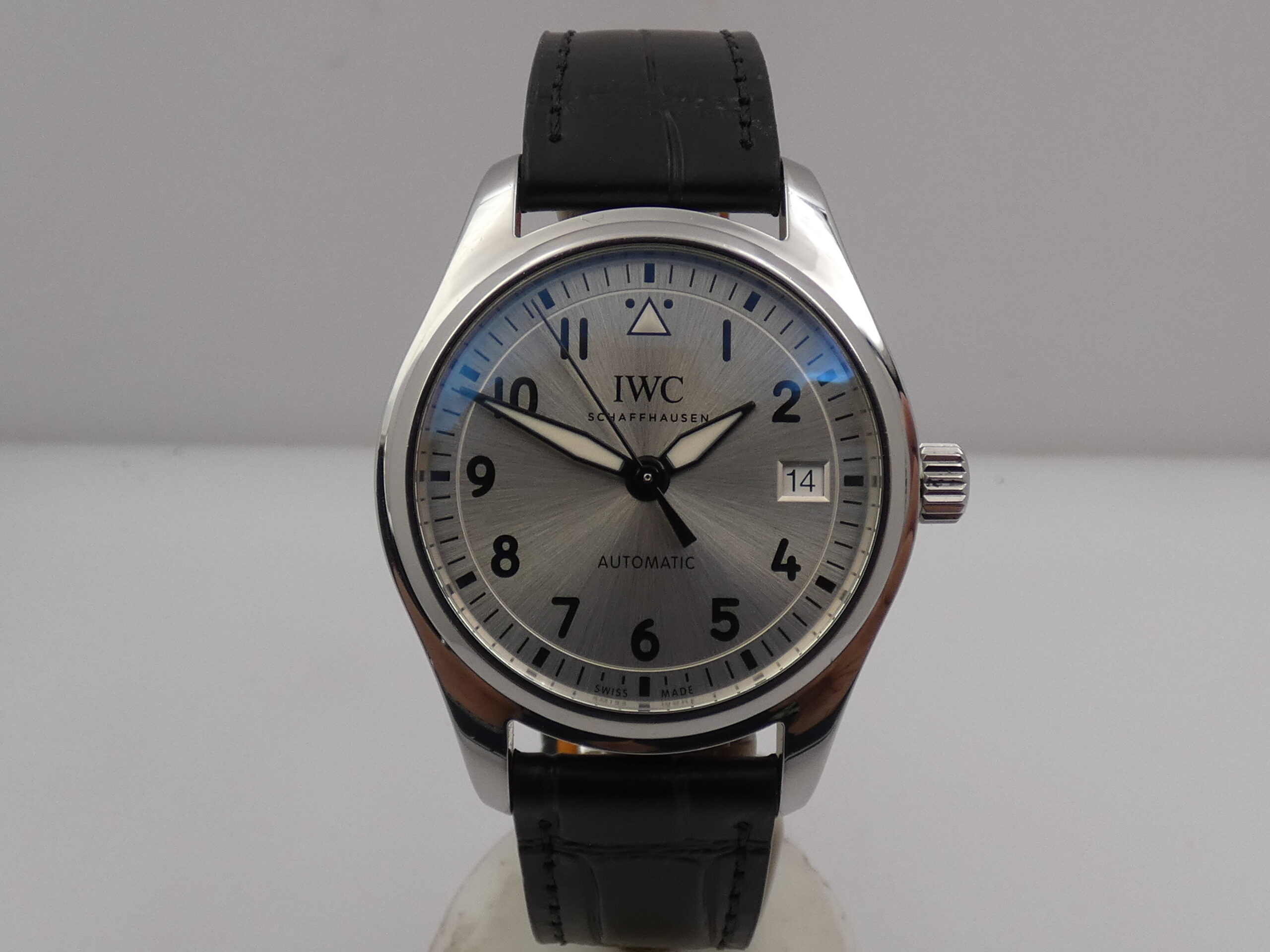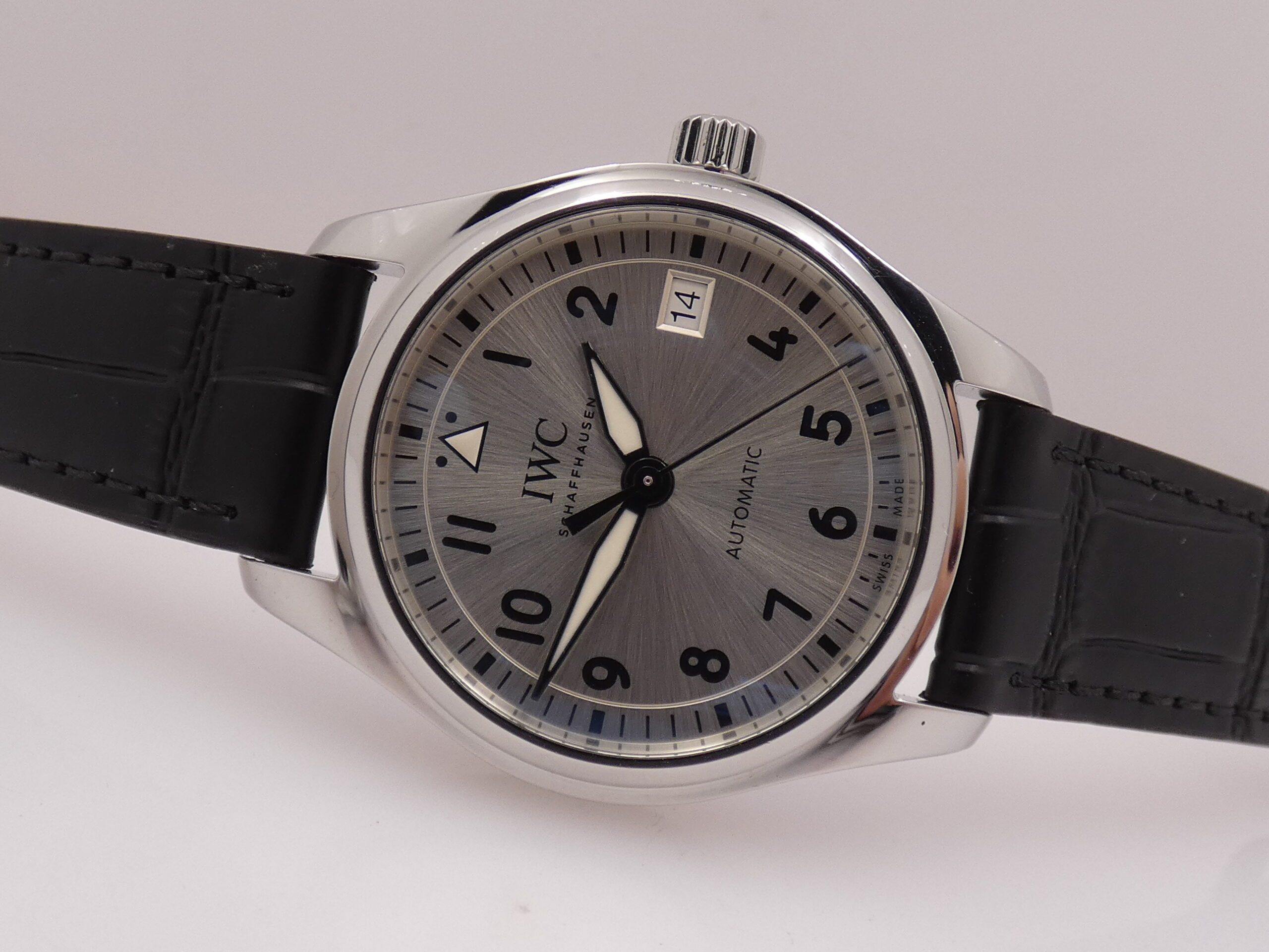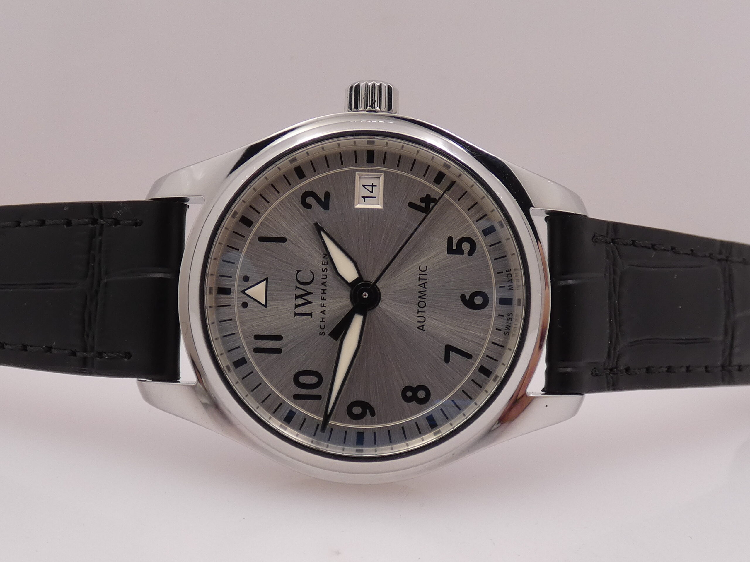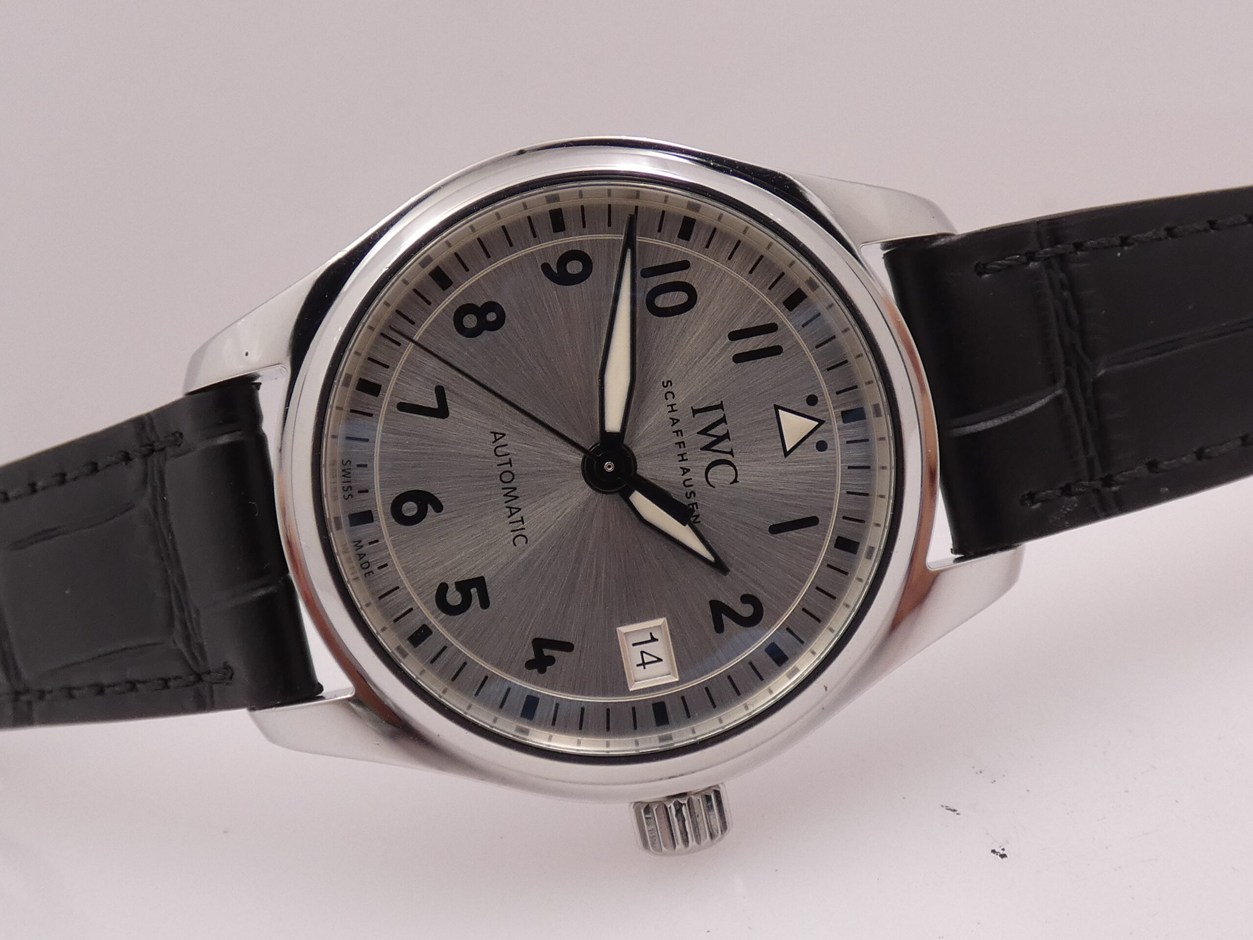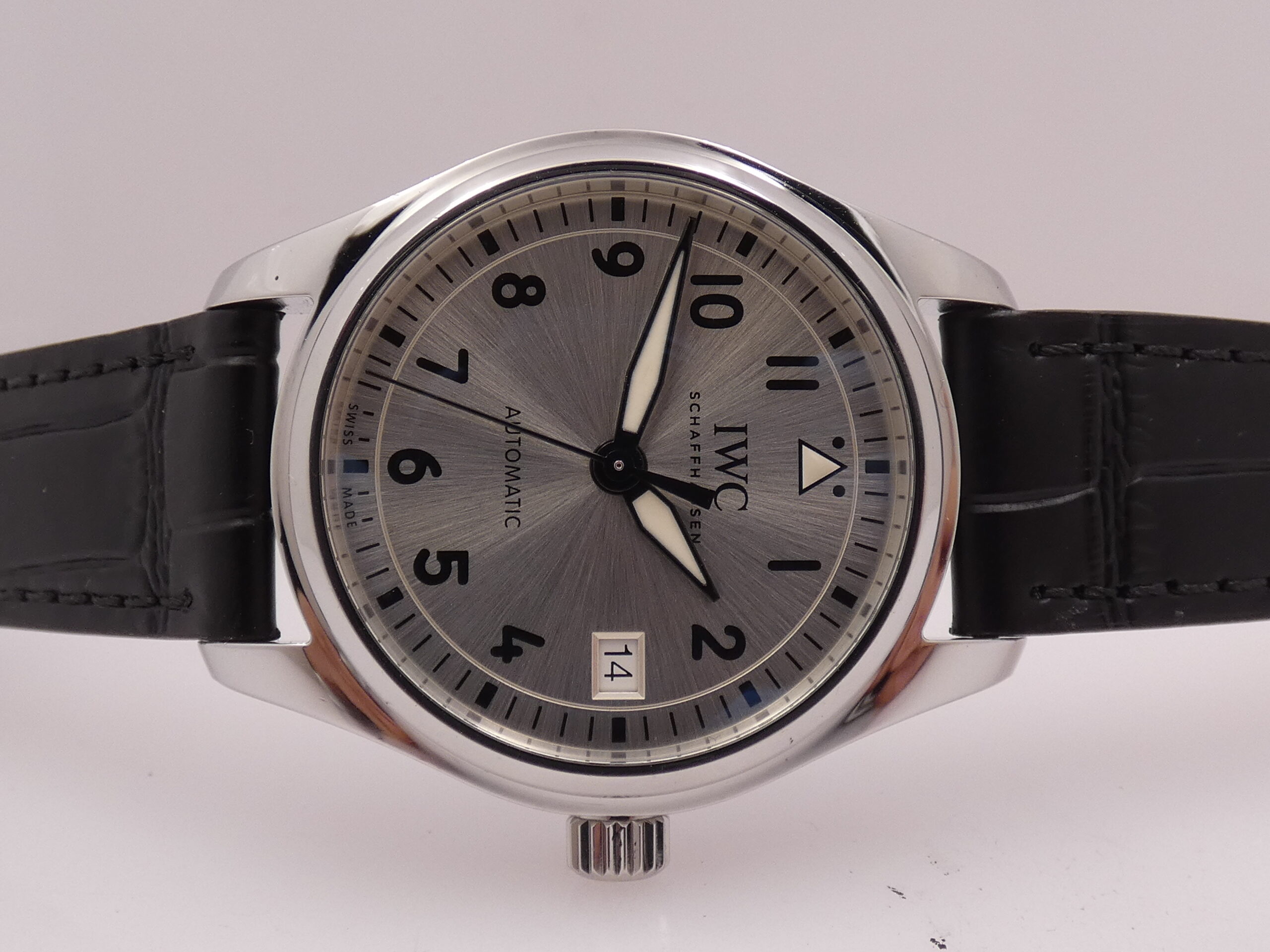 Dial: Silver sunburst, with raised Arabic numerals, burnished steel leaf-shaped hands with luminescent coating, center seconds, date display at 3 o’clock with quick-set crown, 60-minute scale, IWC logo at 12 o’clock