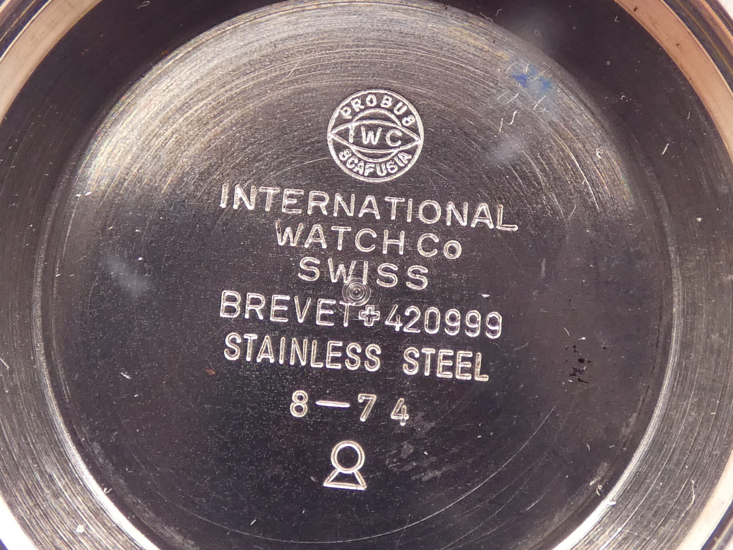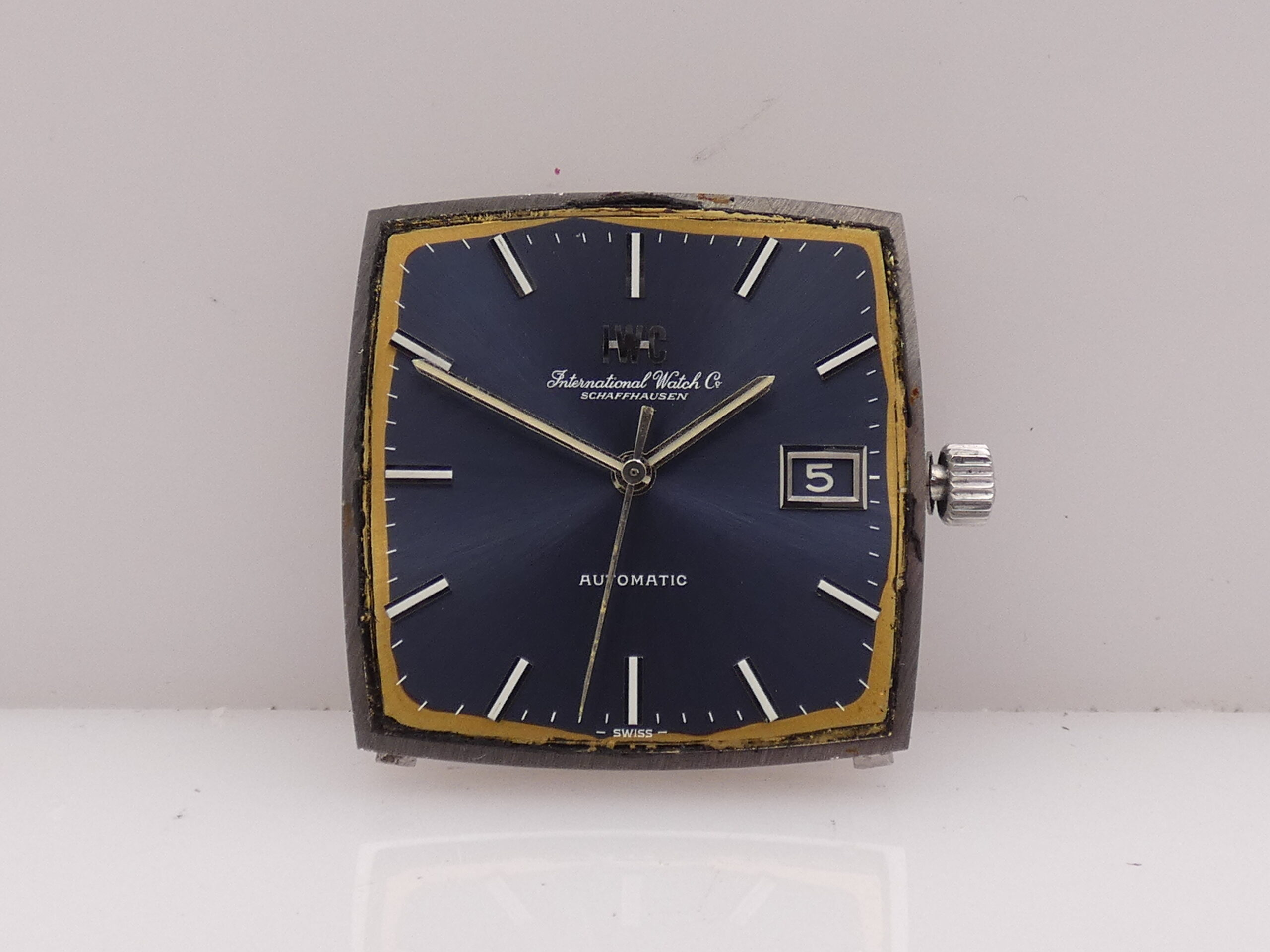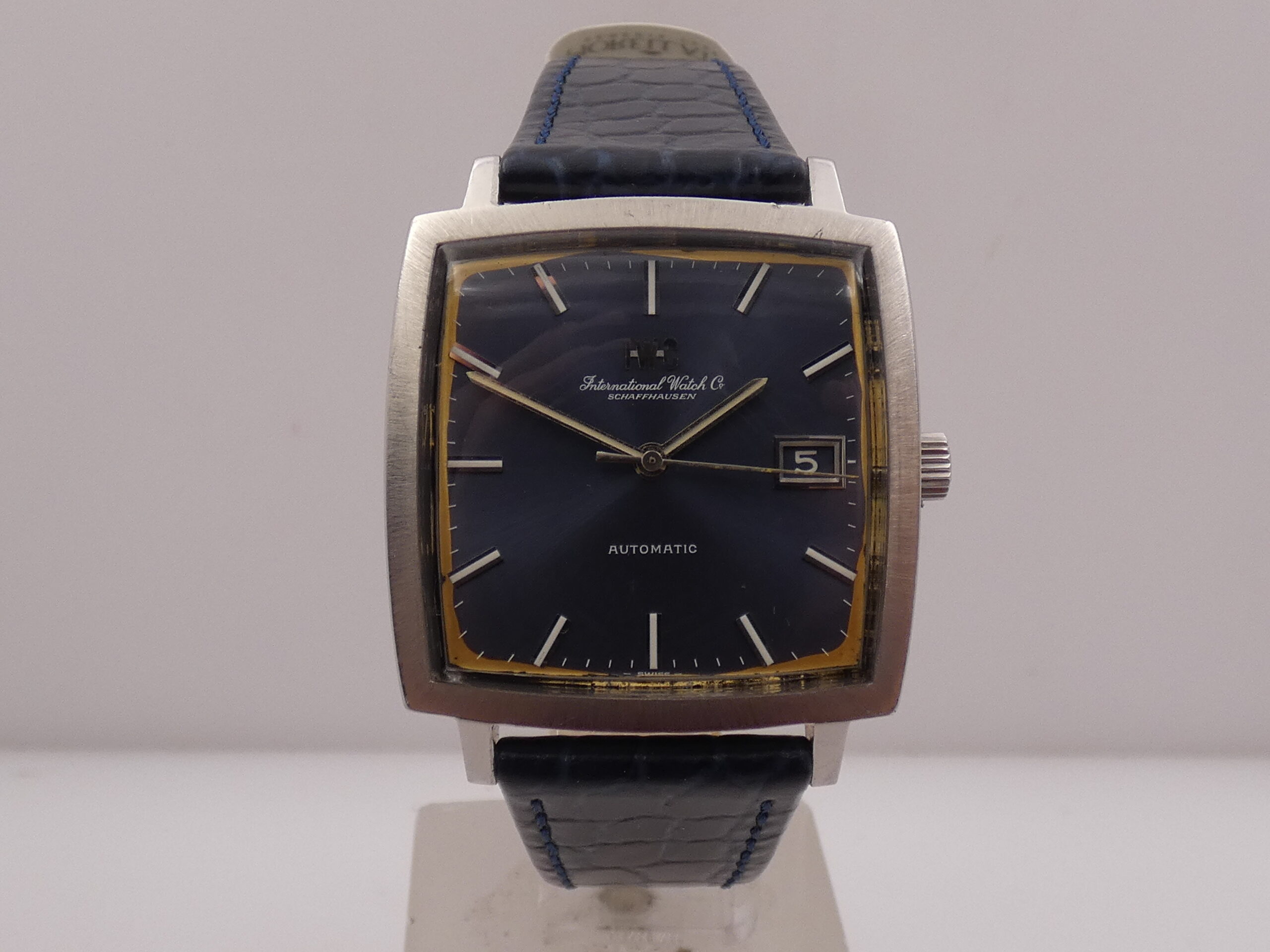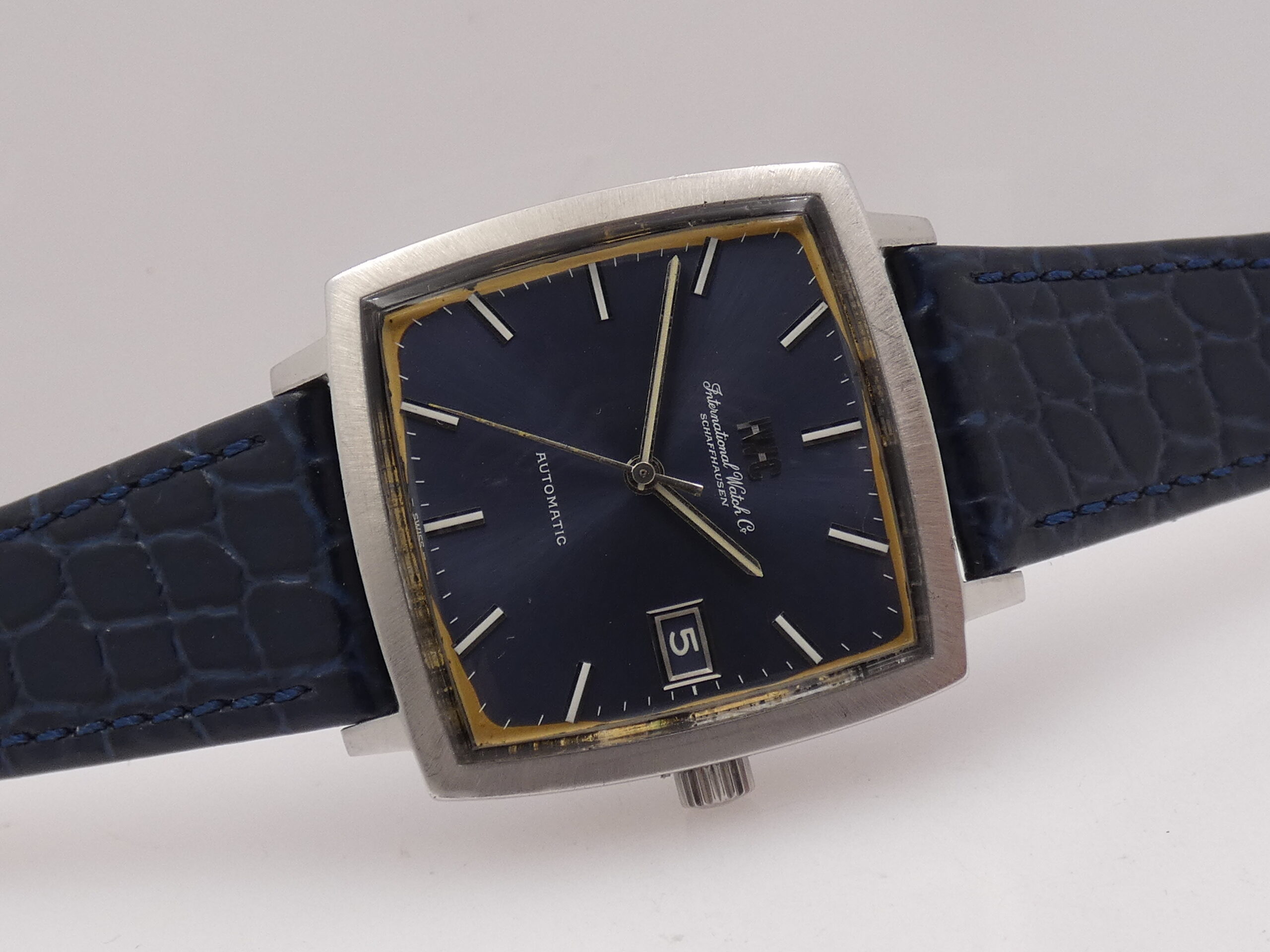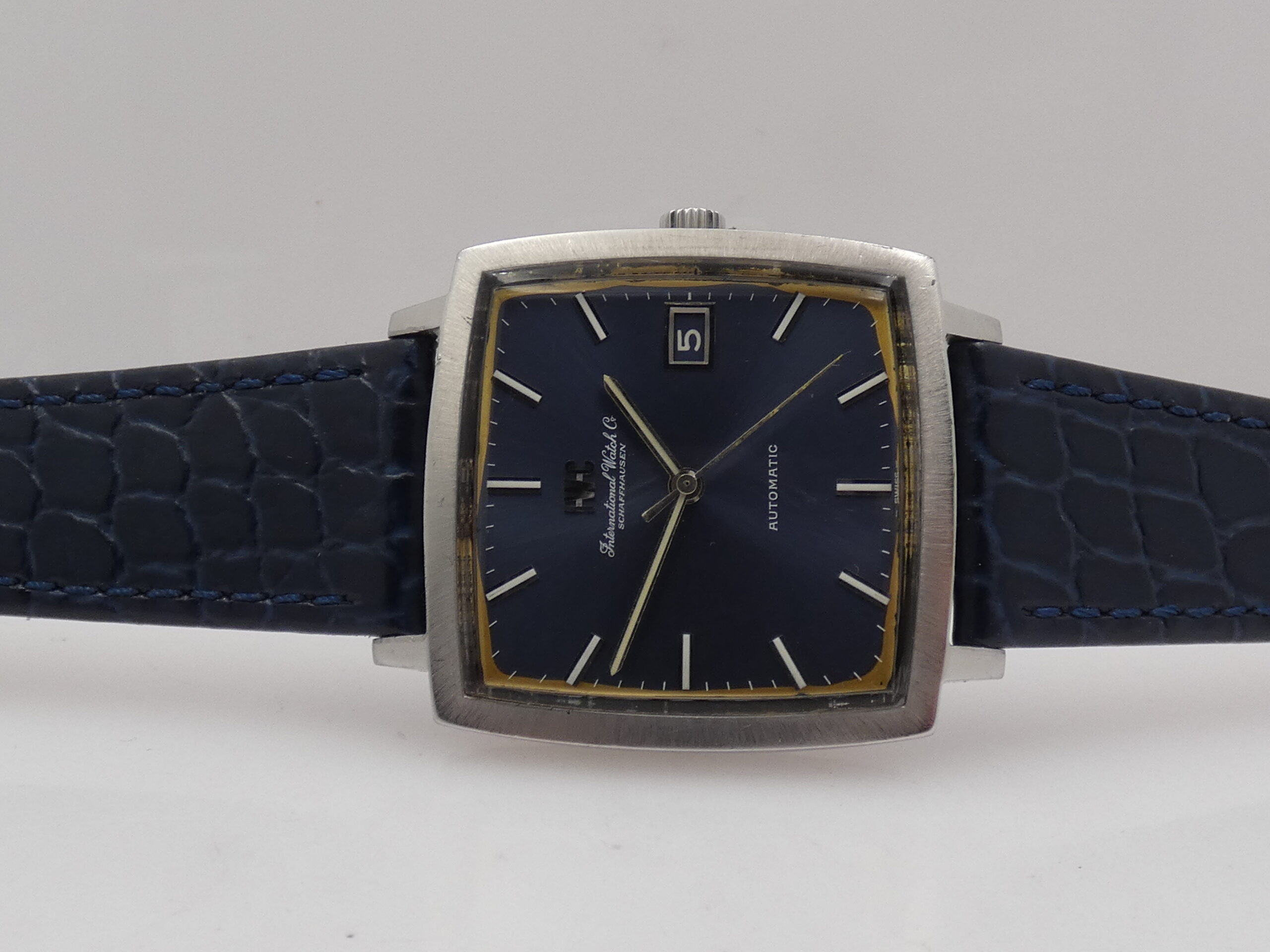 Dial: Blue sunburst, with steel and raised bar indexes, steel stylus hands, center seconds, date display at 3 o’clock, sexatesimal scale, IWC logo at 12 o’clock