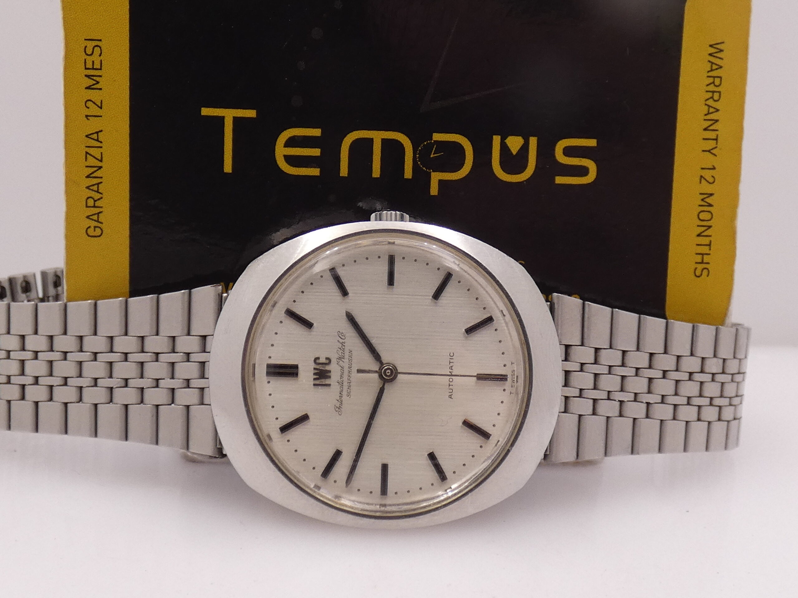 Quadrante: argentè soleil, con indici a barretta in acciaio ed in rilievo, lancette a stilo anch’esse in acciaio, secondi al centro, datario al 3, scala sessatesimale, logo IWC al 12