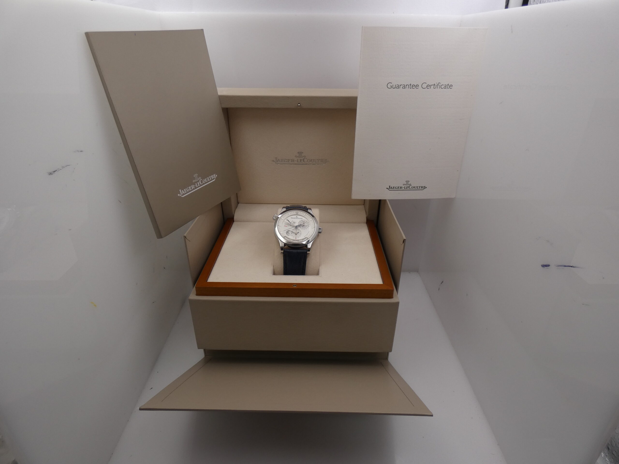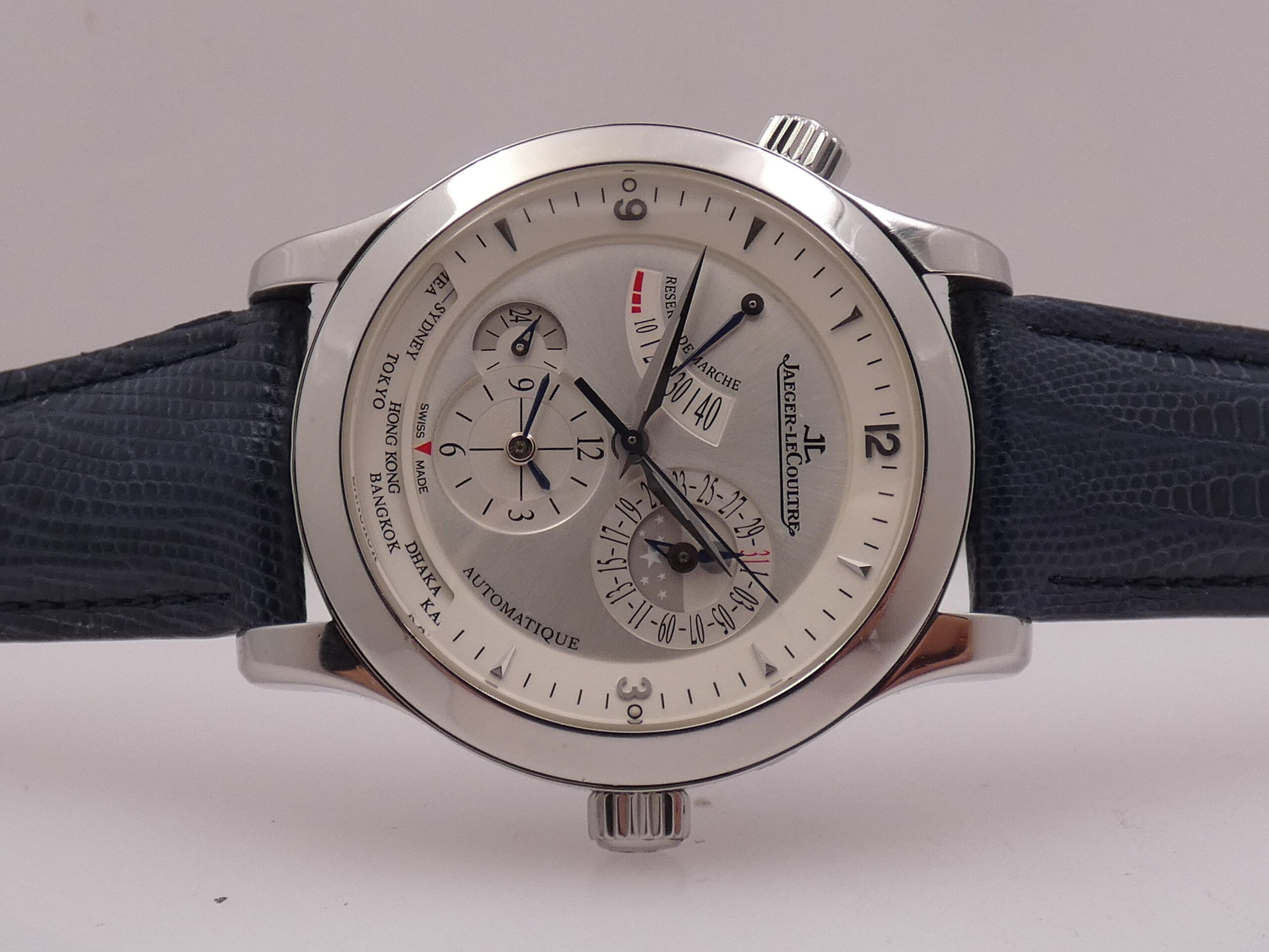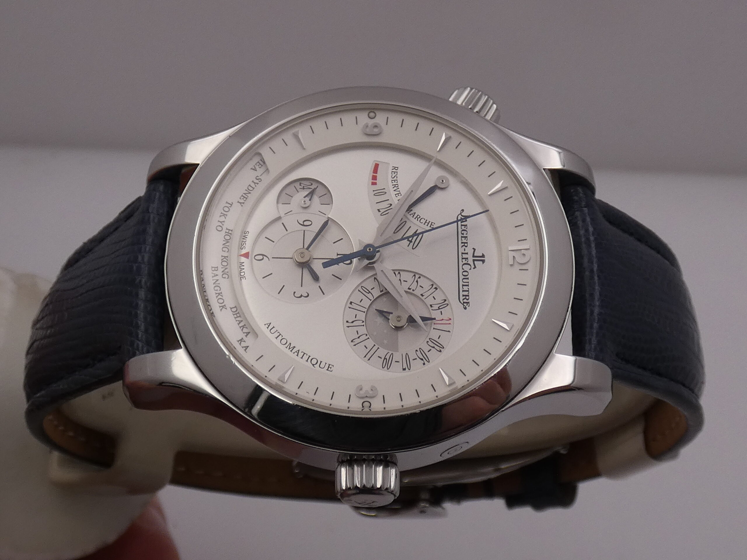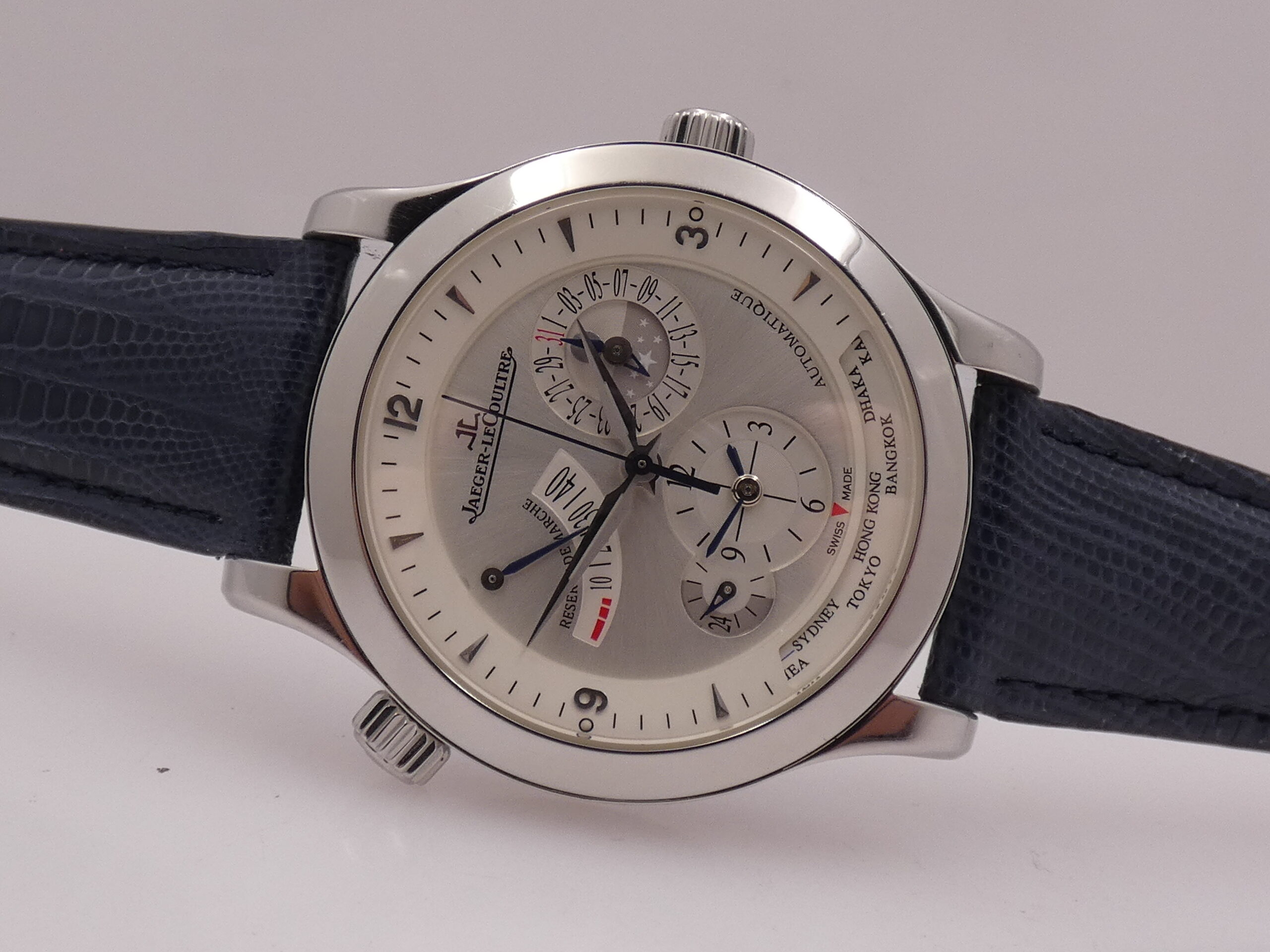 Quadrante: argentè soleil, con indici sul rehaut triangolari, arabi a quarti, in acciaio, in rilievo e con punti luminescenti in corrispondenza del 3 e del 9, lancette dauphine anch’esse in acciaio, datario al 2 con indicazione giorno/notte al centro e rimessa tramite pulsantino al 2, indicatore della riserva di carica al 10, indicazione del GMT e finestrella con le città del mondo al 6, indicazione delle 24 ore al 7, scala sesantesimale, logo Jaeger-LeCoultre al 12