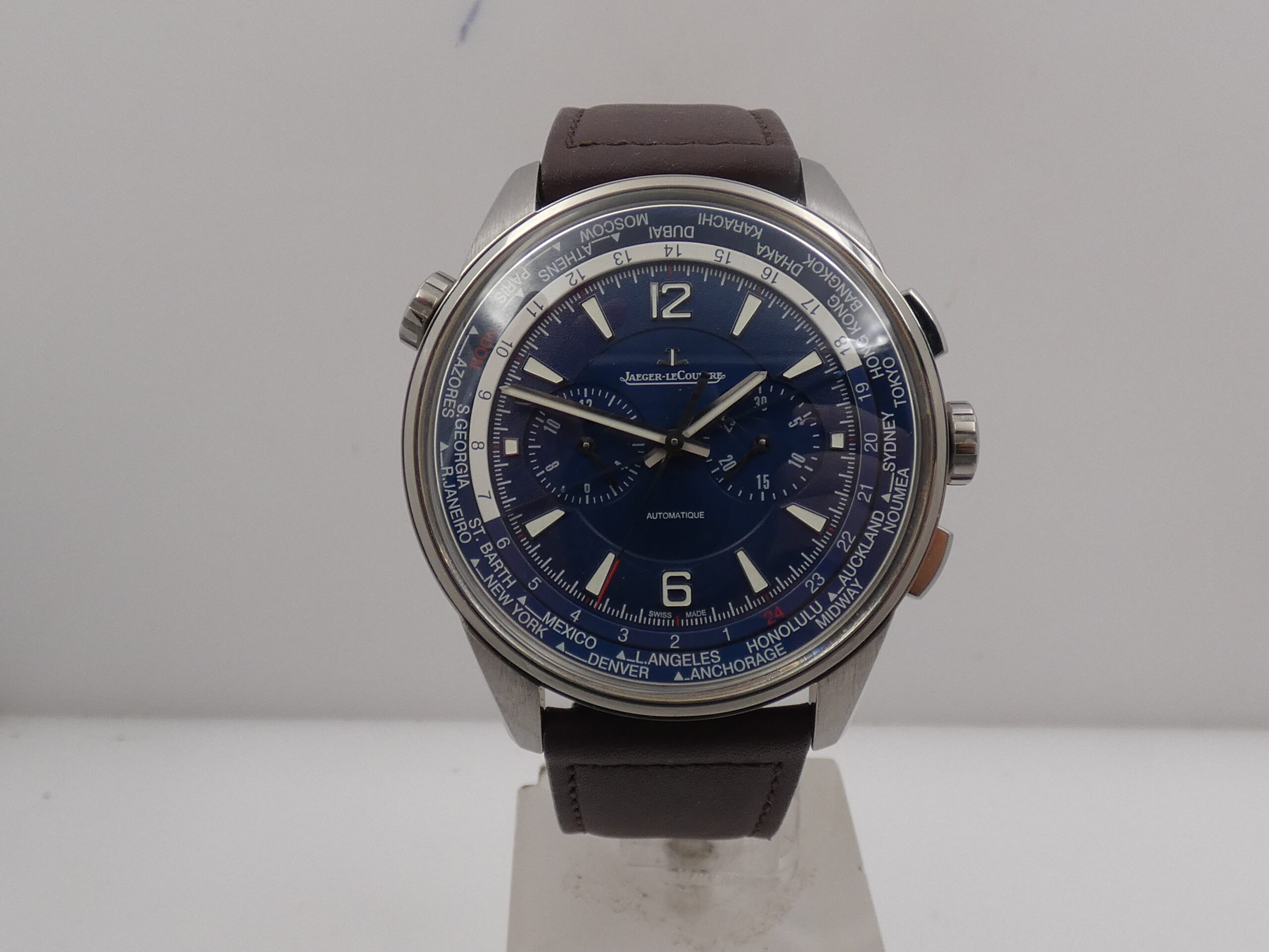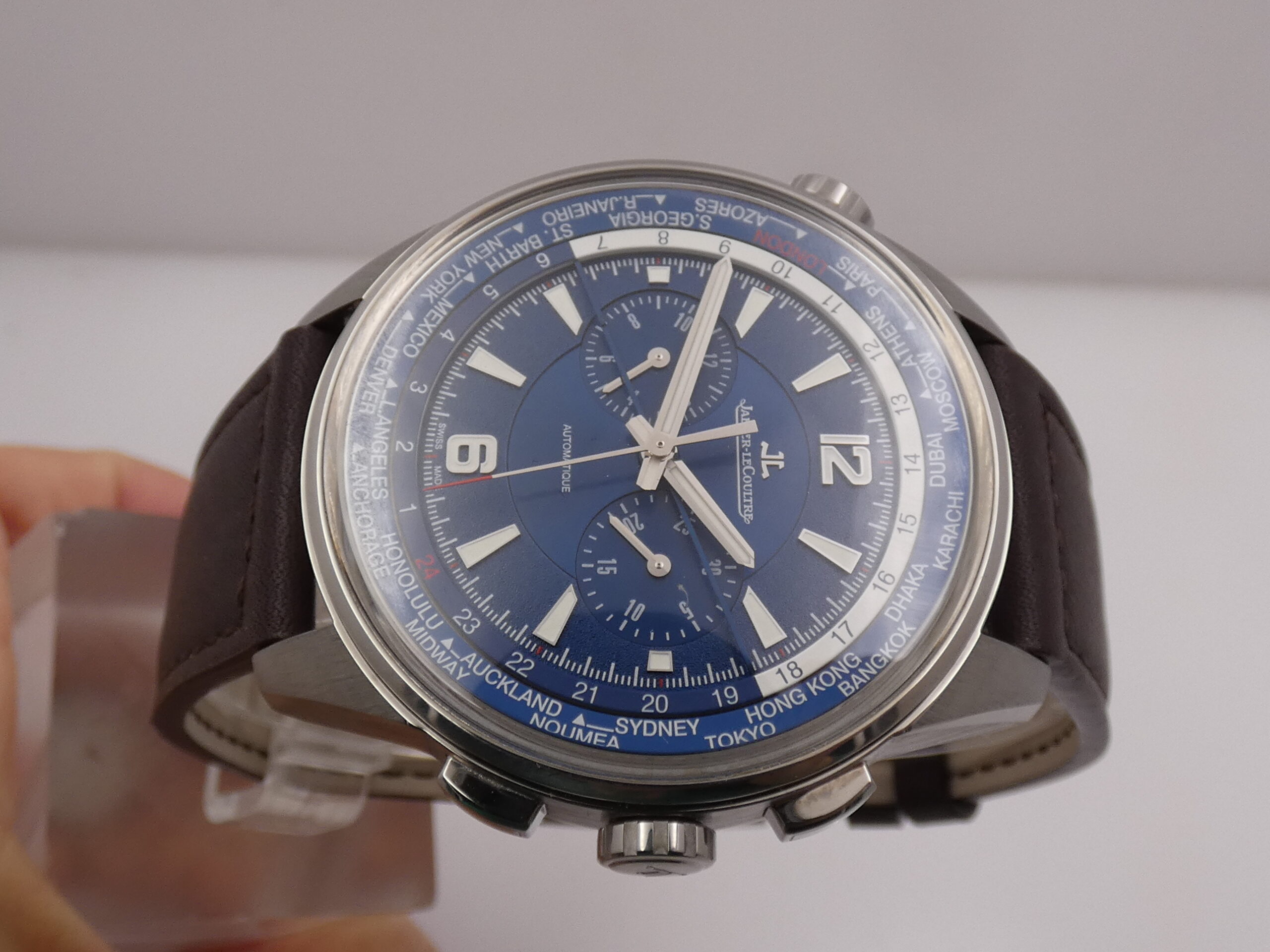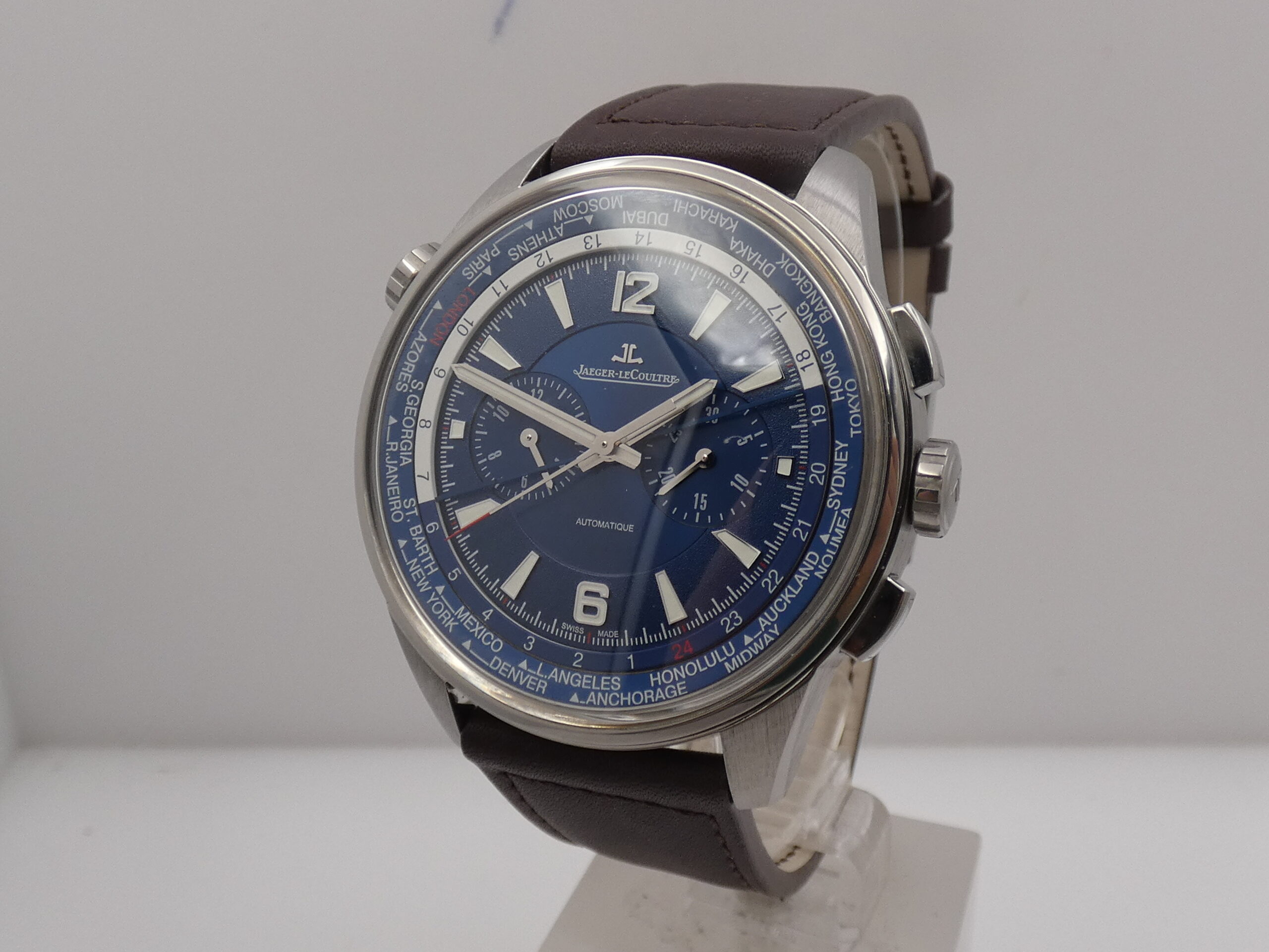 Quadrante: blue, con indici geometrici, arabi a mezza, in accaio, in rilievo e trattati con meteriale luminescente, lancette a stilo, anch’esse in acciaio e luminescenti, minuti del crono al 3, ore del crono al 9, secondi cronografici al centro, scala sessantesimale con suddivisione ad 1/5 di secondo, scala delle 24 ore, rehaut girevole riportante le principarli città del Mondo, logo JLC al 12