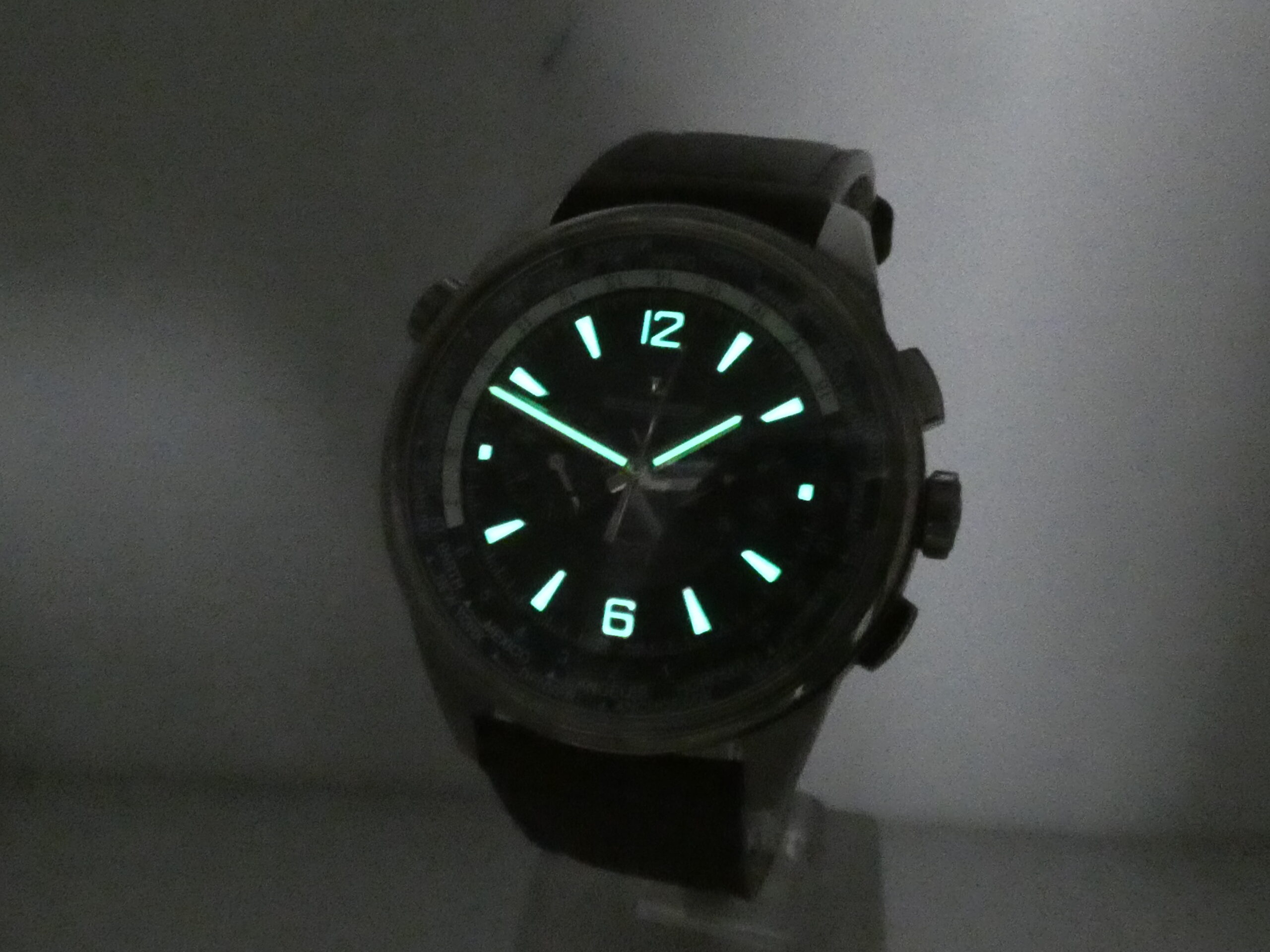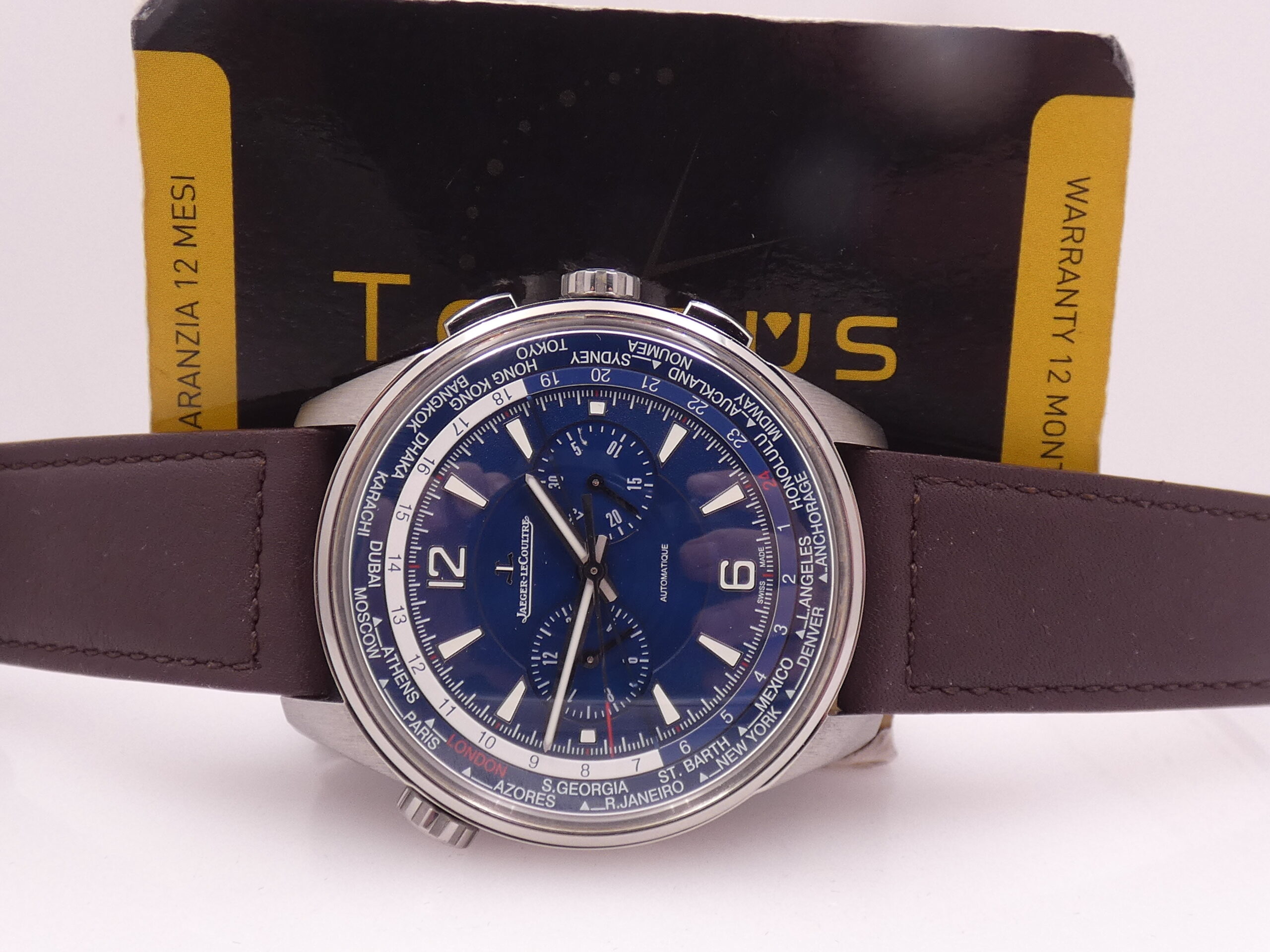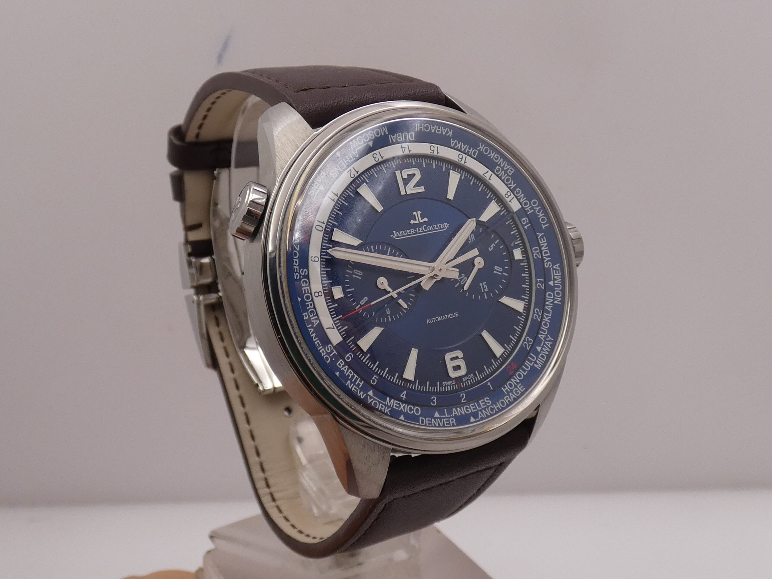 Quadrante: blue, con indici geometrici, arabi a mezza, in accaio, in rilievo e trattati con meteriale luminescente, lancette a stilo, anch’esse in acciaio e luminescenti, minuti del crono al 3, ore del crono al 9, secondi cronografici al centro, scala sessantesimale con suddivisione ad 1/5 di secondo, scala delle 24 ore, rehaut girevole riportante le principarli città del Mondo, logo JLC al 12