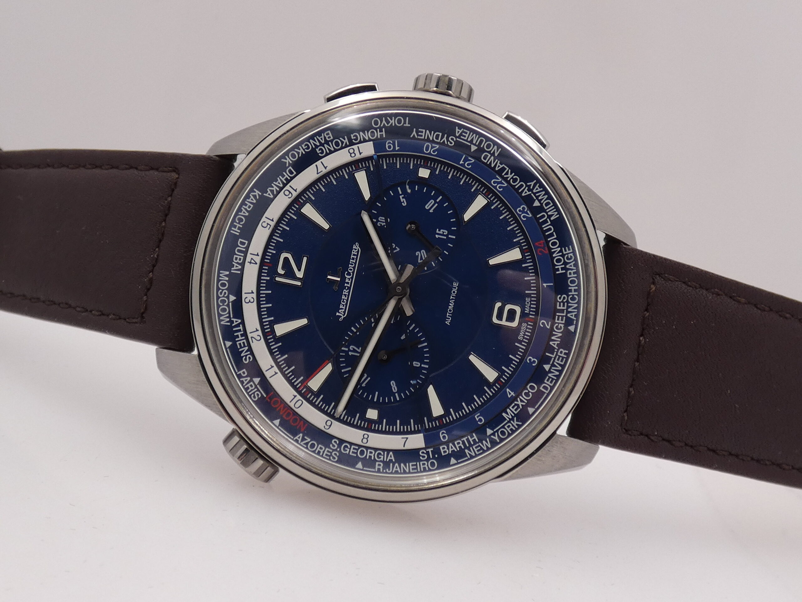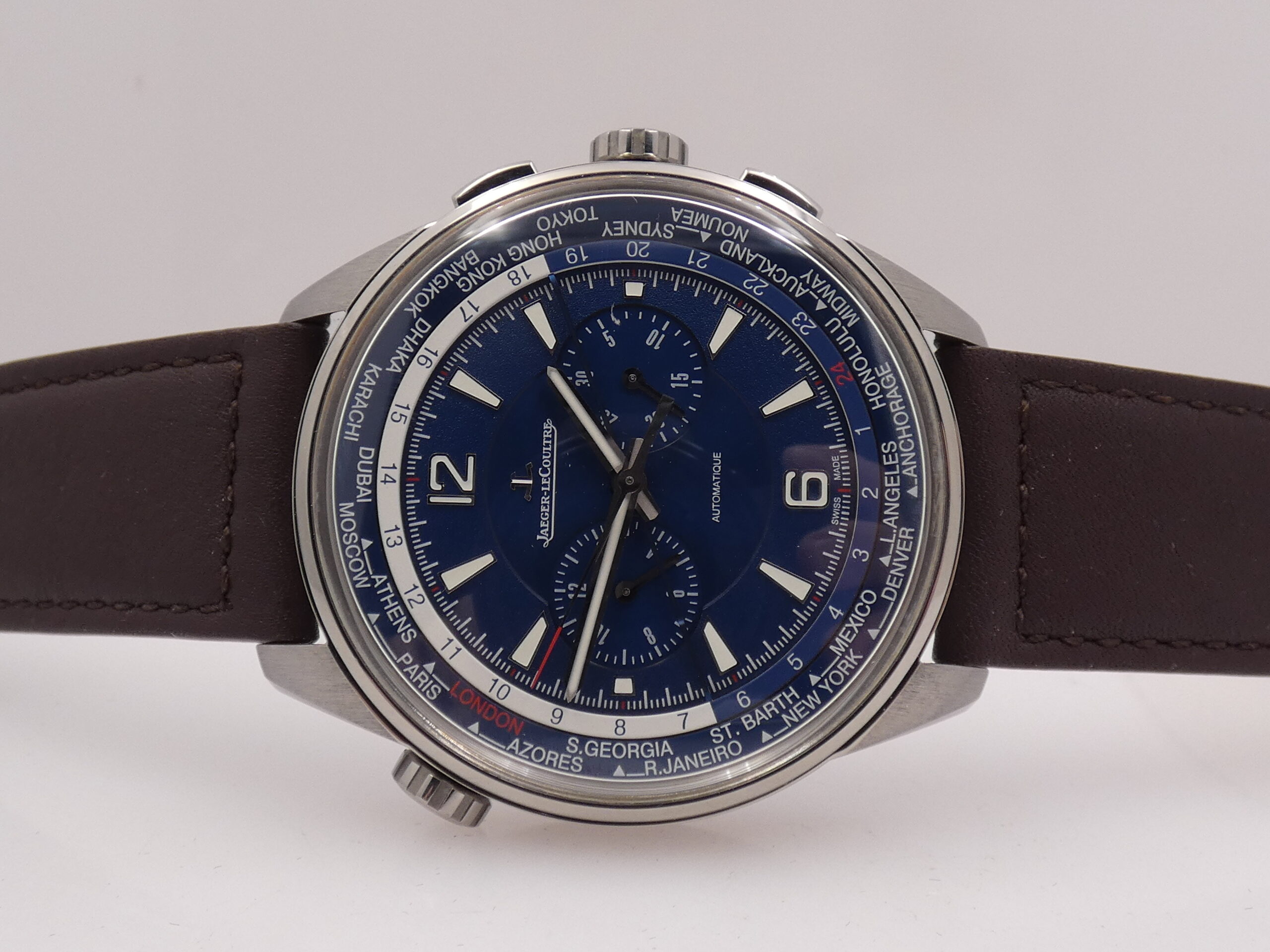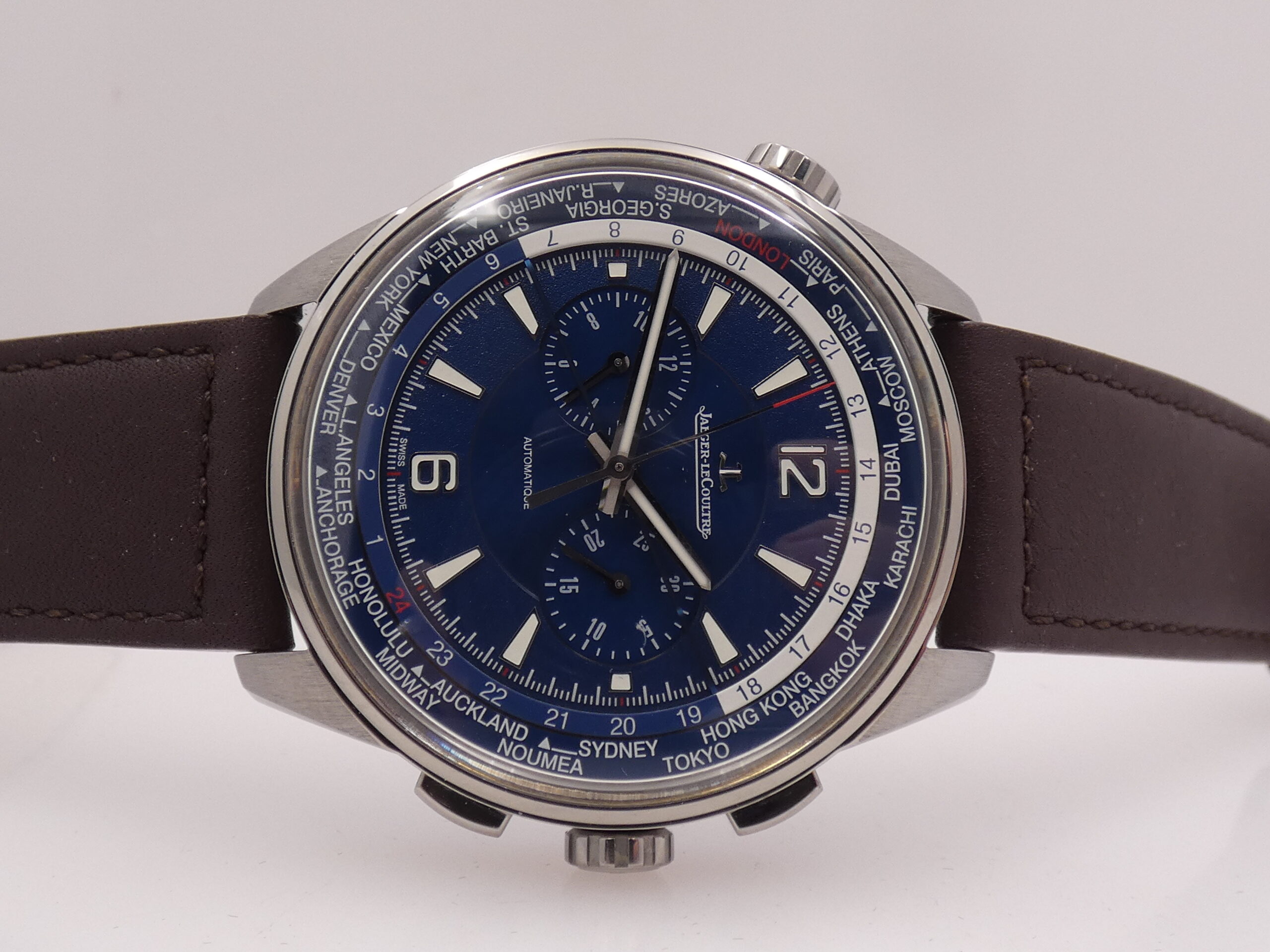 Dial: Blue, with raised steel geometric Arabic numerals and indexes, treated with luminescent material, stylus hands, also made of steel and luminescent, chronograph minutes at 3 o’clock, chronograph hours at 9 o’clock, central chronograph seconds, 60-minute scale with 1/5th of a second subdivisions, 24-hour scale, rotating flange featuring the main world cities, JLC logo at 12 o’clock