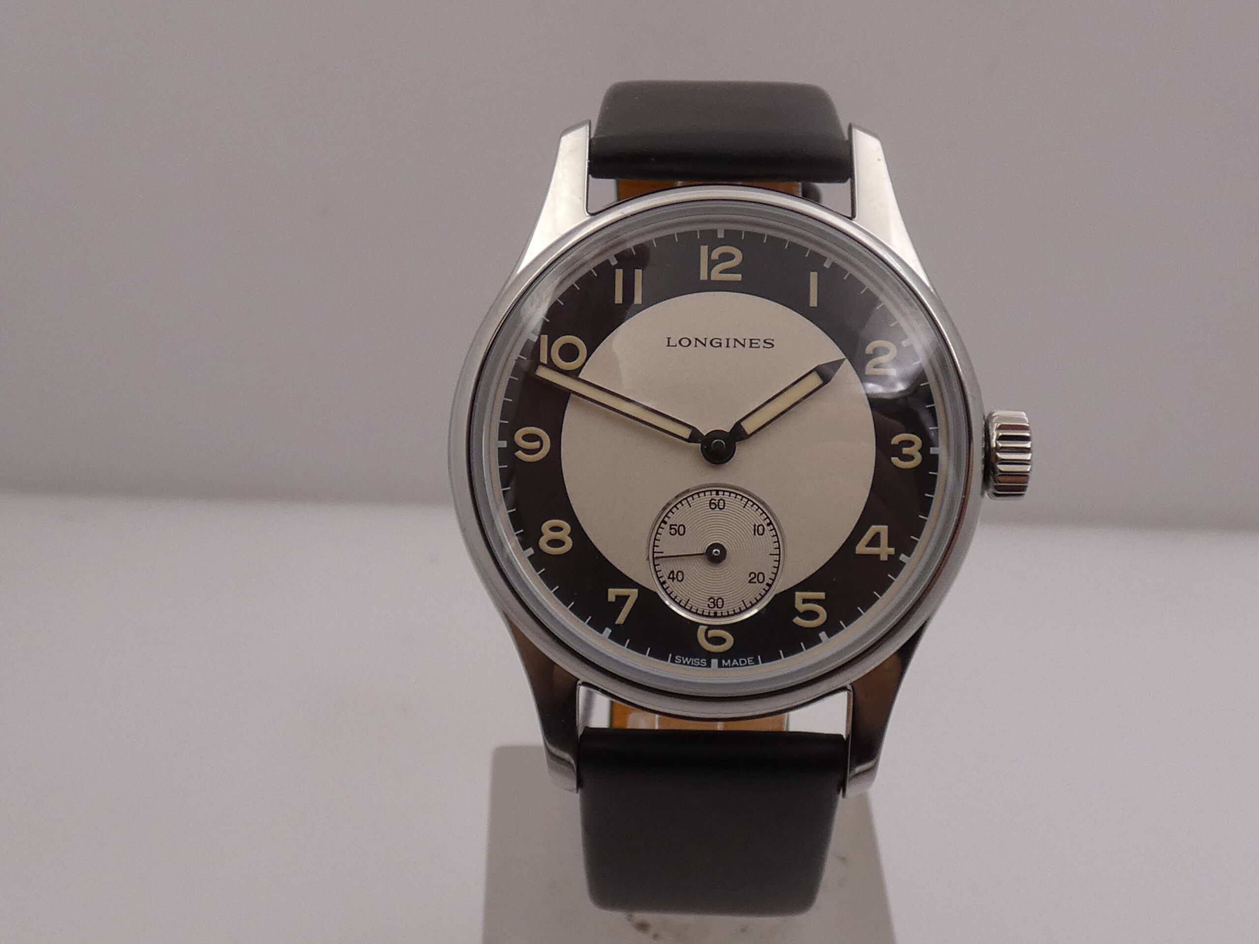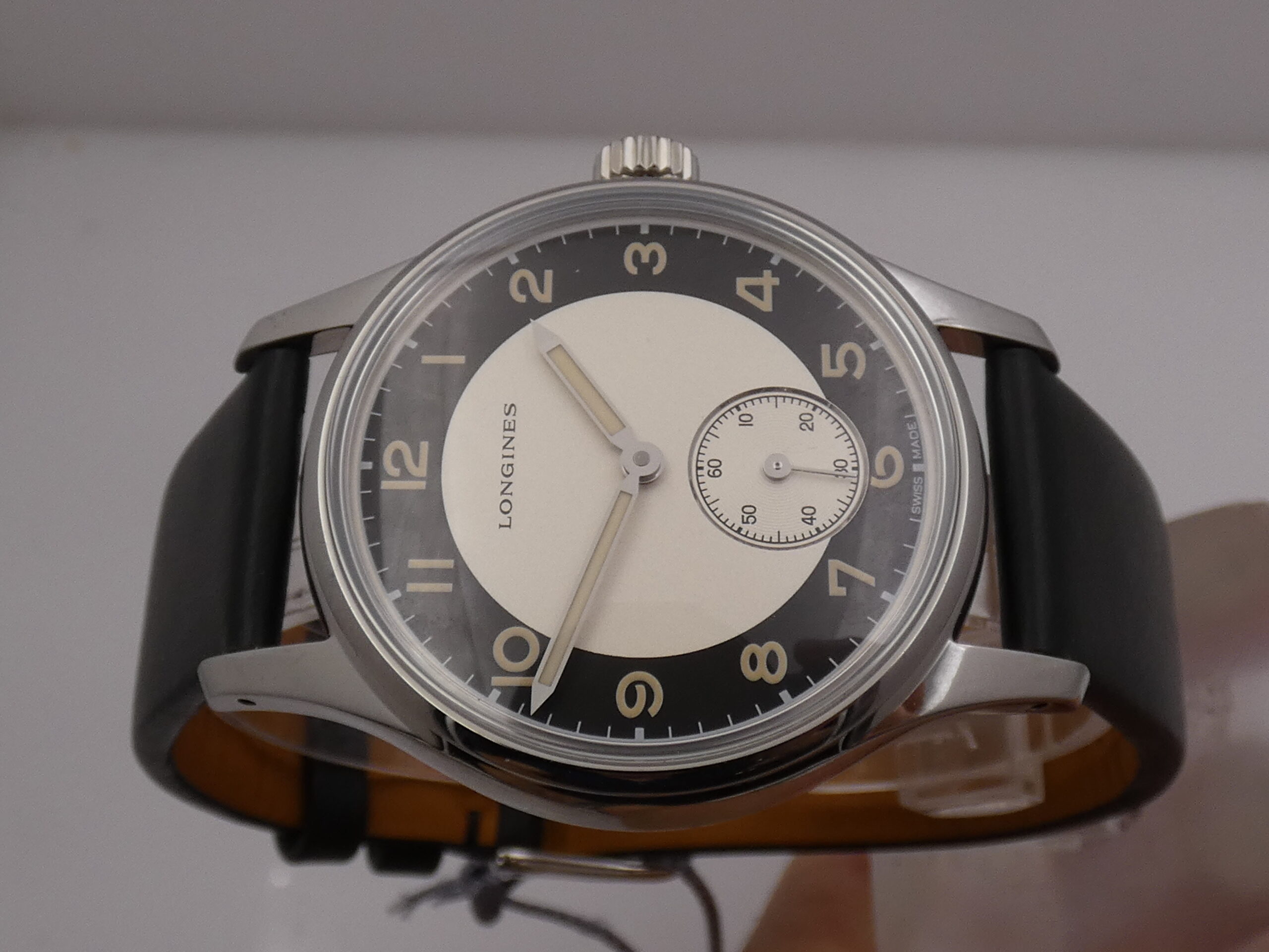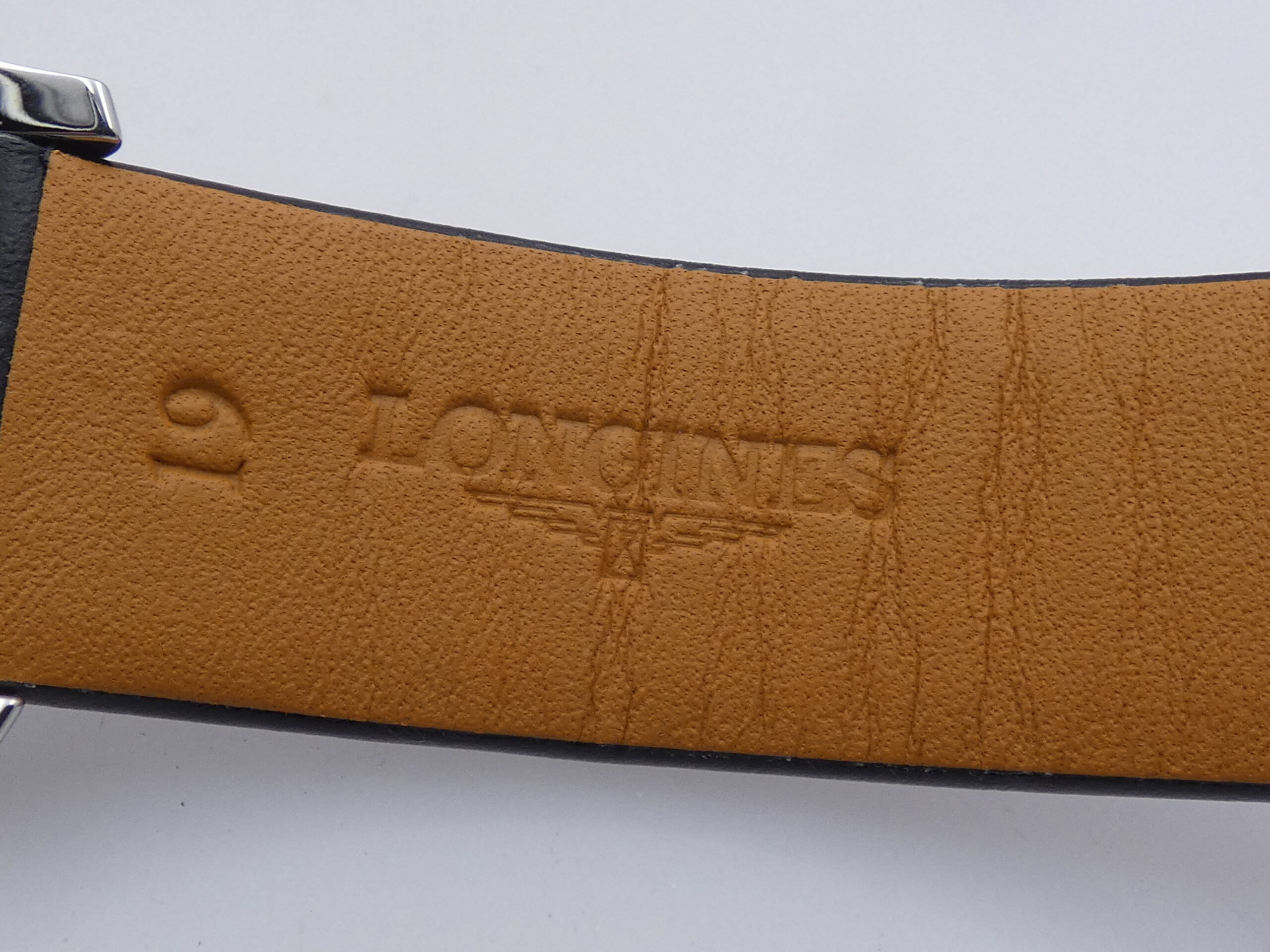 Dial: Tuxedo, with luminescent Arabic numerals, steel and luminescent pencil hands, seconds dial with a beautiful circular motif at 6 o’clock, 60-minute scale, Longines logo at 12 o’clock
