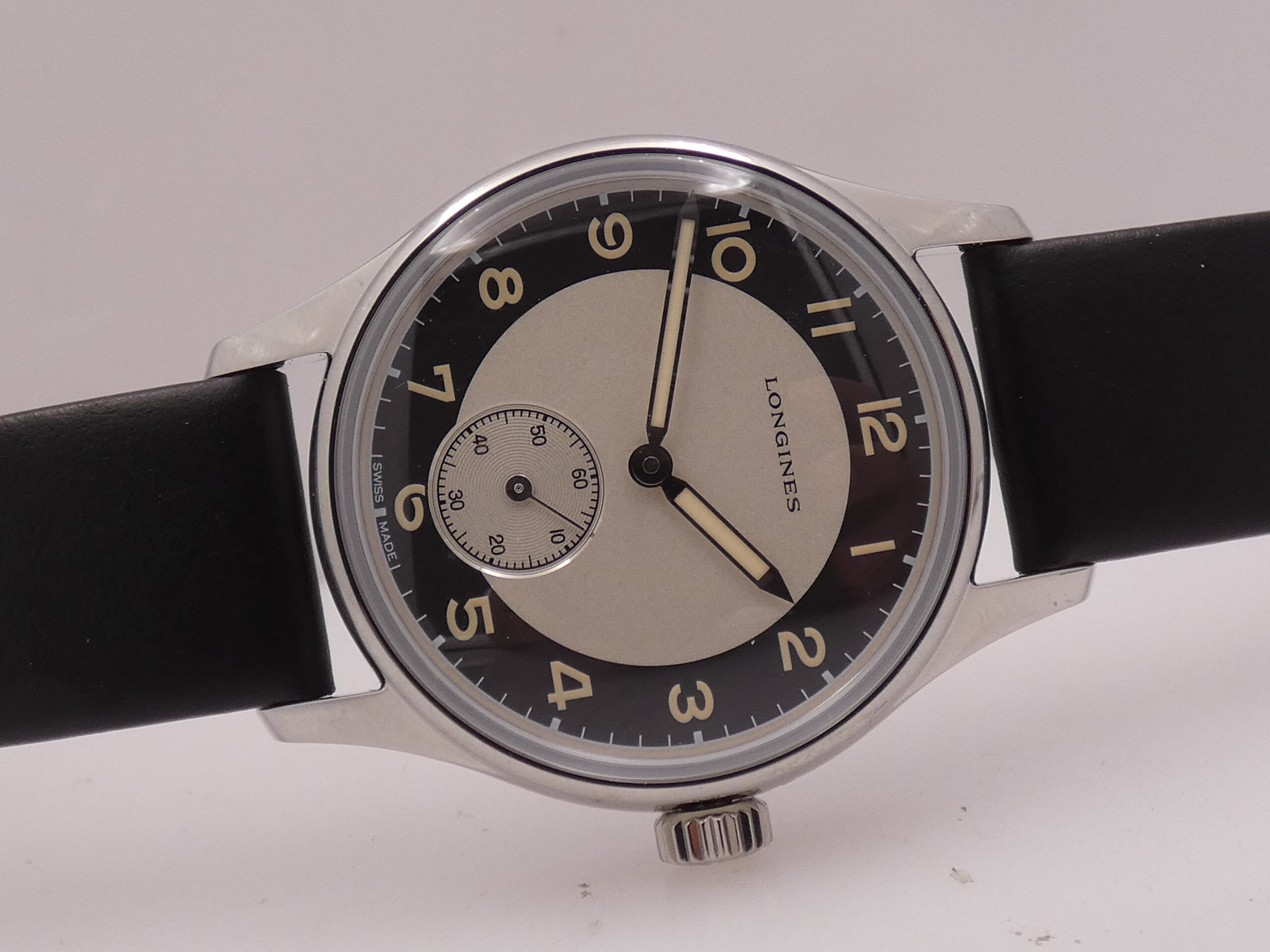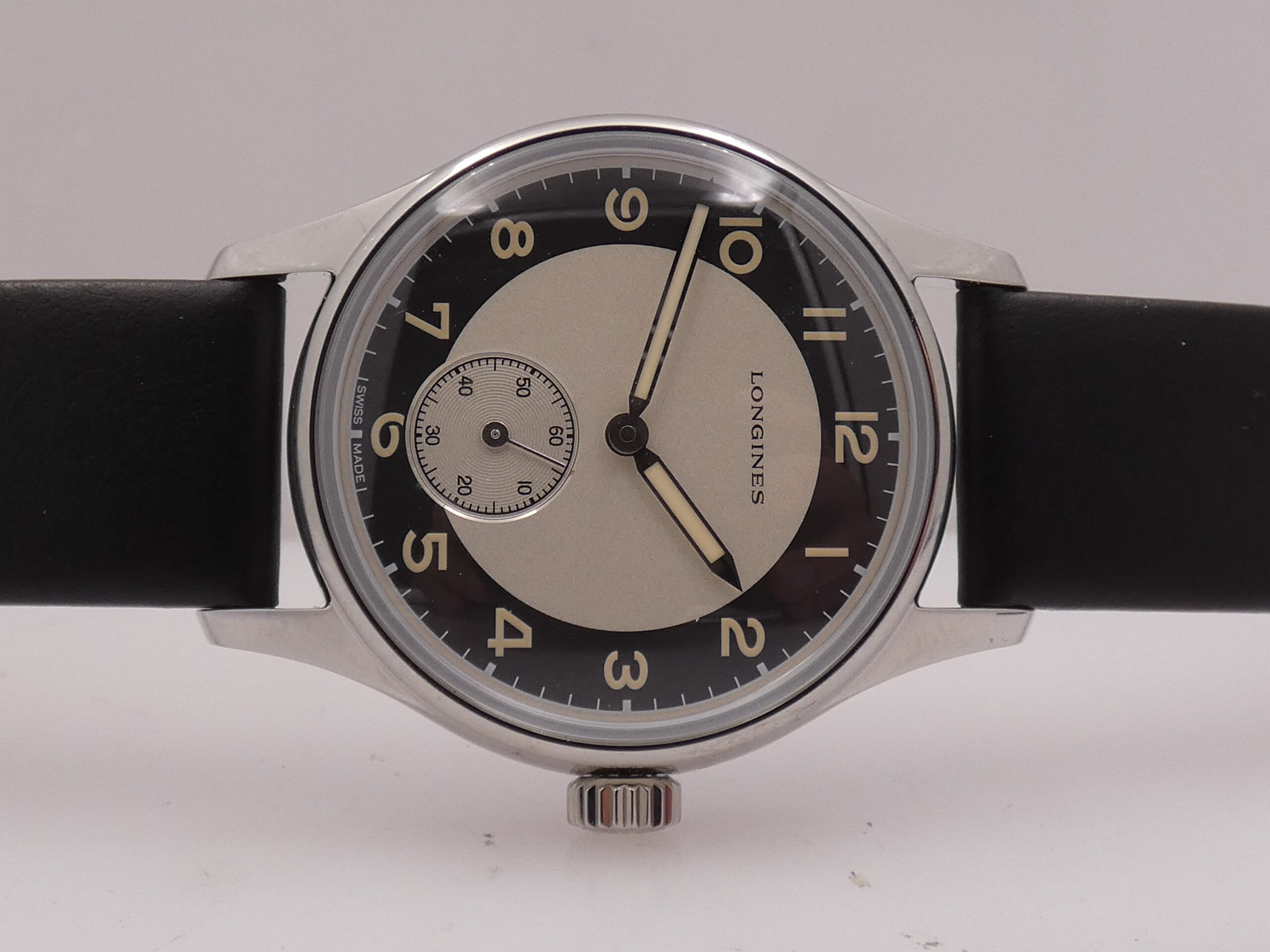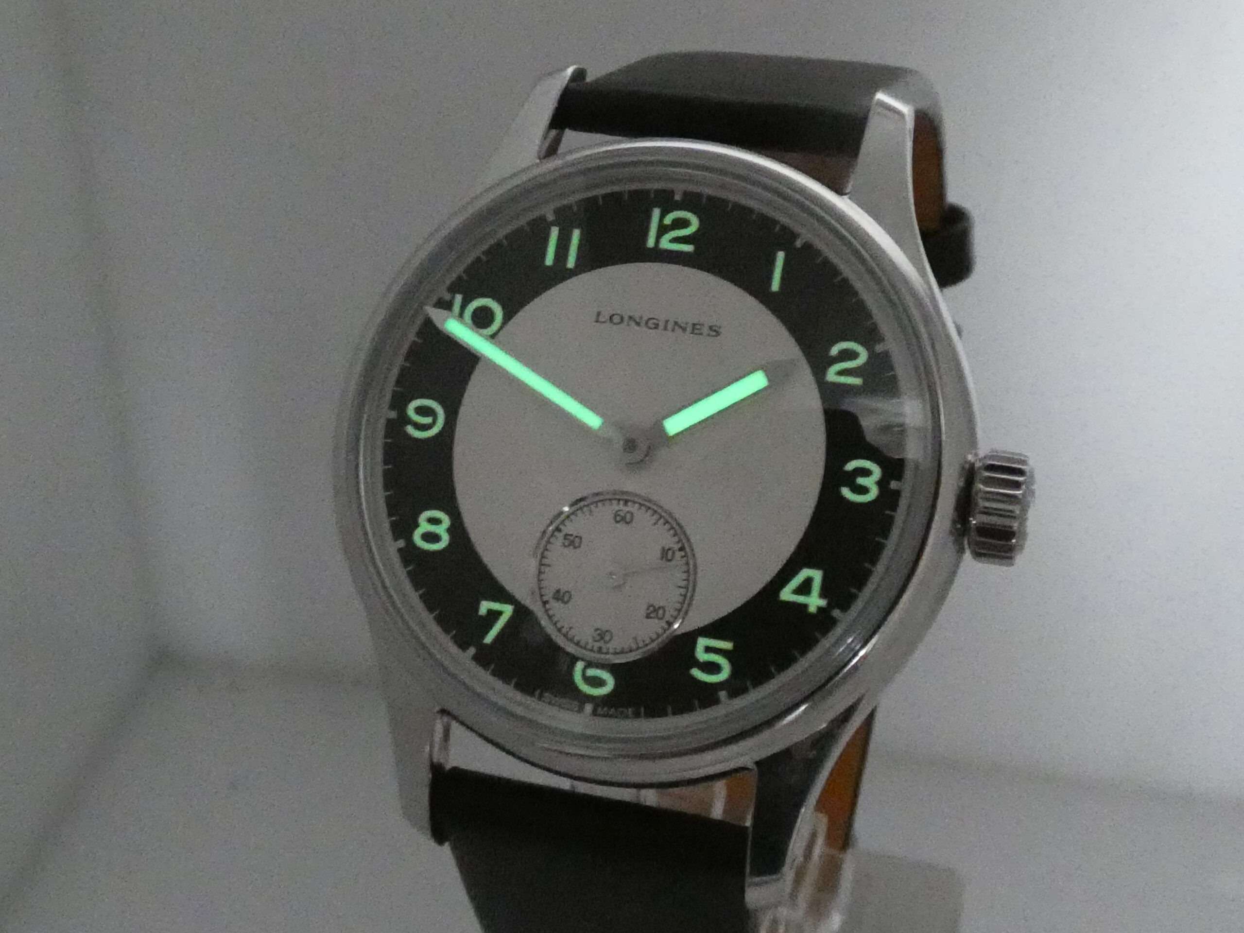 Dial: Tuxedo, with luminescent Arabic numerals, steel and luminescent pencil hands, seconds dial with a beautiful circular motif at 6 o’clock, 60-minute scale, Longines logo at 12 o’clock