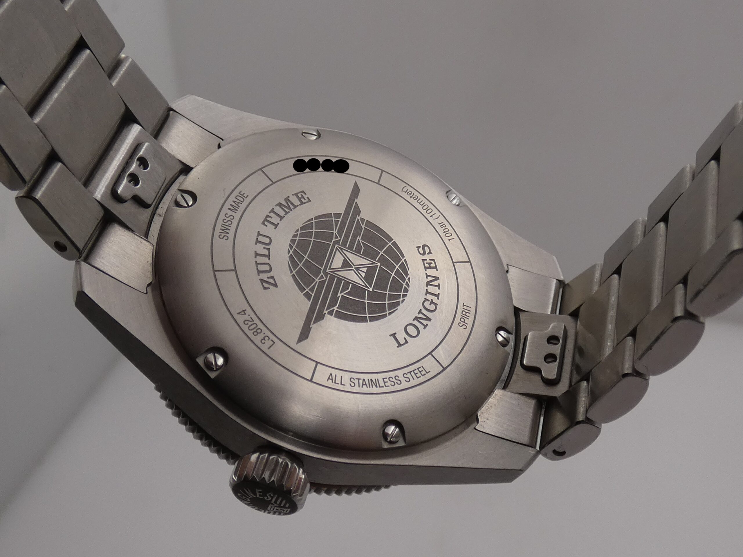 Quadrante: nero, con indici arabi in acciaio, in rilievo e punti in corrispondenza, trattati con materiale luminescente, lancette a spada anch’esse in acciaio e luminescenti, sfera centrale con freccia bianca in punta per l’indicazione del GMT, datario al 6 con rimessa rapida in corona, scala sessantesimale con suddivisione ad 1/5 di secondo, logo Longines al 12