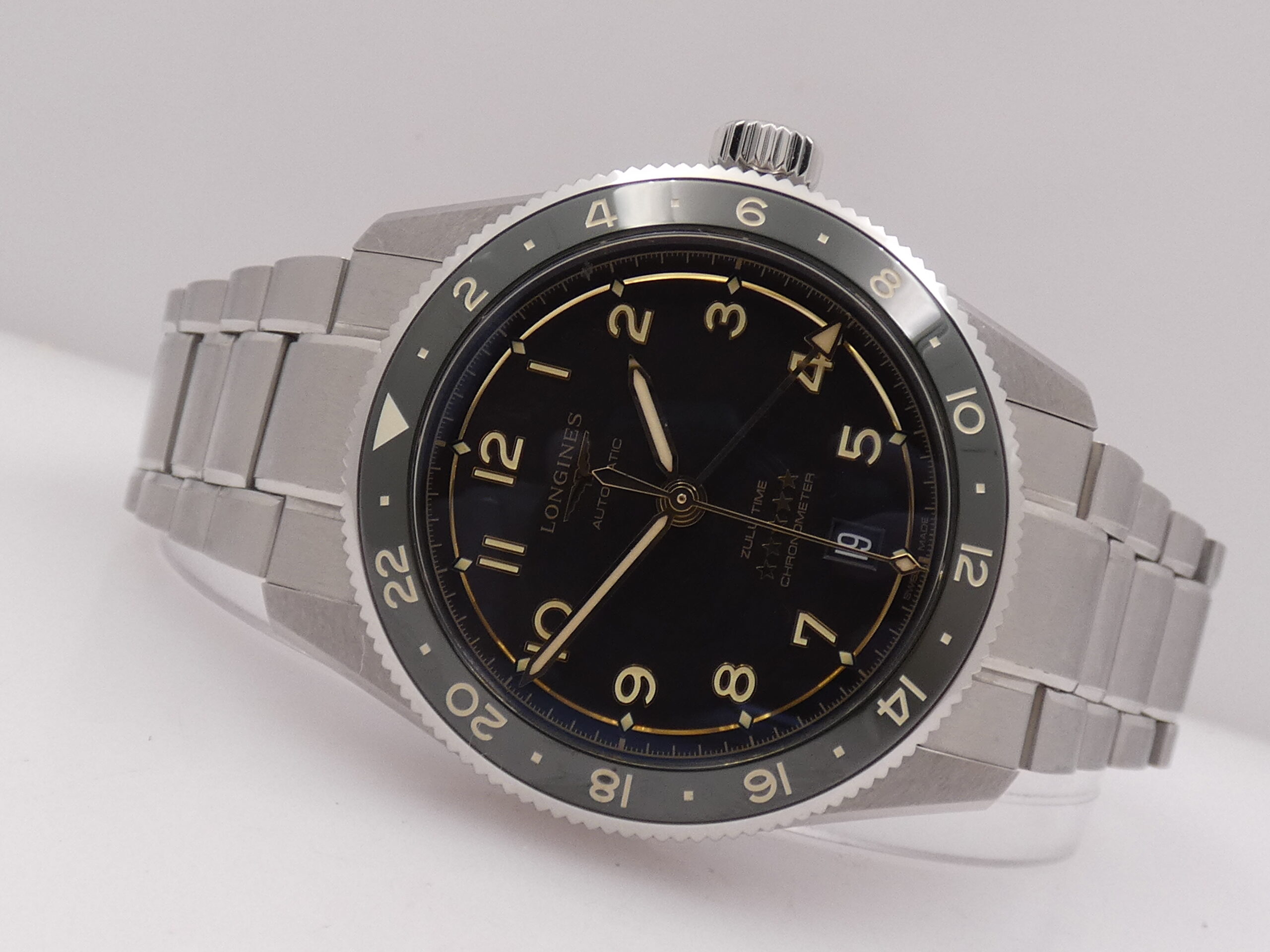 Dial: Black, with raised steel Arabic numerals and corresponding dots, treated with luminescent material, luminescent steel sword hands, central hand with a white arrow at the tip for the GMT indication, date display at 6 o’clock with quick-set crown, 60-second scale with 1/5th of a second divisions, Longines logo at 12 o’clock