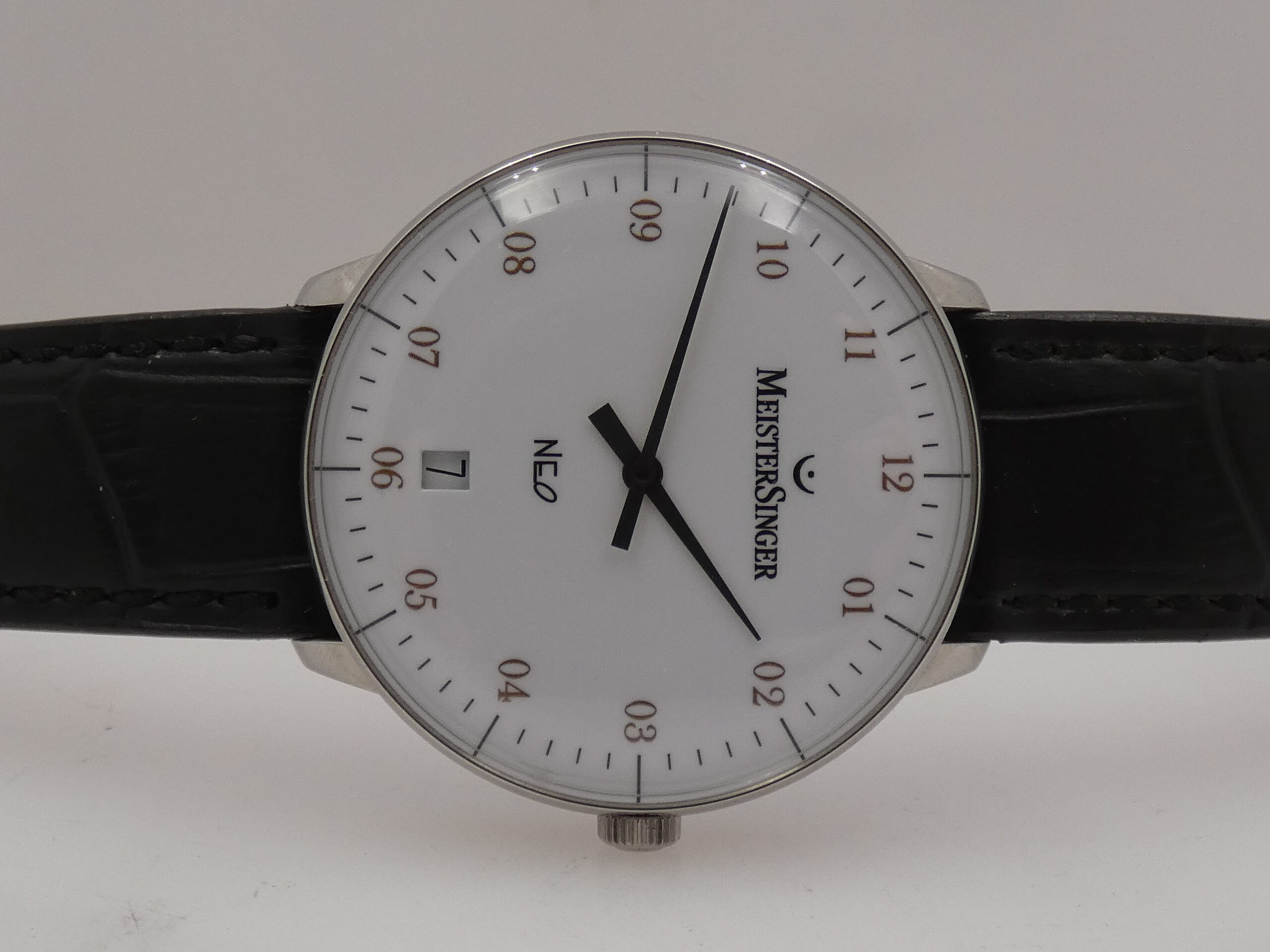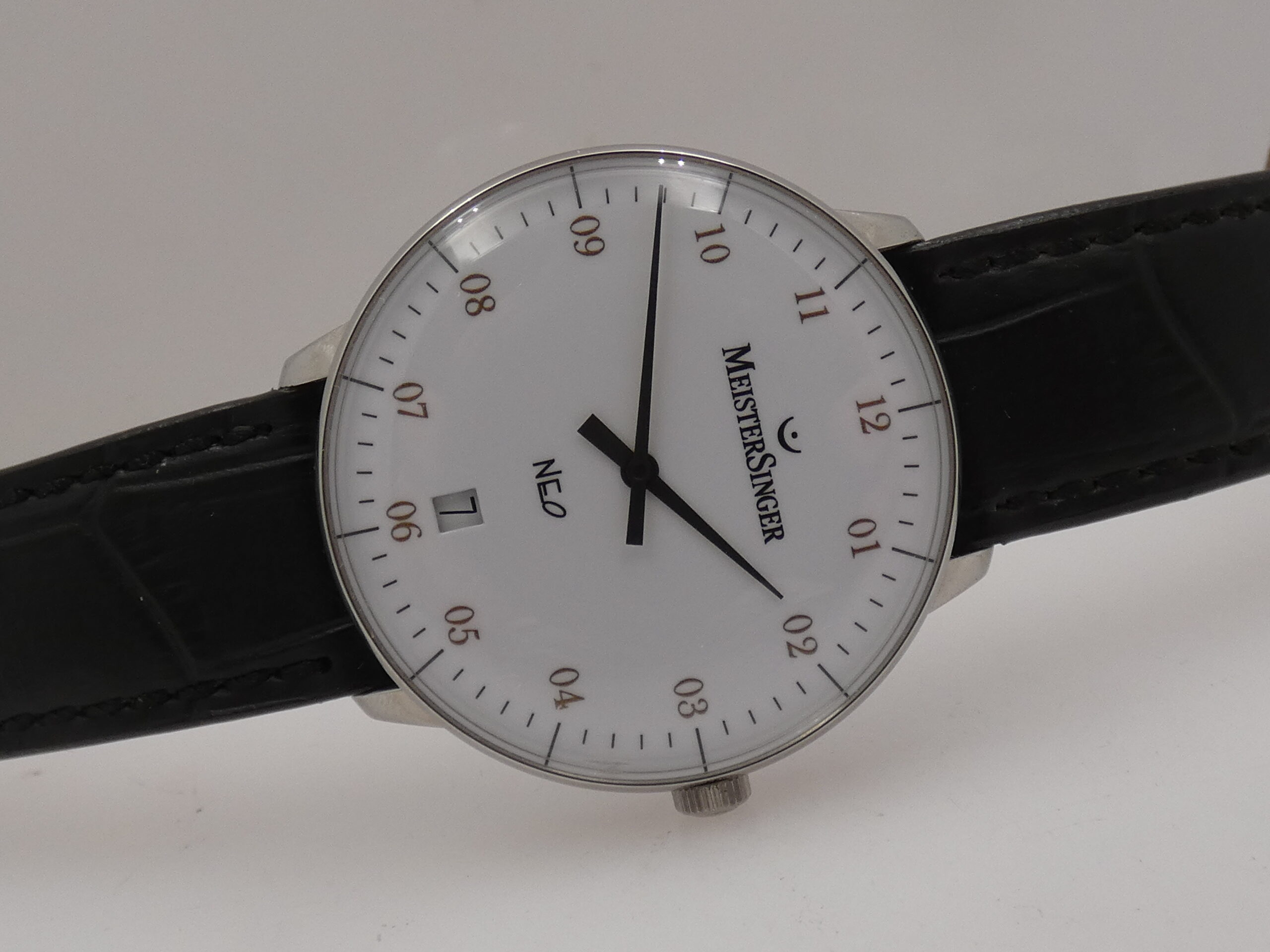 Dial: Porcelain white, with Arabic numerals, burnished steel Dauphine hands, date display at 6 o’clock with quick-set crown, 60-minute scale, MeisterSinger logo at 12 o’clock