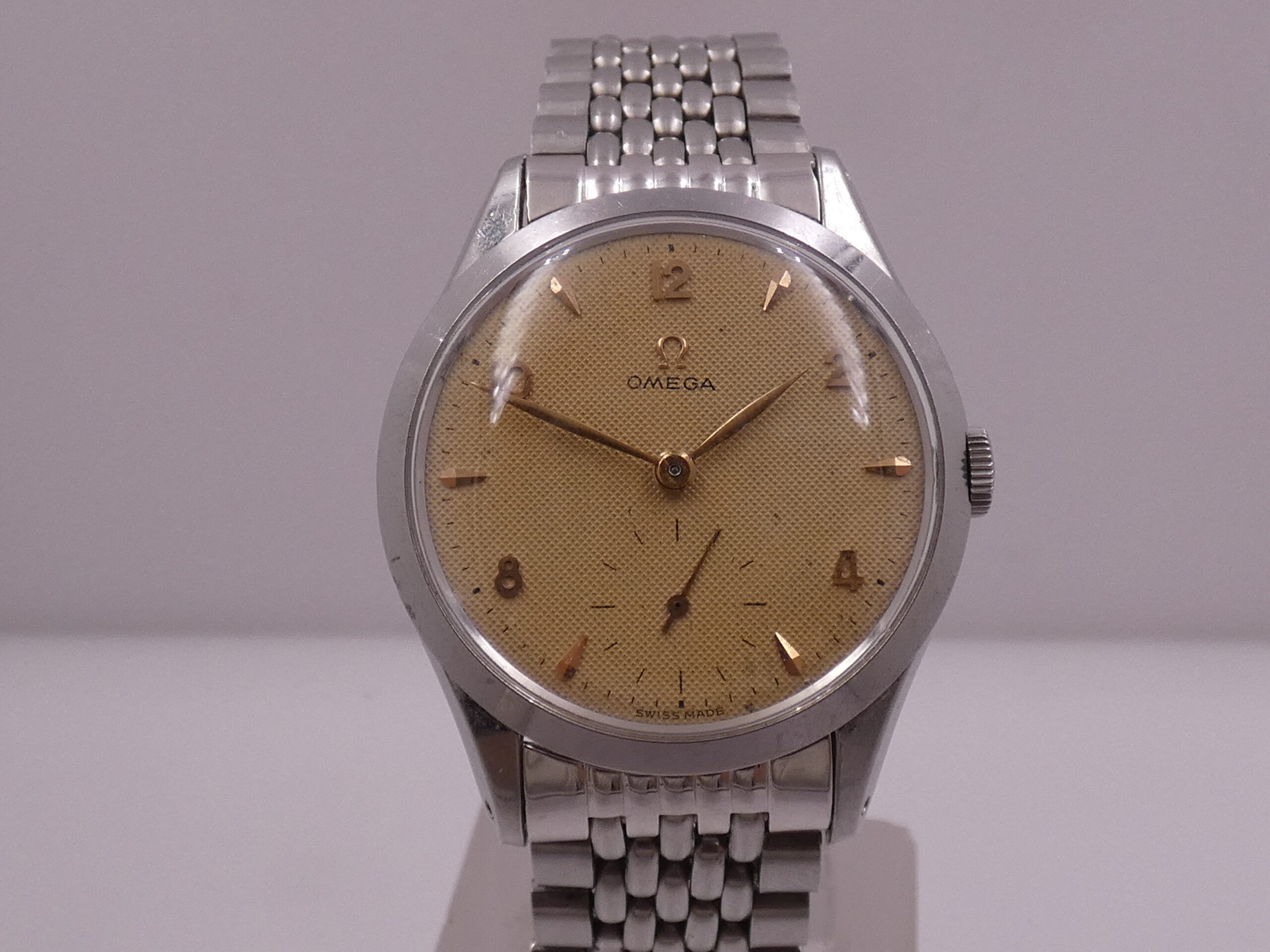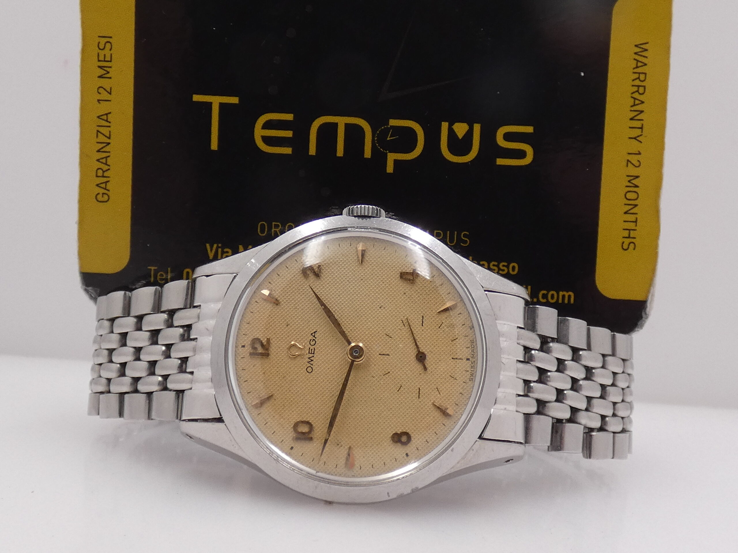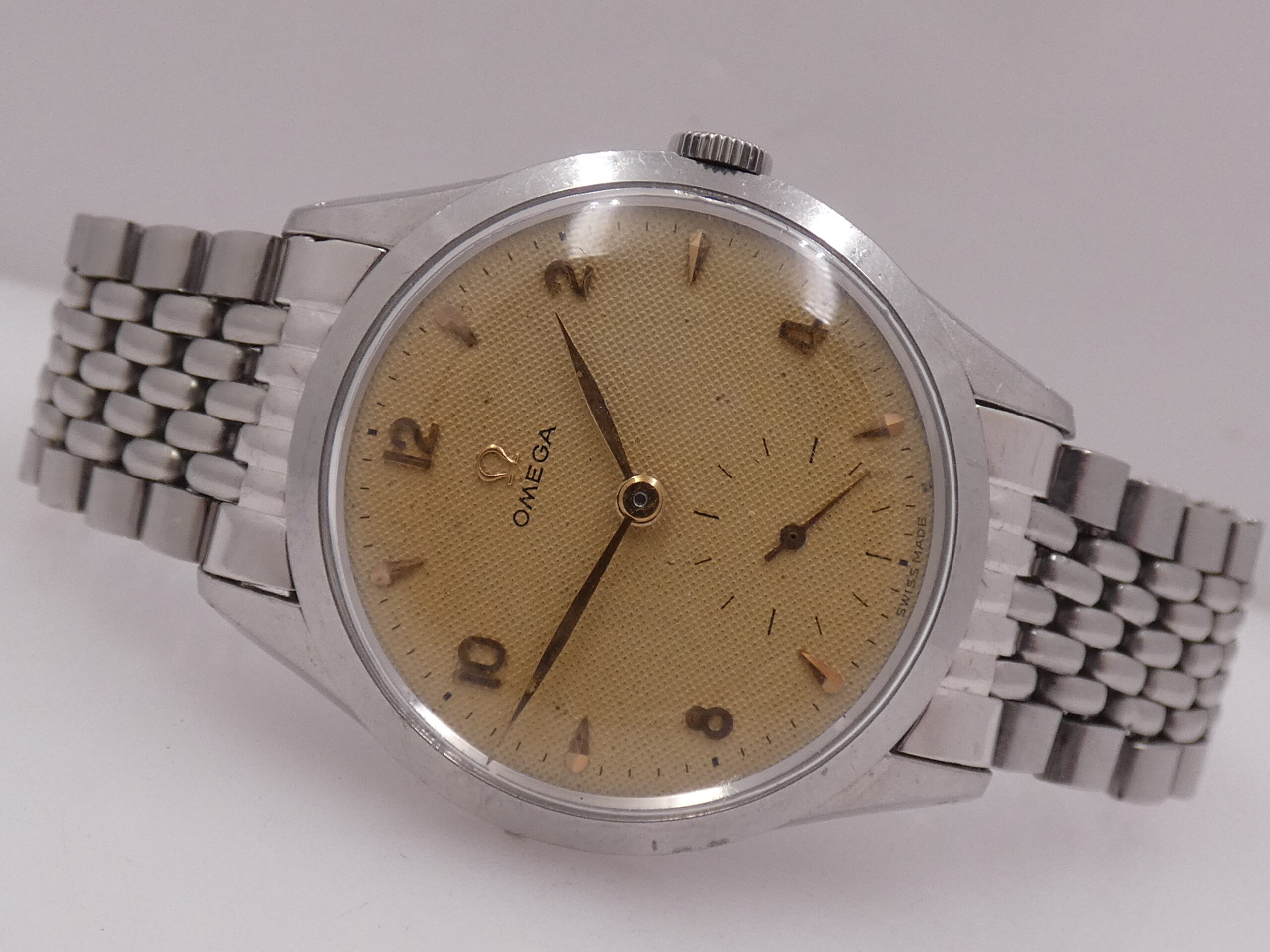Quadrante: champagne, con bellissima lavorazione a nido d’api, indici geometrici e arabi alterni, in oro ed in rilievo, lancette a foglia anch’esse in oro, secondi al 6, scala sessantesimale, logo Omega al 12