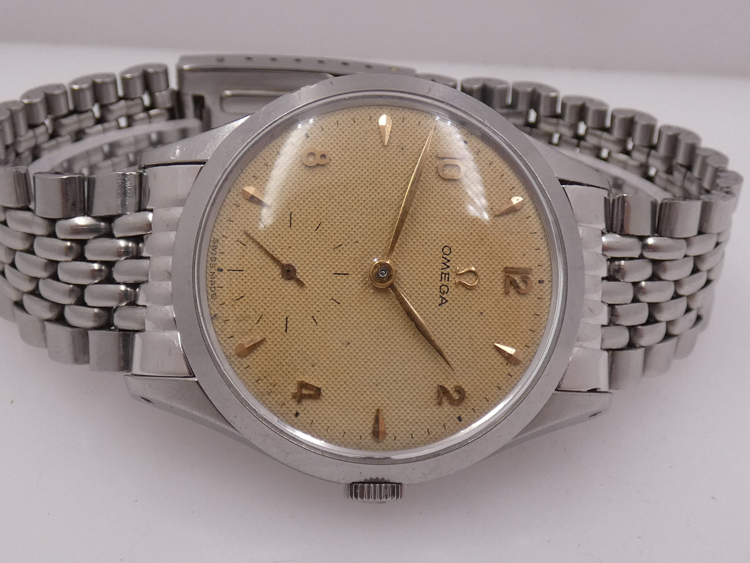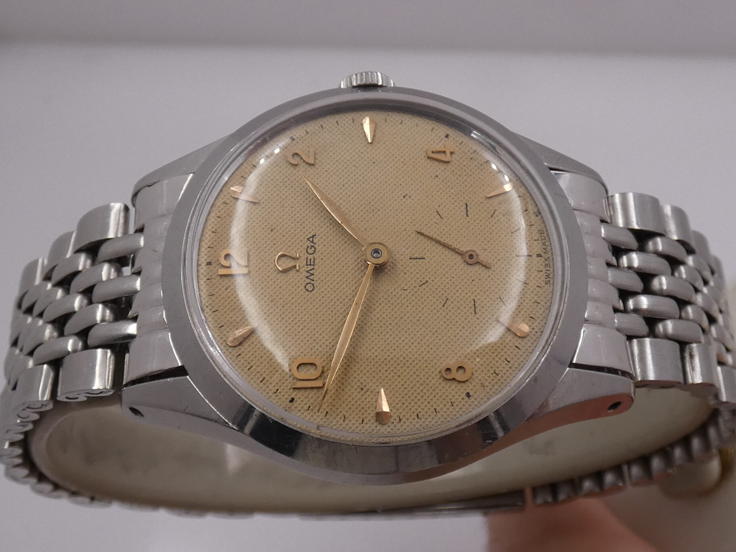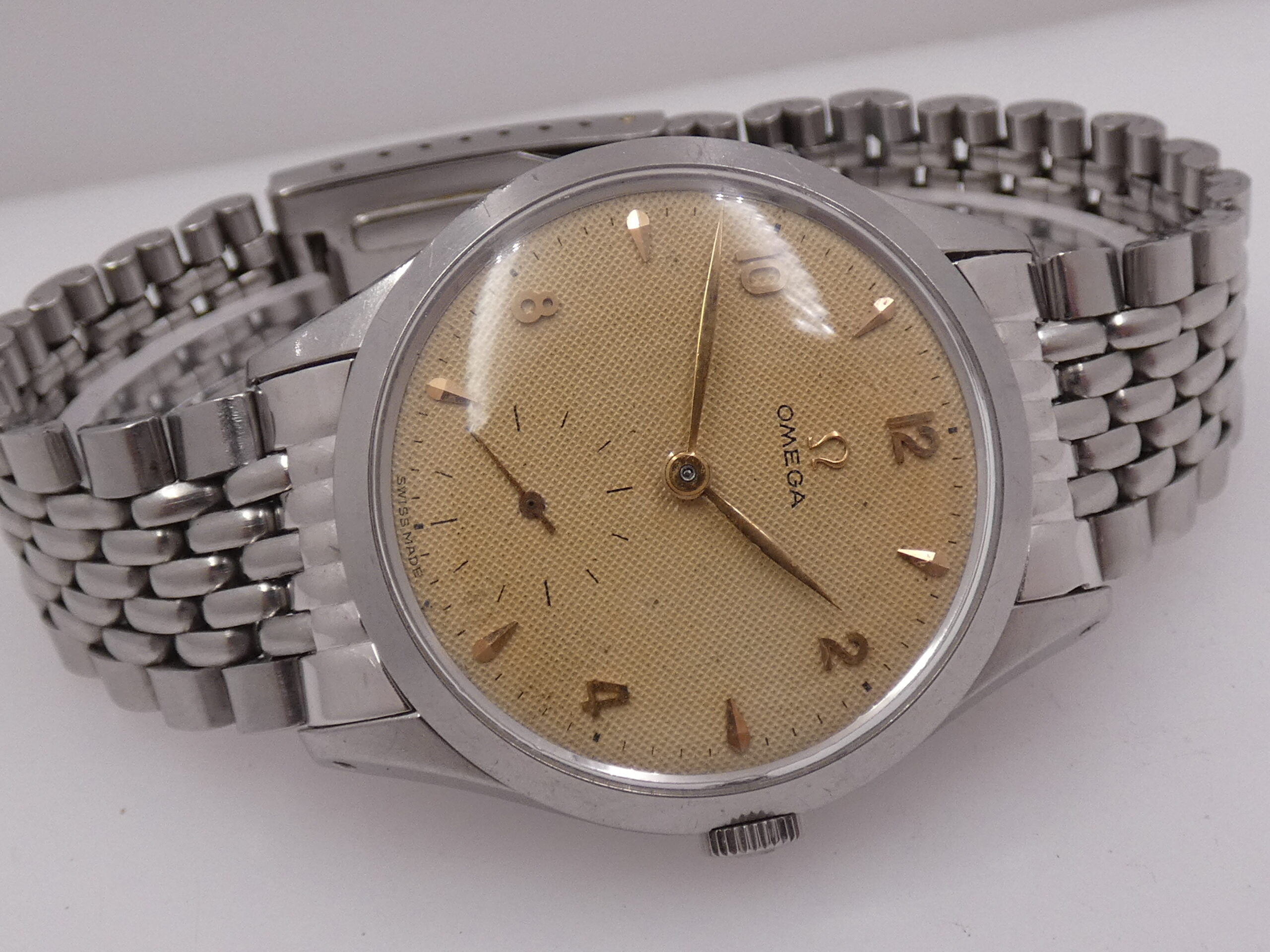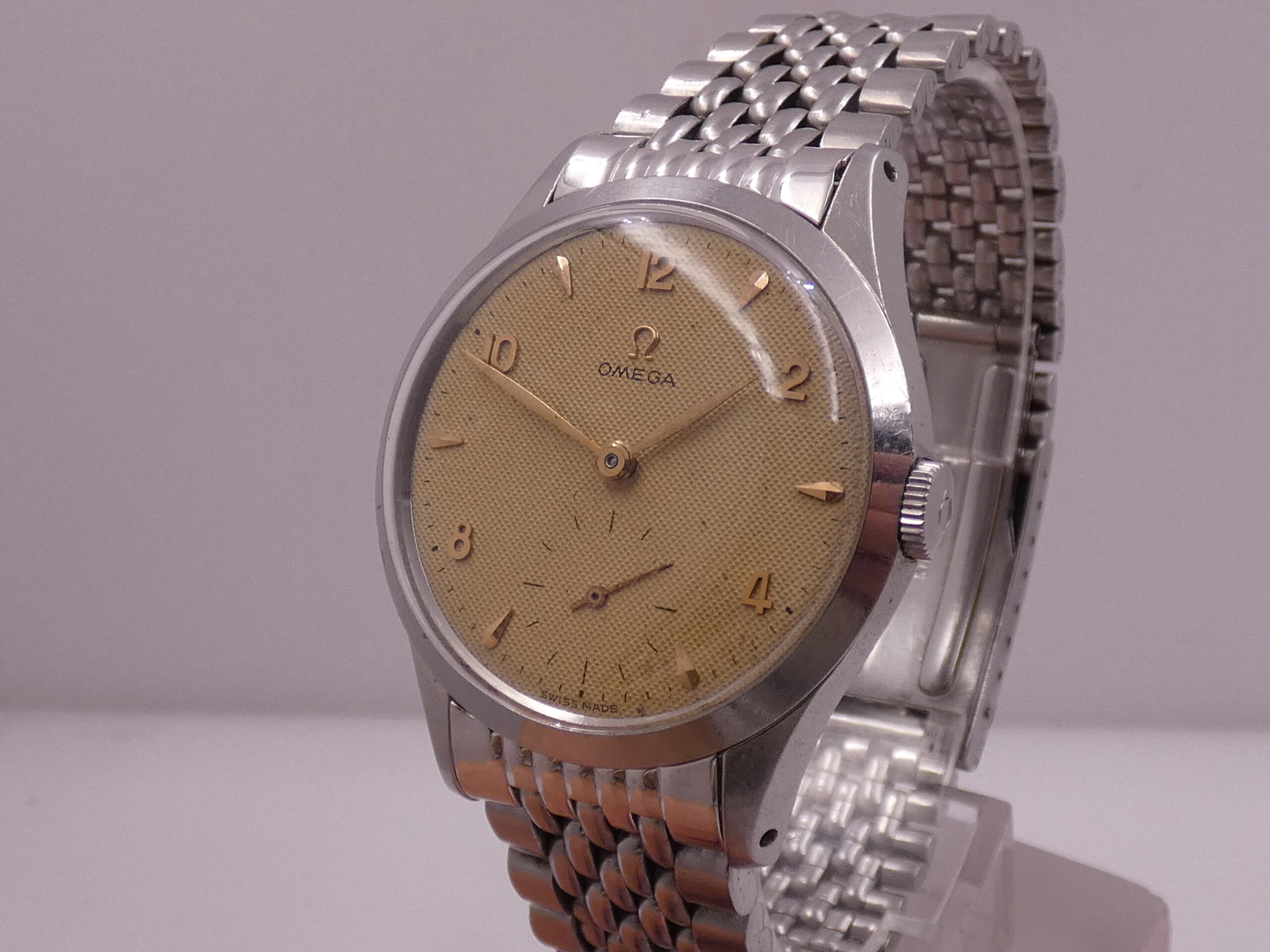 Quadrante: champagne, con bellissima lavorazione a nido d’api, indici geometrici e arabi alterni, in oro ed in rilievo, lancette a foglia anch’esse in oro, secondi al 6, scala sessantesimale, logo Omega al 12
