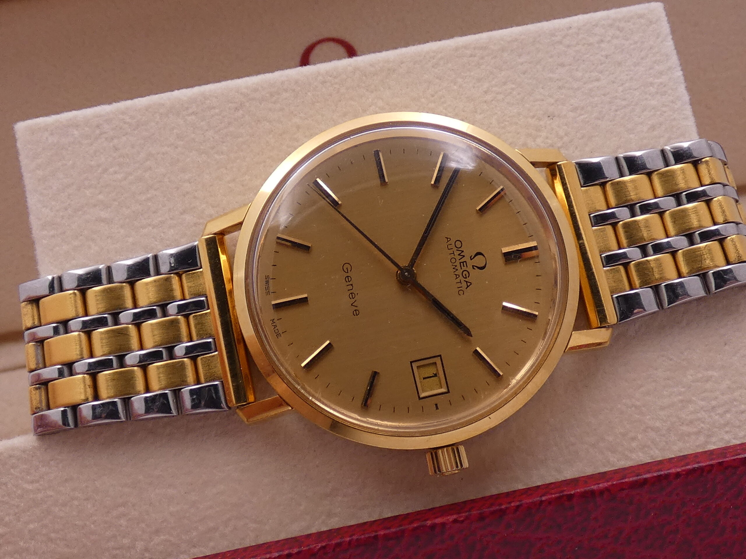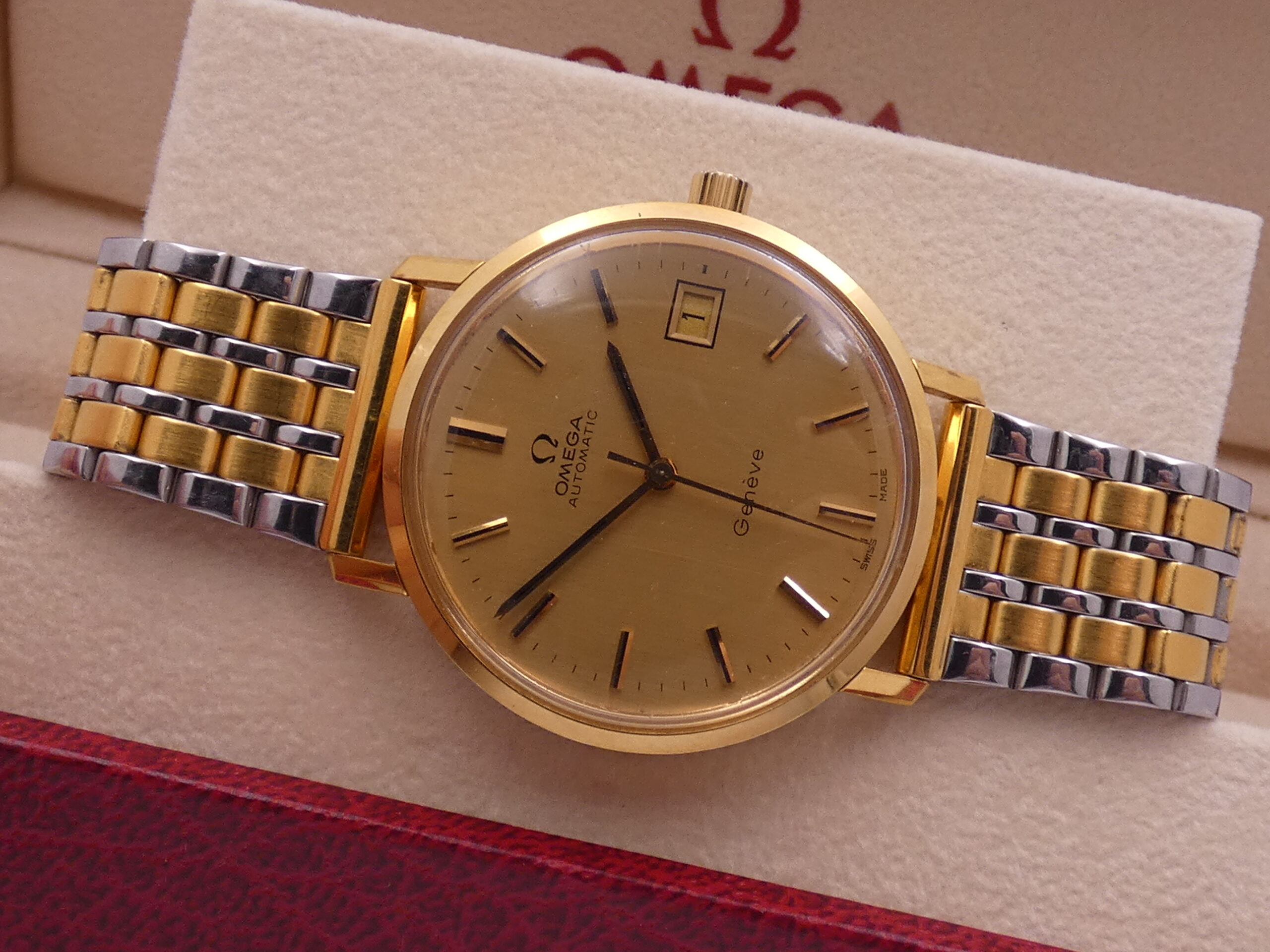 Quadrante: champagne, con indici a barretta in oro ed in rilievo, lancette a stilo anch’esse in oro, secondi al centro, datario al 3 con rimessa rapida in corona, scala sessantesimale, logo Omega al 12