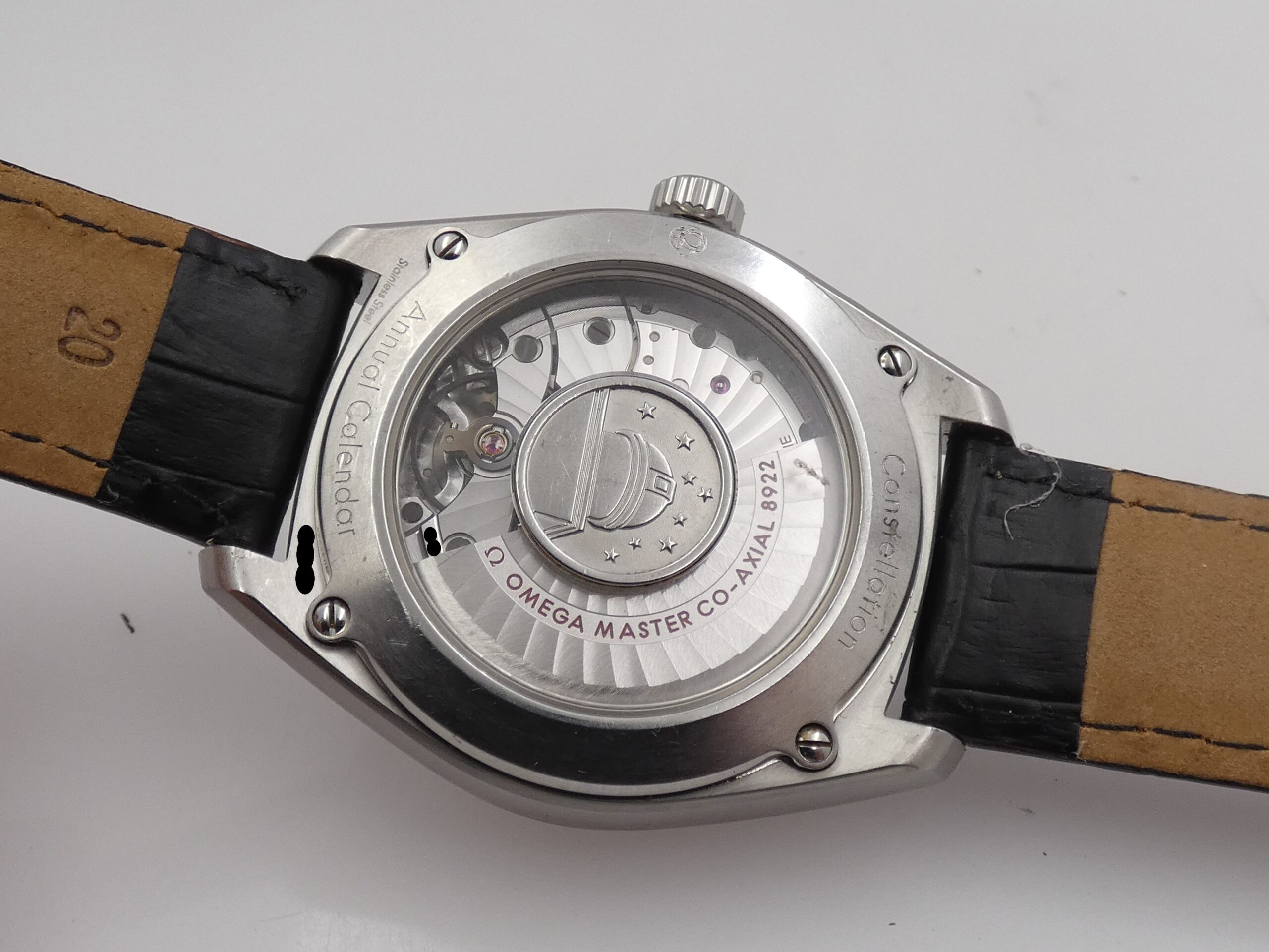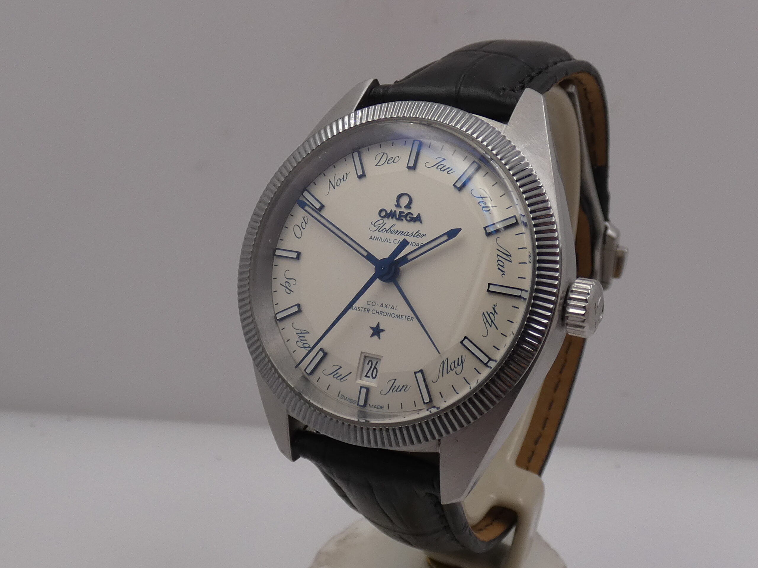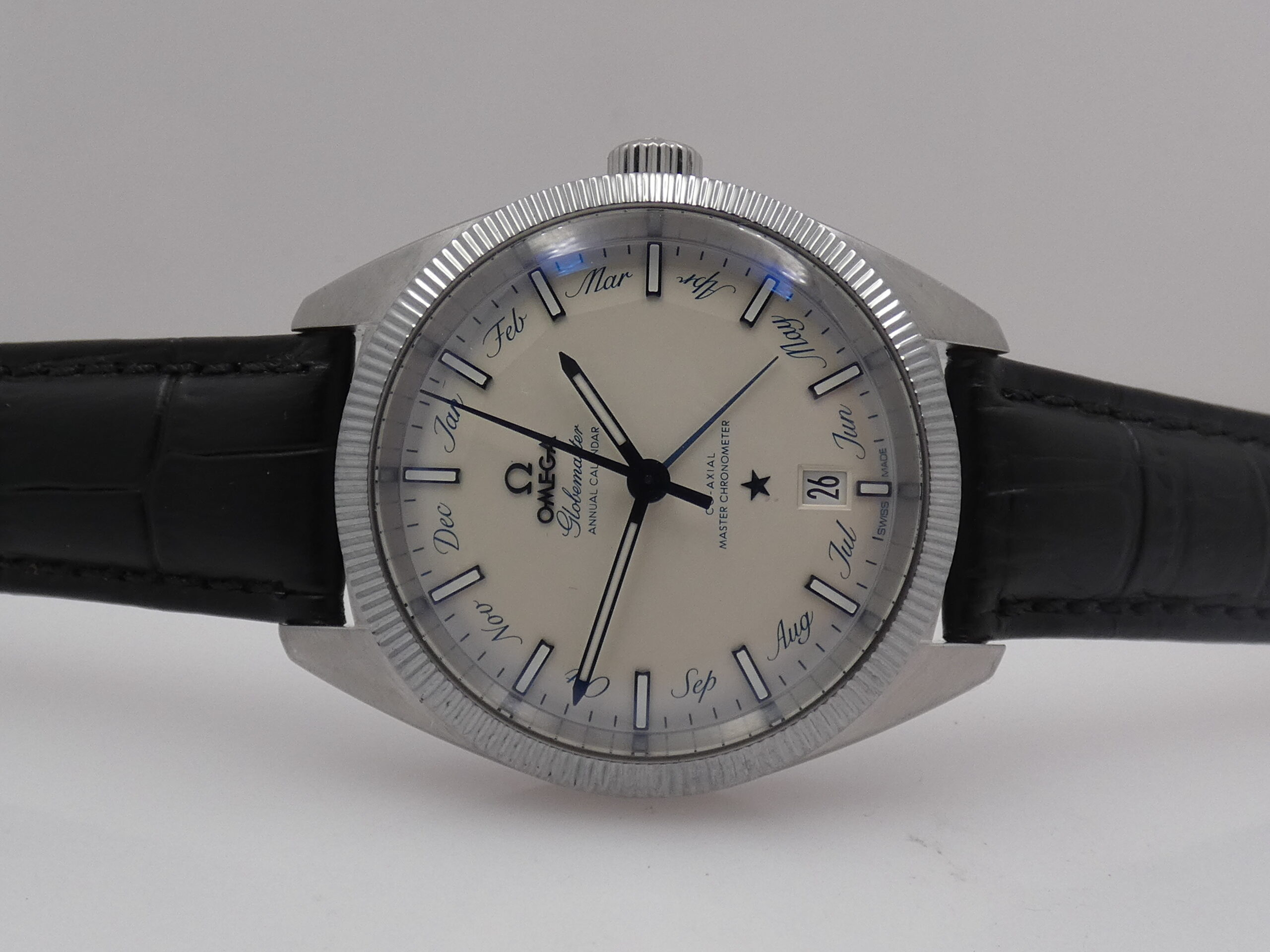Quadrante: ” Pie Pan” bianco/argentè, con l’indicazione dei mesi dell’anno per la funzione del calendario annuale alternati gli indici, indici a barretta in acciaio brunito, in rilievo e trattati con Super-Luminova, lancette a stilo anch’esse in acciaio brunito e luminescenti, secondi al centro tramite sfera azzurrata, indicazione dei mesi tramite sfera azzurrata al centro, datario al 6 con rimessa rapida in corona, scala sessantesimale, Stella Constellation in acciaio azzurrato al 6 e logo Omega in acciaio brunito ed in rilievo al 12