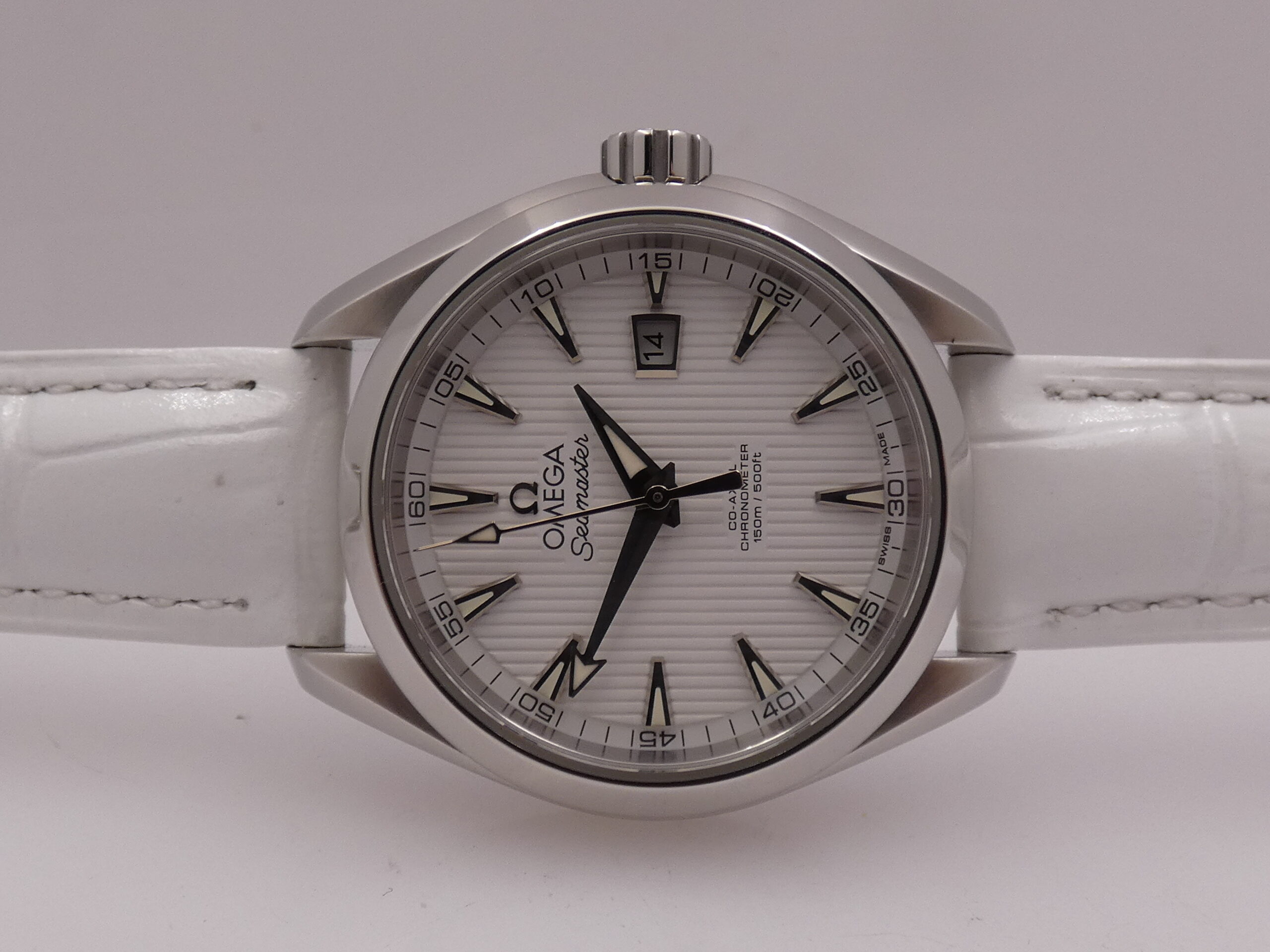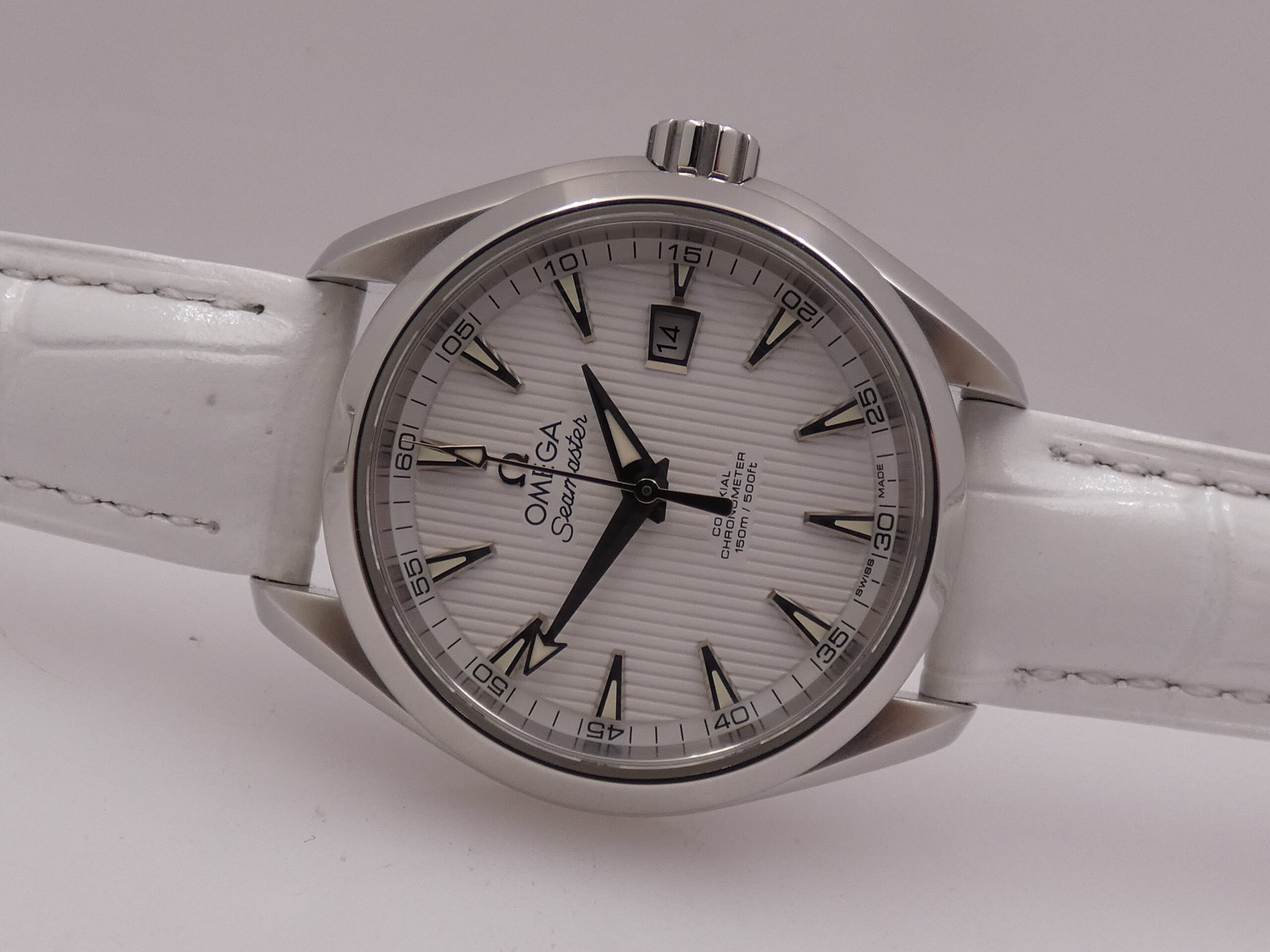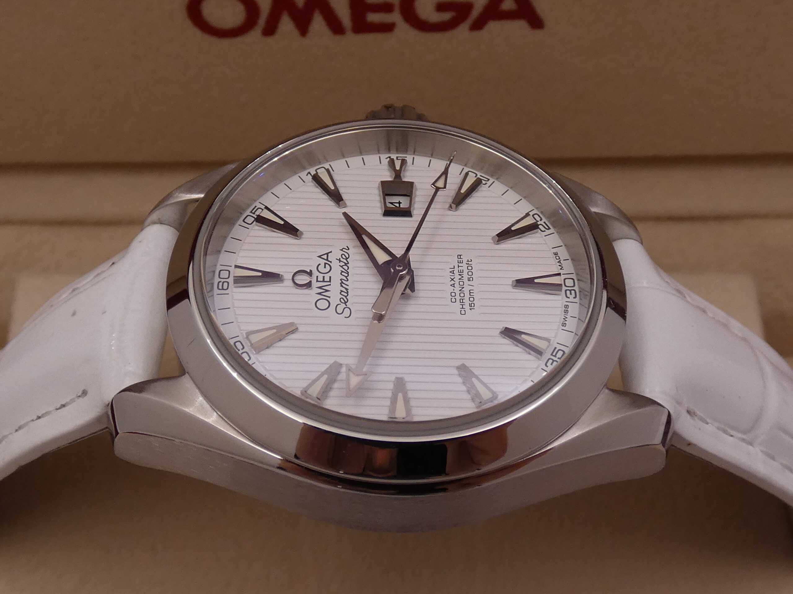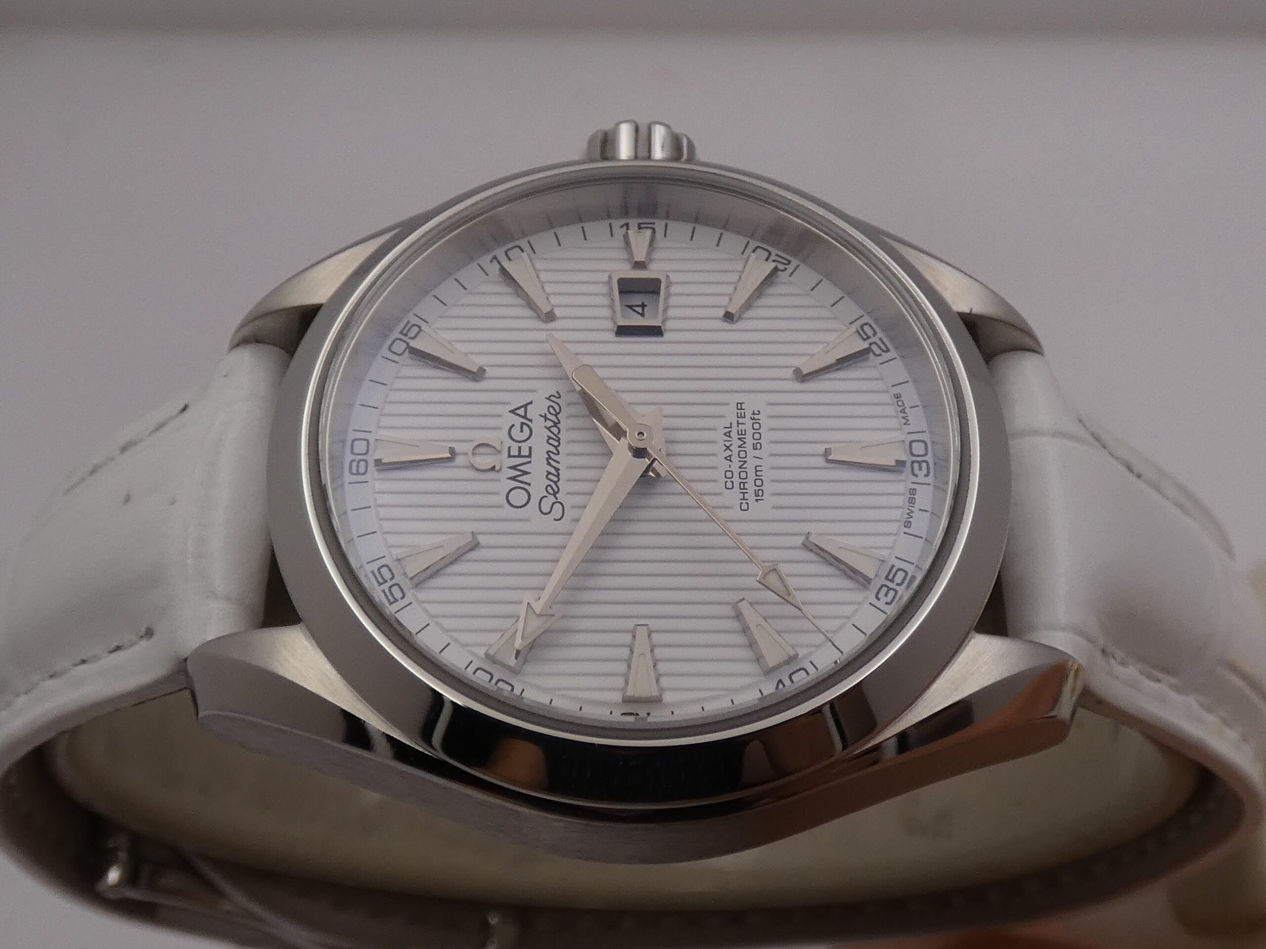 Quadrante: bianco con motivo Teak Concept, indici geometrici in acciaio, in rilievo e trattati con materiale luminescente, lancette arrow anch’esse in acciaio e luminescenti, secondi al centro, datario al 3 con rimessa rapida in corona, scala sessantesimale, logo Omega al 12