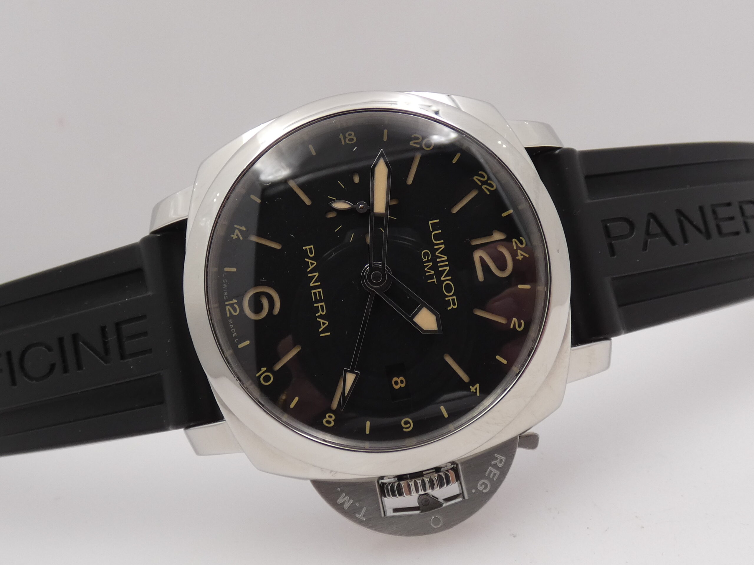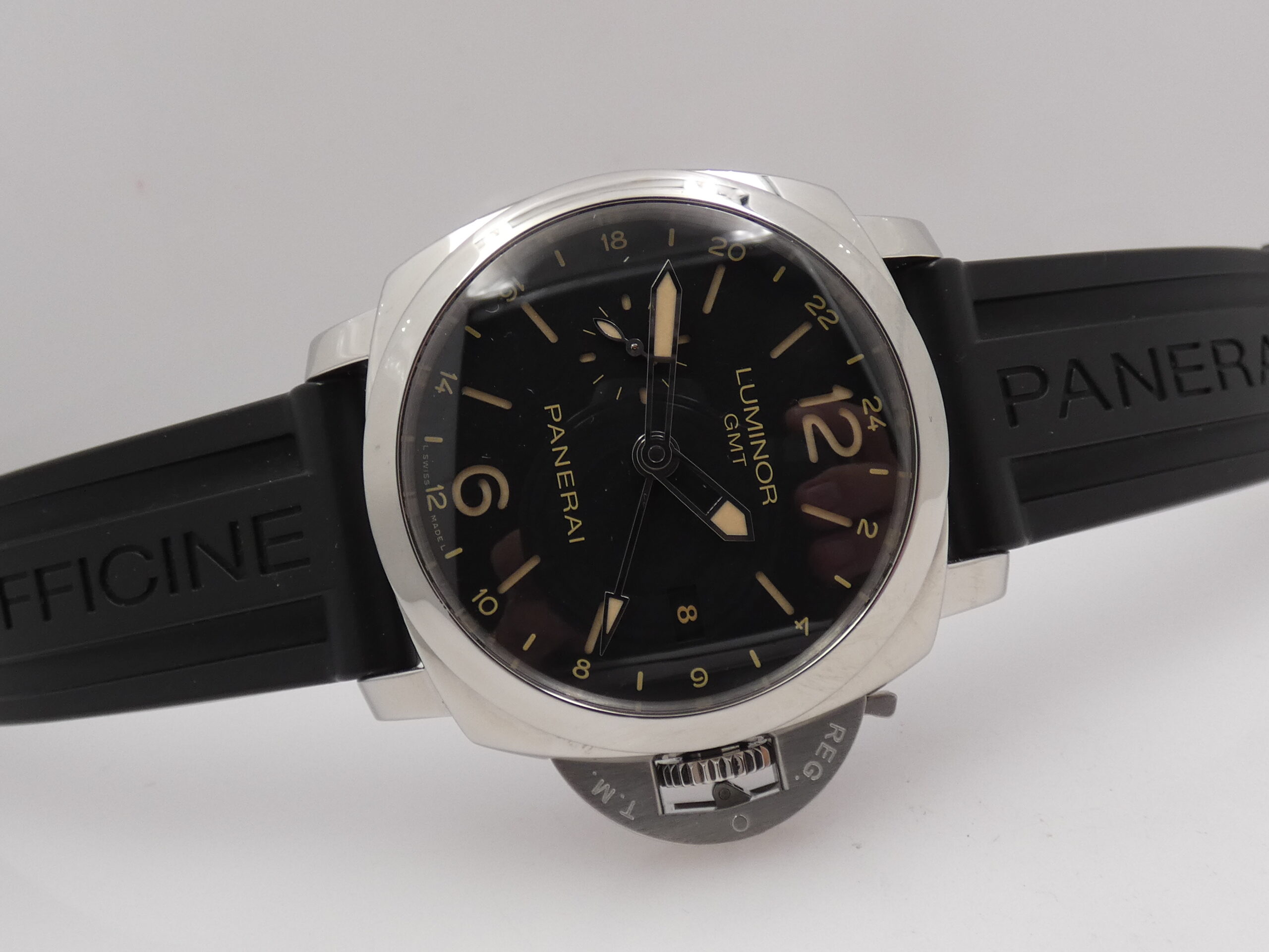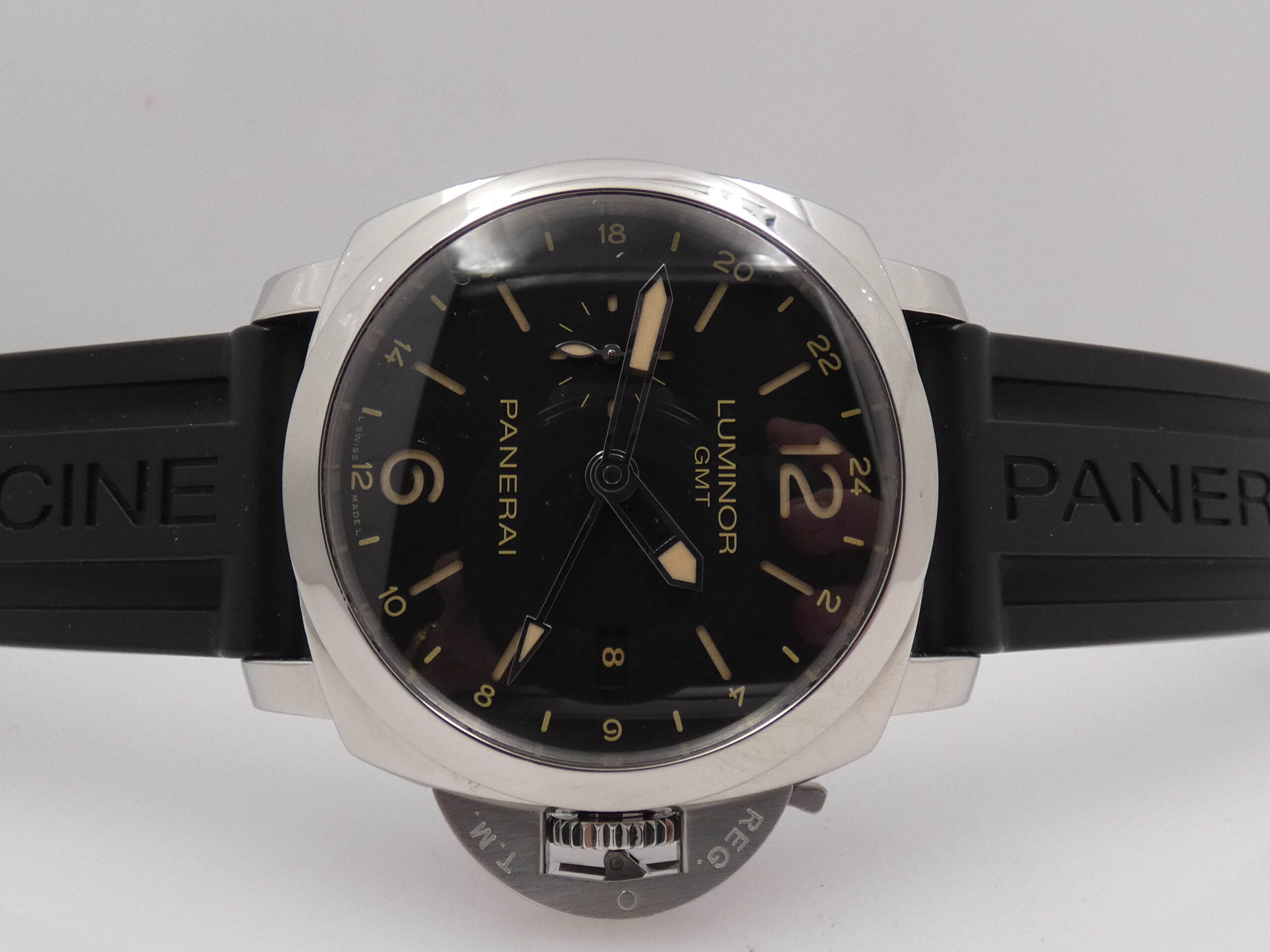 Quadrante: sandwich nero, indici a barretta, arabi a mezza, trattati con materiale luminescente Luminova, lancette a matita in acciaio, anch’esse luminescenti, secondiera al 9, scala delle 24 ore in corrispondenza degli indici, sfera centrale con freccia luminescente in punta per l’indicazione del GMT, datario al 3, logo Panerai al 12