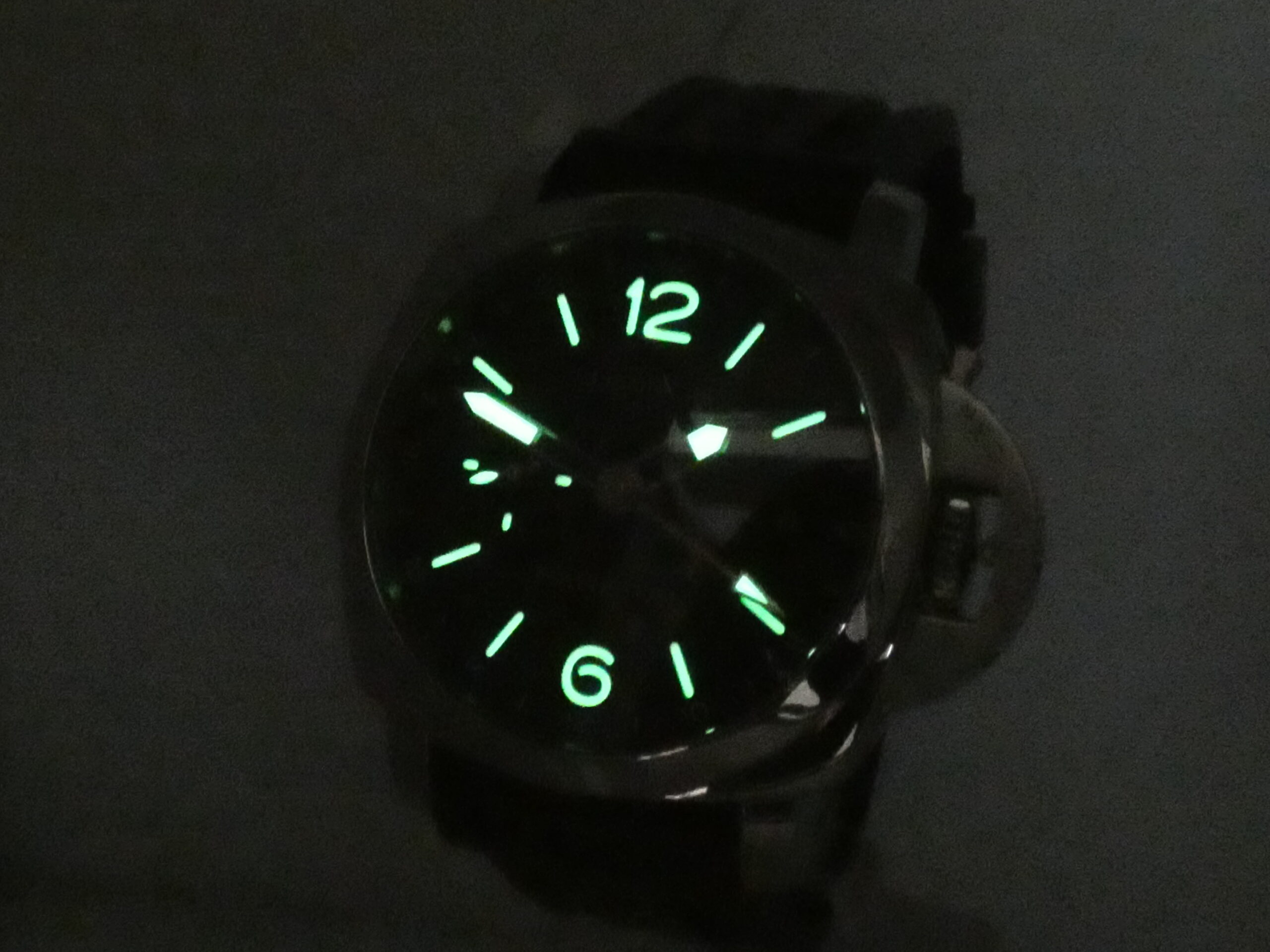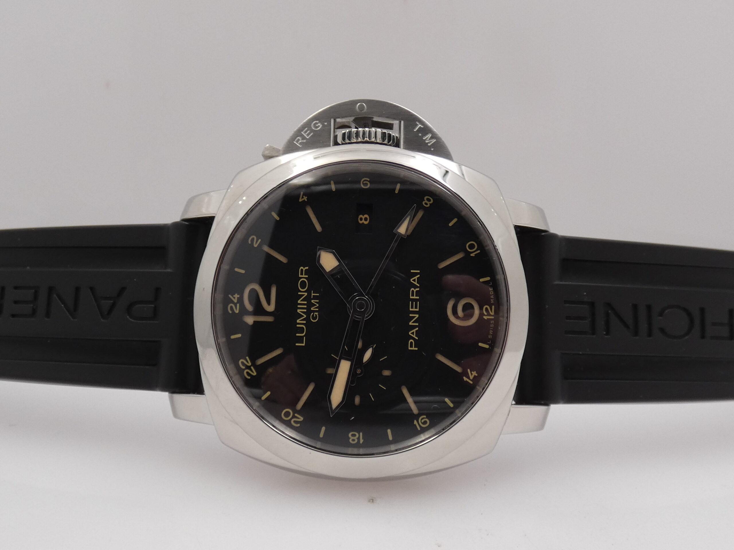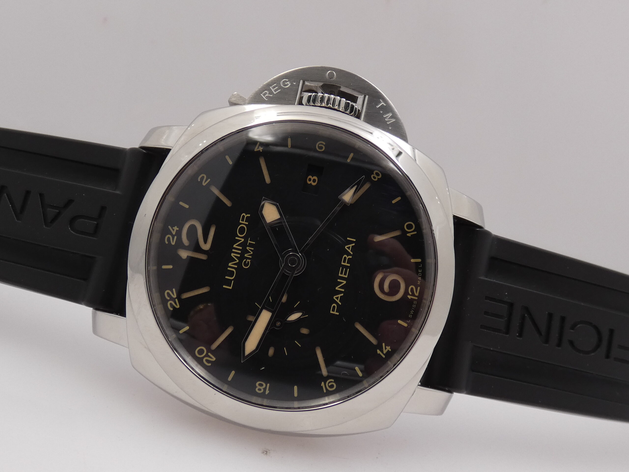 Quadrante: sandwich nero, indici a barretta, arabi a mezza, trattati con materiale luminescente Luminova, lancette a matita in acciaio, anch’esse luminescenti, secondiera al 9, scala delle 24 ore in corrispondenza degli indici, sfera centrale con freccia luminescente in punta per l’indicazione del GMT, datario al 3, logo Panerai al 12