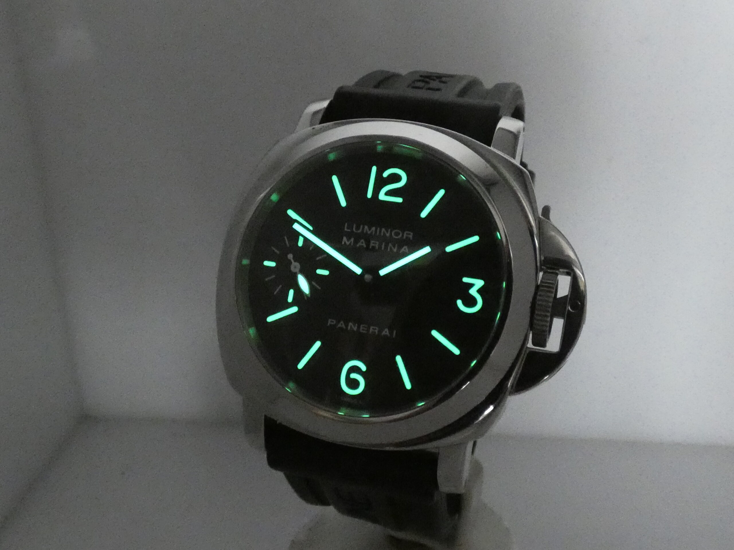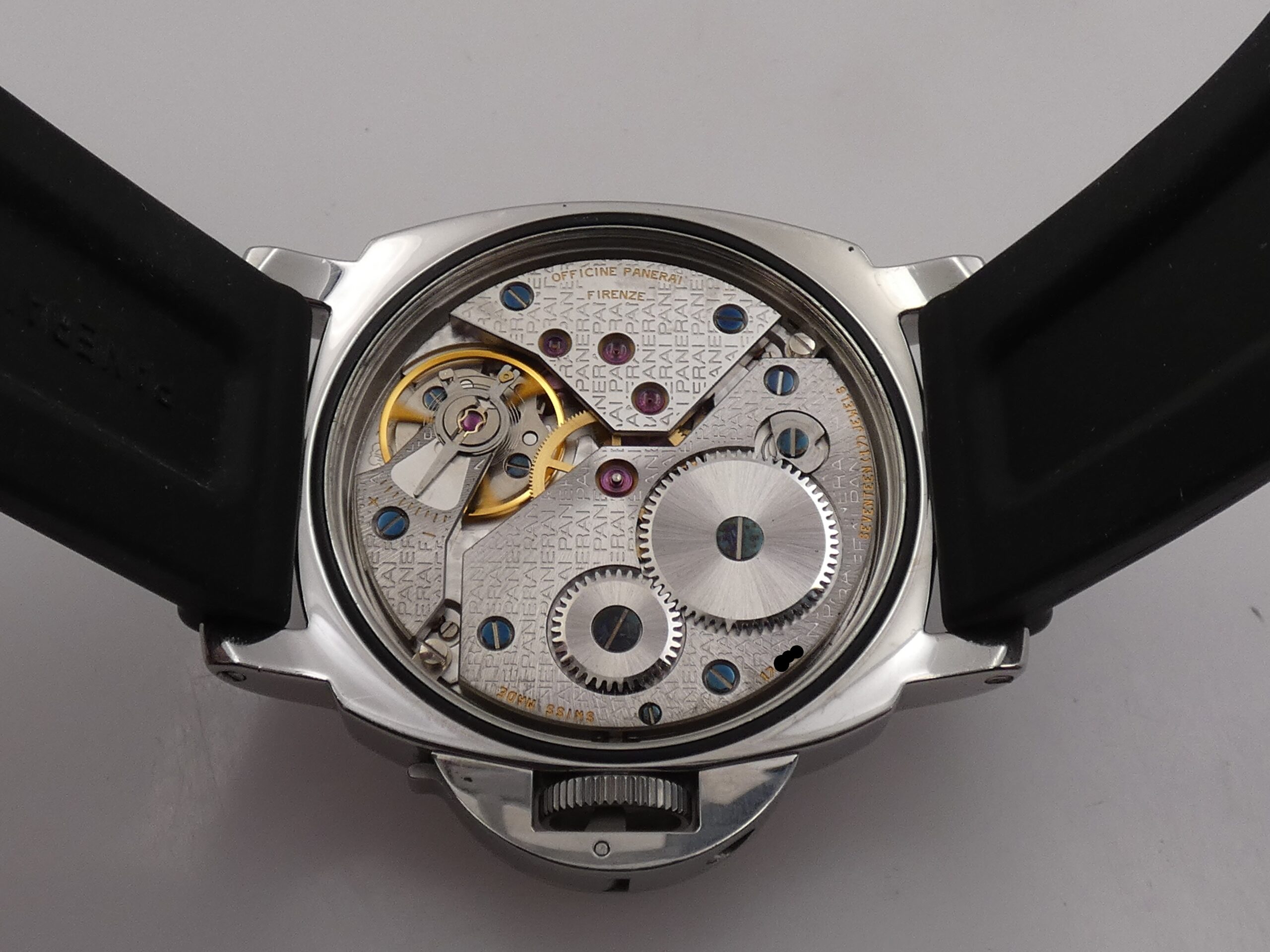 Quadrante: sandwich, nero, con indici a barretta, arabi a quarti trattati con materiale luminescente Luminova, lancette a matita in acciaio brunito anch’esse luminescenti, piccoli secondi al 9, logo Panerai al 6