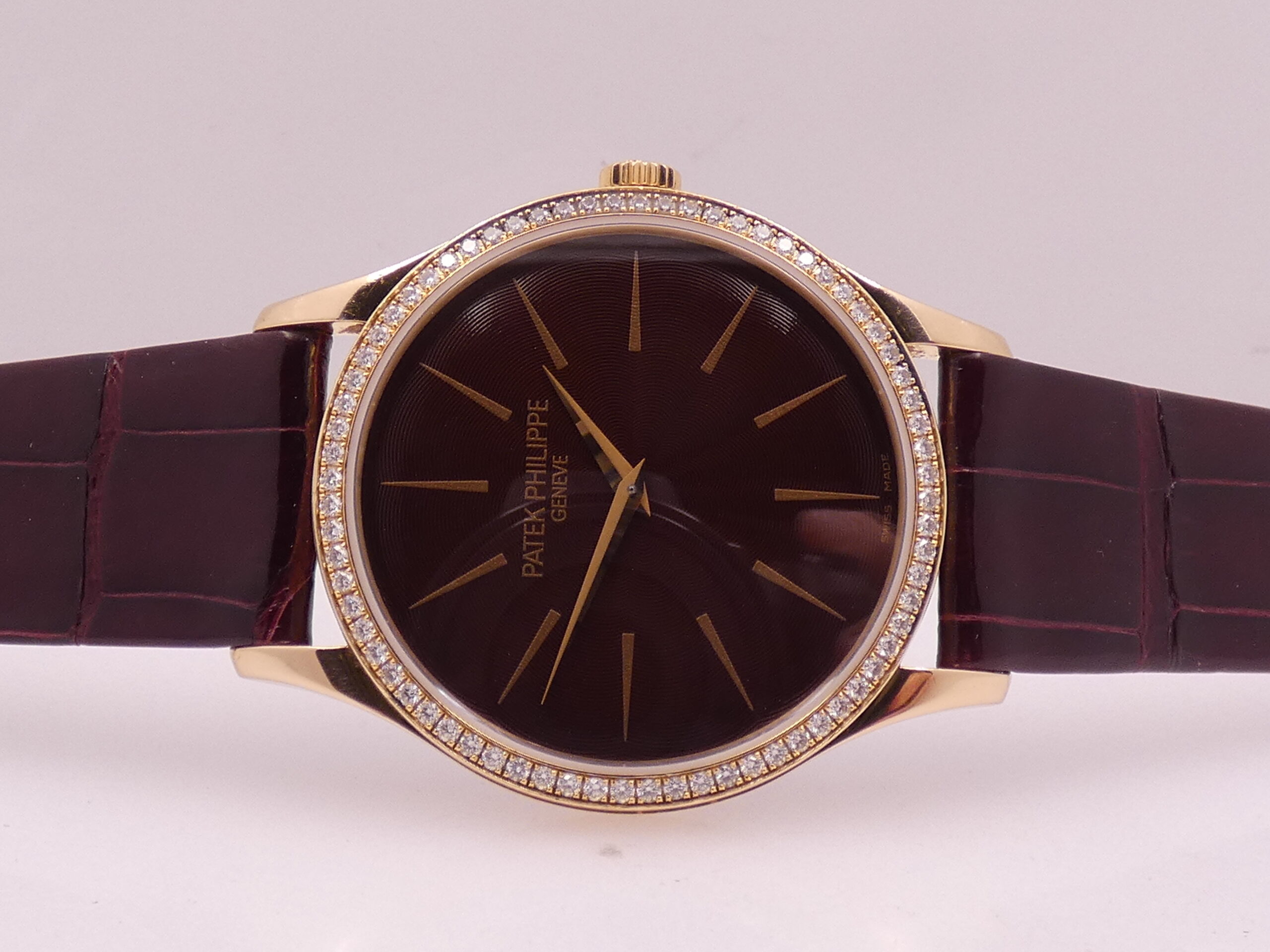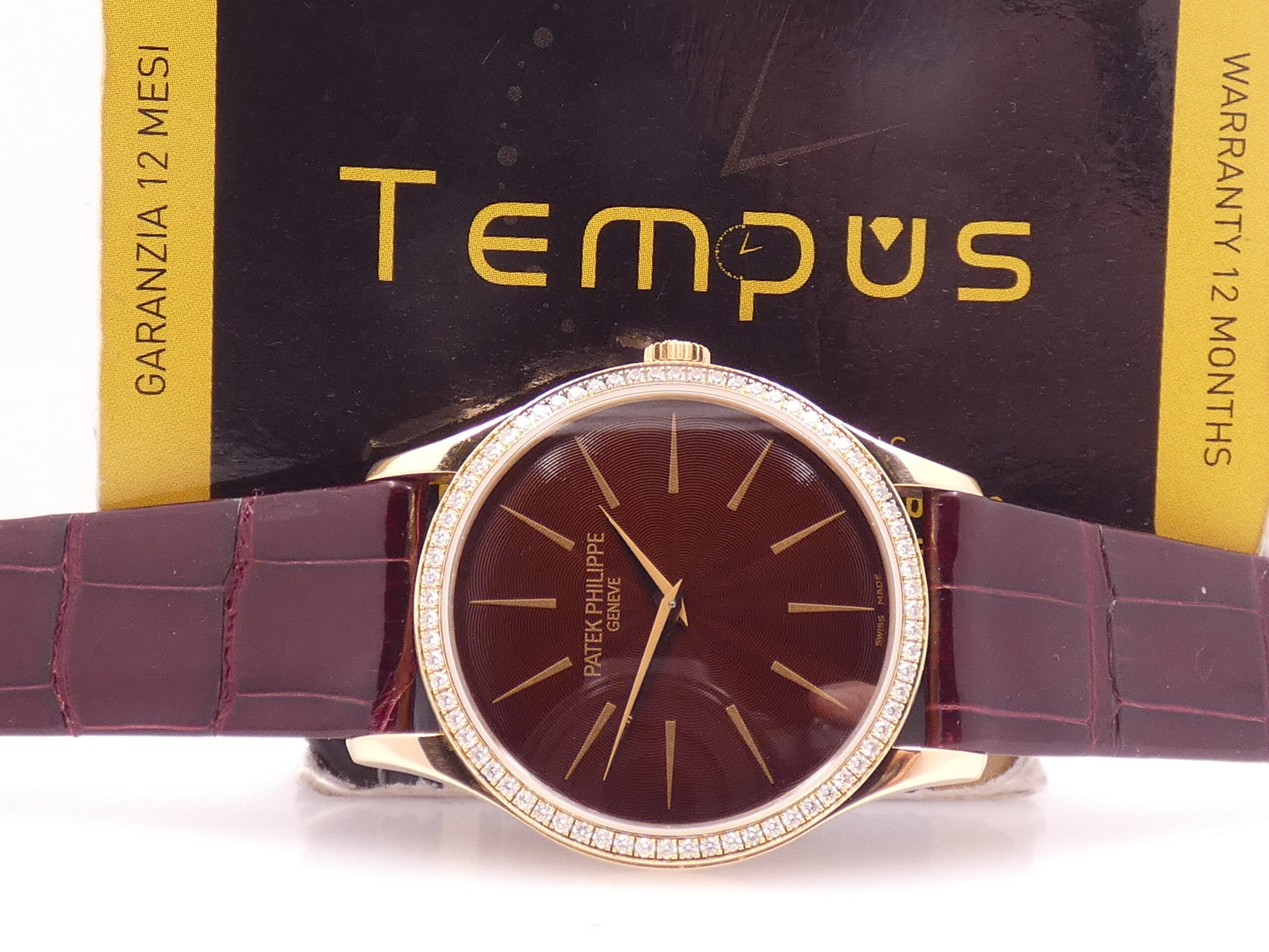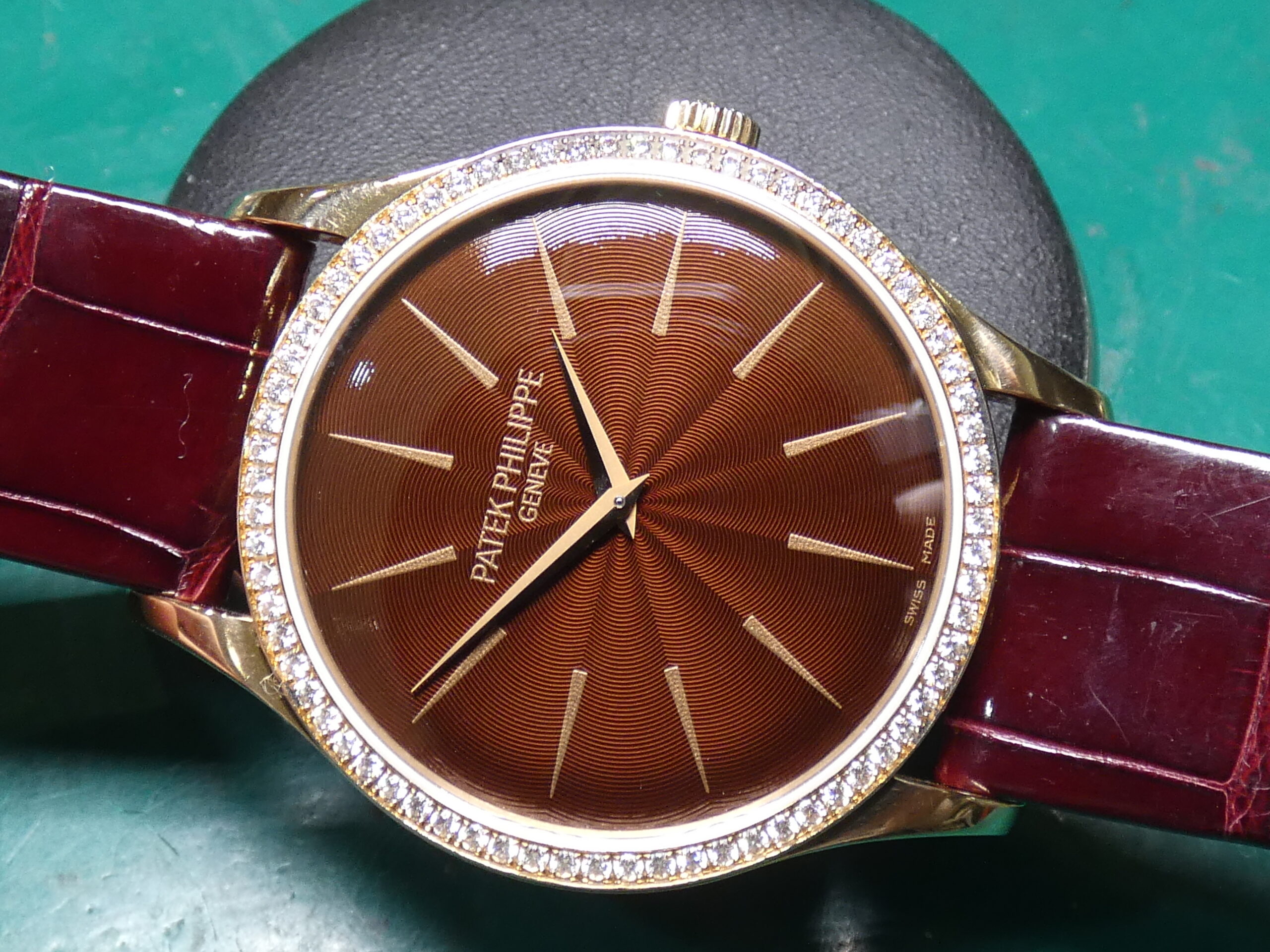Quadrante: chocolate soleil, con meravigliosa lavorazione ad onde, indici a geometrici, lancette dauphine in oro, logo Patek Philippe al 12