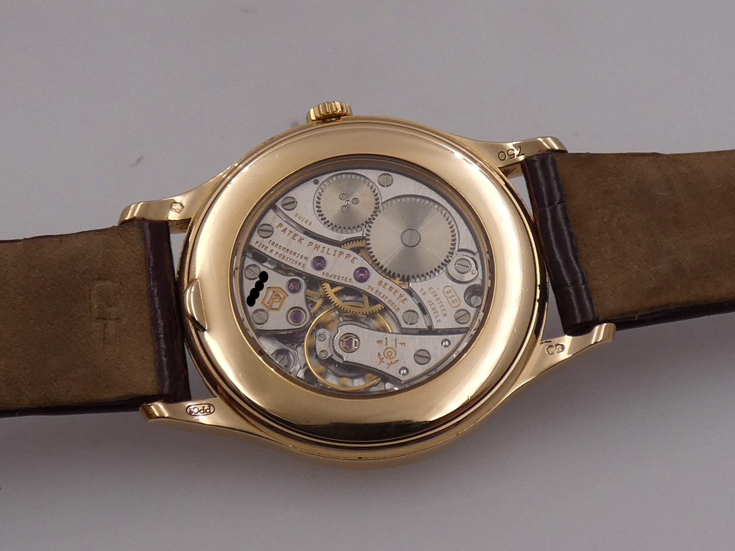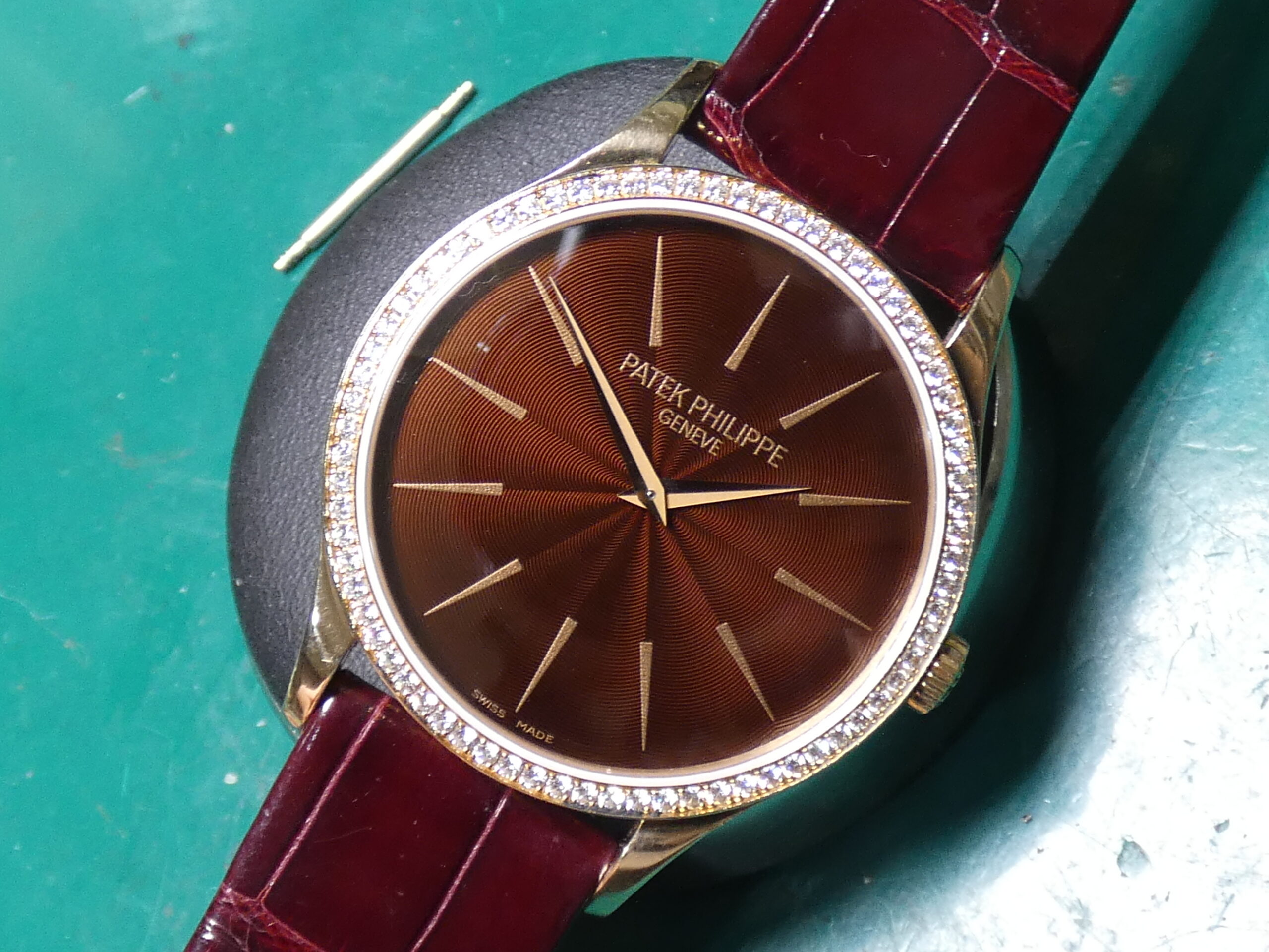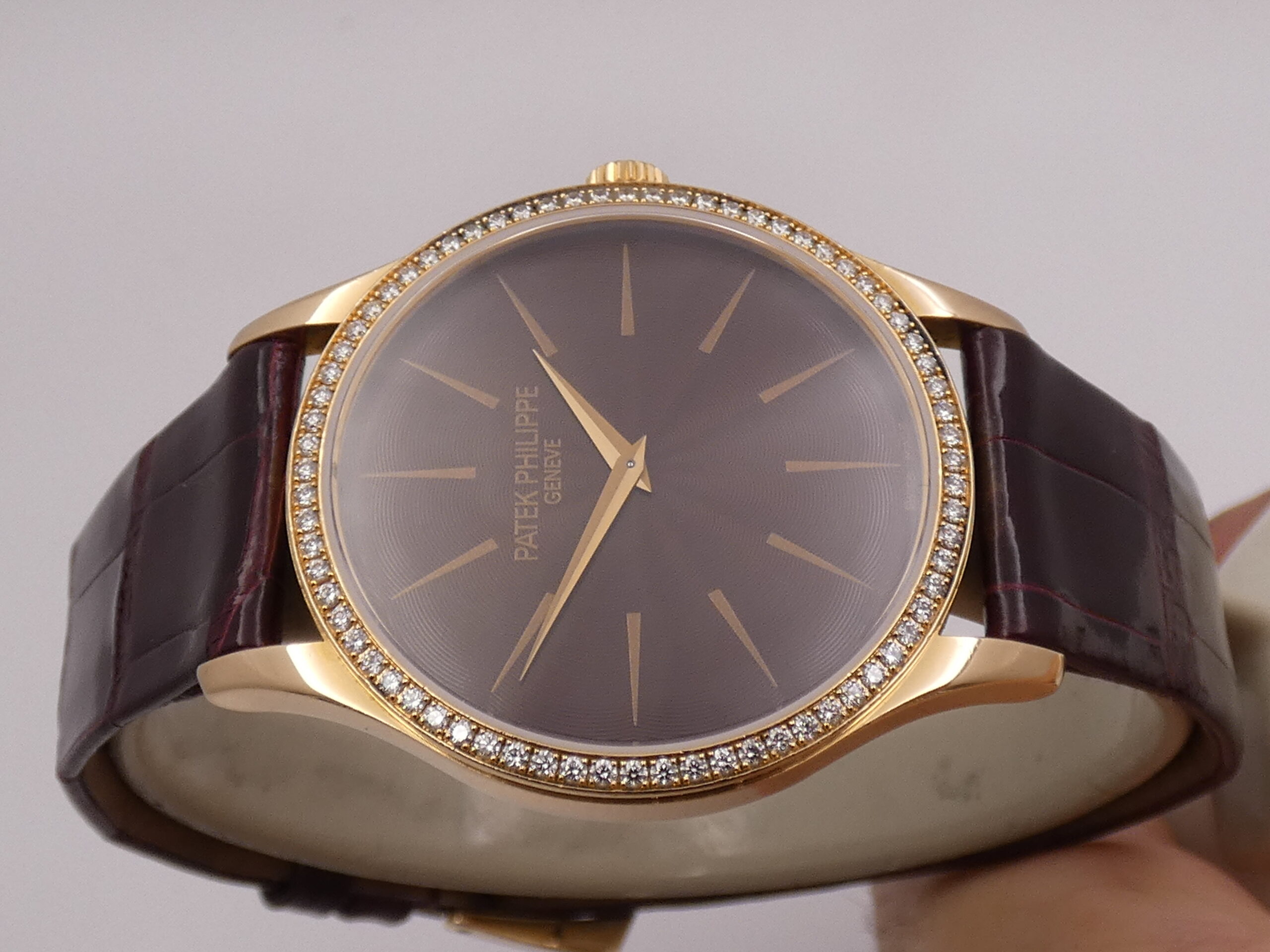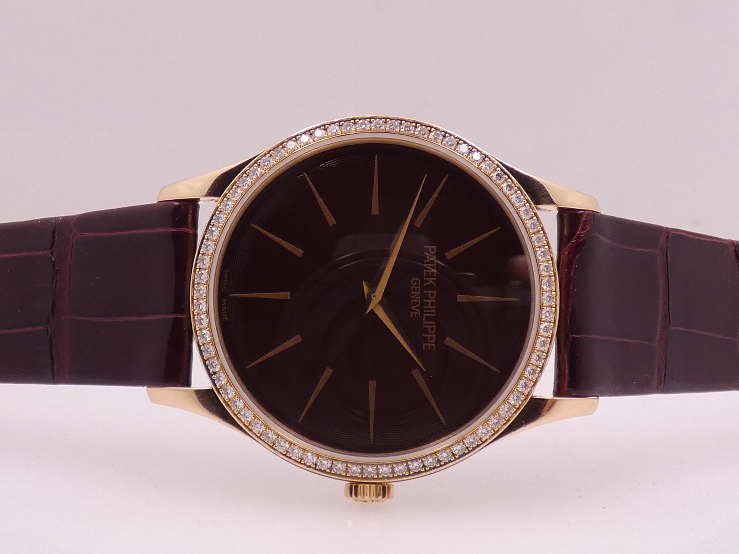 Quadrante: chocolate soleil, con meravigliosa lavorazione ad onde, indici a geometrici, lancette dauphine in oro, logo Patek Philippe al 12