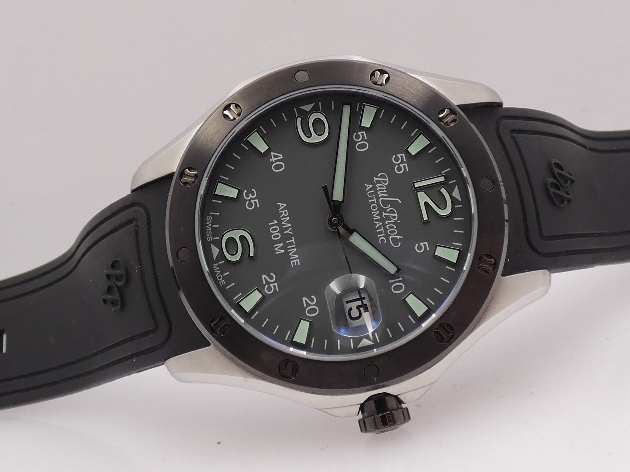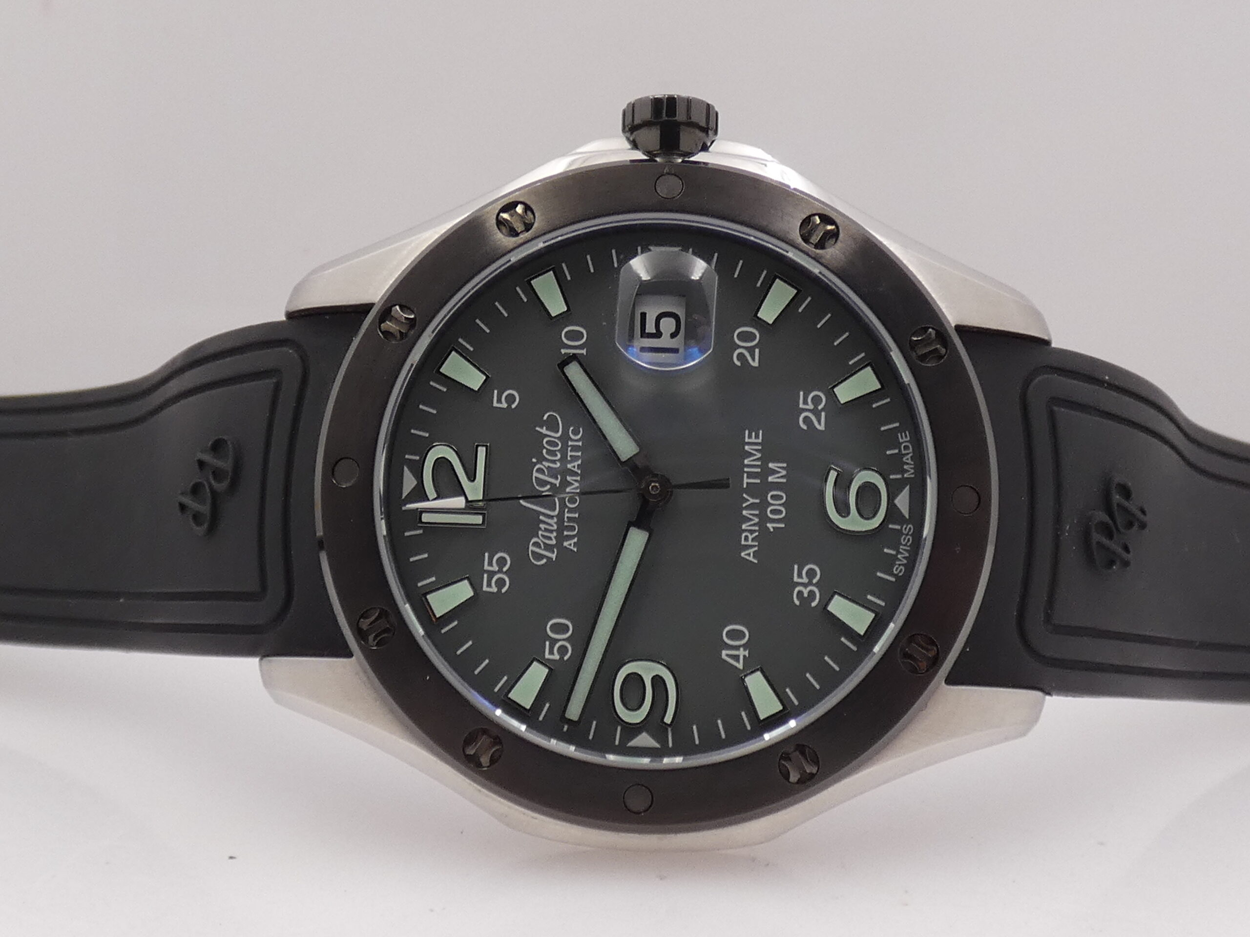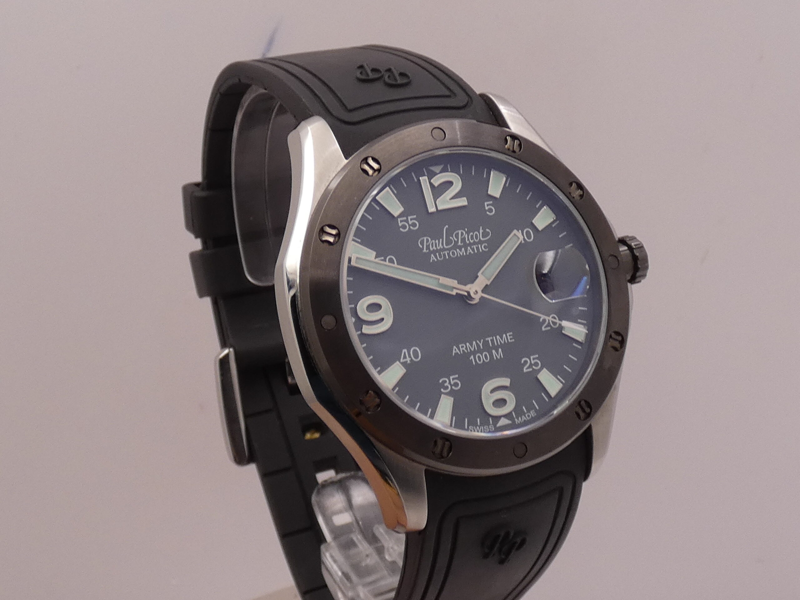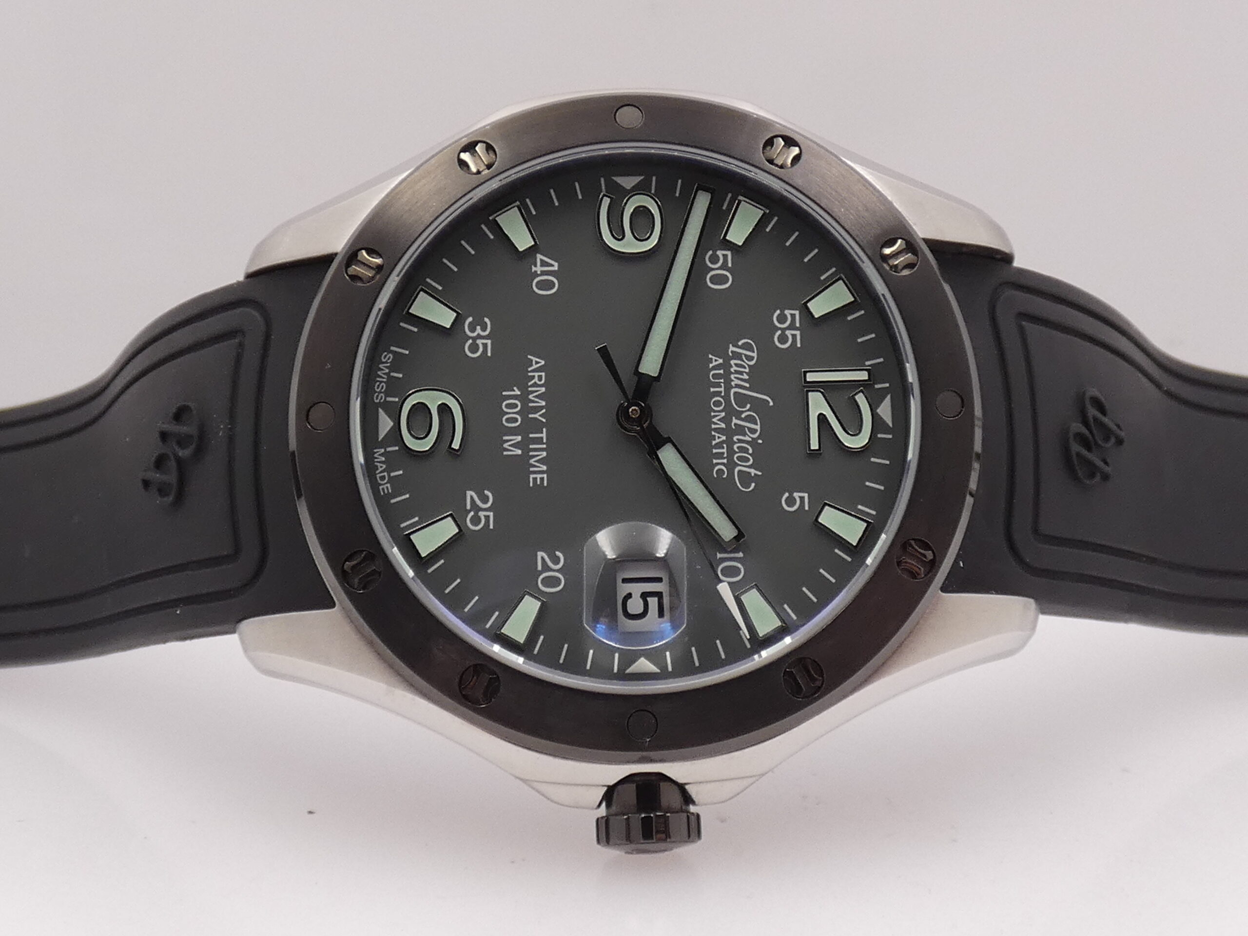 Quadrante: grigio, con indici a baretta, arabi a quarti, in acciaio, in rilievo e trattati con materiale luminescente, lancette a bastone anch’esse in acciaio e luminescenti, secondi al centro, indicazione del datario al 3 con rimessa rapida in corona, scala sessantesimale logo Paul Picot al 12